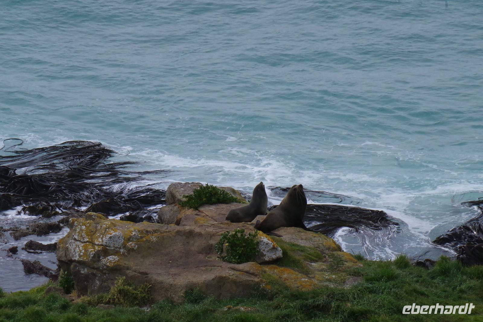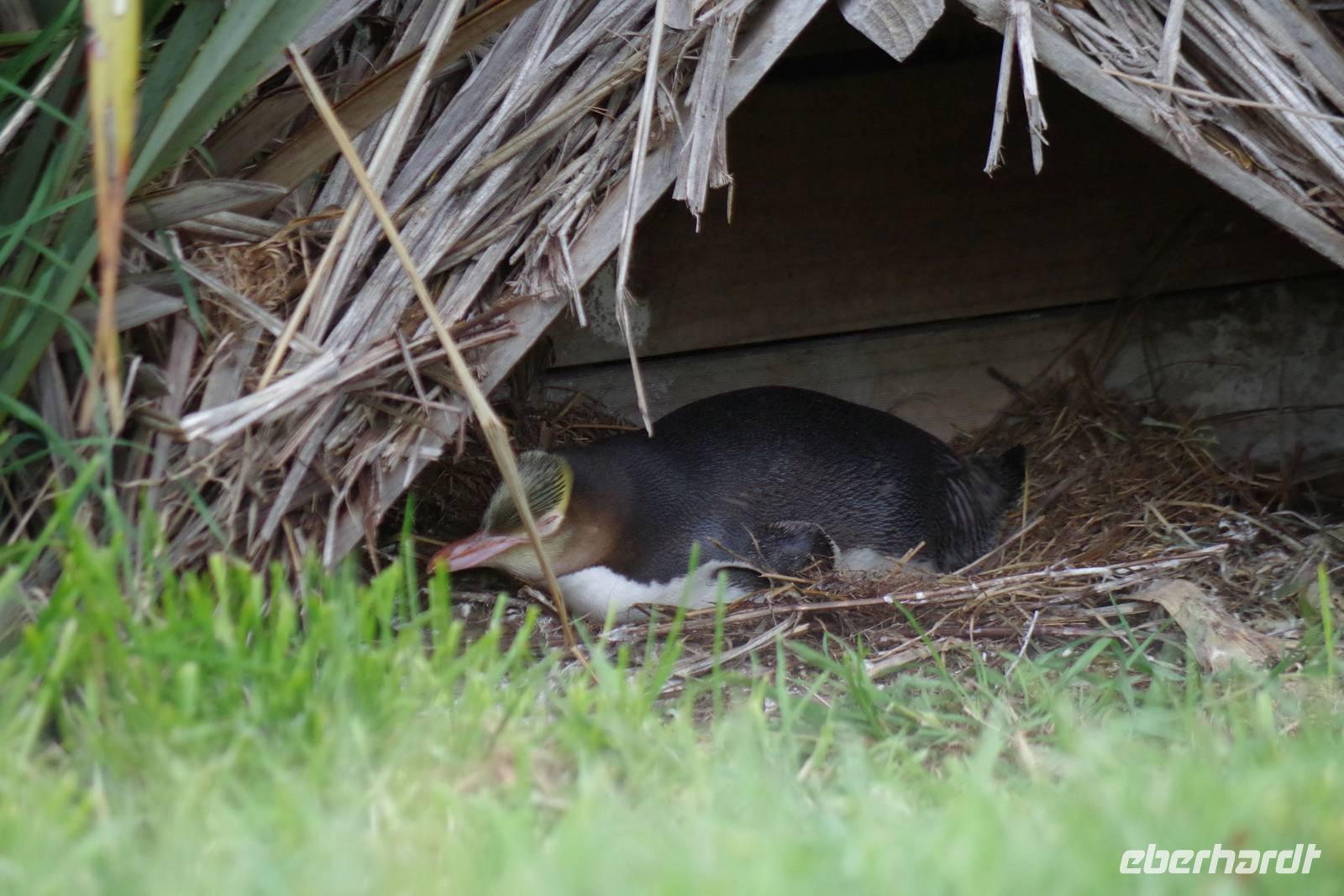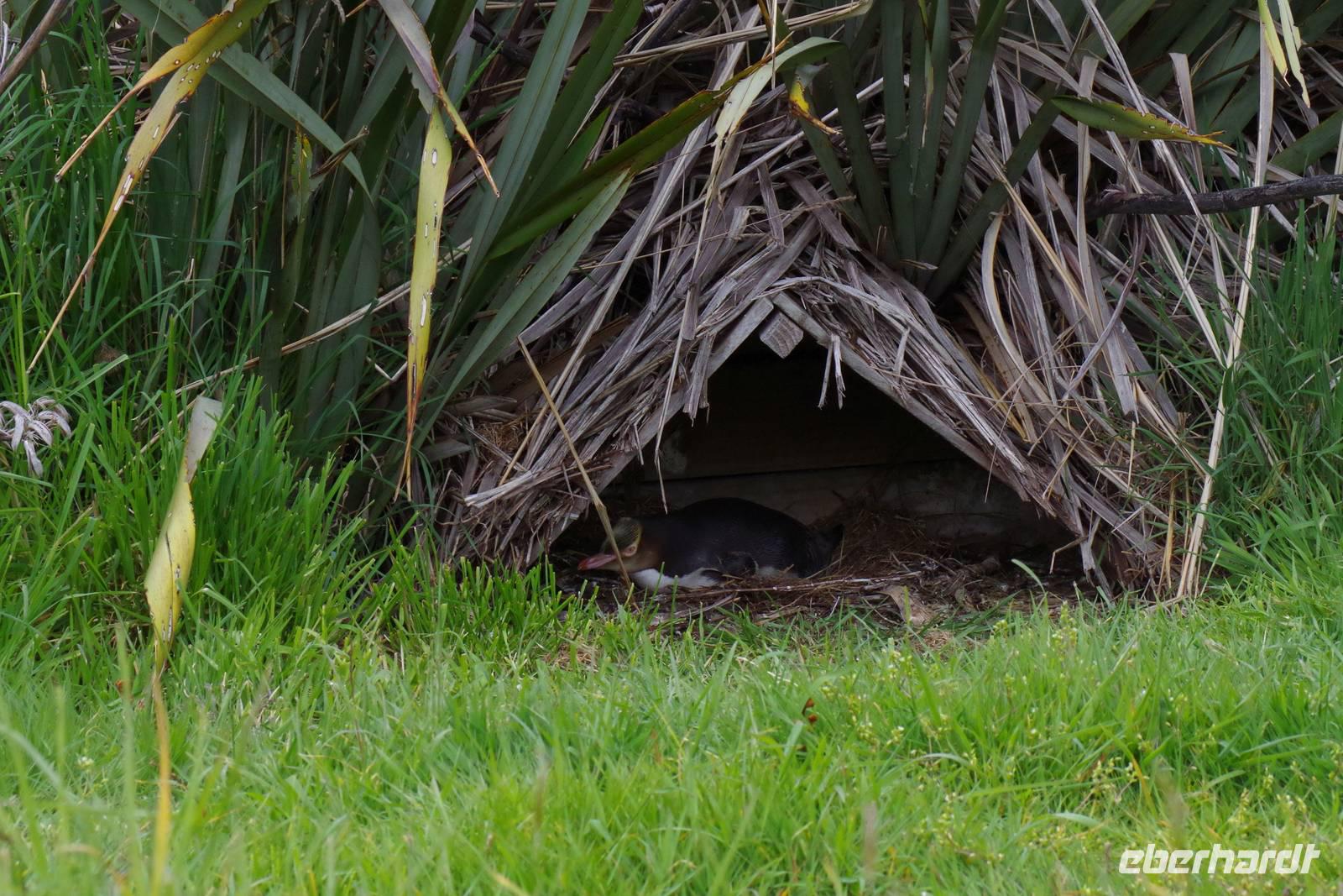 Nach einem ausgiebigen Frühstück fuhren wir zur Farm der Gelbaugenpinguine. Diese Farm liegt direkt an der Küste, an der jahrelang Gelbaugenpinguine und blaue Zwergpinguine nisteten und Ihre Jungen großzogen. Sie machten es sich zu Aufgabe, dieses Stück Küste zu sichern und vor Besuchern zu schützen. Nachdem wir einen kleinen Vortrag über die Pinguine, deren Nachwuchs und der Verhalten erfahren hatten, ging es für uns raus an die Küste. Wir entdeckten auf unserem Spaziergang die Nistplätze der blauen Zwergpinguine und sahen Robben sich auf Steinen sonnen. Durch spezielle Tunnel konnten wir relativ nah zu den Gelbaugenpinguinen vordringen. Wir beobachteten 2 Gelbaugenpinguine bei brüten.