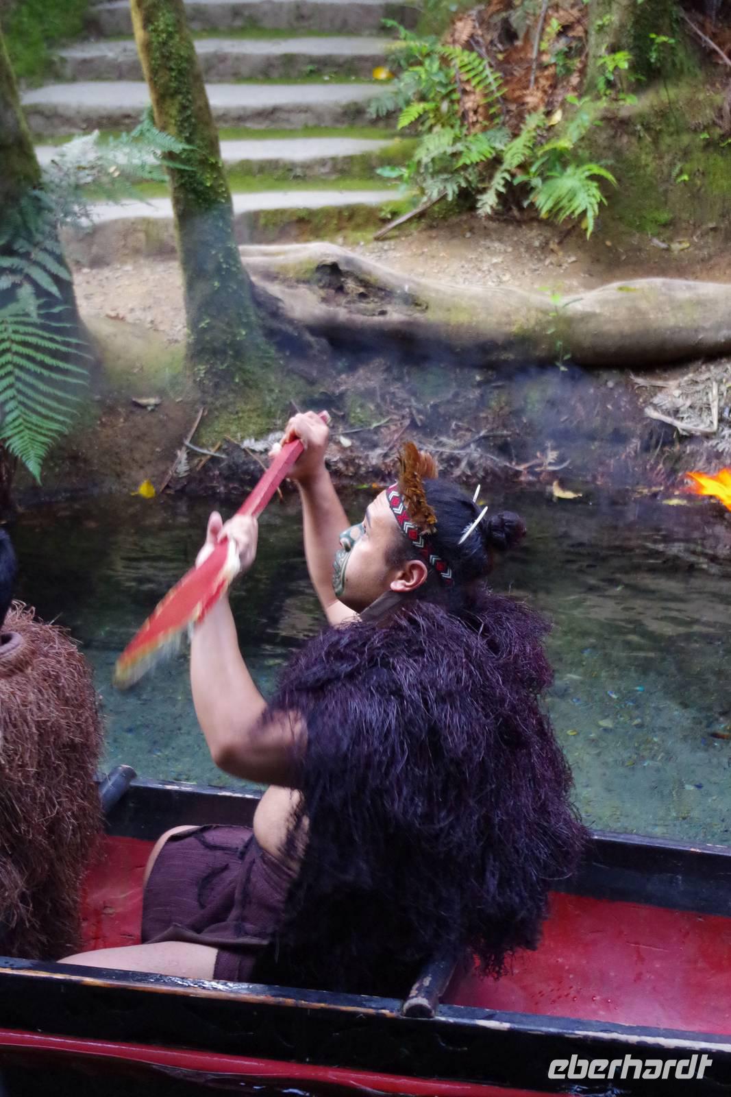 Frisch und voller Energie starten wir dann am Abend zum Maori Gelände, wo uns ein spannender Abend erwartet. Gesang, Musik und Tanz gehören an diesem Abend zum Programm. Die wildesten Grimassen zeigen sich uns beim landestypischen Haka (Kriegstanz der Maori). Nach einem so ereignisreichen Tag genießen wir unser Hangi (Erdofenessen) in geselliger Runde und lauschen dem Gesang des Gründers des kleinen Maori Dorfes.