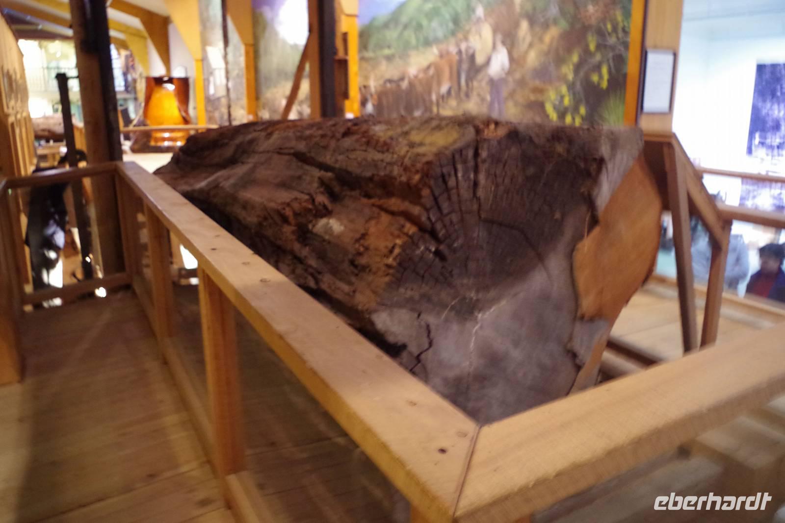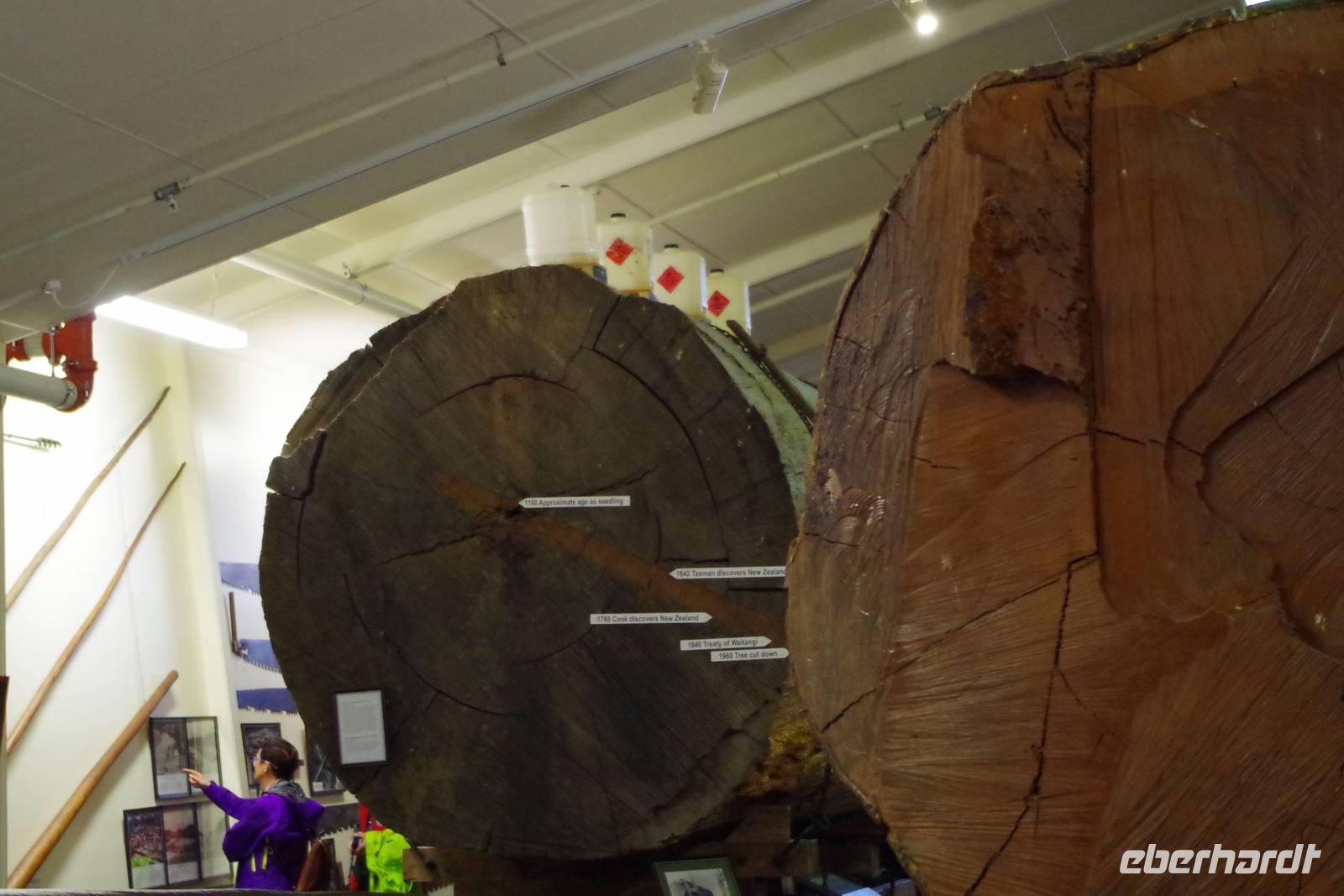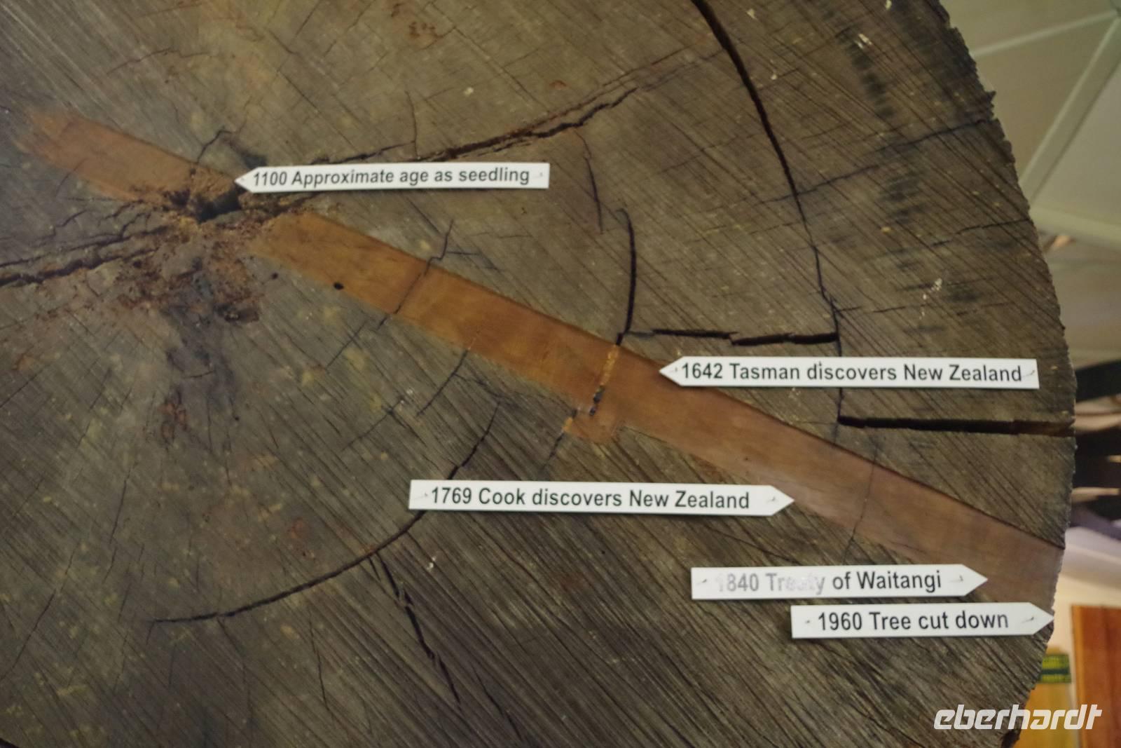 Im Kauri Museum in Matakohe erfuhren wir noch mehr zu Geschichte, Verwendung und Bedeutung des Baumes. Vor langer Zeit war dieser noch in großem Ausmaß in Neuseeland vorhanden und zählt zu den bedeutenden einheimischen Bäumen des Landes. Heute ist gerade mal noch ein Prozent nach intensiven Rodungen des Kauri Baumes vorhanden. Die Europäer erkannten den Gewinn, welchen man mit dem Holz und vor allem dem Harz des Baumes erwirtschaften konnte und ließen große Teile abbauen.