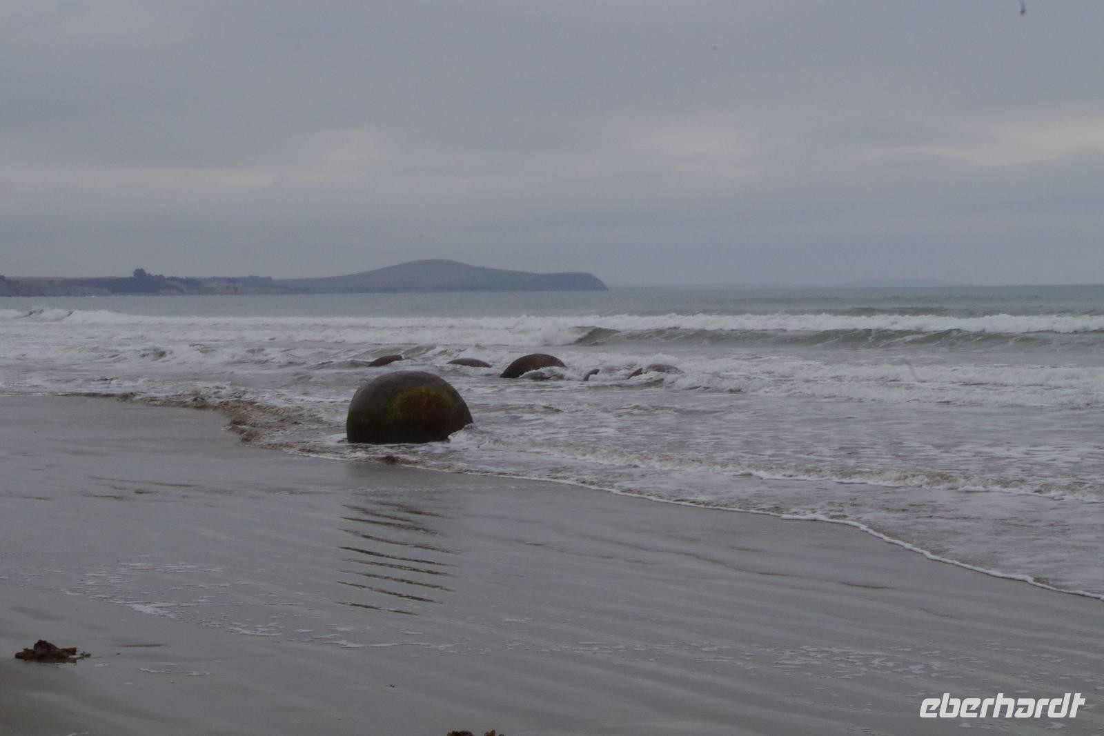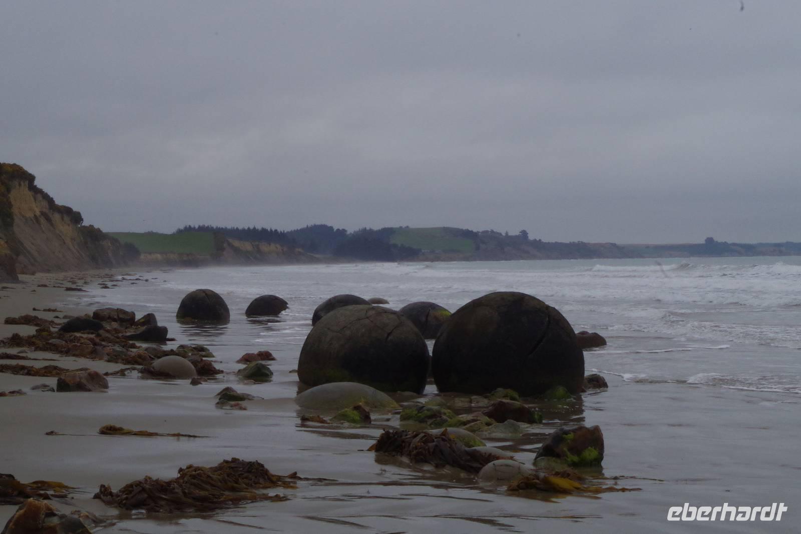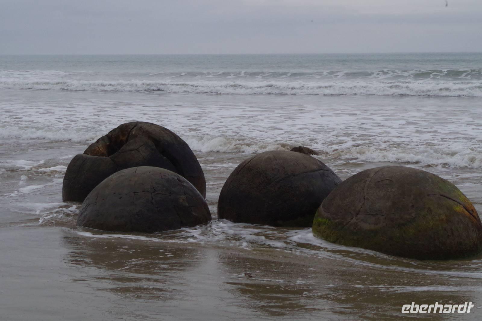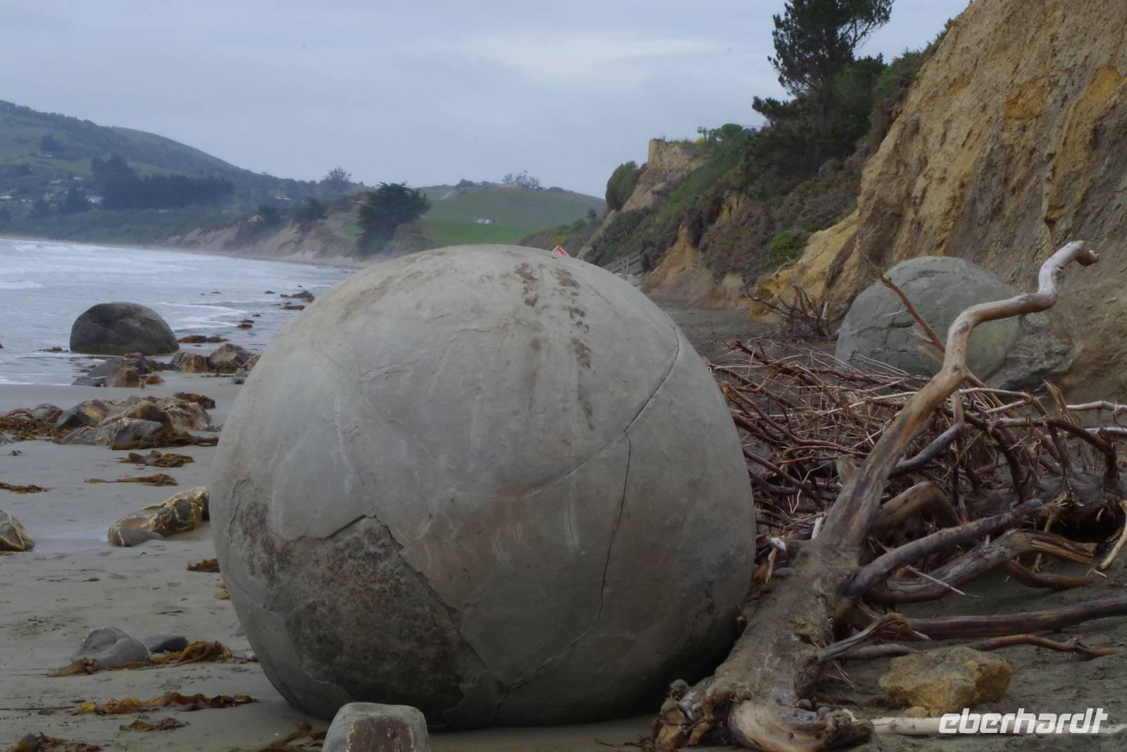 Die Moreaki Boulders sind Steinkugeln, die sich vor etwa 60 Millionen Jahren begannen auf dem Grund des Meeres zu formen. Erosion haben die Kugeln freigelegt und geschliffen.
