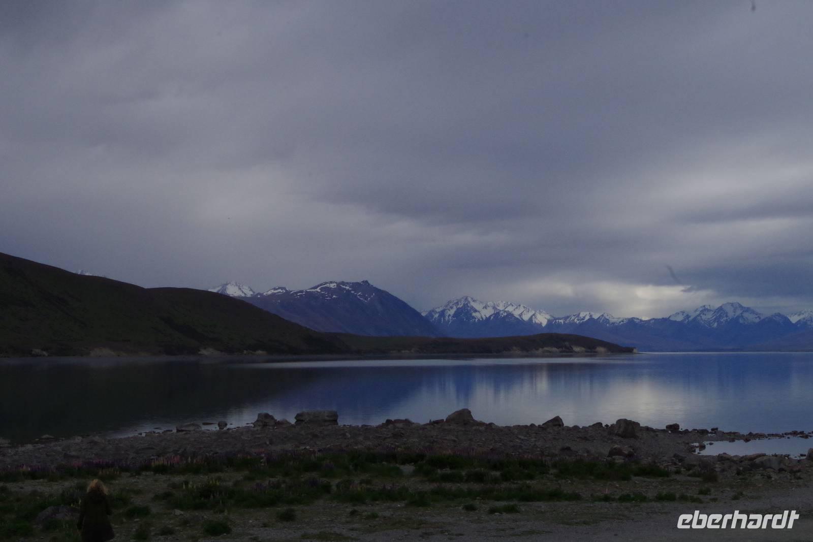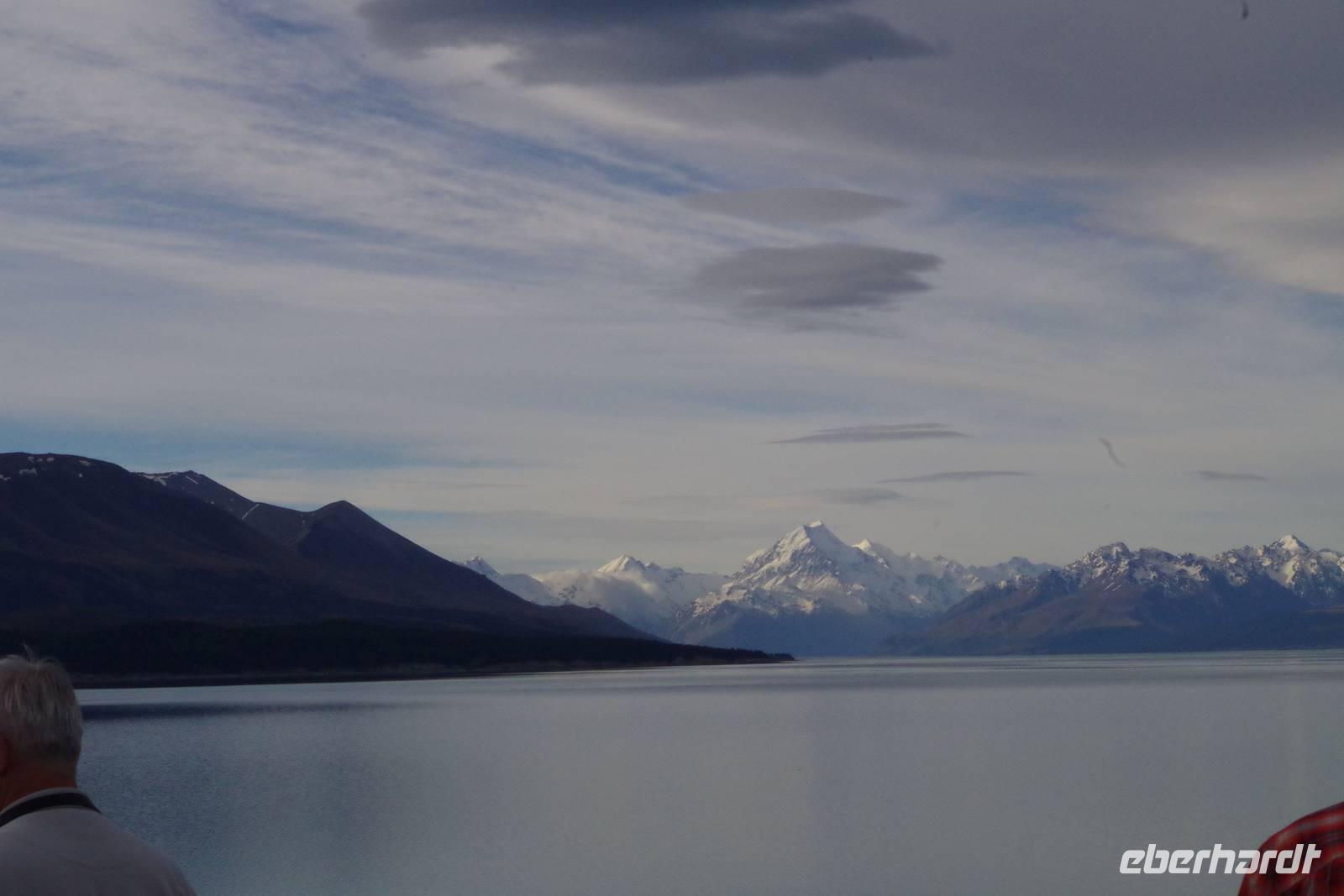 Unser Hotel für die Nacht lag am Lake Tekapo. Auf dem Weg dahin hat man die Möglichkeit, den Mount Cook zu sehen. Wir alle hofften, dass das Wetter hält und wir ein paar Schnappschüsse machen könnten. Und ja - das Wetter hielt und gab uns als Zusatz noch ein paar wunderschöne Sonnenstrahlen auf den Mount Cook. Wir nutzen diesen atemberaubenden Ausblick, um auf unsere Reise anzustoßen. Mit diesem wunderschönen Ausblick ließen wir den Tag ausklingen.