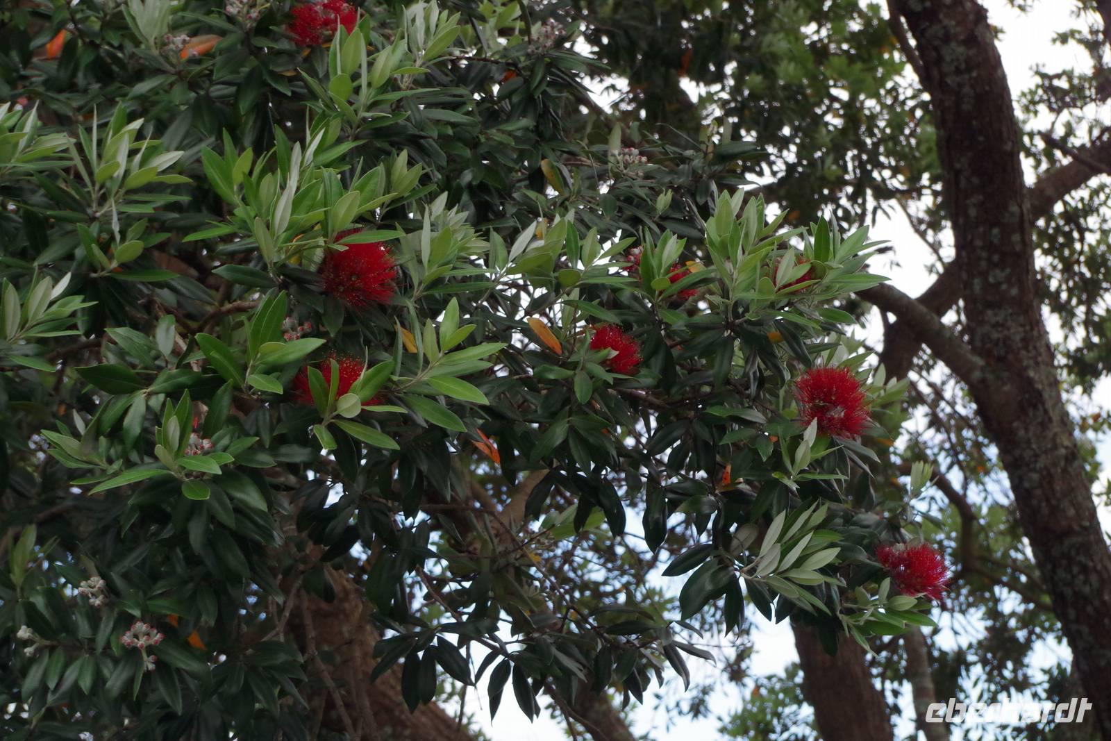 Der Regen hatte sich verzogen und bevor wir uns zum Flughafen begaben, machten wir noch eine kleine Stadtrundfahrt durch Auckland. Wir entdeckten überall den Neuseeland Weihnachtsbaum, den Pohutukawa, in seiner Blüte.