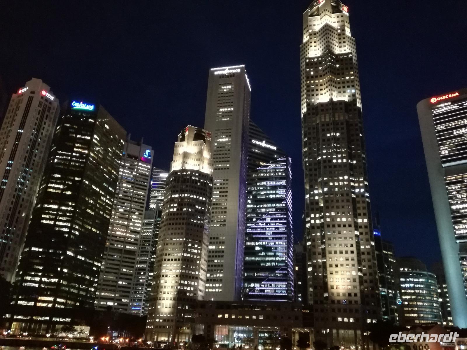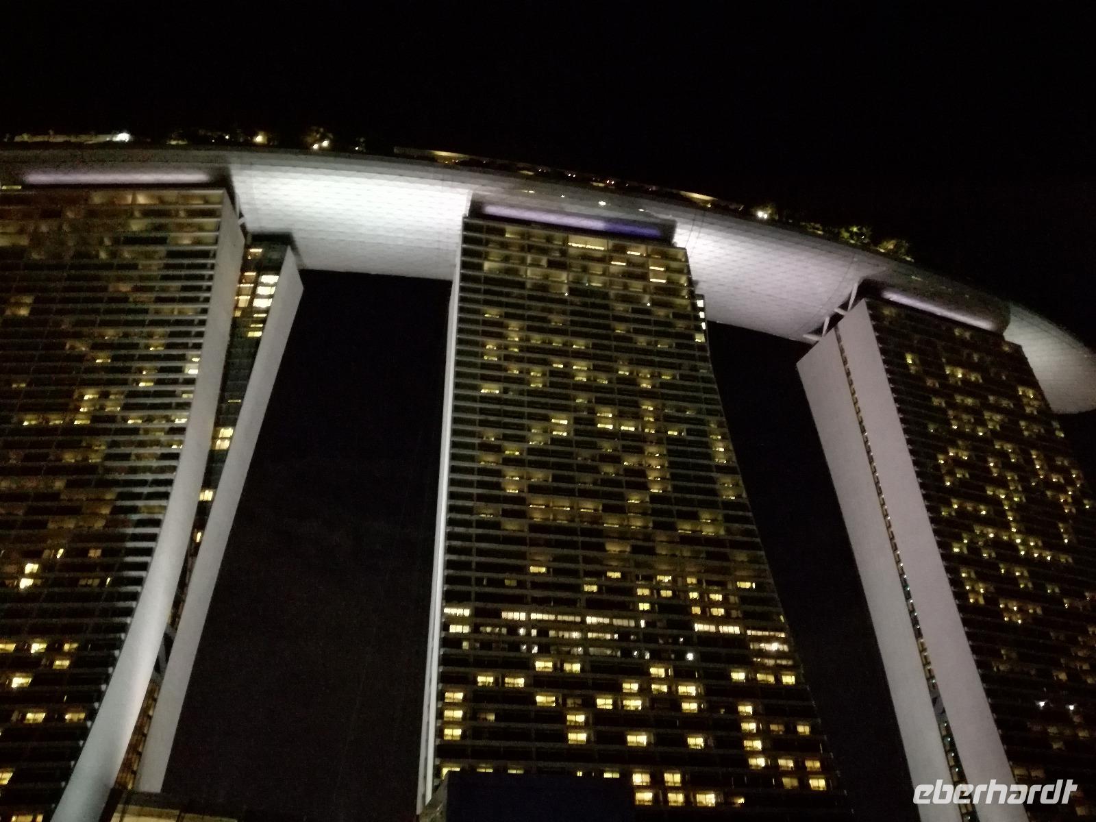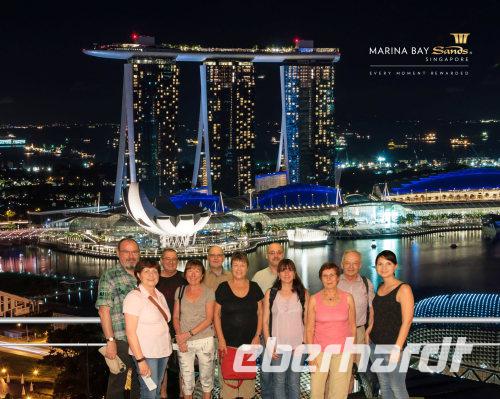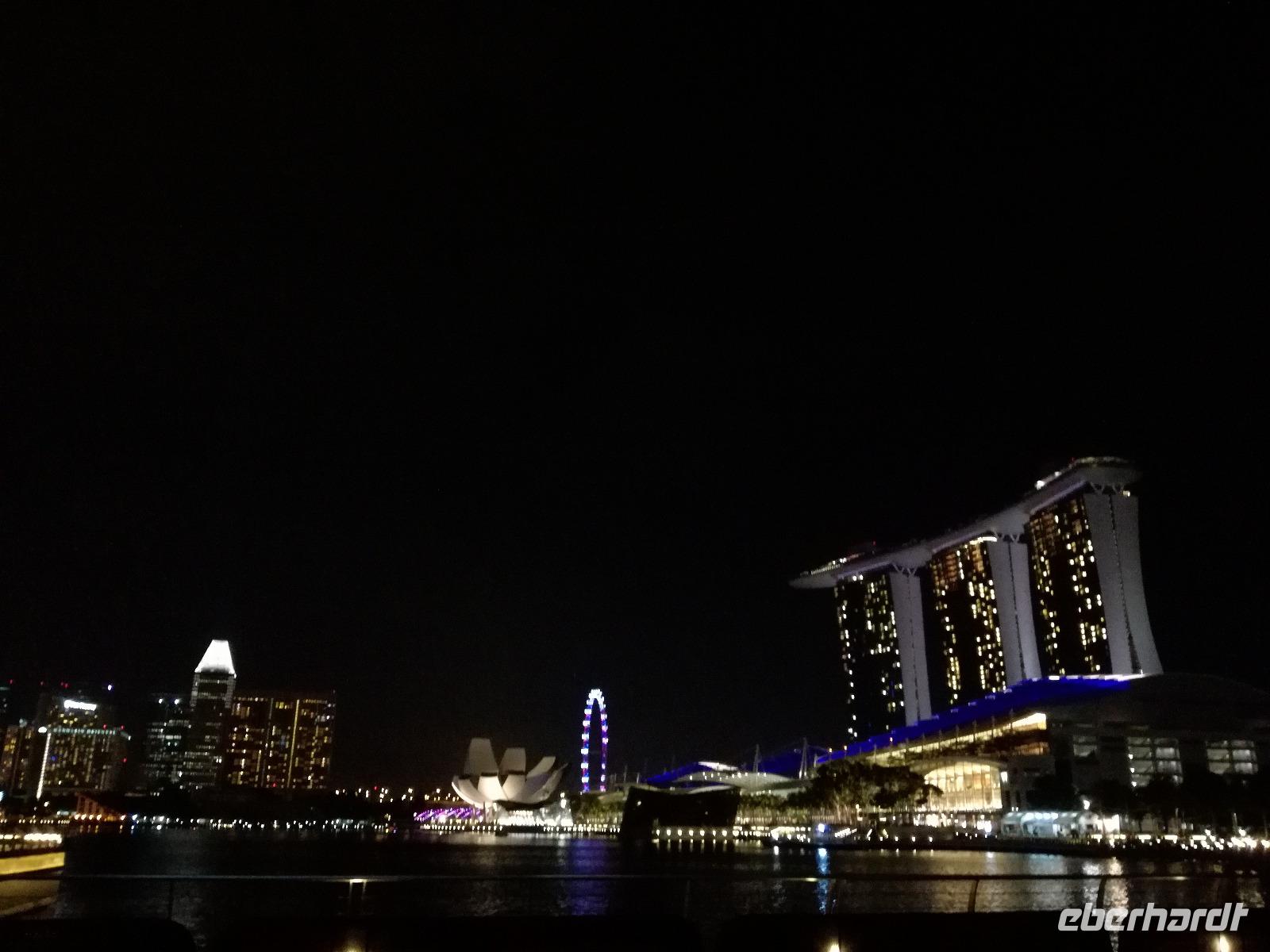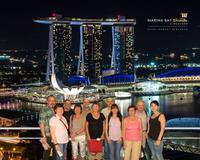 Unser Reiseleiter David erwartet uns bereits in der Empfangshalle. Wir gehen gemeinsam zum Bus und nach ein paar Orientierungshilfen für andere Touristen können wir in Richtung Hotel starten. Nach einem Überblick für den folgenden Tag verabreden wir uns für den Abend in der Lobby. Ich nutze das Hotel-Smartphone für eventuelle Orientierungsschwierigkeiten und schon geht der Abendspaziergang los. Wir laufen in Richtung Clarke Quay, dem „Vergnügungsviertel", hier gibt es zahlreiche Restaurant, Bars und Clubs und eine abenteuerliche Attraktion, den Bungy Swing. Wir laufen weiter den Fluss entlang, es ist sehr schwül und wir benötigen etwas Zeit um uns an den Temperaturenunterschied zu gewöhnen. Am Merlionpark haben wir dann das erste Ziel des heutigen Abends erreicht. Der Merlion ist das Wahrzeichen Singapurs und ein Kunstwort das sich aus Mermaid (Meerjungfrau) und Lion (Löwe) zusammensetzt. Es ist eine Mischung aus Löwe und Fisch und der Schutzpatron von Singapur. Von hier aus wollen einige weiter Richtung Kaufhaus des Marina Bay Sands Hotel um dort etwas zu essen. Auf dem Weg werde ich dann leider auf merkwürdige und unangenehme Art aufgehalten... Das wiederum hat meinen Zeitplan etwas durcheinander gebracht, aber nach einer kurzen Verschnaufpause in den Garküchen des Kaufhauses gehen wir dem ursprünglichen Plan weiter nach. Einige schauen sich die Wasser-Lasershow vor dem Kaufhaus an, während ich mit dem Rest zum Singapur Flyer laufe, dem großen Riesenrad, dort hat man die Möglichkeit Singapur bei Nacht von oben zu bewundern. Zurück bei den anderen schlendern wir noch über den Garden Walk hinüber zum Hotel. Von dort aus führt ein Steg hinaus und man sieht die beleuchteten Superbäume vom Botanischen Garten. So langsam meldet sich die Müdigkeit bei allen und wir gehen zurück zum Hotel. Der nächste Tag wartet schon mit neuen Erlebnissen auf uns.