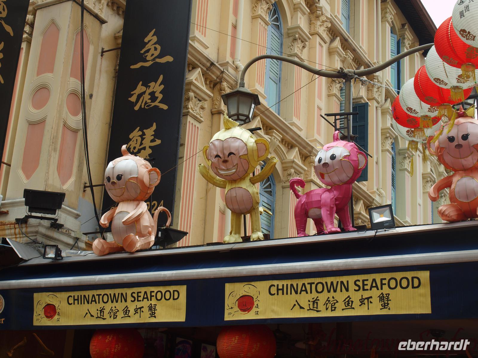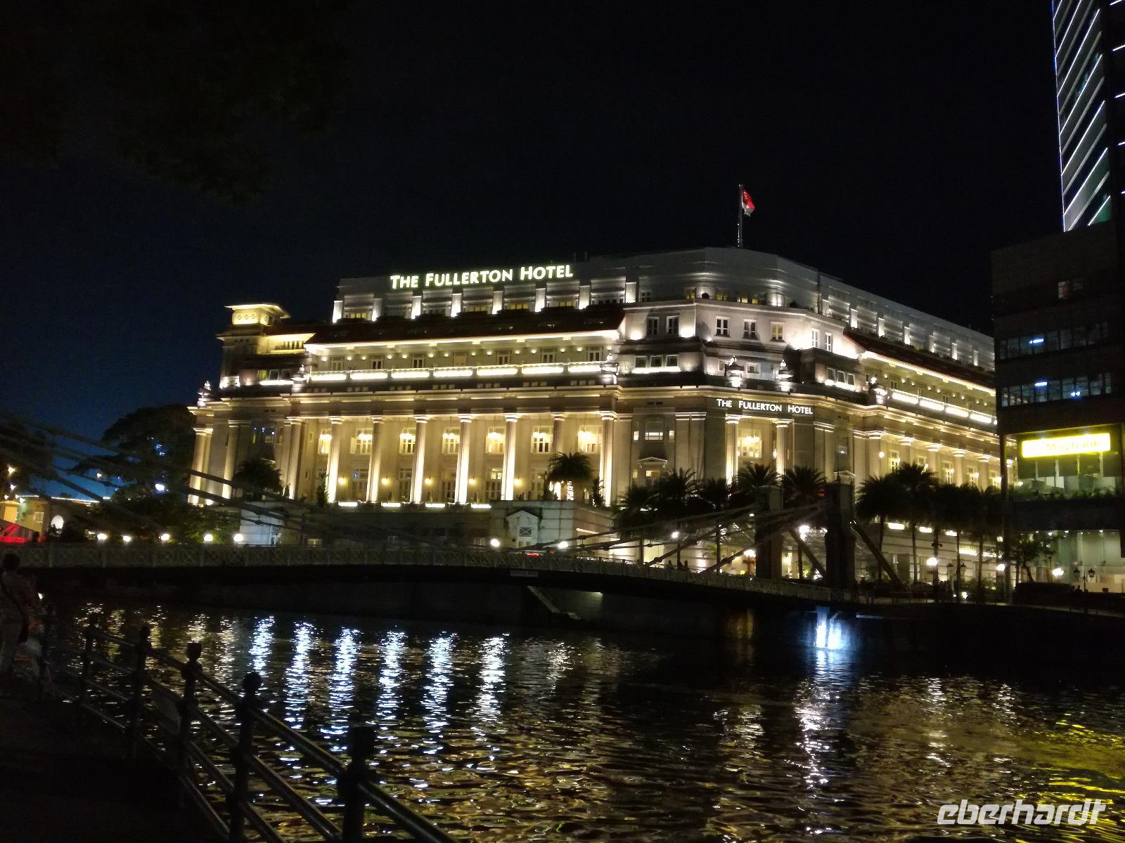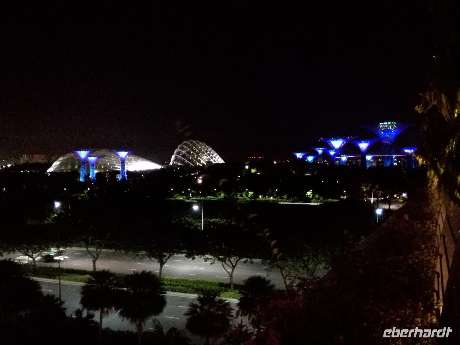Unser Reiseleiter David erwartet uns bereits in der Empfangshalle. Wir gehen gemeinsam zum Bus und nach ein paar Orientierungshilfen für andere Touristen können wir in Richtung Hotel starten. Nach einem Überblick für den folgenden Tag verabreden wir uns für den Abend in der Lobby. Ich nutze das Hotel-Smartphone für eventuelle Orientierungsschwierigkeiten und schon geht der Abendspaziergang los. Wir laufen in Richtung Clarke Quay, dem „Vergnügungsviertel", hier gibt es zahlreiche Restaurant, Bars und Clubs und eine abenteuerliche Attraktion, den Bungy Swing. Wir laufen weiter den Fluss entlang, es ist sehr schwül und wir benötigen etwas Zeit um uns an den Temperaturenunterschied zu gewöhnen. Am Merlionpark haben wir dann das erste Ziel des heutigen Abends erreicht. Der Merlion ist das Wahrzeichen Singapurs und ein Kunstwort das sich aus Mermaid (Meerjungfrau) und Lion (Löwe) zusammensetzt. Es ist eine Mischung aus Löwe und Fisch und der Schutzpatron von Singapur. Von hier aus wollen einige weiter Richtung Kaufhaus des Marina Bay Sands Hotel um dort etwas zu essen. Auf dem Weg werde ich dann leider auf merkwürdige und unangenehme Art aufgehalten... Das wiederum hat meinen Zeitplan etwas durcheinander gebracht, aber nach einer kurzen Verschnaufpause in den Garküchen des Kaufhauses gehen wir dem ursprünglichen Plan weiter nach. Einige schauen sich die Wasser-Lasershow vor dem Kaufhaus an, während ich mit dem Rest zum Singapur Flyer laufe, dem großen Riesenrad, dort hat man die Möglichkeit Singapur bei Nacht von oben zu bewundern. Zurück bei den anderen schlendern wir noch über den Garden Walk hinüber zum Hotel. Von dort aus führt ein Steg hinaus und man sieht die beleuchteten Superbäume vom Botanischen Garten. So langsam meldet sich die Müdigkeit bei allen und wir gehen zurück zum Hotel. Der nächste Tag wartet schon mit neuen Erlebnissen auf uns.