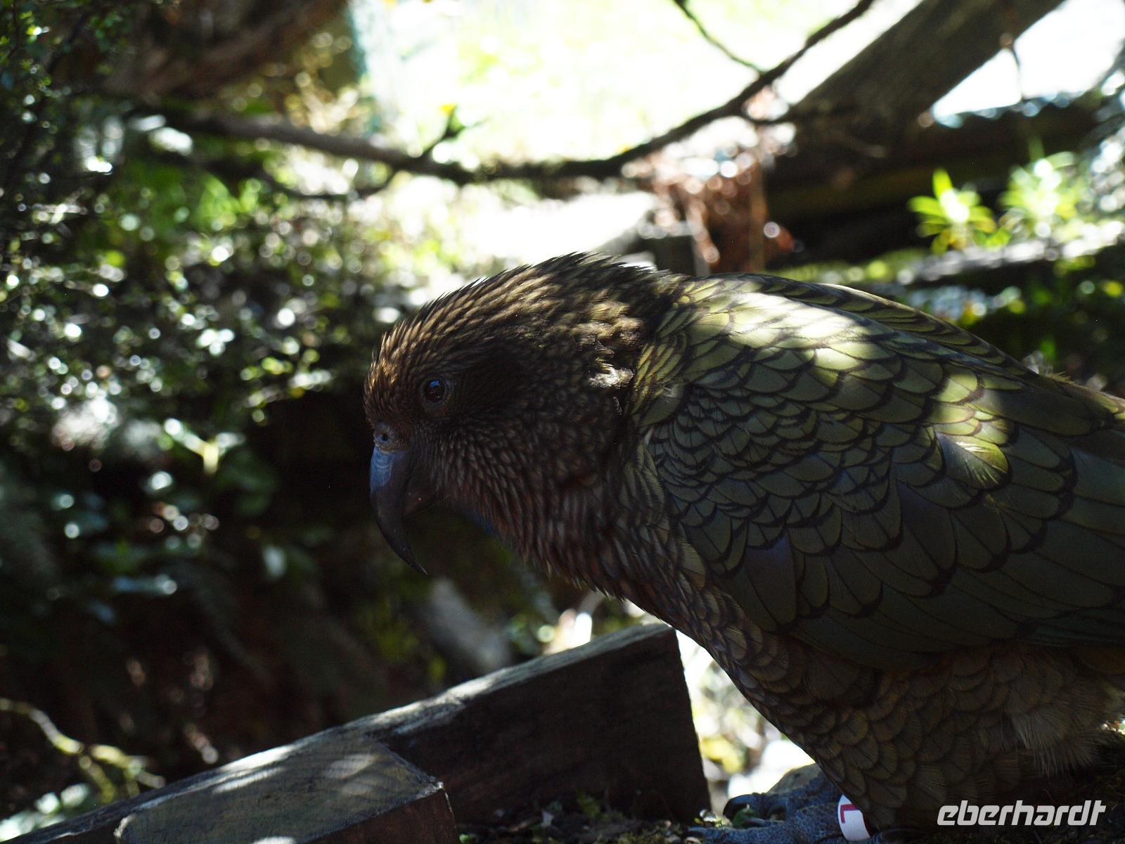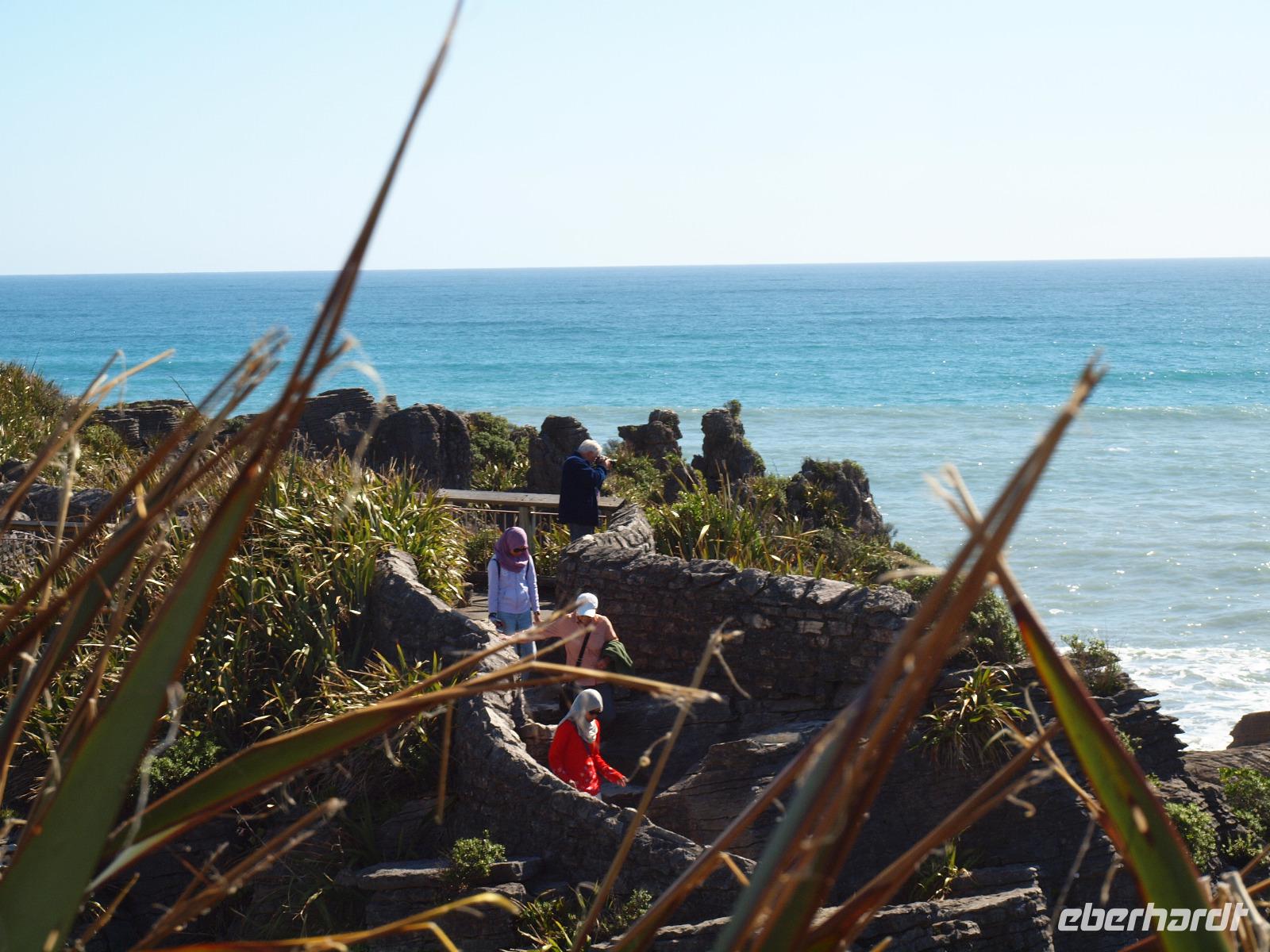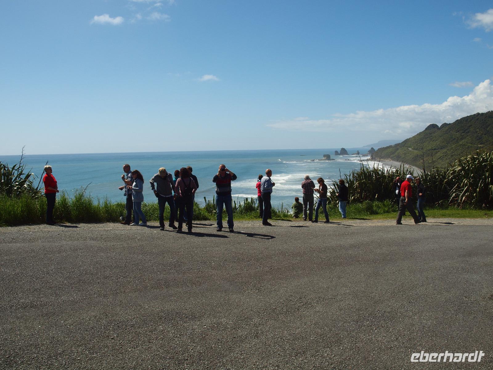 Der erste Tag in Neuseeland, wir beginnen mit einem ausgiebigen Frühstück und lernen wenig später beim Einladen der Koffer unsere Fahrerin Maxine kennen. Vollständig beladen und vorfreudig fahren wir noch einmal durch Christchurch hindurch, damit auch wirklich alle etwas von der Stadt gesehen haben. Für einen guten Überblick fahren wir auf den Mount Takahe. Leider ist die Sicht nicht ganz klar, aber wir bekommen immerhin einen Eindruck von der größten Stadt der Südinsel. Unsere Reise bringt uns heute bereits an die Westküste. Doch um diese zu erreichen müssen wir über den Arthur's Pass fahren. Während dieser Fahrt bekommen wir schon den besten Einblick in die Vielfalt der Landschaften. Unsere Umgebung wechselt ständig ihr Gesicht, erst fahren wir durch flaches Farmland, nach und nach wird es immer hügeliger und die Bergspitzen sind mit frischem Schnee bedeckt, davor saftig grüne Weiden mit grasenden Kühen und Schafen, mehr Neuseeland auf einmal geht nicht! Auch die ungewöhnlichen Felsformationen der Castle Hills wirken einfach einmalig auf uns. Einen längeren Zwischenstopp machen wir im Arthur's Pass Dorf, hier können wir etwas die Beine vertreten, einige von uns schaffen es sogar bis zum Devil Punchbowl Wasserfall. Ein kleines Restaurant gibt es hier auch, zum Glück für uns und nicht nur um unseren Hunger zu stillen. Drei Keas mögen diesen Platz auch sehr, da sie wissen, dass es hier immer wieder ein paar Leckereien zu stibitzen gibt... Mit dieser ersten Begegnung mit „Einheimischen" im Gepäck, fahren wir weiter in Richtung Westen. Wir erreichen die Westküste etwas unterhalb der Stadt Greymouth, diese werden wir auf unserer Reise noch ein weiteres Mal durchfahren. Unser heutiges Ziel liegt nördlich dieser Stadt. Der Paparoa Nationalpark beherbergt weitere ungewöhnliche Felsformationen, die Pancake Rocks (Pfannkuchenfelsen). Da es das Wetter noch gut mir uns meint fahren wir noch heute zu diesen Felsen an der Küste. Hier erodieren übereinander geschichtete Ablagerungen von Kalksedimenten und Tonmineralien unterschiedlich schnell. An der Oberfläche sind sie den Wellen, Wind und Regen ausgesetzt und so schreitet die Abtragung stetig voran. Bei Flut bricht das Wasser der Brandung an den zahlreichen Felsnasen, in Höhlen und Ausspülungen und wird beim Zurückfließen durch die „Blowholes" gedrückt.