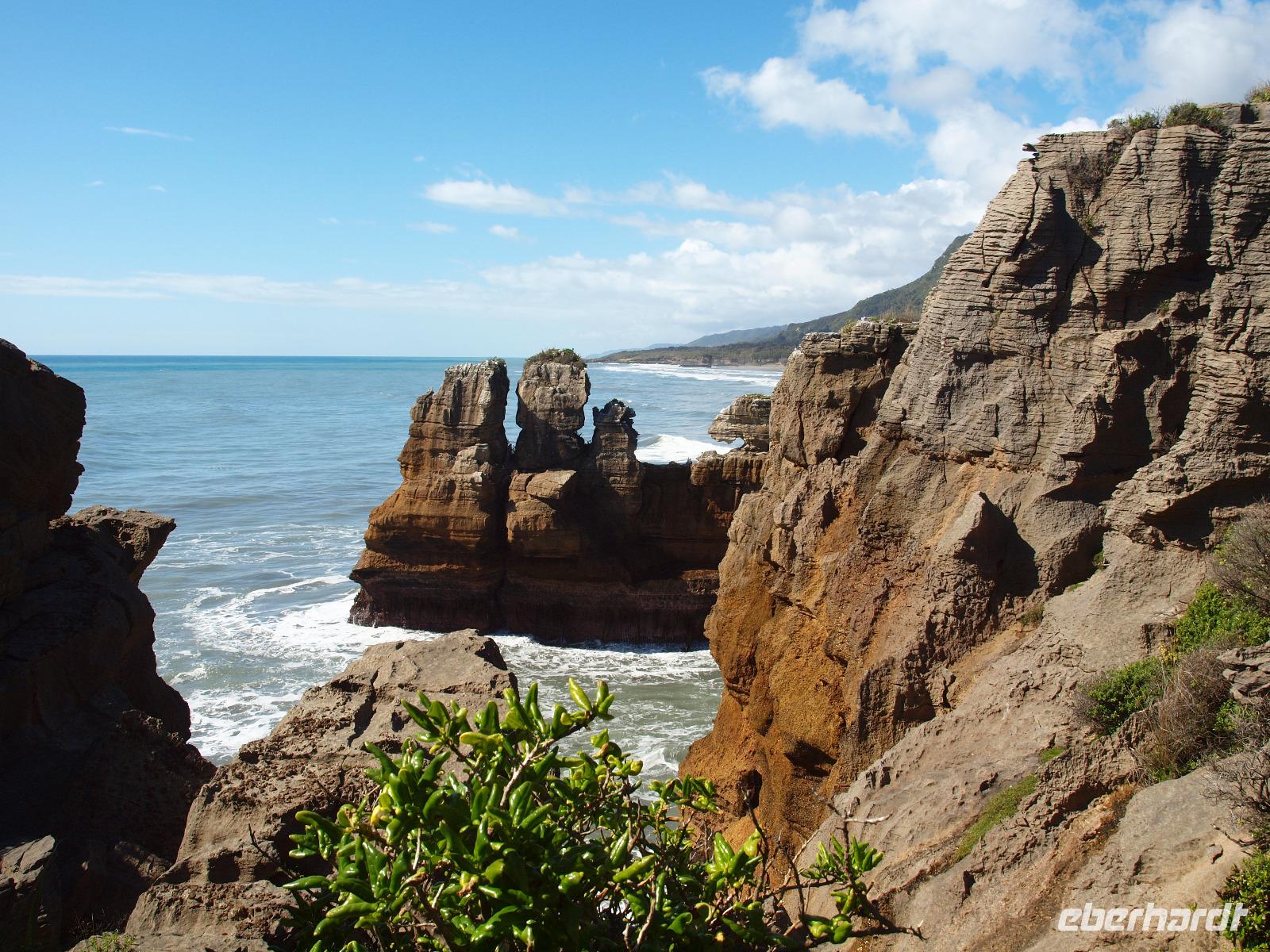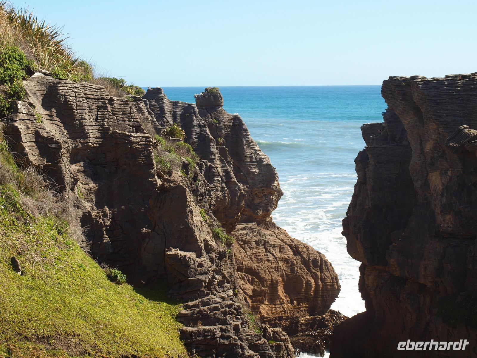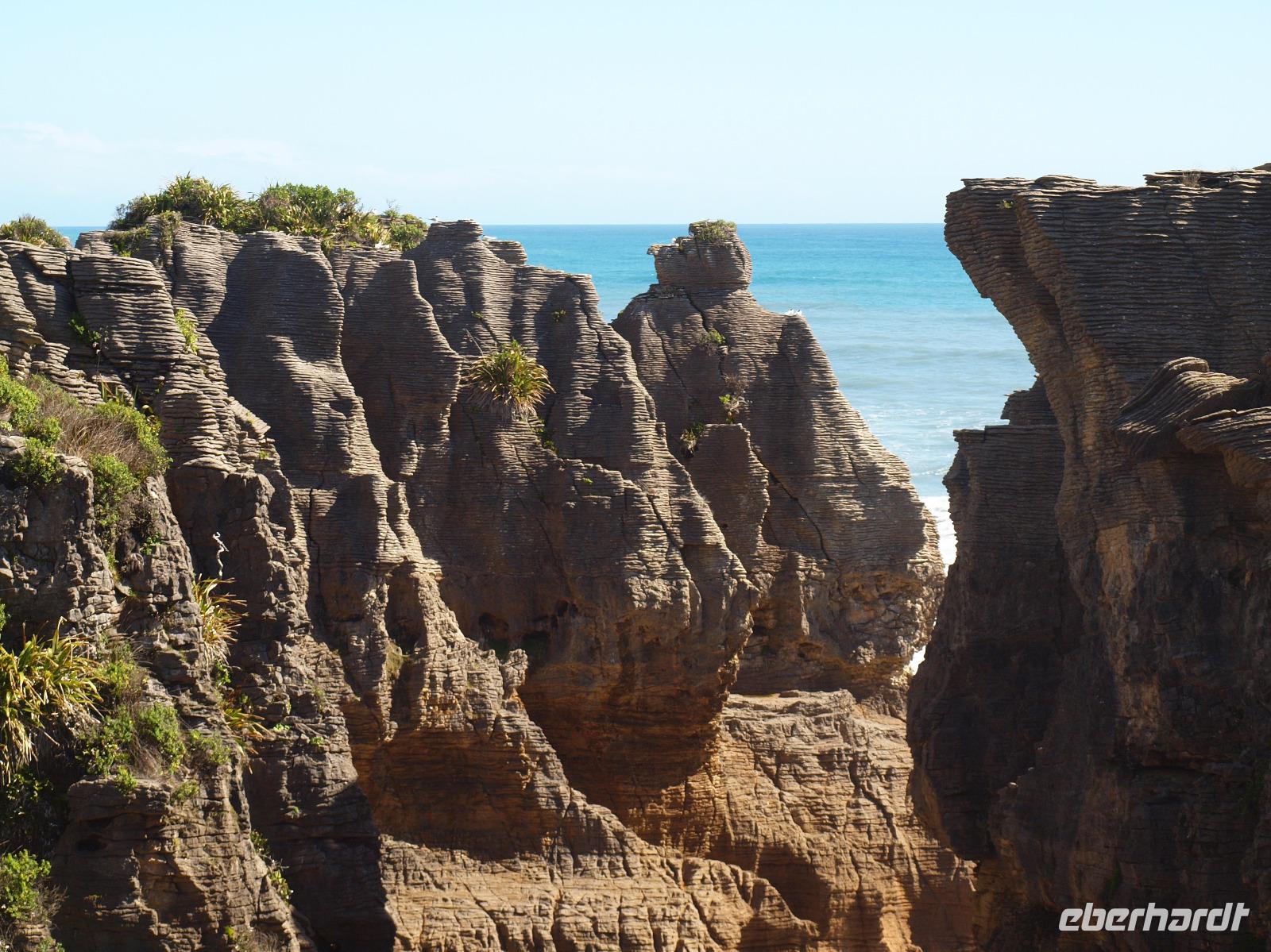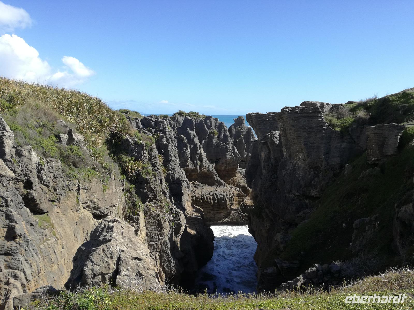 Der erste Tag in Neuseeland, wir beginnen mit einem ausgiebigen Frühstück und lernen wenig später beim Einladen der Koffer unsere Fahrerin Maxine kennen. Vollständig beladen und vorfreudig fahren wir noch einmal durch Christchurch hindurch, damit auch wirklich alle etwas von der Stadt gesehen haben. Für einen guten Überblick fahren wir auf den Mount Takahe. Leider ist die Sicht nicht ganz klar, aber wir bekommen immerhin einen Eindruck von der größten Stadt der Südinsel. Unsere Reise bringt uns heute bereits an die Westküste. Doch um diese zu erreichen müssen wir über den Arthur's Pass fahren. Während dieser Fahrt bekommen wir schon den besten Einblick in die Vielfalt der Landschaften. Unsere Umgebung wechselt ständig ihr Gesicht, erst fahren wir durch flaches Farmland, nach und nach wird es immer hügeliger und die Bergspitzen sind mit frischem Schnee bedeckt, davor saftig grüne Weiden mit grasenden Kühen und Schafen, mehr Neuseeland auf einmal geht nicht! Auch die ungewöhnlichen Felsformationen der Castle Hills wirken einfach einmalig auf uns. Einen längeren Zwischenstopp machen wir im Arthur's Pass Dorf, hier können wir etwas die Beine vertreten, einige von uns schaffen es sogar bis zum Devil Punchbowl Wasserfall. Ein kleines Restaurant gibt es hier auch, zum Glück für uns und nicht nur um unseren Hunger zu stillen. Drei Keas mögen diesen Platz auch sehr, da sie wissen, dass es hier immer wieder ein paar Leckereien zu stibitzen gibt... Mit dieser ersten Begegnung mit „Einheimischen" im Gepäck, fahren wir weiter in Richtung Westen. Wir erreichen die Westküste etwas unterhalb der Stadt Greymouth, diese werden wir auf unserer Reise noch ein weiteres Mal durchfahren. Unser heutiges Ziel liegt nördlich dieser Stadt. Der Paparoa Nationalpark beherbergt weitere ungewöhnliche Felsformationen, die Pancake Rocks (Pfannkuchenfelsen). Da es das Wetter noch gut mir uns meint fahren wir noch heute zu diesen Felsen an der Küste. Hier erodieren übereinander geschichtete Ablagerungen von Kalksedimenten und Tonmineralien unterschiedlich schnell. An der Oberfläche sind sie den Wellen, Wind und Regen ausgesetzt und so schreitet die Abtragung stetig voran. Bei Flut bricht das Wasser der Brandung an den zahlreichen Felsnasen, in Höhlen und Ausspülungen und wird beim Zurückfließen durch die „Blowholes" gedrückt.