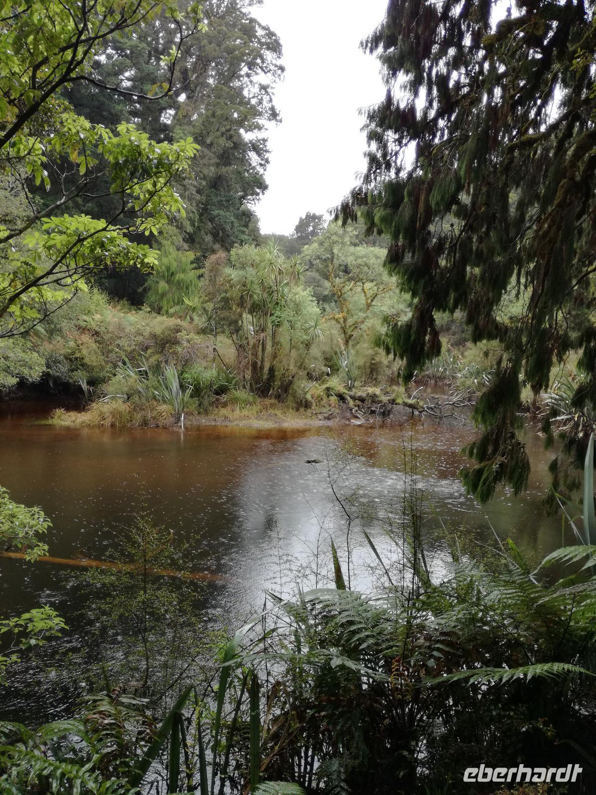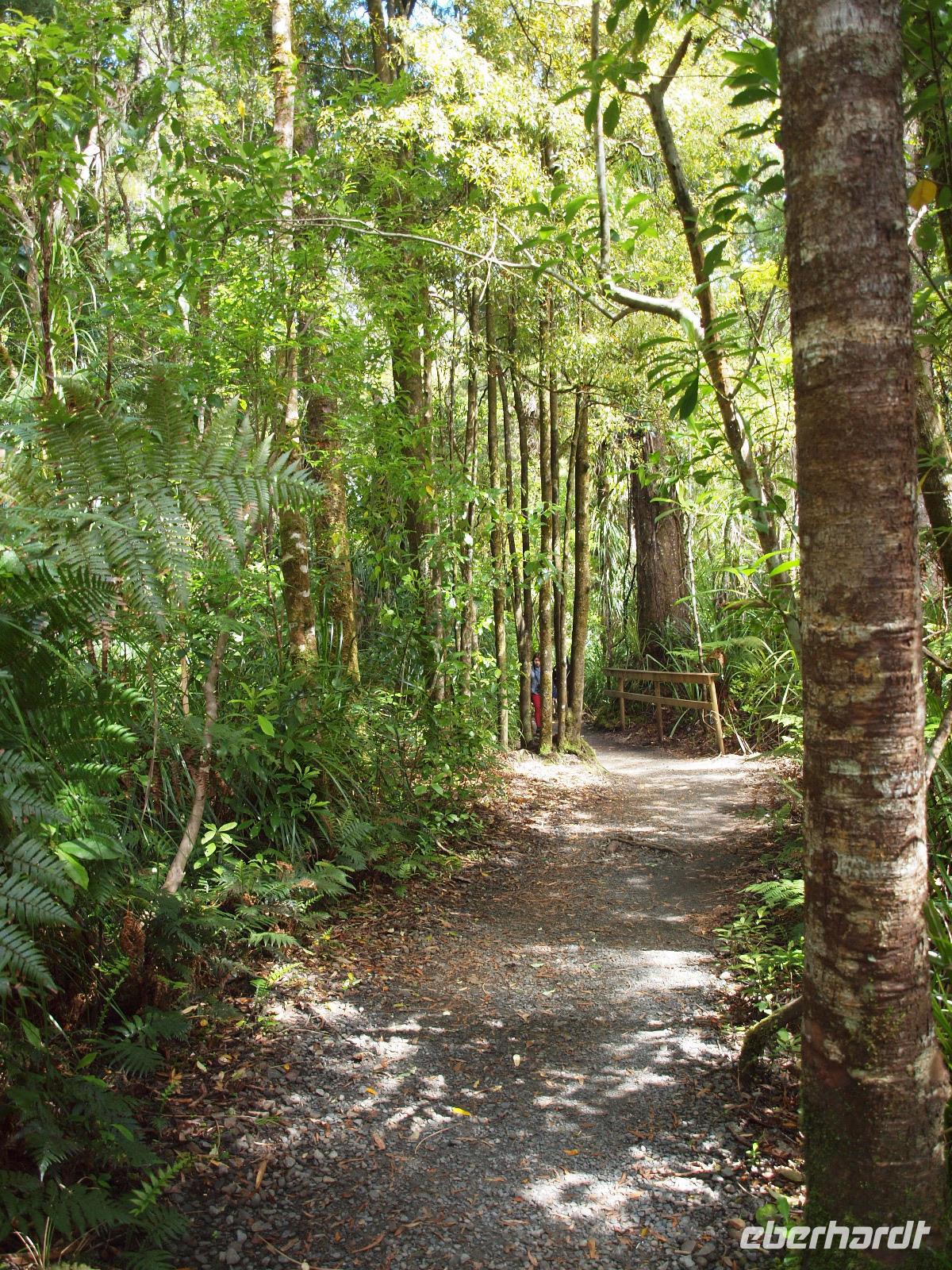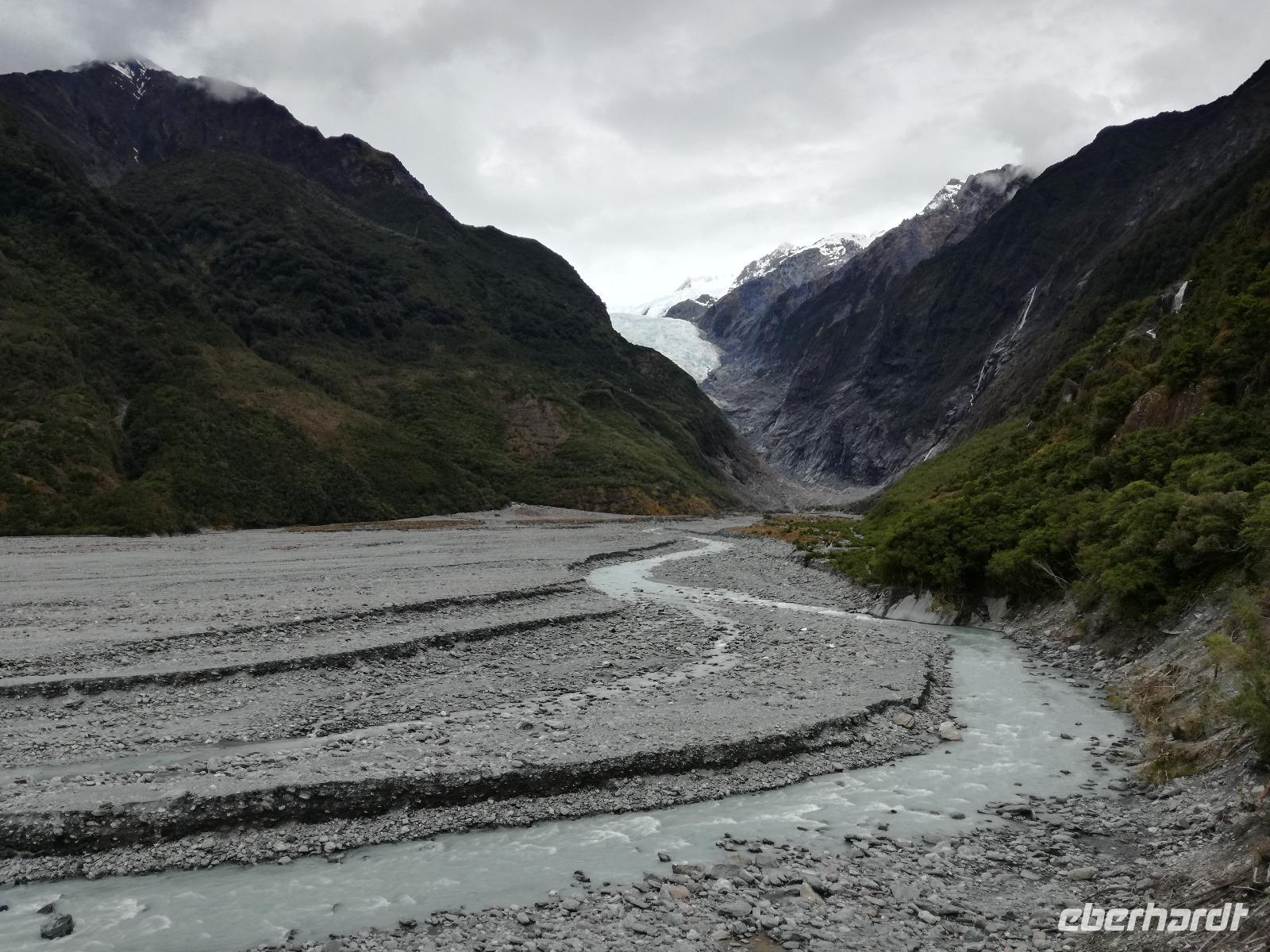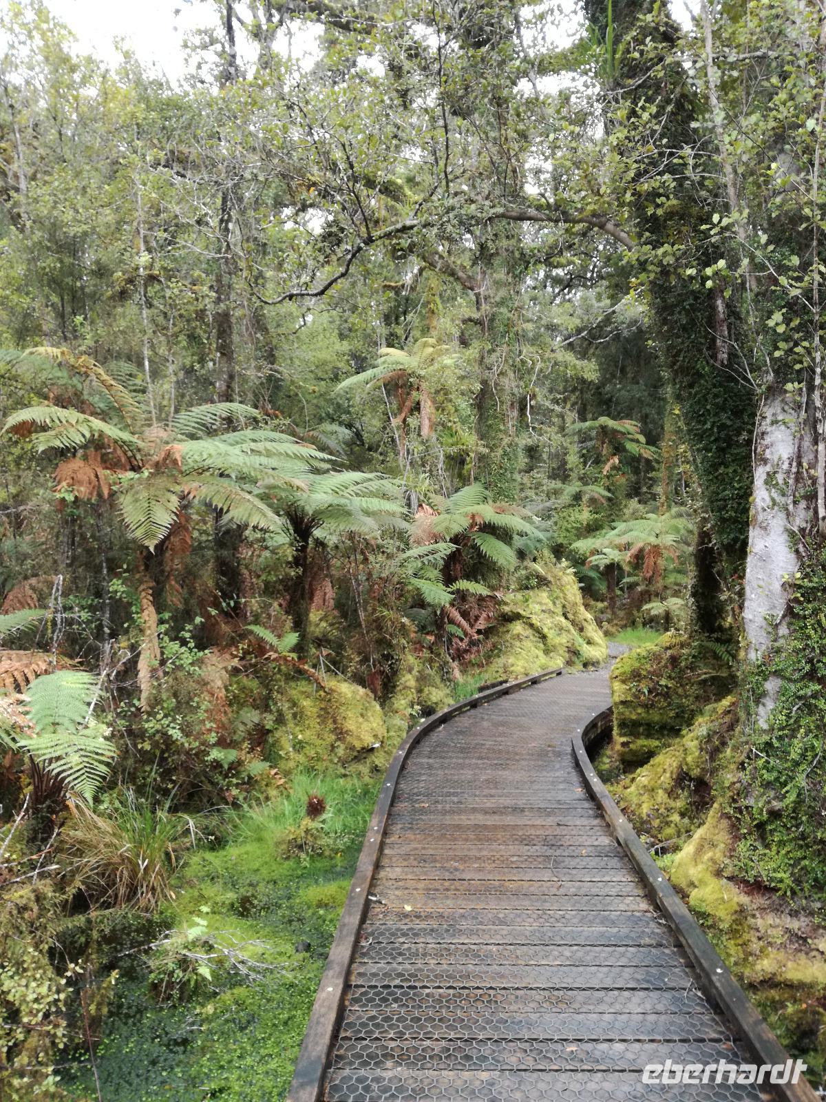 Der heutige Tag führt uns entlang der Westküste nach Süden. Unterwegs fahren wir bei leichten Regenschauern durch die Städte Greymouth, Hokitika, Ross und Harihari. In Hokitika machen wir die erste größere Pause. Die Stadt ist noch etwas verschlafen als wir sie erreichen. Die Jadefabriken haben aber zum Glück schon geöffnet und wir können einen genaueren Blick hinein werfen. Die Verarbeitung der Jade ist schon über Jahrzehnte hinweg der wichtigste Wirtschaftszweig. Doch was macht Jade so besonders? Eigentlich kannte man Jade in Neuseeland nicht, nur die Maori und einige Inselbewohner nördlich Neuseeland wussten von diesem Edelstein. Die Jade, auf Maori Pounamu, spielt eine wichtige Rolle in der Kultur der Maori, der Edelstein wird als Schatz angesehen. Besonders zur Herstellung von Waffen, Schmuck und Werkzeugen wurde er genutzt. Die schönen geschliffenen Halskettenanhänger besitzen ihr eigenes Mana (Macht/Bedeutung) und wurden als wertvolle Erbstücke weitergegeben. Gefunden wird die Jade in unscheinbaren Steinen in den Flüssen Neuseelands, erst durch das aufschneiden der Steine kann man herausfinden, ob sich auch wirklich Jade darin befindet. Wir durchstöbern in unserer Pause also die vielen Jadeläden und einige von uns werden sogar schon fündig, die ersten Souvenirs sind gekauft und mit etwas Proviant aus dem Supermarkt fahren wir weiter. Der Regen ist heute leider unser ständiger Wegbegleiter, was die Freizeitaktivitäten an unserem Tagesziel etwas schwierig gestalten... Wenig später erreichen wir dann schon die Ortschaft Franz Josef. Hier gibt es ein paar Souvenirläden, einen Minisupermarkt, eine Tankstelle und ein paar Cafés und Restaurants. Nach einem kleinen Snack fahren wir in den Nationalpark hinein. Über einen Pfad gelangen wir zu einer Aussichtsplattform mit Blick auf den Franz Josef Gletscher, der leider nur noch sehr weit oben zwischen den Berghängen zu sehen ist. Das Gletschertal ist sehr weitläufig und ausgewaschen, von den Berghängen bahnen sich ein paar Wasserfälle ihren Weg hinab. Wir nutzen den regenfreien Moment und dehnen den Spaziergang noch etwas weiter aus. Danach fahre wir in den Nachbarort Fox, hier befindet sich der gleichnamige Fox Gletscher. Wir beziehen unsere Zimmer und treffen uns wenig später zum Abendessen in einem Restaurant, direkt unterhalb des Hotels. Nach dem Essen wagen sich noch ein paar Mutige zusammen mit Hans in den Busch für einen Nachtspaziergang und um hier im Dunkeln Glühwürmchen zu sehen.