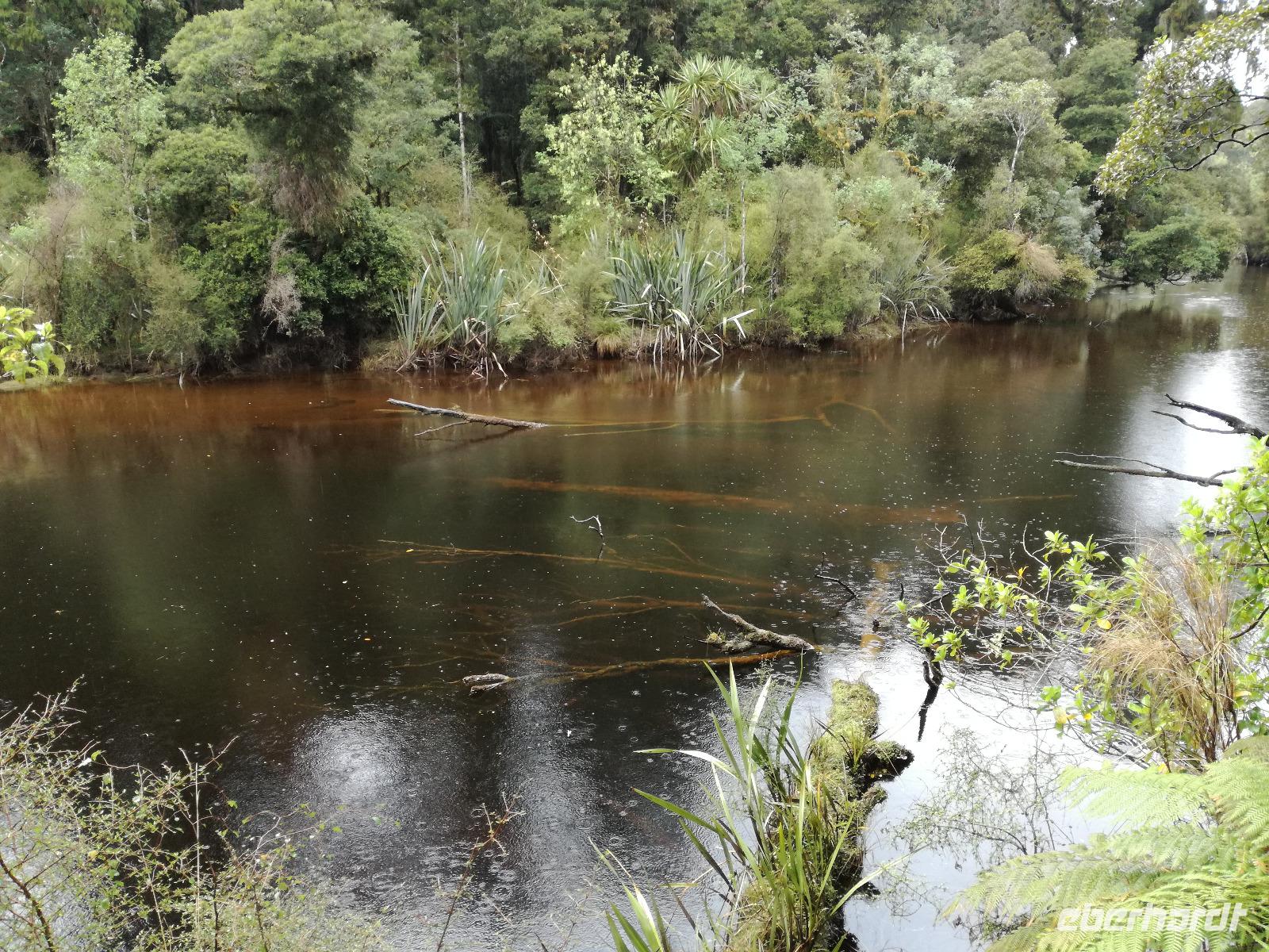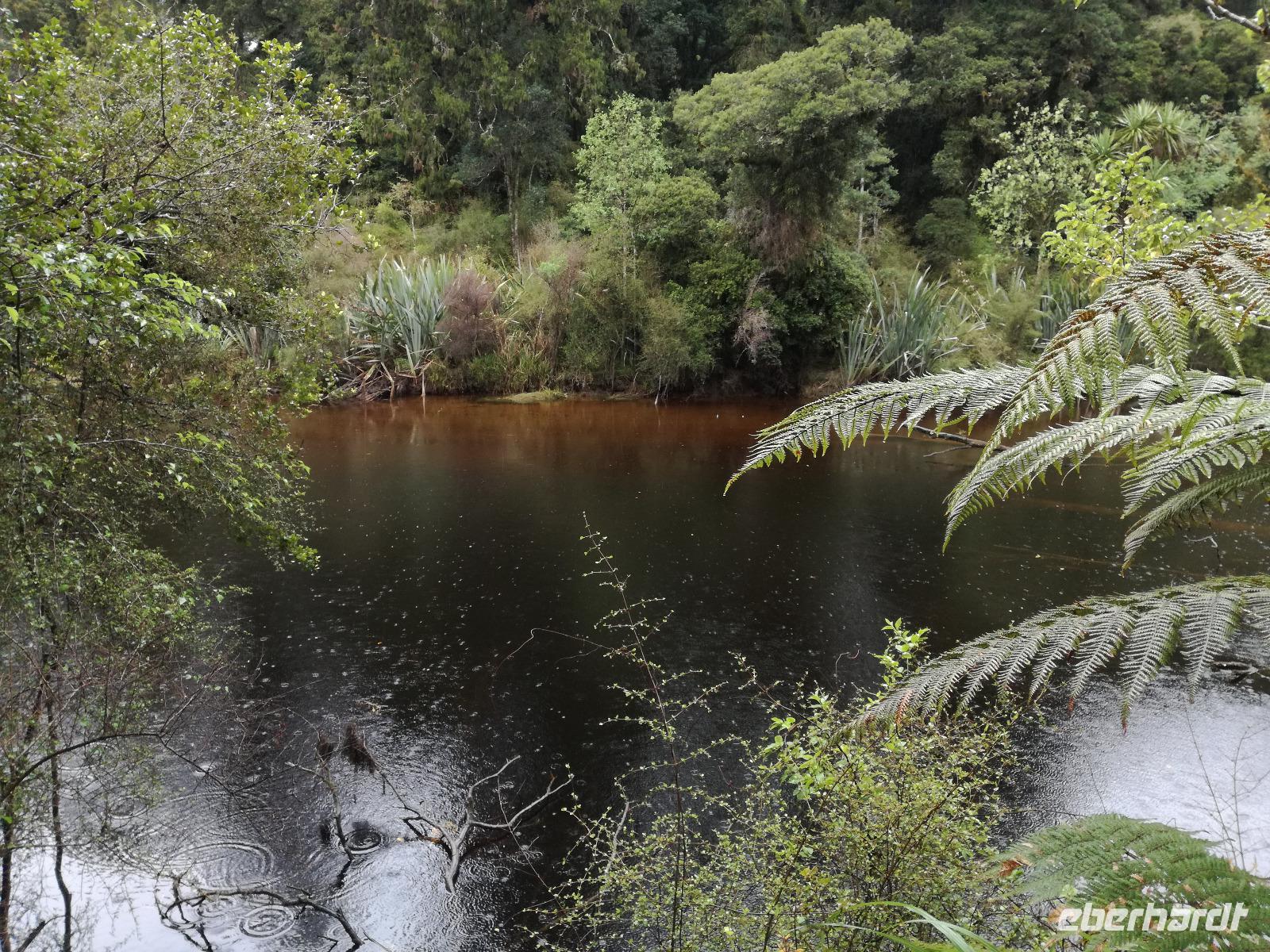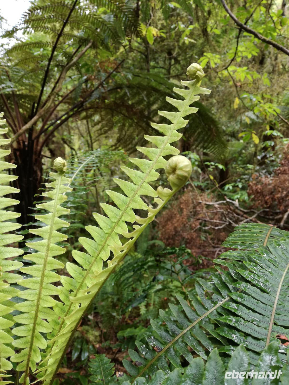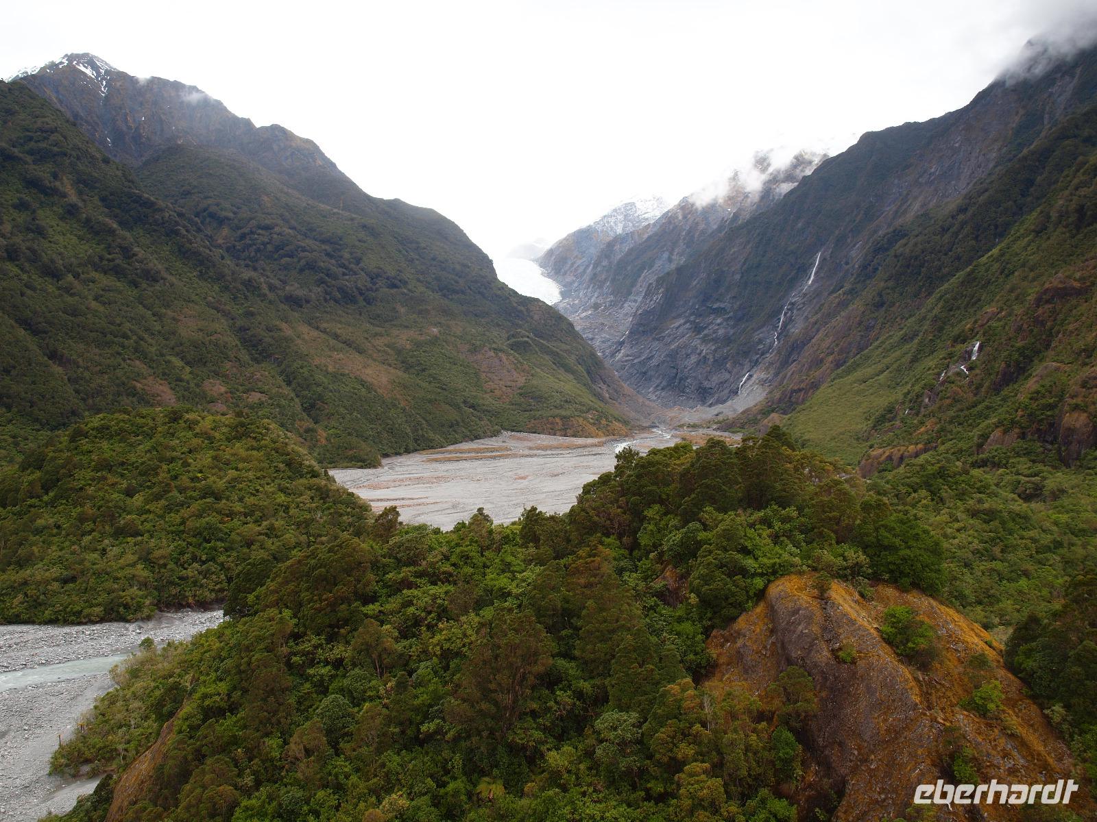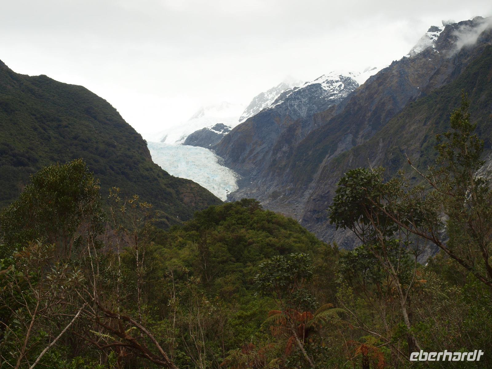 Der heutige Tag führt uns entlang der Westküste nach Süden. Unterwegs fahren wir bei leichten Regenschauern durch die Städte Greymouth, Hokitika, Ross und Harihari. In Hokitika machen wir die erste größere Pause. Die Stadt ist noch etwas verschlafen als wir sie erreichen. Die Jadefabriken haben aber zum Glück schon geöffnet und wir können einen genaueren Blick hinein werfen. Die Verarbeitung der Jade ist schon über Jahrzehnte hinweg der wichtigste Wirtschaftszweig. Doch was macht Jade so besonders? Eigentlich kannte man Jade in Neuseeland nicht, nur die Maori und einige Inselbewohner nördlich Neuseeland wussten von diesem Edelstein. Die Jade, auf Maori Pounamu, spielt eine wichtige Rolle in der Kultur der Maori, der Edelstein wird als Schatz angesehen. Besonders zur Herstellung von Waffen, Schmuck und Werkzeugen wurde er genutzt. Die schönen geschliffenen Halskettenanhänger besitzen ihr eigenes Mana (Macht/Bedeutung) und wurden als wertvolle Erbstücke weitergegeben. Gefunden wird die Jade in unscheinbaren Steinen in den Flüssen Neuseelands, erst durch das aufschneiden der Steine kann man herausfinden, ob sich auch wirklich Jade darin befindet. Wir durchstöbern in unserer Pause also die vielen Jadeläden und einige von uns werden sogar schon fündig, die ersten Souvenirs sind gekauft und mit etwas Proviant aus dem Supermarkt fahren wir weiter. Der Regen ist heute leider unser ständiger Wegbegleiter, was die Freizeitaktivitäten an unserem Tagesziel etwas schwierig gestalten... Wenig später erreichen wir dann schon die Ortschaft Franz Josef. Hier gibt es ein paar Souvenirläden, einen Minisupermarkt, eine Tankstelle und ein paar Cafés und Restaurants. Nach einem kleinen Snack fahren wir in den Nationalpark hinein. Über einen Pfad gelangen wir zu einer Aussichtsplattform mit Blick auf den Franz Josef Gletscher, der leider nur noch sehr weit oben zwischen den Berghängen zu sehen ist. Das Gletschertal ist sehr weitläufig und ausgewaschen, von den Berghängen bahnen sich ein paar Wasserfälle ihren Weg hinab. Wir nutzen den regenfreien Moment und dehnen den Spaziergang noch etwas weiter aus. Danach fahre wir in den Nachbarort Fox, hier befindet sich der gleichnamige Fox Gletscher. Wir beziehen unsere Zimmer und treffen uns wenig später zum Abendessen in einem Restaurant, direkt unterhalb des Hotels. Nach dem Essen wagen sich noch ein paar Mutige zusammen mit Hans in den Busch für einen Nachtspaziergang und um hier im Dunkeln Glühwürmchen zu sehen.