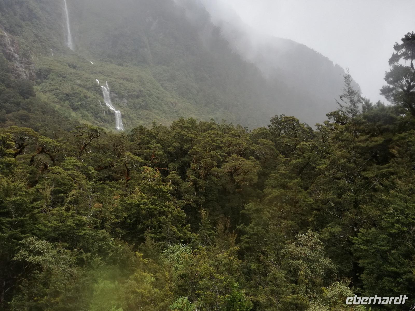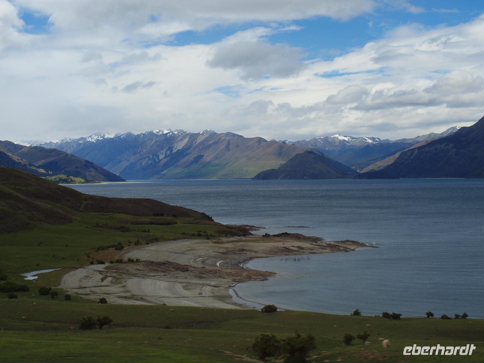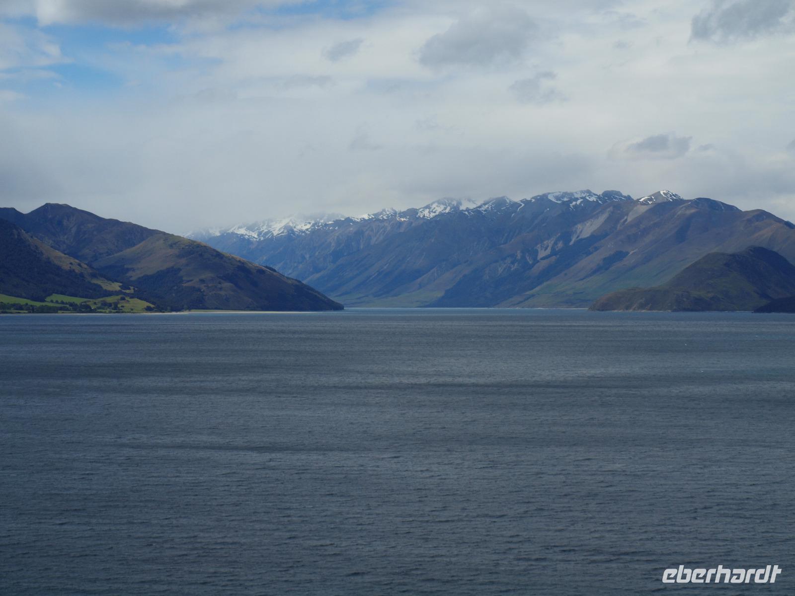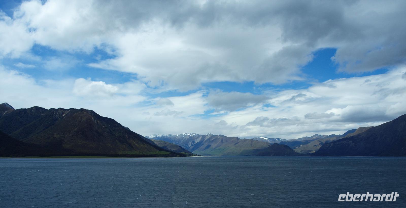 Unsere Reise geht weiter und wir starten mit einem tollen Frühstück im Lake Matheson Café. Von hier aus geht es dann über den Haast Pass in Richtung Ship Creek. Wir unternehmen einen Spaziergang durch den Busch und Hans zeigt uns die verschieden Baumarten, die uns hier ins Auge fallen. Nach einem kleinen Abstecher zum Strand, der für die meisten recht trocken ausgeht, abgesehen vom Regen, fahren wir weiter. An der Straße wenig später sehen wir dann auch noch einen tollen Wasserfall, genannt Thunderfall. Nach diesem Stopp verlassen wir die Gletscherregion und fahren wieder etwas östlich ins Landesinnere. Der Lake Wanaka, der viertgrößte Binnensee Neuseelands, bietet tolle Panoramabilder. Die Straße schlängelt sich entlang seines Ufers und wir genießen den Augenblick.