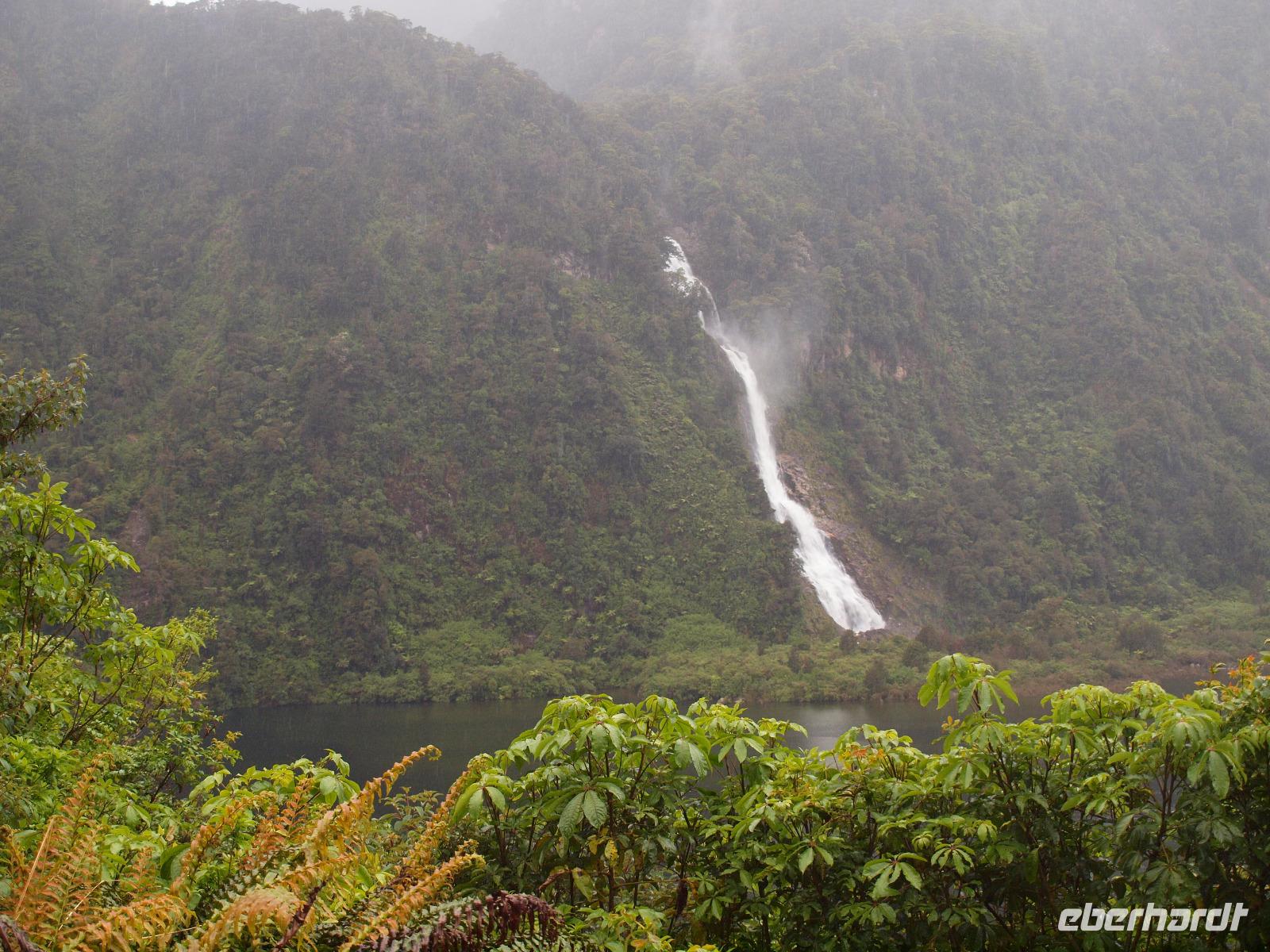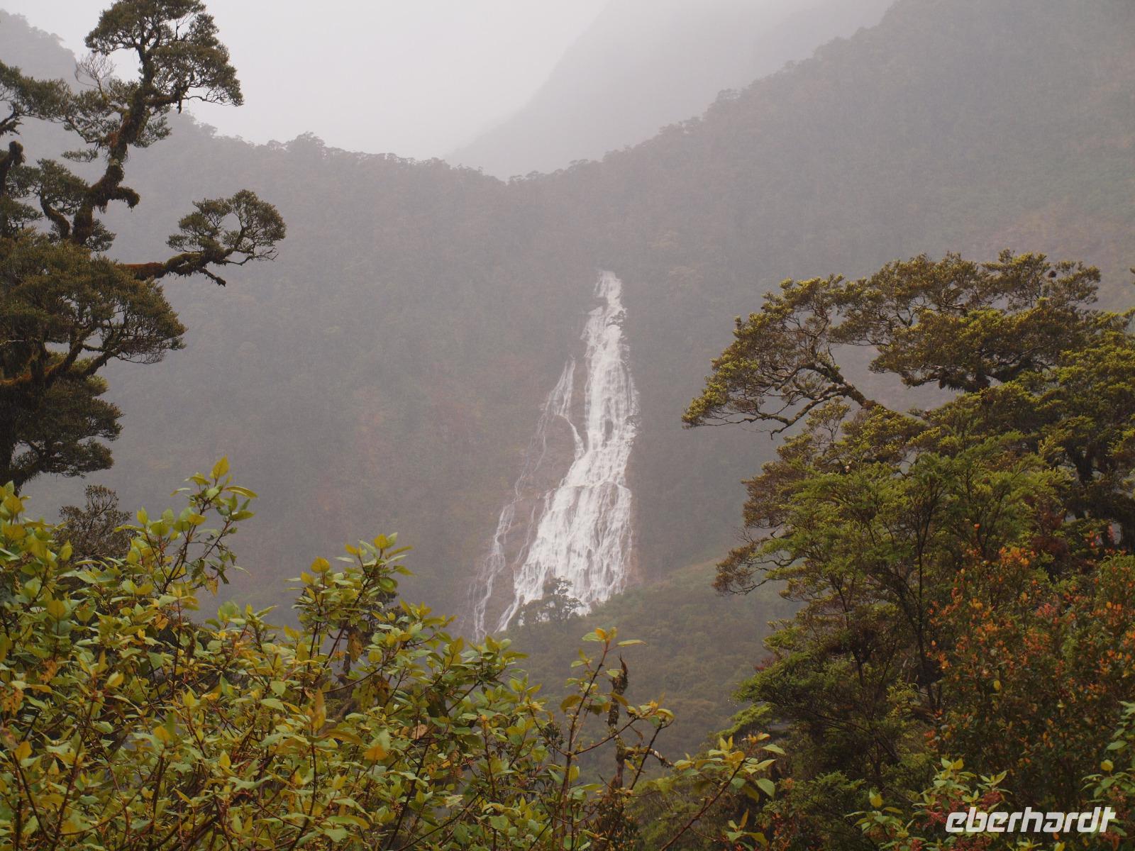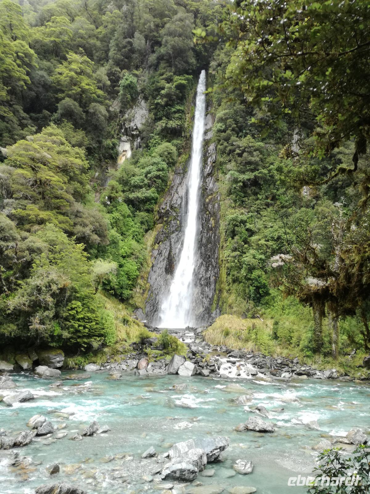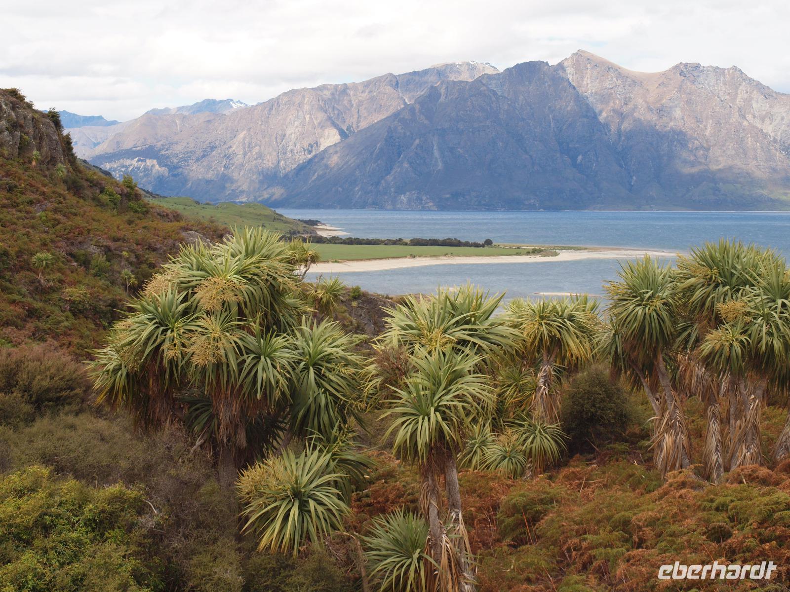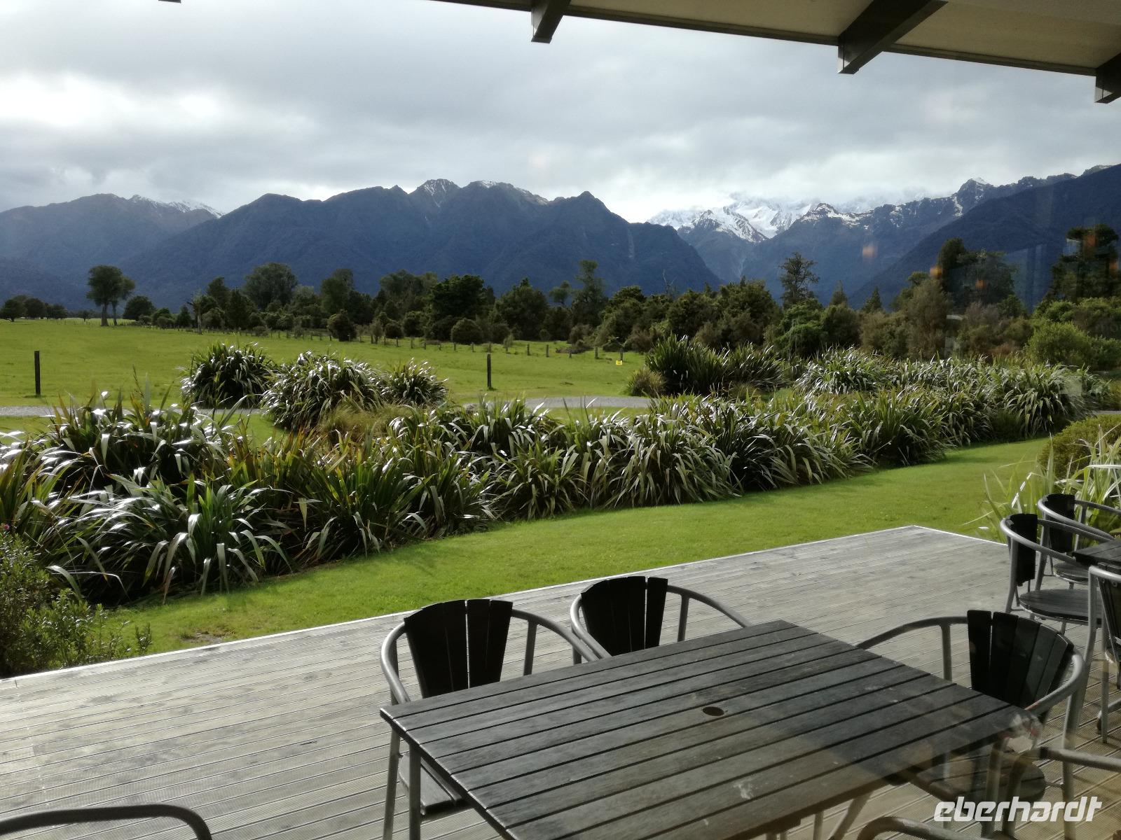 Unsere Reise geht weiter und wir starten mit einem tollen Frühstück im Lake Matheson Café. Von hier aus geht es dann über den Haast Pass in Richtung Ship Creek. Wir unternehmen einen Spaziergang durch den Busch und Hans zeigt uns die verschieden Baumarten, die uns hier ins Auge fallen. Nach einem kleinen Abstecher zum Strand, der für die meisten recht trocken ausgeht, abgesehen vom Regen, fahren wir weiter. An der Straße wenig später sehen wir dann auch noch einen tollen Wasserfall, genannt Thunderfall. Nach diesem Stopp verlassen wir die Gletscherregion und fahren wieder etwas östlich ins Landesinnere. Der Lake Wanaka, der viertgrößte Binnensee Neuseelands, bietet tolle Panoramabilder. Die Straße schlängelt sich entlang seines Ufers und wir genießen den Augenblick.