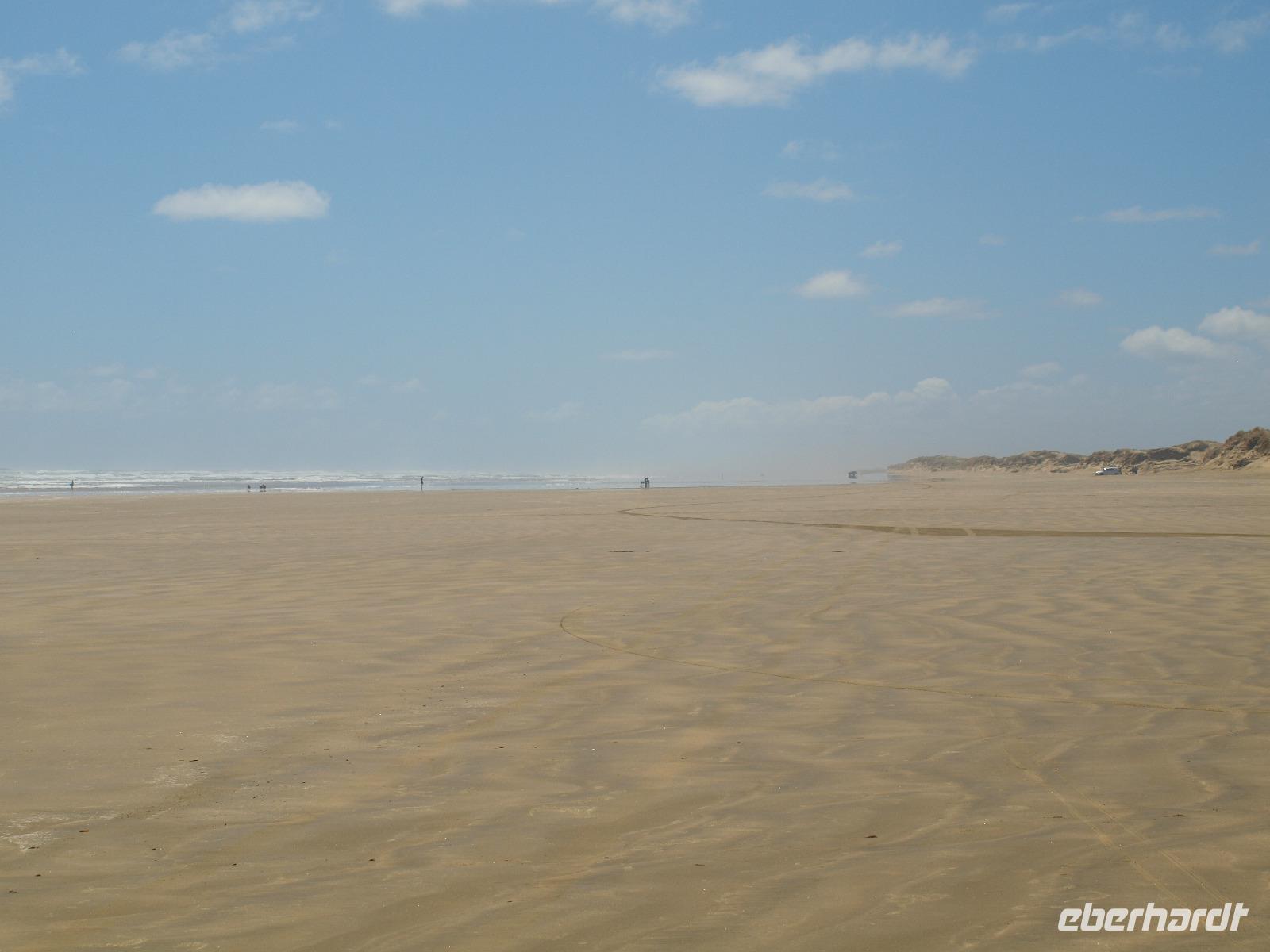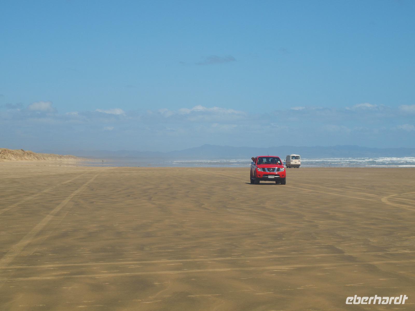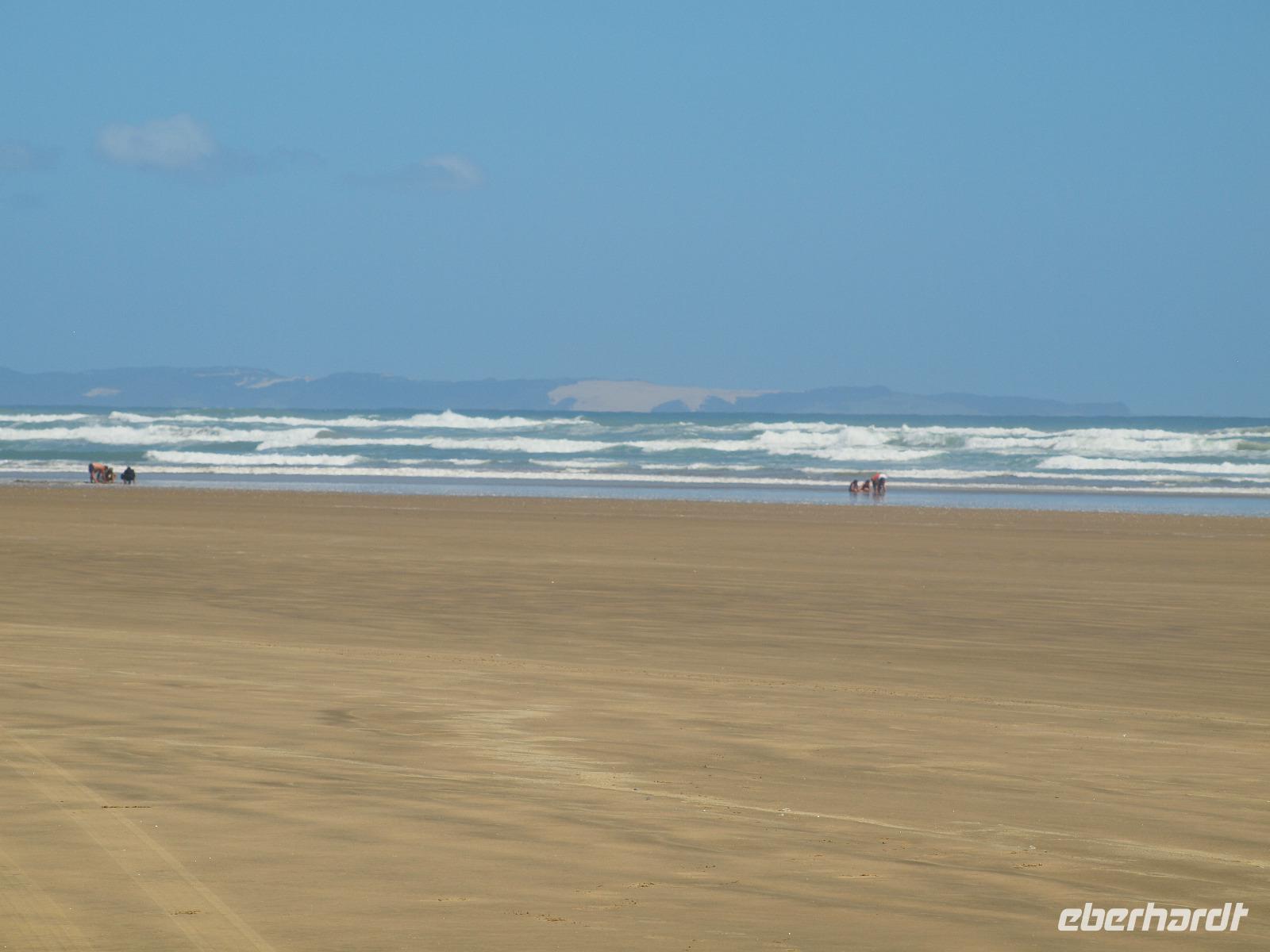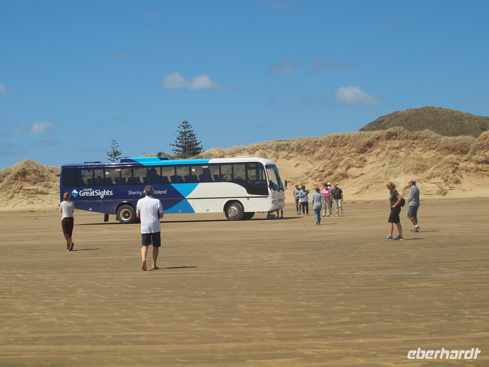 Von hier aus fahren wir wieder ein Stück der alten bekannten Strecke zurück. Dann biegen wir irgendwann rechts ab und stehen wieder im Sand. Hier am Nintey Mile Beach, der eigentlich nur 55 Meilen lang ist (also ca. 88 Kilometer). Wir laufen ein paar Meter bis zum Wasser und fragen uns, was Roger da im Sand sammelt. Es sind Muscheln, Muscheln für sein Abendessen, eine seiner Leibspeisen wie er meint. Mit dem Bus nehmen wir also den Strand nun als Highway und Roger ist in seinem Element. Mit einigen gewagten Fahrmanövern hält er uns auf Trab. Nach einigen Kilometern verlassen wir den Strand dann wieder und steuern ein kleines Kauri-Museum an. Hier wird unser Bus erst einmal vom Sand befreit und wir können uns ein paar interessante Dinge im Ausstellungsraum ansehen. Letzte Station für heute sind dann noch lebende Kauribäume. Wir machen einen kleinen Abstecher in den Busch und sehen wohl zum ersten Mal die großen Bäume, die die Erde und den Himmel noch heute auseinander halten...