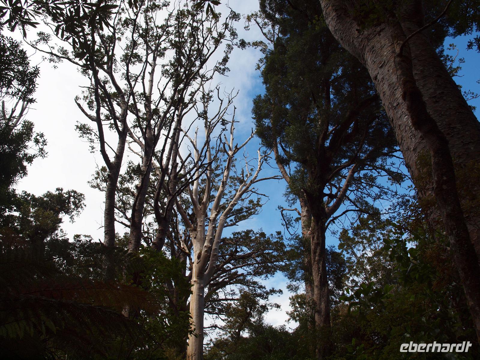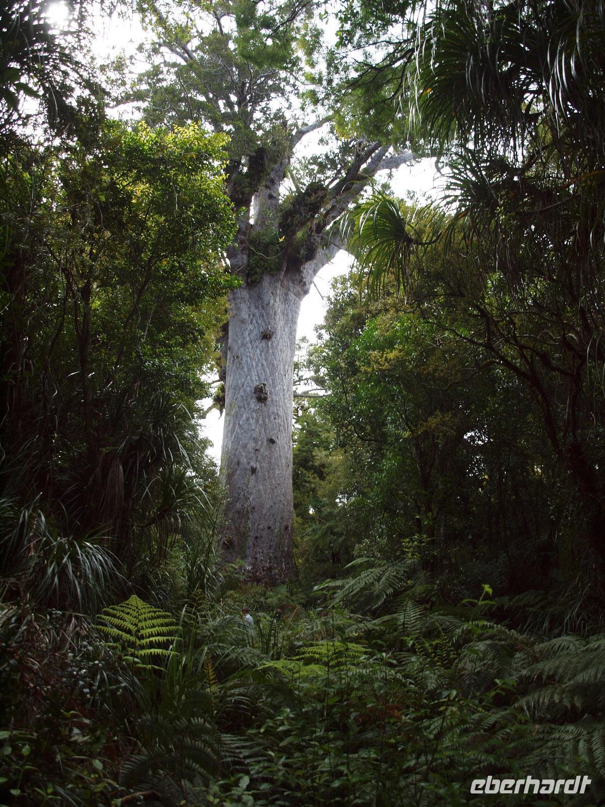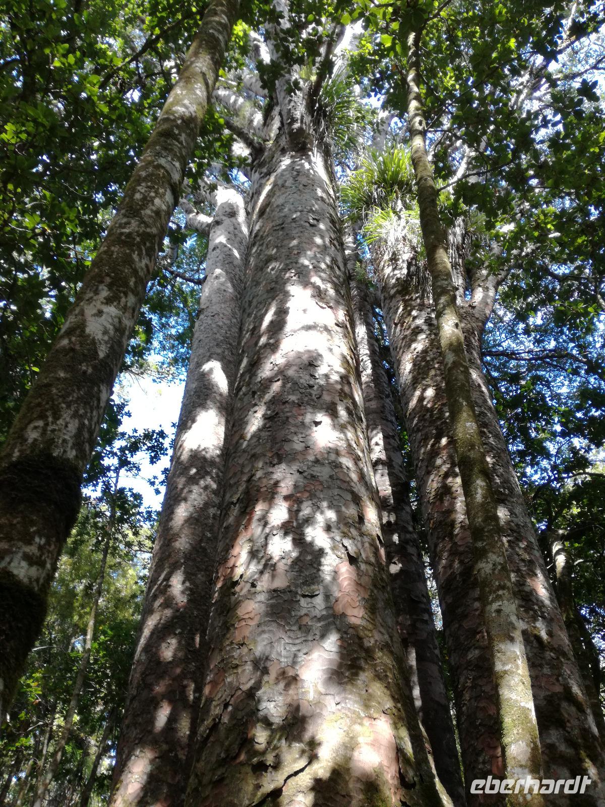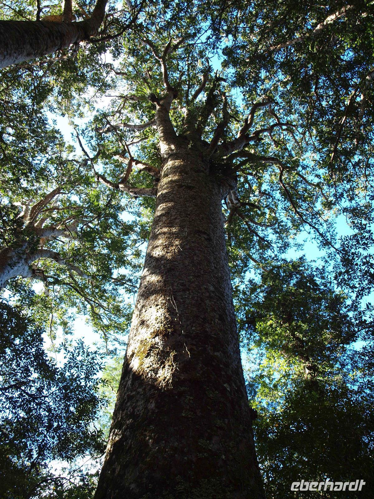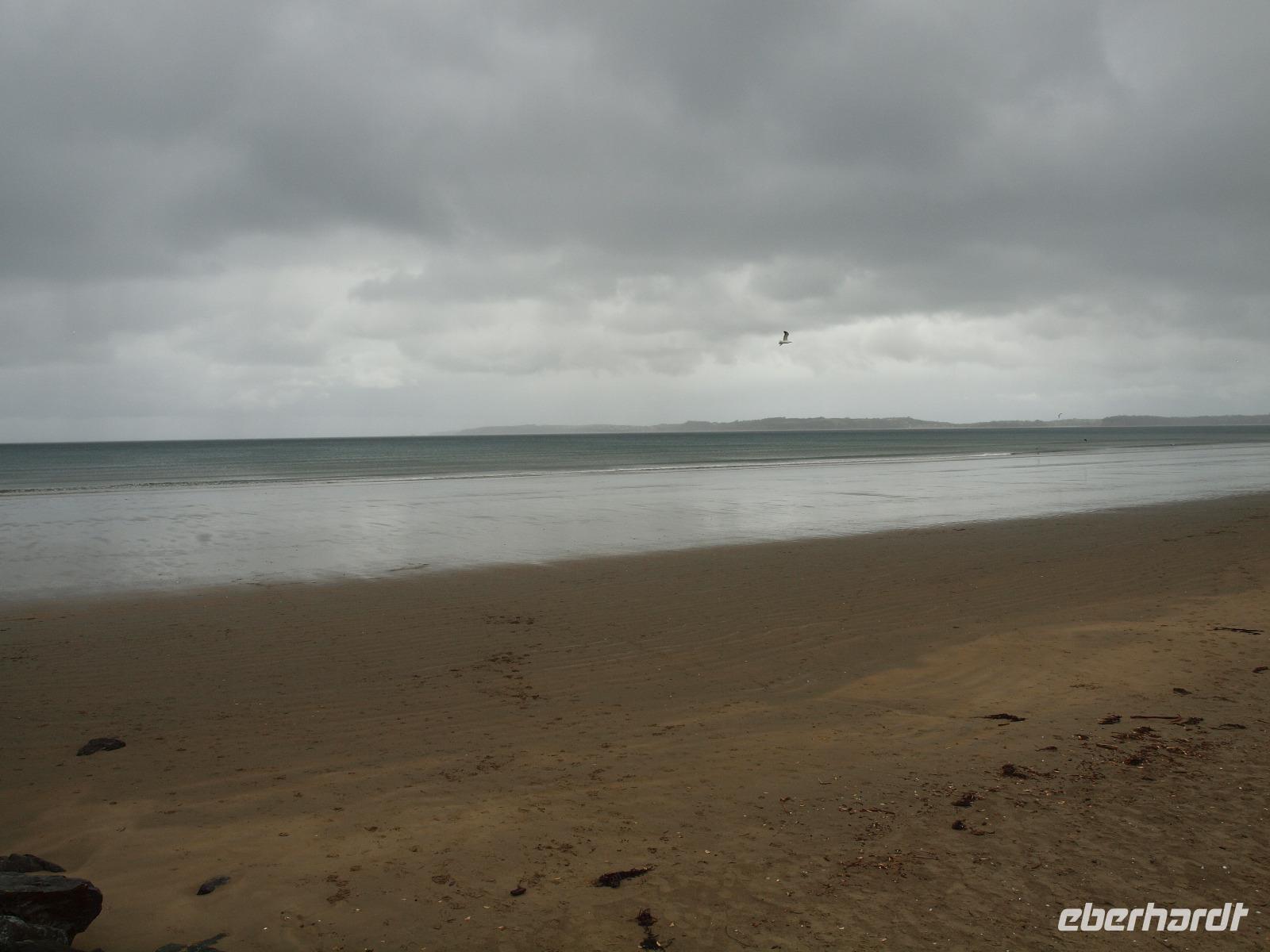 Von hier aus fahren wir wieder ein Stück der alten bekannten Strecke zurück. Dann biegen wir irgendwann rechts ab und stehen wieder im Sand. Hier am Nintey Mile Beach, der eigentlich nur 55 Meilen lang ist (also ca. 88 Kilometer). Wir laufen ein paar Meter bis zum Wasser und fragen uns, was Roger da im Sand sammelt. Es sind Muscheln, Muscheln für sein Abendessen, eine seiner Leibspeisen wie er meint. Mit dem Bus nehmen wir also den Strand nun als Highway und Roger ist in seinem Element. Mit einigen gewagten Fahrmanövern hält er uns auf Trab. Nach einigen Kilometern verlassen wir den Strand dann wieder und steuern ein kleines Kauri-Museum an. Hier wird unser Bus erst einmal vom Sand befreit und wir können uns ein paar interessante Dinge im Ausstellungsraum ansehen. Letzte Station für heute sind dann noch lebende Kauribäume. Wir machen einen kleinen Abstecher in den Busch und sehen wohl zum ersten Mal die großen Bäume, die die Erde und den Himmel noch heute auseinander halten...