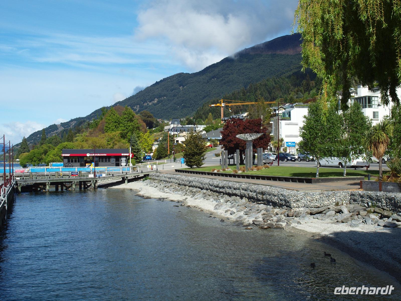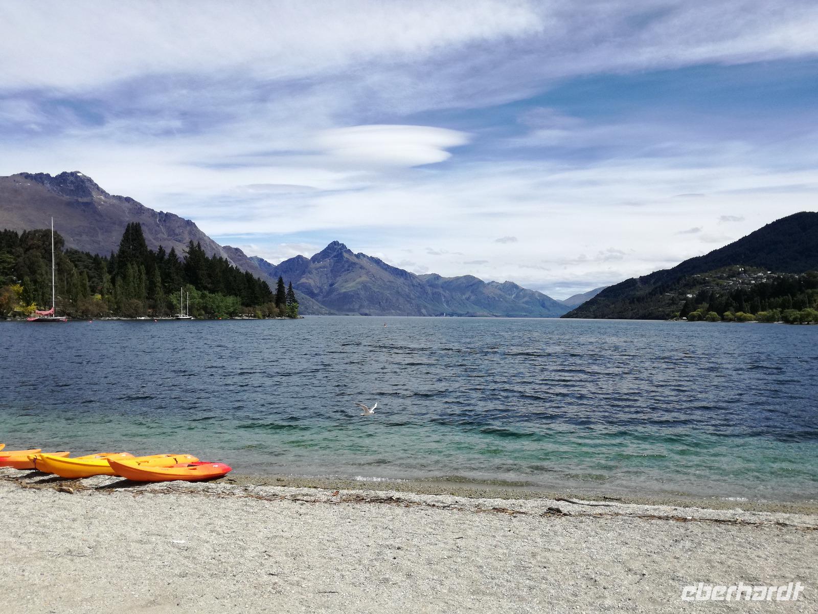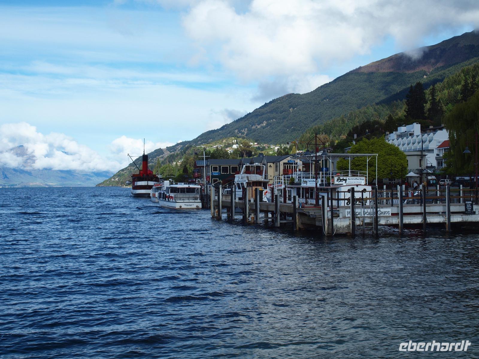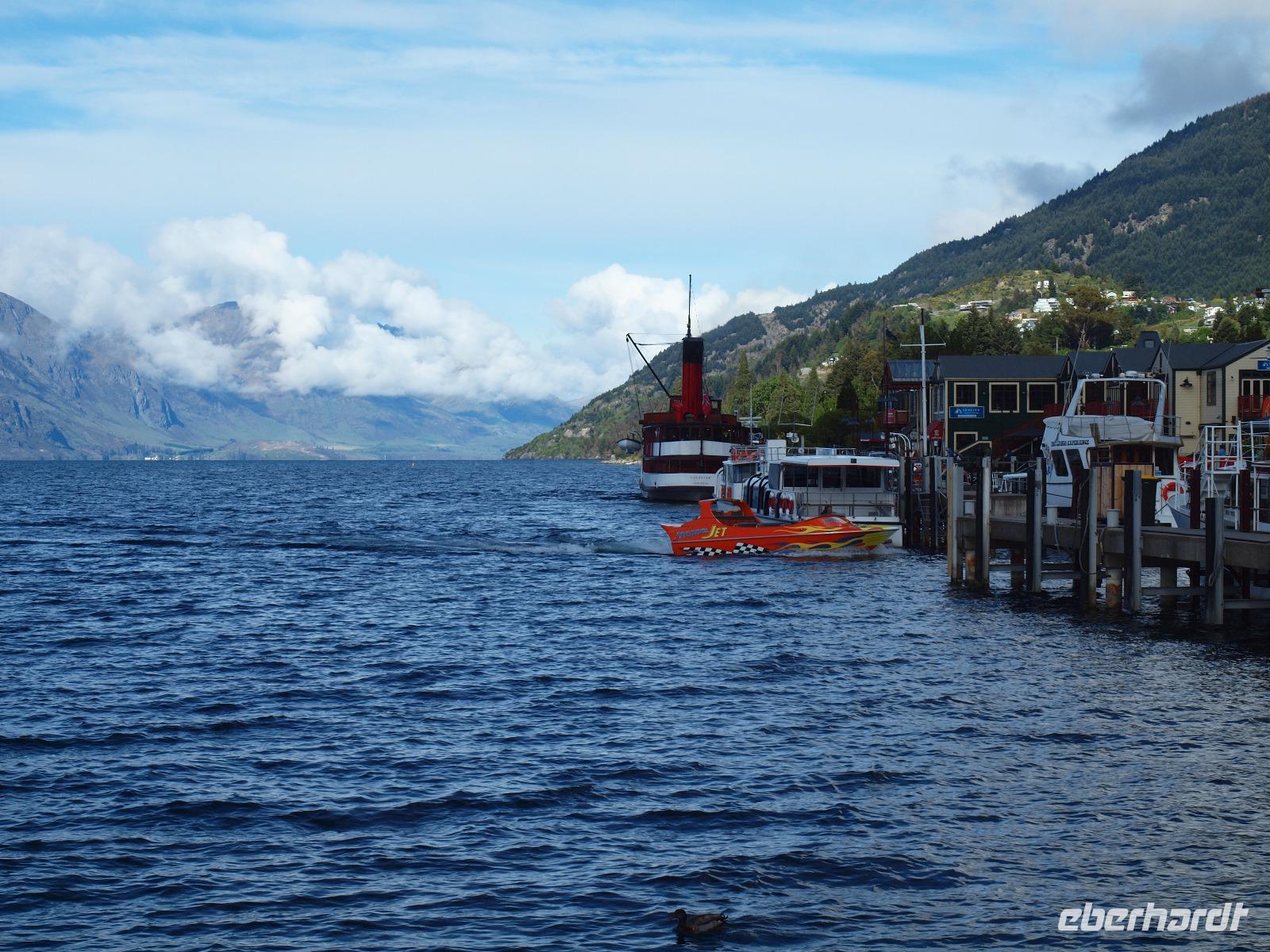 Nach einem gemütlichen Frühstück, treffen sich einige mit mir im Hotel und wir beginnen den Weg hinunter in das Zentrum gemeinsam. Schon wenig später sind wir dann in alle Himmelsrichtungen verteilt. Als erstes spazieren wir durch die Fußgängerzone, hier reihen sich viele Geschäfte und Restaurants aneinander, bis hin zur Wasserfront. Hier unten ist auch der kleine Hafen der Stadt. Hier legt die TSS Earnslaw jeden Tag zu verschiedenen Zeiten ab. Die Earnslaw ist 1912 erbaut und der einzige noch kommerziell betriebene kohlebefeuerte Passagierdampfer der Südhalbkugel. Sie gilt außerdem als eine der Hauptattraktionen von Queenstown. Gleich daneben liegen ein paar kleinere Boote, unter anderem auch ein Jetboot. Jetboote wurden ursprünglich von William Hamilton für die speziellen Anforderungen in Neuseeland entwickelt. Denn das Besondere an dem Boot ist folgendes: Das zum Vortrieb benötigte Wasser wird im Heckbereich am Boden des Bootrumpfes angesaugt, da der Bug eines Jetbootes bei schneller Gleitfahrt oft keinen Kontakt mehr zur Wasseroberfläche hat. Somit kann man auch bei Niedrigwasser schnell und leicht übers Wasser fahren. Unser Spaziergang führt uns dann hinauf zur Seilbahnstation. Zum Glück ist das Wetter heute auf unserer Seite und wir können bei strahlendem Sonnenschein die Panoramaaussicht vom Bobs Peak über Queenstown genießen. Im Hintergrund sieht man sogar den mit Schnee bedeckten Gebirgszug, The Remarkables. Bei dieser Aussicht und mit genügend Sonne im Gesicht lässt es sich hier oben einige Stunden aushalten. Wer zwischendurch Hunger vom Ausschauhalten bekommt, kann sich auch im Restaurant der Bergstation eine Stärkung kaufen. Oder man geht dann doch irgendwann einfach wieder hinunter in die Stadt...