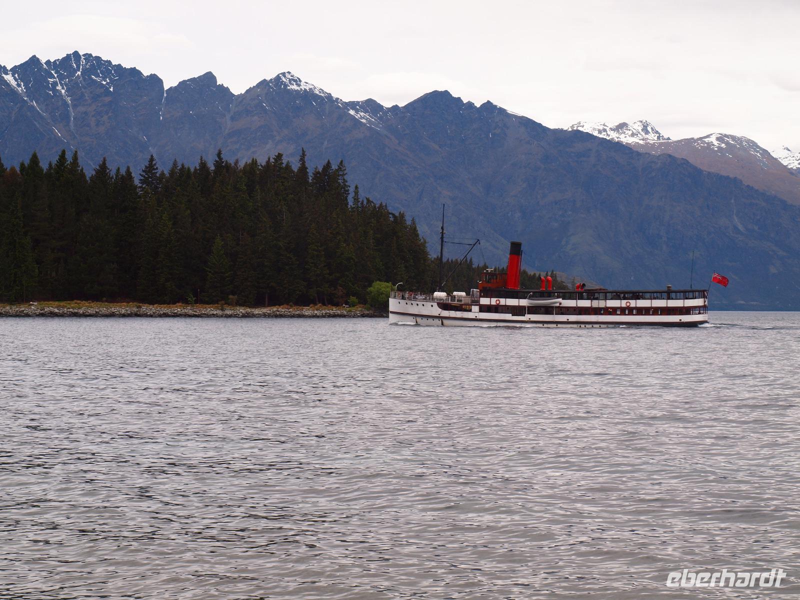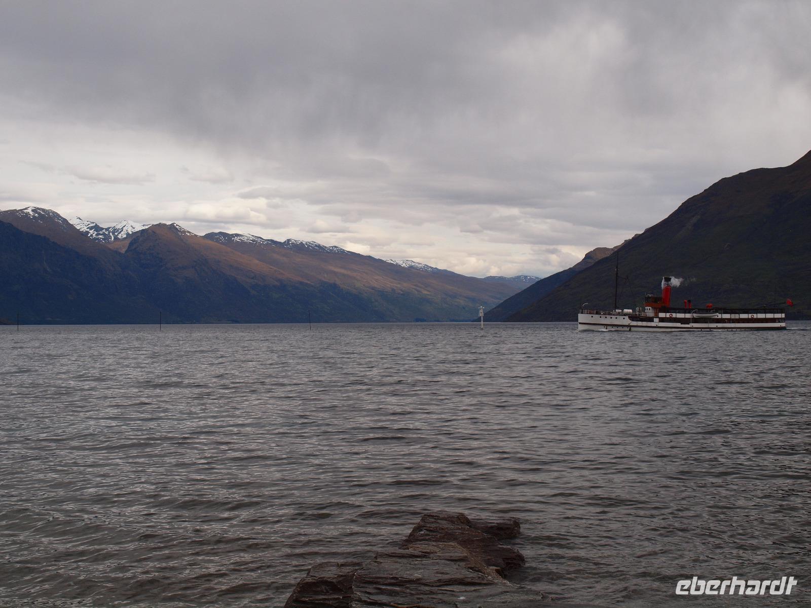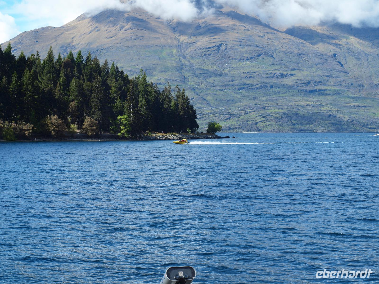Nach einem gemütlichen Frühstück, treffen sich einige mit mir im Hotel und wir beginnen den Weg hinunter in das Zentrum gemeinsam. Schon wenig später sind wir dann in alle Himmelsrichtungen verteilt. Als erstes spazieren wir durch die Fußgängerzone, hier reihen sich viele Geschäfte und Restaurants aneinander, bis hin zur Wasserfront. Hier unten ist auch der kleine Hafen der Stadt. Hier legt die TSS Earnslaw jeden Tag zu verschiedenen Zeiten ab. Die Earnslaw ist 1912 erbaut und der einzige noch kommerziell betriebene kohlebefeuerte Passagierdampfer der Südhalbkugel. Sie gilt außerdem als eine der Hauptattraktionen von Queenstown. Gleich daneben liegen ein paar kleinere Boote, unter anderem auch ein Jetboot. Jetboote wurden ursprünglich von William Hamilton für die speziellen Anforderungen in Neuseeland entwickelt. Denn das Besondere an dem Boot ist folgendes: Das zum Vortrieb benötigte Wasser wird im Heckbereich am Boden des Bootrumpfes angesaugt, da der Bug eines Jetbootes bei schneller Gleitfahrt oft keinen Kontakt mehr zur Wasseroberfläche hat. Somit kann man auch bei Niedrigwasser schnell und leicht übers Wasser fahren. Unser Spaziergang führt uns dann hinauf zur Seilbahnstation. Zum Glück ist das Wetter heute auf unserer Seite und wir können bei strahlendem Sonnenschein die Panoramaaussicht vom Bobs Peak über Queenstown genießen. Im Hintergrund sieht man sogar den mit Schnee bedeckten Gebirgszug, The Remarkables. Bei dieser Aussicht und mit genügend Sonne im Gesicht lässt es sich hier oben einige Stunden aushalten. Wer zwischendurch Hunger vom Ausschauhalten bekommt, kann sich auch im Restaurant der Bergstation eine Stärkung kaufen. Oder man geht dann doch irgendwann einfach wieder hinunter in die Stadt...
