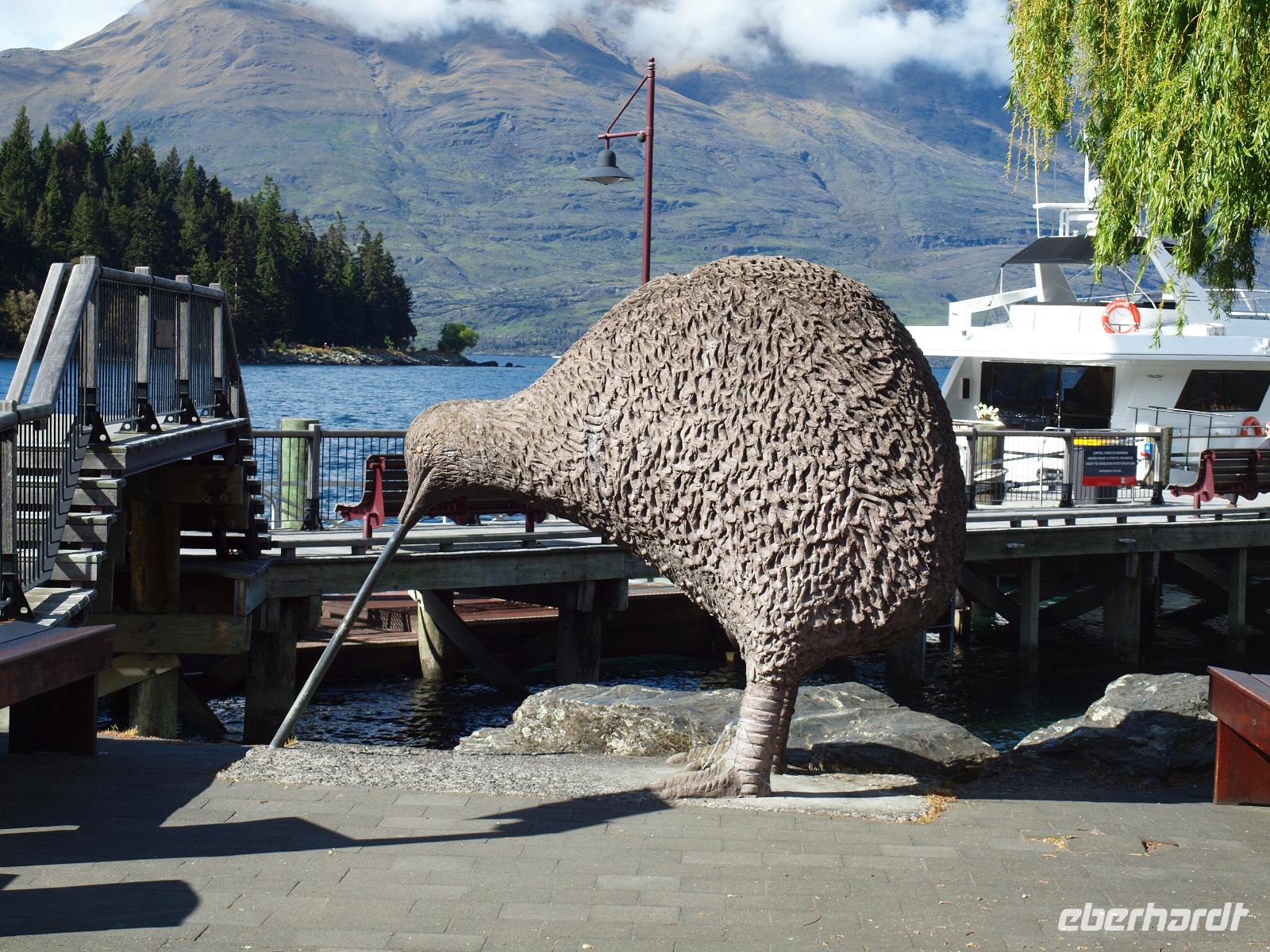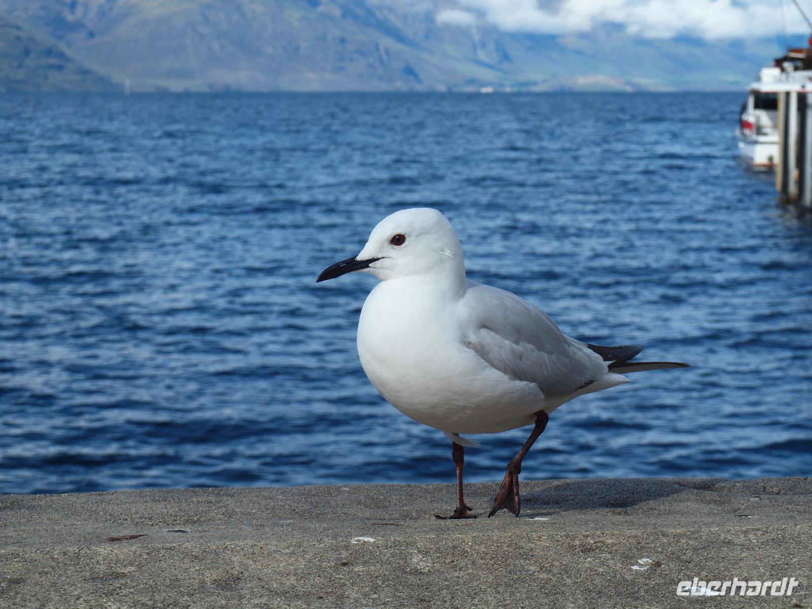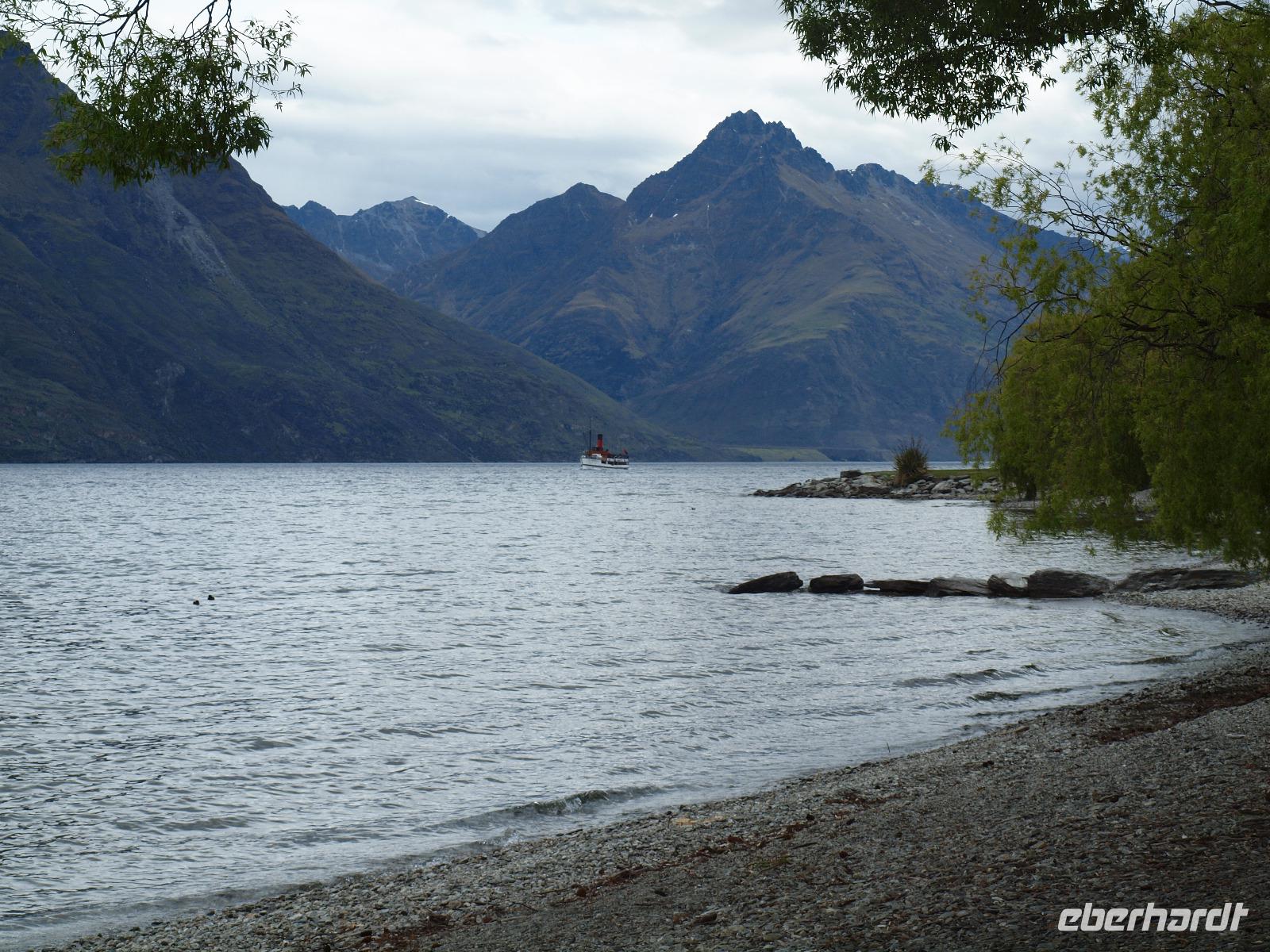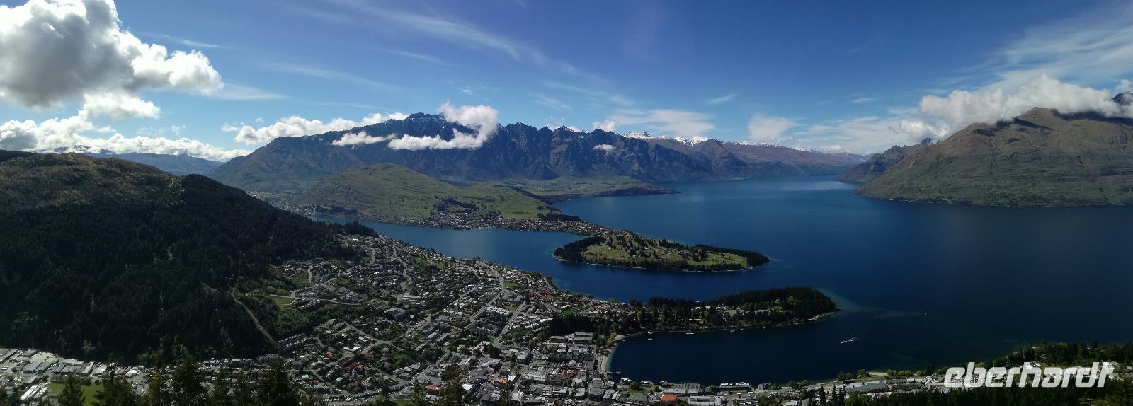 Nach einem gemütlichen Frühstück, treffen sich einige mit mir im Hotel und wir beginnen den Weg hinunter in das Zentrum gemeinsam. Schon wenig später sind wir dann in alle Himmelsrichtungen verteilt. Als erstes spazieren wir durch die Fußgängerzone, hier reihen sich viele Geschäfte und Restaurants aneinander, bis hin zur Wasserfront. Hier unten ist auch der kleine Hafen der Stadt. Hier legt die TSS Earnslaw jeden Tag zu verschiedenen Zeiten ab. Die Earnslaw ist 1912 erbaut und der einzige noch kommerziell betriebene kohlebefeuerte Passagierdampfer der Südhalbkugel. Sie gilt außerdem als eine der Hauptattraktionen von Queenstown. Gleich daneben liegen ein paar kleinere Boote, unter anderem auch ein Jetboot. Jetboote wurden ursprünglich von William Hamilton für die speziellen Anforderungen in Neuseeland entwickelt. Denn das Besondere an dem Boot ist folgendes: Das zum Vortrieb benötigte Wasser wird im Heckbereich am Boden des Bootrumpfes angesaugt, da der Bug eines Jetbootes bei schneller Gleitfahrt oft keinen Kontakt mehr zur Wasseroberfläche hat. Somit kann man auch bei Niedrigwasser schnell und leicht übers Wasser fahren. Unser Spaziergang führt uns dann hinauf zur Seilbahnstation. Zum Glück ist das Wetter heute auf unserer Seite und wir können bei strahlendem Sonnenschein die Panoramaaussicht vom Bobs Peak über Queenstown genießen. Im Hintergrund sieht man sogar den mit Schnee bedeckten Gebirgszug, The Remarkables. Bei dieser Aussicht und mit genügend Sonne im Gesicht lässt es sich hier oben einige Stunden aushalten. Wer zwischendurch Hunger vom Ausschauhalten bekommt, kann sich auch im Restaurant der Bergstation eine Stärkung kaufen. Oder man geht dann doch irgendwann einfach wieder hinunter in die Stadt...