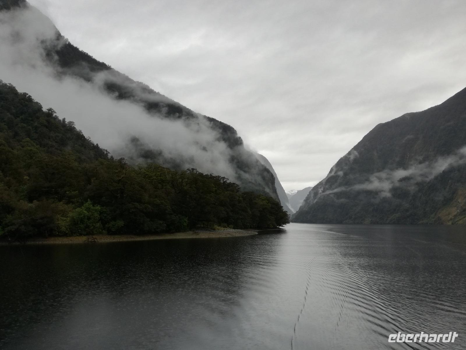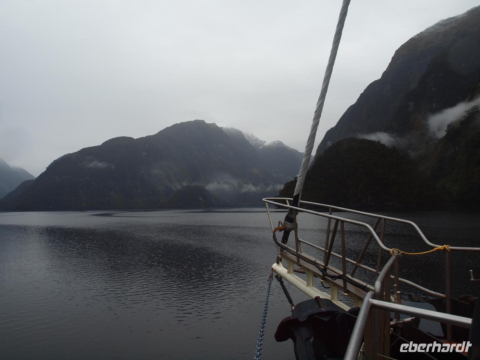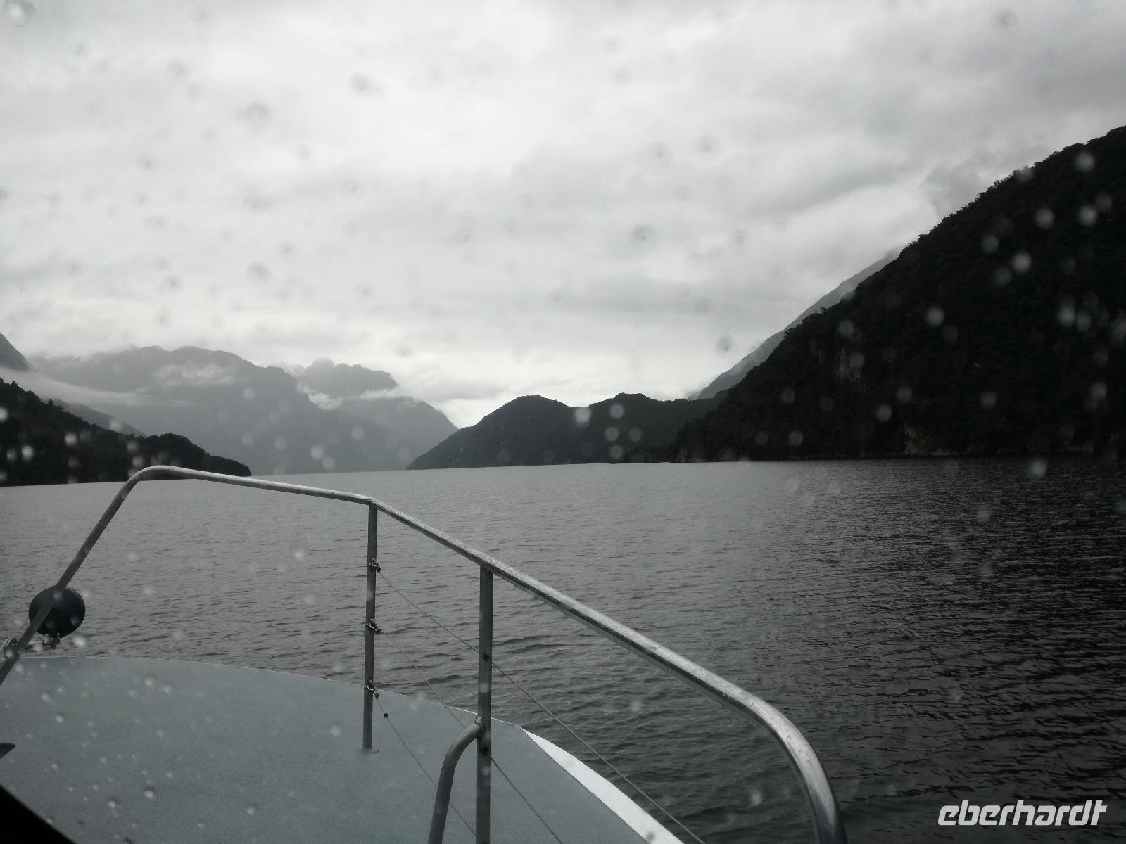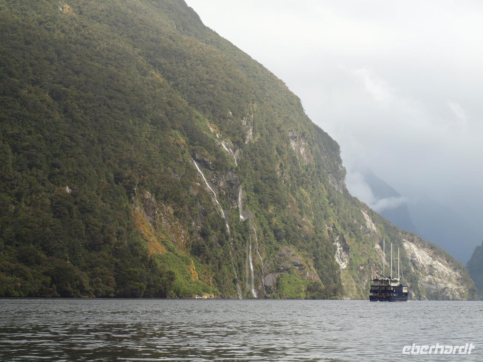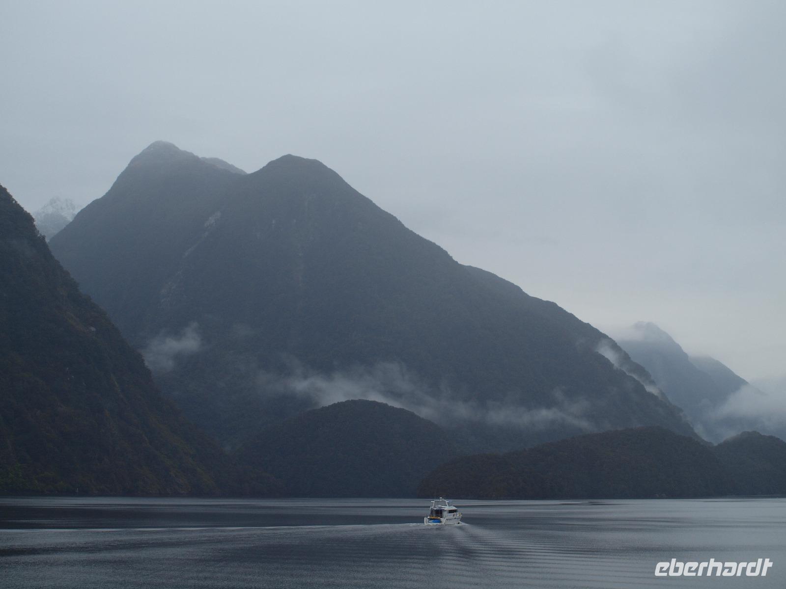 Wir verlassen heute die quirlige Stadt und fahren wieder in Richtung Westen. Der Fjordland-Nationalpark ist unser Ziel. In der Ortschaft Manapouri verabschieden wir uns für einen Tag von Hans und Maxine und begeben uns mit leckeren Lunchpaketen aufs Boot. Dieses bringt uns vom Anlegeplatz „Pearl Habour" über den See in den West Arm des Manapouri Sees. Hier gehen wir von Bord und steigen in einen Bus um. Dieser bringt uns, mit einigen Fotostopps, über den Wilmot Pass nach Deep Cove. Die Crew der Fjordland Navigator erwartet uns bereits und heißt uns herzlich Willkommen. Zuerst werden die allgemeinen Sicherheitsbestimmungen besprochen, was der Ablauf des heutigen Tages für uns bereit hält und wie und wo wir was an Board finden. Nach der Einweisung beziehen wir unsere Kabinen und treffen uns wenig später wieder auf dem Hauptdeck. Die Crew hat in der Zwischenzeit alles vorbereitet um mit uns entweder mit den Tenderbooten oder mit den Kajaks einen Ausflug zu unternehmen. Da es immer wieder sehr regnet entscheiden sich die Meisten von uns für die Tenderboote. Gemeinsam mit anderen Schiffsgästen und einem der Crewmitglieder fahren wir in die Nähe der Felswände. Spätestens jetzt wird uns bewusst, wie schön Regen sein kann. Überall bahnen sich an den Felswänden Wasserfällen ihren Weg in den Fjord. Sarah, die unser Boot steuert, erklärt uns, dass es diese Wasserfälle nur bei Regen gibt, da die Felswände so steil sind und das Wasser keine Möglichkeit findet sich irgendwo zu sammeln. Außerdem erklärt sie uns, warum das Wasser im Fjord nahezu schwarz erscheint. Bei starkem Regen, der in dieser Region sehr häufig vorkommt, stürzen die Süßwassermassen die steilen Hänge hinunter. Dieses kalte Süßwasser bildet eine zwei bis zehn Meter dicke Schicht über dem schwereren, aber auch wärmeren Salzwasser. Die mit dem Regen in den Fjord gewaschenen Gerbstoffe lassen weniger Licht durch das Süßwasser. Somit können schon in geringer Tiefe Tiere und Pflanzen im Salzwasser existieren, die man sonst nur in der dunklen Tiefsee antrifft, wie zum Beispiel Seesterne, Anemonen und Schwarze Korallen. Der Doubtful Sound ist der längste Fjord im Nationalpark und beherbergt an der Mündung zur Tasmanischen See ein paar Seelöwen Kolonien, sowie ein paar Gelbaugenpinguine. Und wir haben das Glück eben diese Tiere etwas später zu sehen. Zurück an Bord nimmt unser Skipper Kurs auf den Ausgang des Fjords. Der Seegang nimmt spürbar zu. Wir steuern auf kleine Felsengruppen zu und die Kamerageräusche sind aus alles Ecken der Aussichtsdecks zu hören. Wir sehen zuerst einen kleinen Pinguin, danach gleich noch einen, wir fahren weiter zu einer anderen Felsengruppe und dort sehen wir Seelöwen. Nach einer Weile bei den Tieren und vielen vielen Bildern wird es Zeit sich einen ruhigen Ankerplatz für die Nacht zu suchen. In der Zwischenzeit wärmen wir uns drinnen wieder auf. Die Crew beginnt bereits das Abendessen vorzubereiten und wir finden uns nach und nach auf unseren Plätzen ein. In geselliger Runde genießen wir das hervorragende Abendessen. Nach dem Abendessen können wir noch einem Vortrag eines der Crewmitglieder lauschen. Auch wenn wir nicht jedes Wort verstehen, eine Art Gute-Nacht-Geschichte ist es allemal. Mit diesen wundervollen Eindrücken des Tages ziehen wir uns auf die Kabinen zurück.