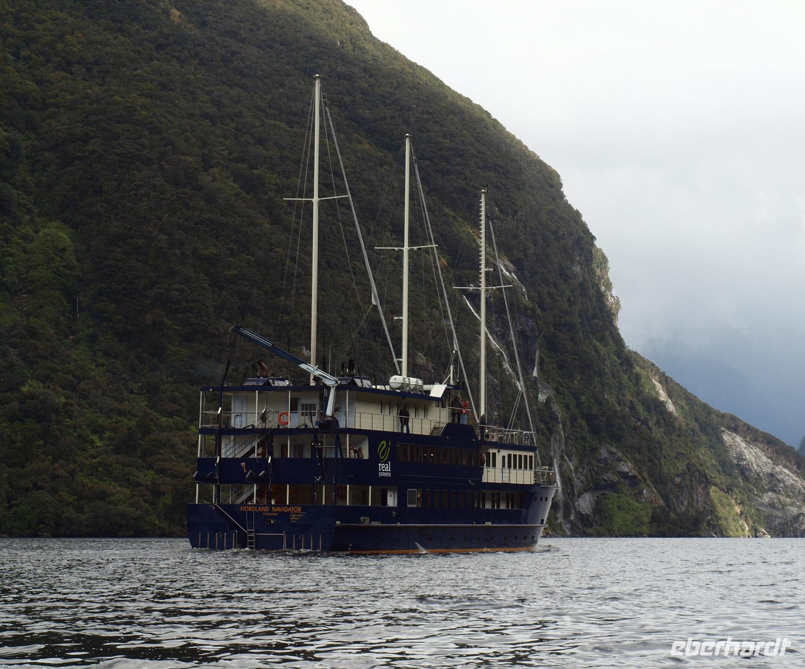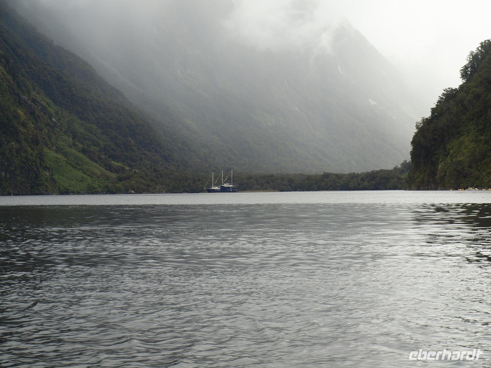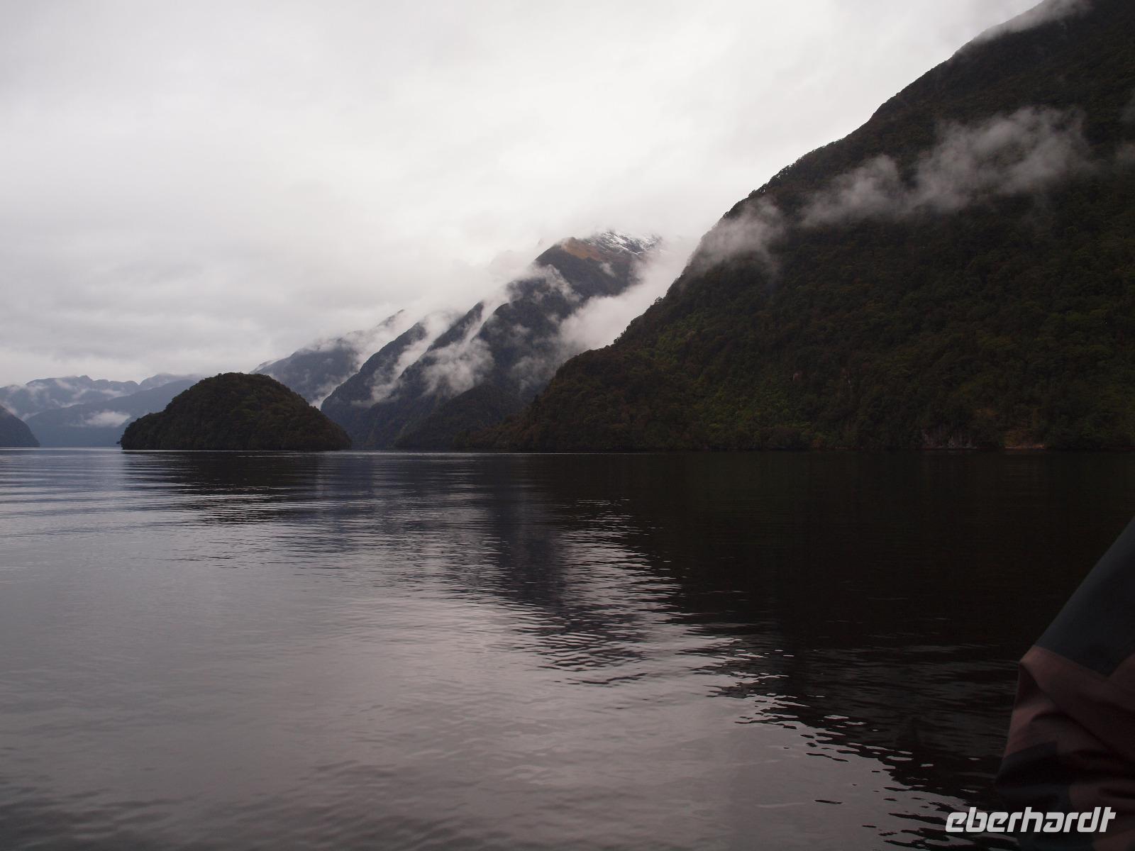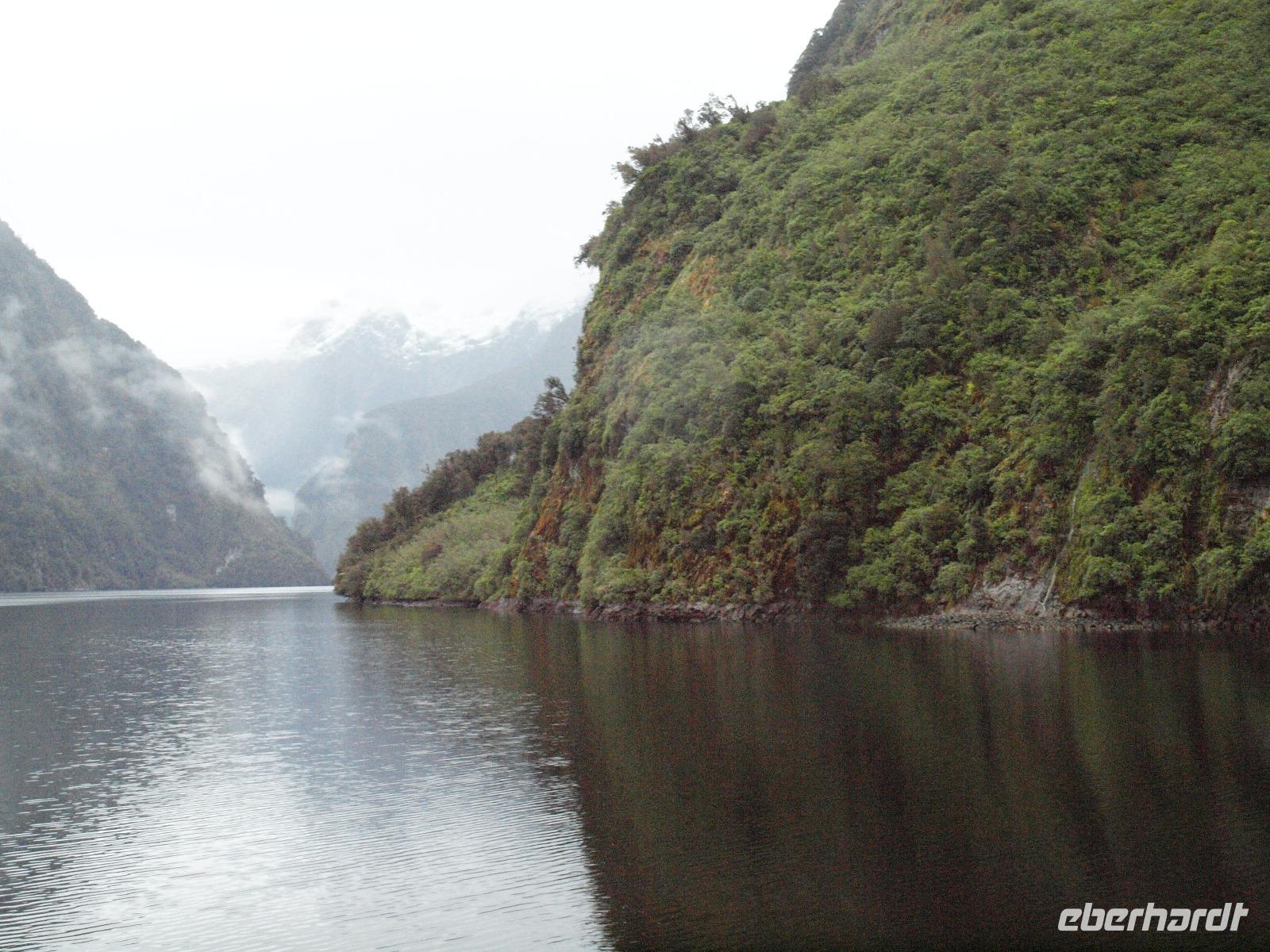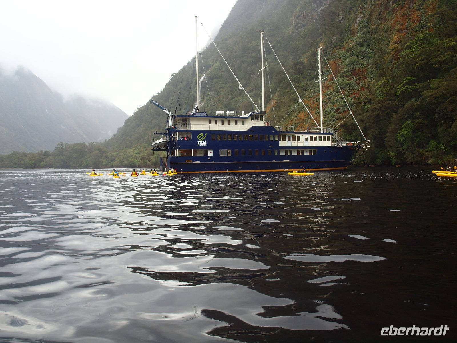 Wir verlassen heute die quirlige Stadt und fahren wieder in Richtung Westen. Der Fjordland-Nationalpark ist unser Ziel. In der Ortschaft Manapouri verabschieden wir uns für einen Tag von Hans und Maxine und begeben uns mit leckeren Lunchpaketen aufs Boot. Dieses bringt uns vom Anlegeplatz „Pearl Habour" über den See in den West Arm des Manapouri Sees. Hier gehen wir von Bord und steigen in einen Bus um. Dieser bringt uns, mit einigen Fotostopps, über den Wilmot Pass nach Deep Cove. Die Crew der Fjordland Navigator erwartet uns bereits und heißt uns herzlich Willkommen. Zuerst werden die allgemeinen Sicherheitsbestimmungen besprochen, was der Ablauf des heutigen Tages für uns bereit hält und wie und wo wir was an Board finden. Nach der Einweisung beziehen wir unsere Kabinen und treffen uns wenig später wieder auf dem Hauptdeck. Die Crew hat in der Zwischenzeit alles vorbereitet um mit uns entweder mit den Tenderbooten oder mit den Kajaks einen Ausflug zu unternehmen. Da es immer wieder sehr regnet entscheiden sich die Meisten von uns für die Tenderboote. Gemeinsam mit anderen Schiffsgästen und einem der Crewmitglieder fahren wir in die Nähe der Felswände. Spätestens jetzt wird uns bewusst, wie schön Regen sein kann. Überall bahnen sich an den Felswänden Wasserfällen ihren Weg in den Fjord. Sarah, die unser Boot steuert, erklärt uns, dass es diese Wasserfälle nur bei Regen gibt, da die Felswände so steil sind und das Wasser keine Möglichkeit findet sich irgendwo zu sammeln. Außerdem erklärt sie uns, warum das Wasser im Fjord nahezu schwarz erscheint. Bei starkem Regen, der in dieser Region sehr häufig vorkommt, stürzen die Süßwassermassen die steilen Hänge hinunter. Dieses kalte Süßwasser bildet eine zwei bis zehn Meter dicke Schicht über dem schwereren, aber auch wärmeren Salzwasser. Die mit dem Regen in den Fjord gewaschenen Gerbstoffe lassen weniger Licht durch das Süßwasser. Somit können schon in geringer Tiefe Tiere und Pflanzen im Salzwasser existieren, die man sonst nur in der dunklen Tiefsee antrifft, wie zum Beispiel Seesterne, Anemonen und Schwarze Korallen. Der Doubtful Sound ist der längste Fjord im Nationalpark und beherbergt an der Mündung zur Tasmanischen See ein paar Seelöwen Kolonien, sowie ein paar Gelbaugenpinguine. Und wir haben das Glück eben diese Tiere etwas später zu sehen. Zurück an Bord nimmt unser Skipper Kurs auf den Ausgang des Fjords. Der Seegang nimmt spürbar zu. Wir steuern auf kleine Felsengruppen zu und die Kamerageräusche sind aus alles Ecken der Aussichtsdecks zu hören. Wir sehen zuerst einen kleinen Pinguin, danach gleich noch einen, wir fahren weiter zu einer anderen Felsengruppe und dort sehen wir Seelöwen. Nach einer Weile bei den Tieren und vielen vielen Bildern wird es Zeit sich einen ruhigen Ankerplatz für die Nacht zu suchen. In der Zwischenzeit wärmen wir uns drinnen wieder auf. Die Crew beginnt bereits das Abendessen vorzubereiten und wir finden uns nach und nach auf unseren Plätzen ein. In geselliger Runde genießen wir das hervorragende Abendessen. Nach dem Abendessen können wir noch einem Vortrag eines der Crewmitglieder lauschen. Auch wenn wir nicht jedes Wort verstehen, eine Art Gute-Nacht-Geschichte ist es allemal. Mit diesen wundervollen Eindrücken des Tages ziehen wir uns auf die Kabinen zurück.