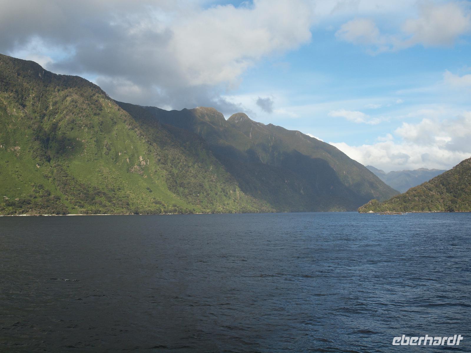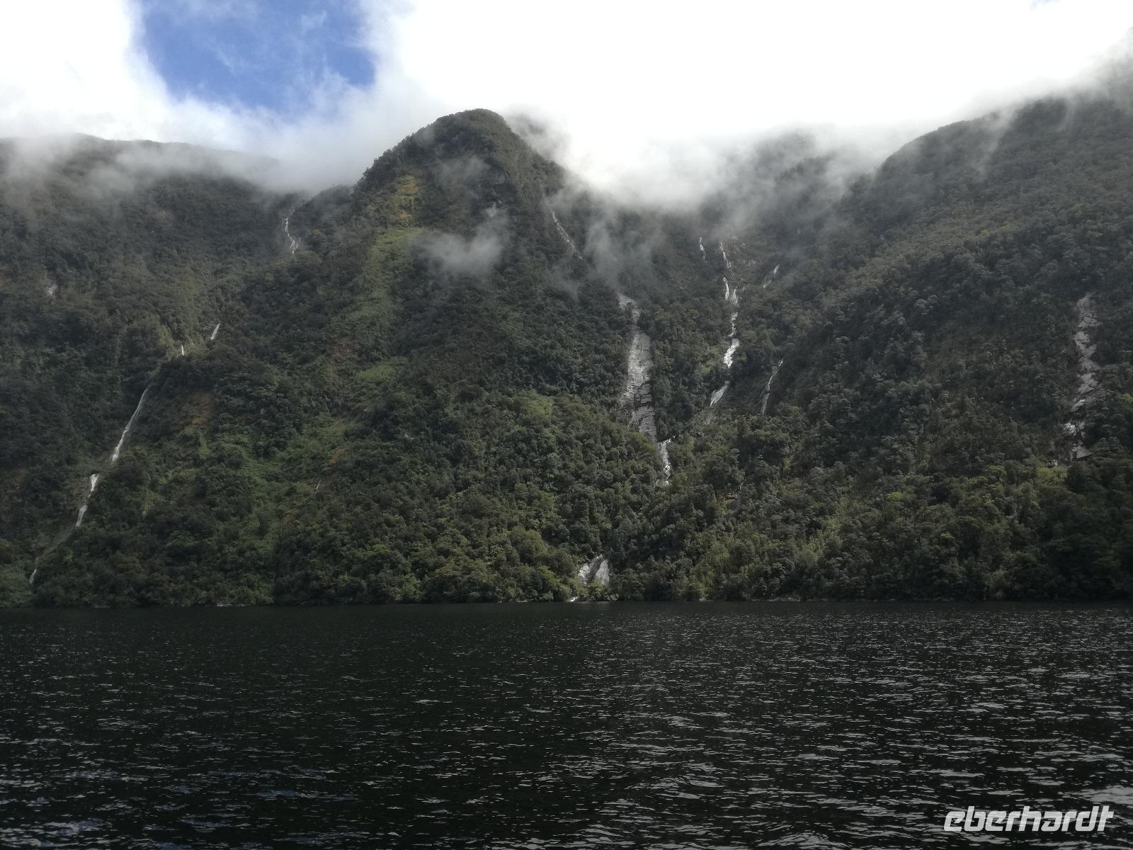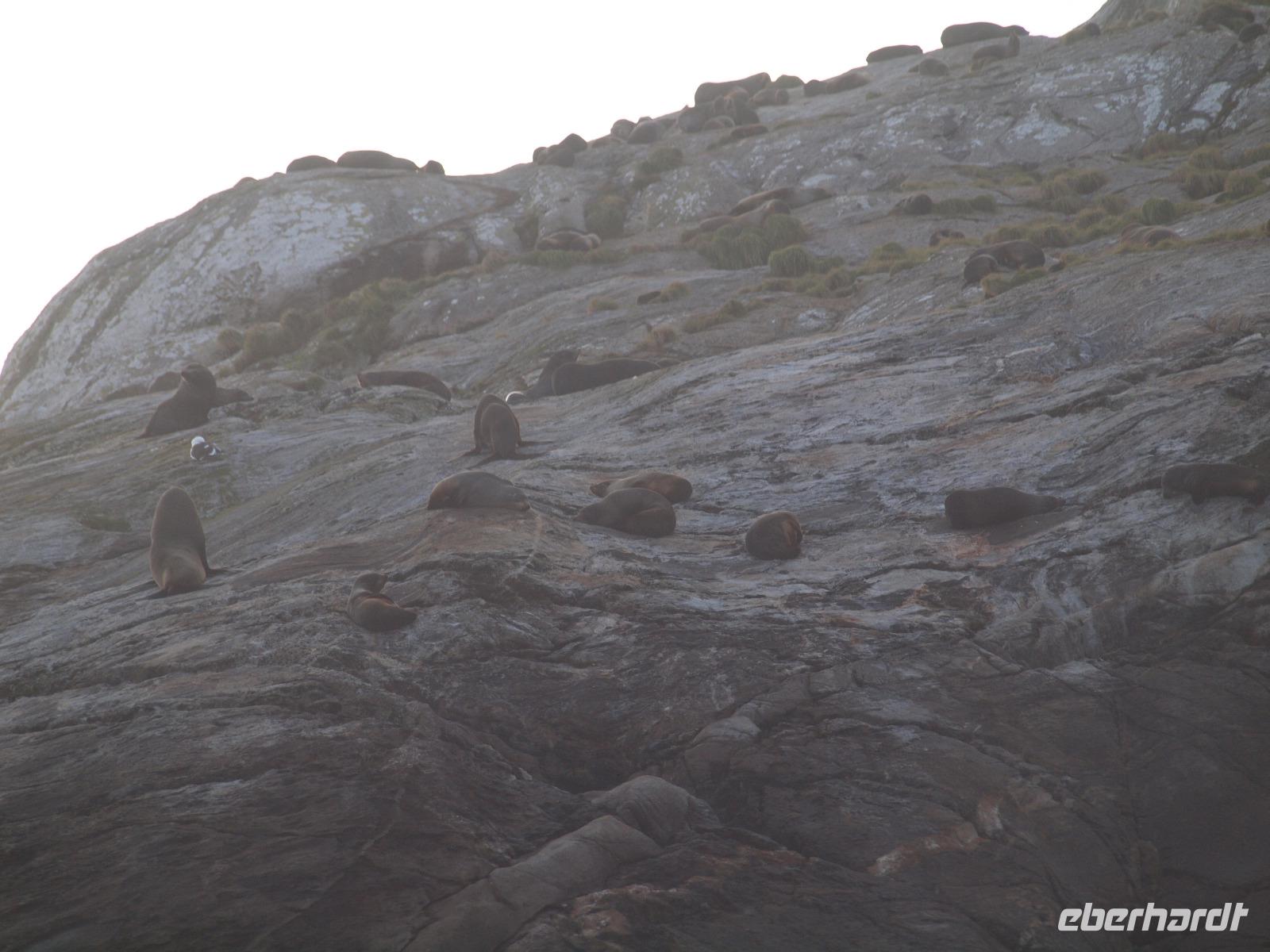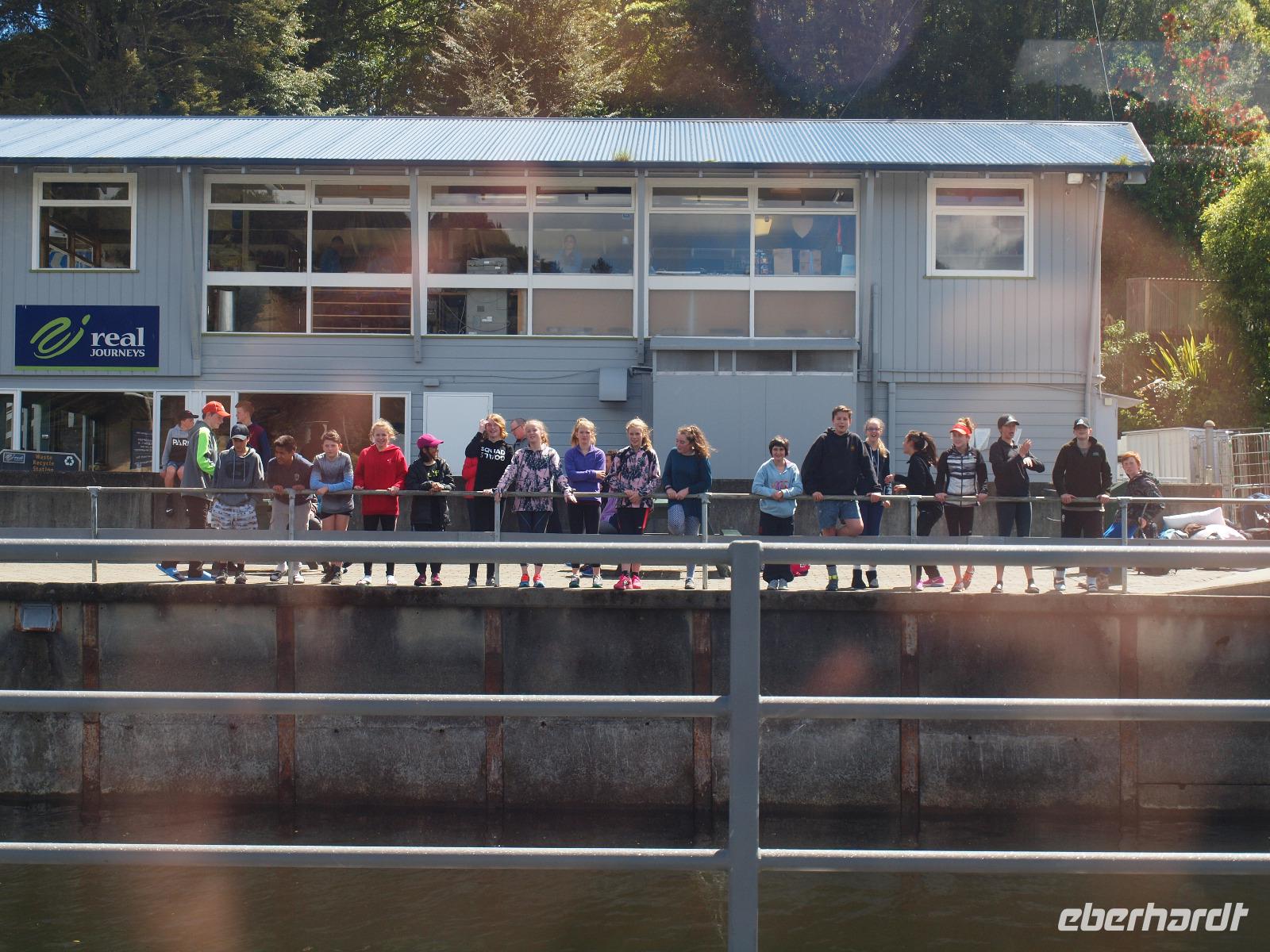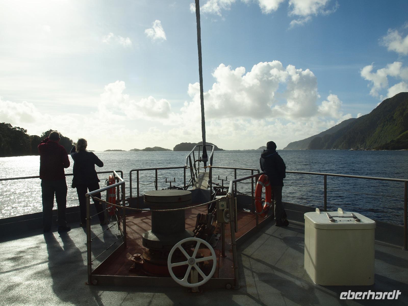 Wir verlassen heute die quirlige Stadt und fahren wieder in Richtung Westen. Der Fjordland-Nationalpark ist unser Ziel. In der Ortschaft Manapouri verabschieden wir uns für einen Tag von Hans und Maxine und begeben uns mit leckeren Lunchpaketen aufs Boot. Dieses bringt uns vom Anlegeplatz „Pearl Habour" über den See in den West Arm des Manapouri Sees. Hier gehen wir von Bord und steigen in einen Bus um. Dieser bringt uns, mit einigen Fotostopps, über den Wilmot Pass nach Deep Cove. Die Crew der Fjordland Navigator erwartet uns bereits und heißt uns herzlich Willkommen. Zuerst werden die allgemeinen Sicherheitsbestimmungen besprochen, was der Ablauf des heutigen Tages für uns bereit hält und wie und wo wir was an Board finden. Nach der Einweisung beziehen wir unsere Kabinen und treffen uns wenig später wieder auf dem Hauptdeck. Die Crew hat in der Zwischenzeit alles vorbereitet um mit uns entweder mit den Tenderbooten oder mit den Kajaks einen Ausflug zu unternehmen. Da es immer wieder sehr regnet entscheiden sich die Meisten von uns für die Tenderboote. Gemeinsam mit anderen Schiffsgästen und einem der Crewmitglieder fahren wir in die Nähe der Felswände. Spätestens jetzt wird uns bewusst, wie schön Regen sein kann. Überall bahnen sich an den Felswänden Wasserfällen ihren Weg in den Fjord. Sarah, die unser Boot steuert, erklärt uns, dass es diese Wasserfälle nur bei Regen gibt, da die Felswände so steil sind und das Wasser keine Möglichkeit findet sich irgendwo zu sammeln. Außerdem erklärt sie uns, warum das Wasser im Fjord nahezu schwarz erscheint. Bei starkem Regen, der in dieser Region sehr häufig vorkommt, stürzen die Süßwassermassen die steilen Hänge hinunter. Dieses kalte Süßwasser bildet eine zwei bis zehn Meter dicke Schicht über dem schwereren, aber auch wärmeren Salzwasser. Die mit dem Regen in den Fjord gewaschenen Gerbstoffe lassen weniger Licht durch das Süßwasser. Somit können schon in geringer Tiefe Tiere und Pflanzen im Salzwasser existieren, die man sonst nur in der dunklen Tiefsee antrifft, wie zum Beispiel Seesterne, Anemonen und Schwarze Korallen. Der Doubtful Sound ist der längste Fjord im Nationalpark und beherbergt an der Mündung zur Tasmanischen See ein paar Seelöwen Kolonien, sowie ein paar Gelbaugenpinguine. Und wir haben das Glück eben diese Tiere etwas später zu sehen. Zurück an Bord nimmt unser Skipper Kurs auf den Ausgang des Fjords. Der Seegang nimmt spürbar zu. Wir steuern auf kleine Felsengruppen zu und die Kamerageräusche sind aus alles Ecken der Aussichtsdecks zu hören. Wir sehen zuerst einen kleinen Pinguin, danach gleich noch einen, wir fahren weiter zu einer anderen Felsengruppe und dort sehen wir Seelöwen. Nach einer Weile bei den Tieren und vielen vielen Bildern wird es Zeit sich einen ruhigen Ankerplatz für die Nacht zu suchen. In der Zwischenzeit wärmen wir uns drinnen wieder auf. Die Crew beginnt bereits das Abendessen vorzubereiten und wir finden uns nach und nach auf unseren Plätzen ein. In geselliger Runde genießen wir das hervorragende Abendessen. Nach dem Abendessen können wir noch einem Vortrag eines der Crewmitglieder lauschen. Auch wenn wir nicht jedes Wort verstehen, eine Art Gute-Nacht-Geschichte ist es allemal. Mit diesen wundervollen Eindrücken des Tages ziehen wir uns auf die Kabinen zurück.