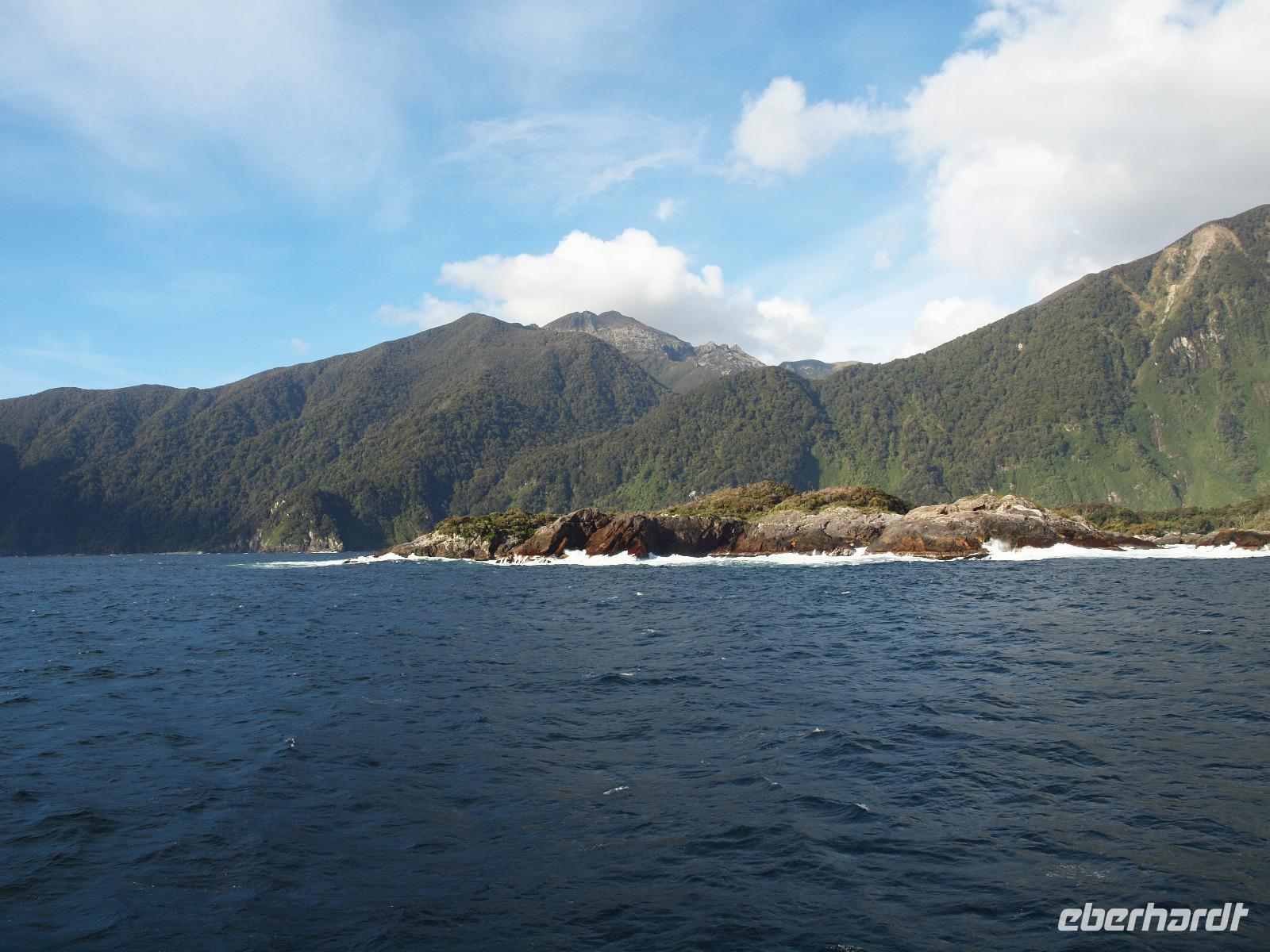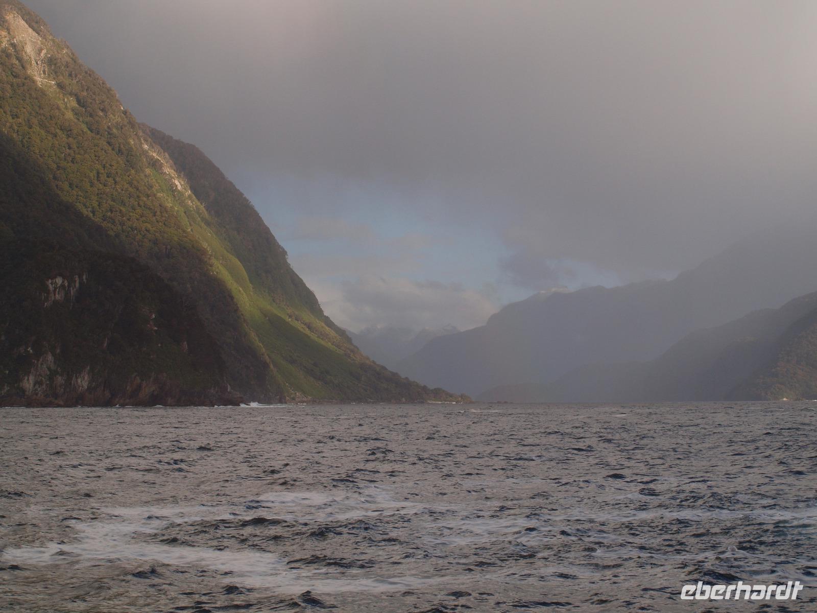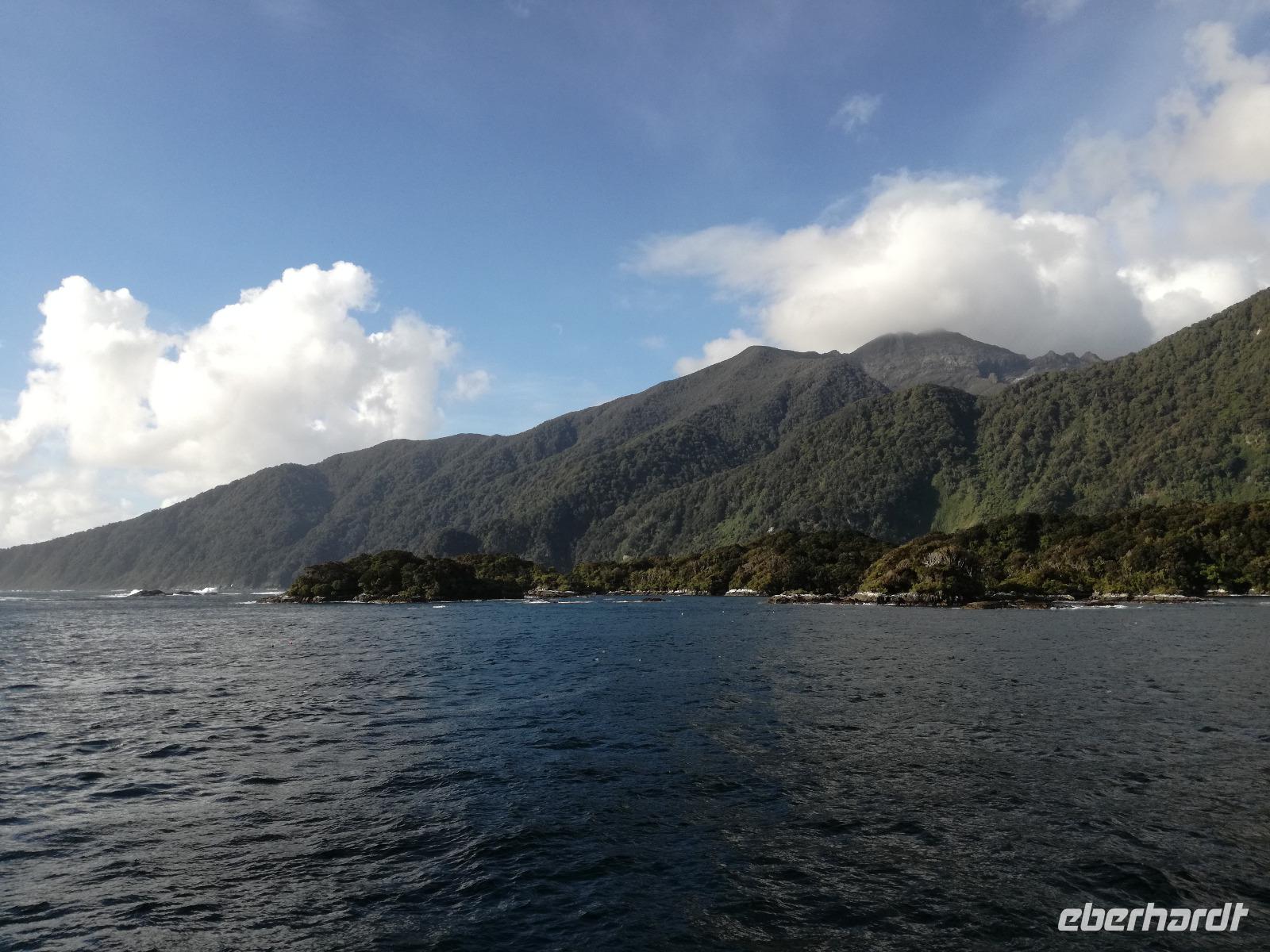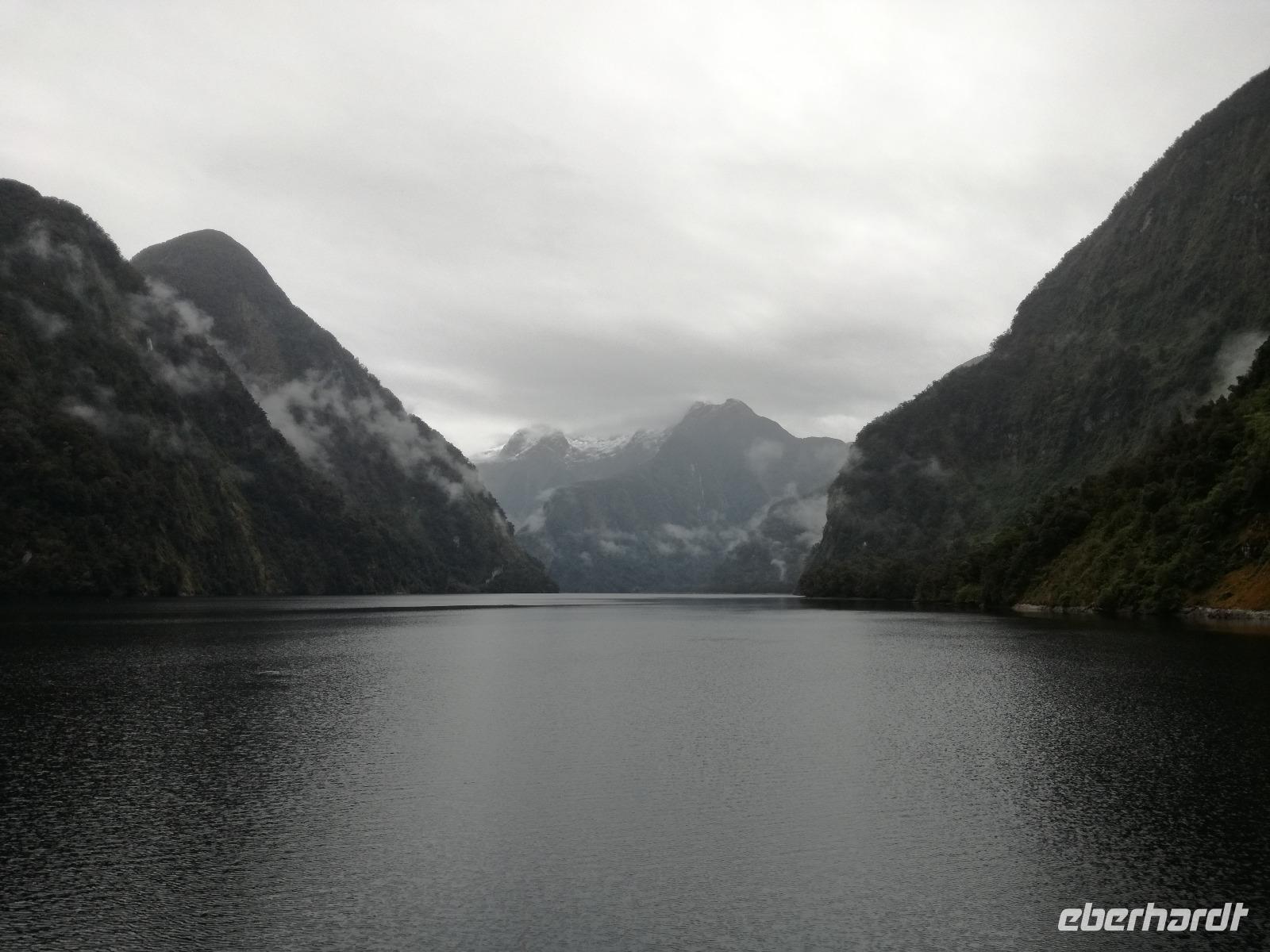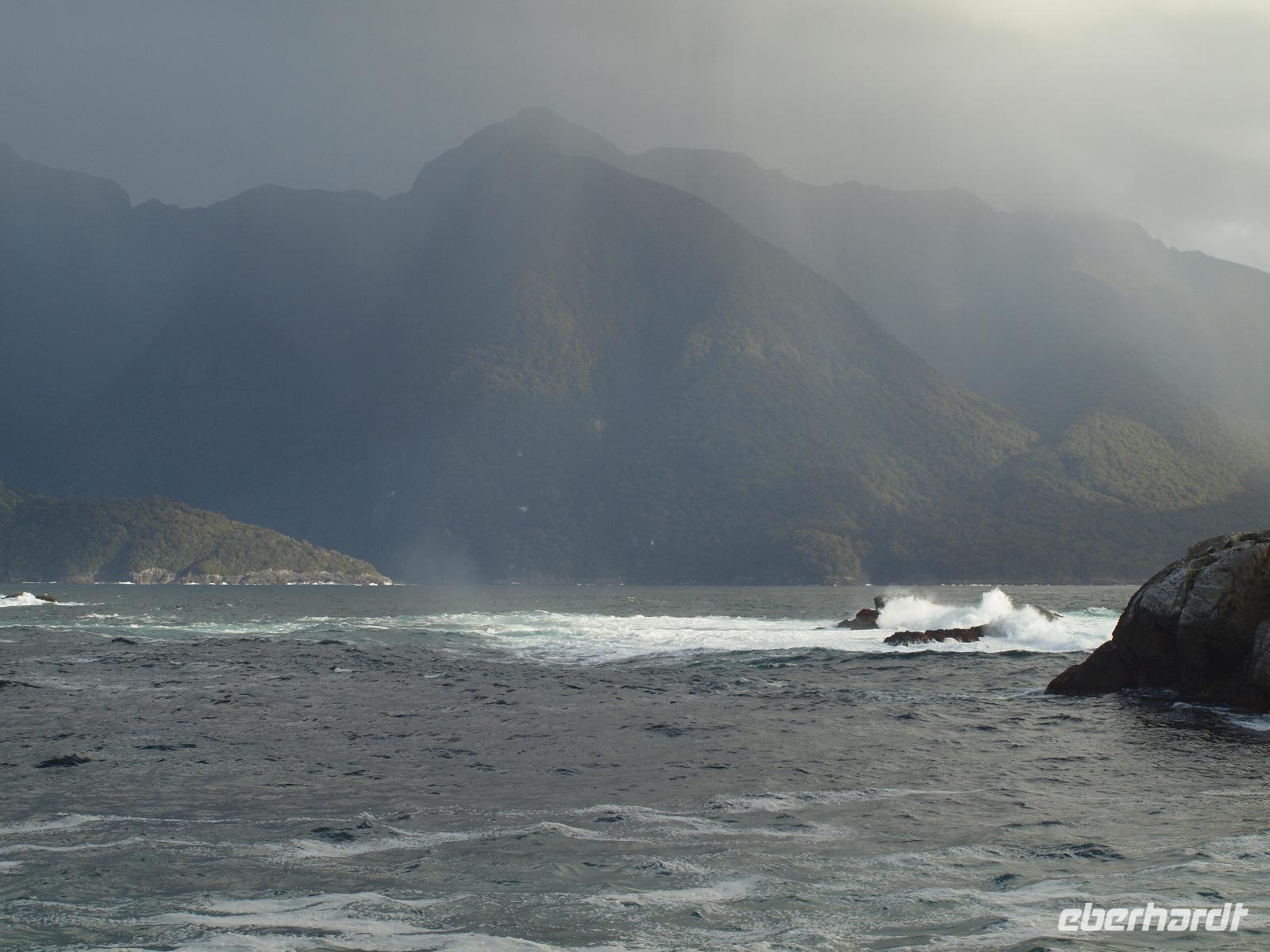 Wir verlassen heute die quirlige Stadt und fahren wieder in Richtung Westen. Der Fjordland-Nationalpark ist unser Ziel. In der Ortschaft Manapouri verabschieden wir uns für einen Tag von Hans und Maxine und begeben uns mit leckeren Lunchpaketen aufs Boot. Dieses bringt uns vom Anlegeplatz „Pearl Habour" über den See in den West Arm des Manapouri Sees. Hier gehen wir von Bord und steigen in einen Bus um. Dieser bringt uns, mit einigen Fotostopps, über den Wilmot Pass nach Deep Cove. Die Crew der Fjordland Navigator erwartet uns bereits und heißt uns herzlich Willkommen. Zuerst werden die allgemeinen Sicherheitsbestimmungen besprochen, was der Ablauf des heutigen Tages für uns bereit hält und wie und wo wir was an Board finden. Nach der Einweisung beziehen wir unsere Kabinen und treffen uns wenig später wieder auf dem Hauptdeck. Die Crew hat in der Zwischenzeit alles vorbereitet um mit uns entweder mit den Tenderbooten oder mit den Kajaks einen Ausflug zu unternehmen. Da es immer wieder sehr regnet entscheiden sich die Meisten von uns für die Tenderboote. Gemeinsam mit anderen Schiffsgästen und einem der Crewmitglieder fahren wir in die Nähe der Felswände. Spätestens jetzt wird uns bewusst, wie schön Regen sein kann. Überall bahnen sich an den Felswänden Wasserfällen ihren Weg in den Fjord. Sarah, die unser Boot steuert, erklärt uns, dass es diese Wasserfälle nur bei Regen gibt, da die Felswände so steil sind und das Wasser keine Möglichkeit findet sich irgendwo zu sammeln. Außerdem erklärt sie uns, warum das Wasser im Fjord nahezu schwarz erscheint. Bei starkem Regen, der in dieser Region sehr häufig vorkommt, stürzen die Süßwassermassen die steilen Hänge hinunter. Dieses kalte Süßwasser bildet eine zwei bis zehn Meter dicke Schicht über dem schwereren, aber auch wärmeren Salzwasser. Die mit dem Regen in den Fjord gewaschenen Gerbstoffe lassen weniger Licht durch das Süßwasser. Somit können schon in geringer Tiefe Tiere und Pflanzen im Salzwasser existieren, die man sonst nur in der dunklen Tiefsee antrifft, wie zum Beispiel Seesterne, Anemonen und Schwarze Korallen. Der Doubtful Sound ist der längste Fjord im Nationalpark und beherbergt an der Mündung zur Tasmanischen See ein paar Seelöwen Kolonien, sowie ein paar Gelbaugenpinguine. Und wir haben das Glück eben diese Tiere etwas später zu sehen. Zurück an Bord nimmt unser Skipper Kurs auf den Ausgang des Fjords. Der Seegang nimmt spürbar zu. Wir steuern auf kleine Felsengruppen zu und die Kamerageräusche sind aus alles Ecken der Aussichtsdecks zu hören. Wir sehen zuerst einen kleinen Pinguin, danach gleich noch einen, wir fahren weiter zu einer anderen Felsengruppe und dort sehen wir Seelöwen. Nach einer Weile bei den Tieren und vielen vielen Bildern wird es Zeit sich einen ruhigen Ankerplatz für die Nacht zu suchen. In der Zwischenzeit wärmen wir uns drinnen wieder auf. Die Crew beginnt bereits das Abendessen vorzubereiten und wir finden uns nach und nach auf unseren Plätzen ein. In geselliger Runde genießen wir das hervorragende Abendessen. Nach dem Abendessen können wir noch einem Vortrag eines der Crewmitglieder lauschen. Auch wenn wir nicht jedes Wort verstehen, eine Art Gute-Nacht-Geschichte ist es allemal. Mit diesen wundervollen Eindrücken des Tages ziehen wir uns auf die Kabinen zurück.
