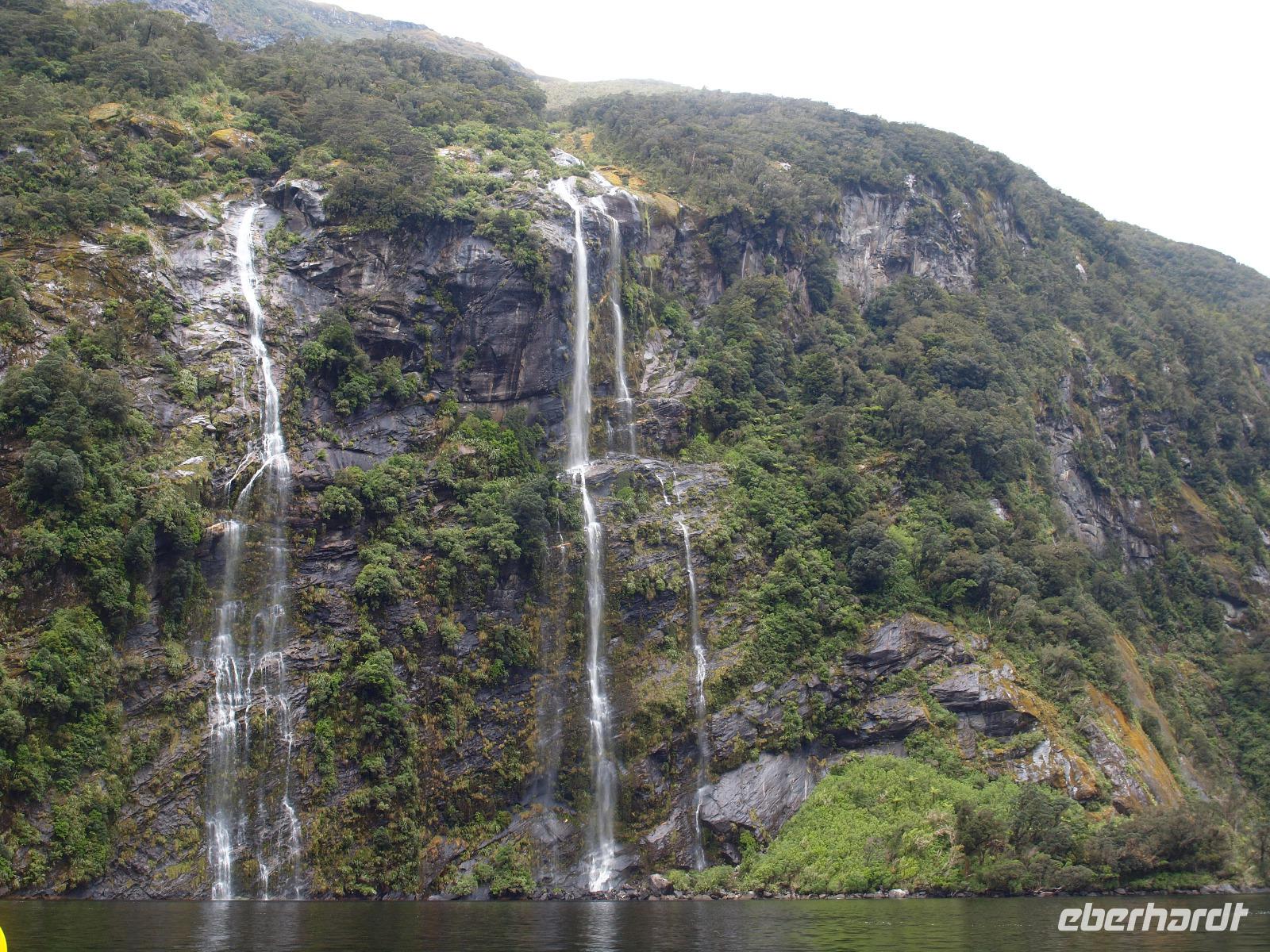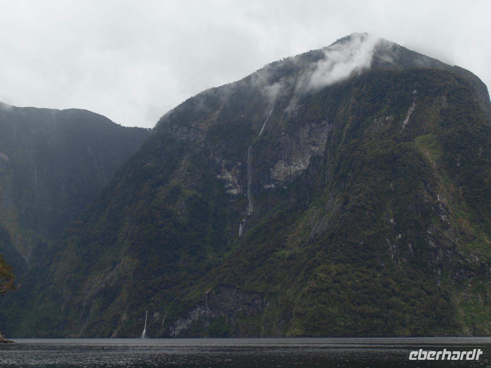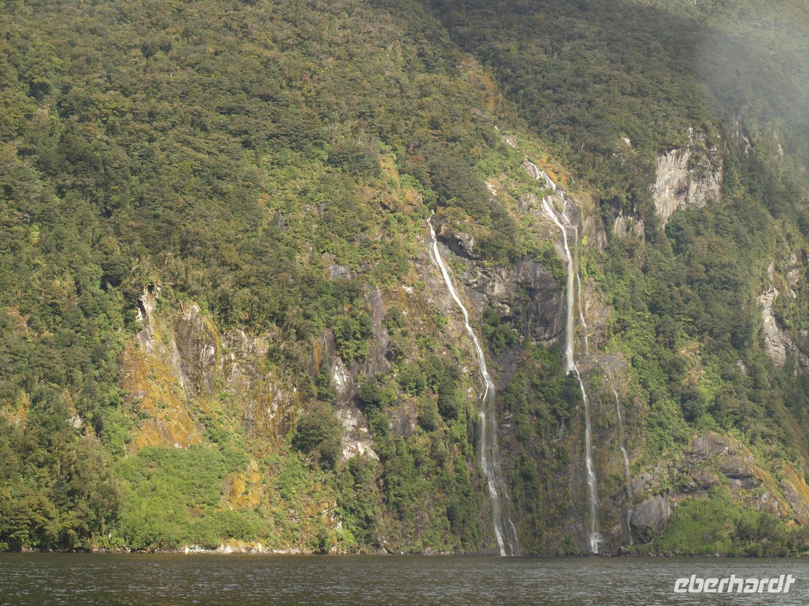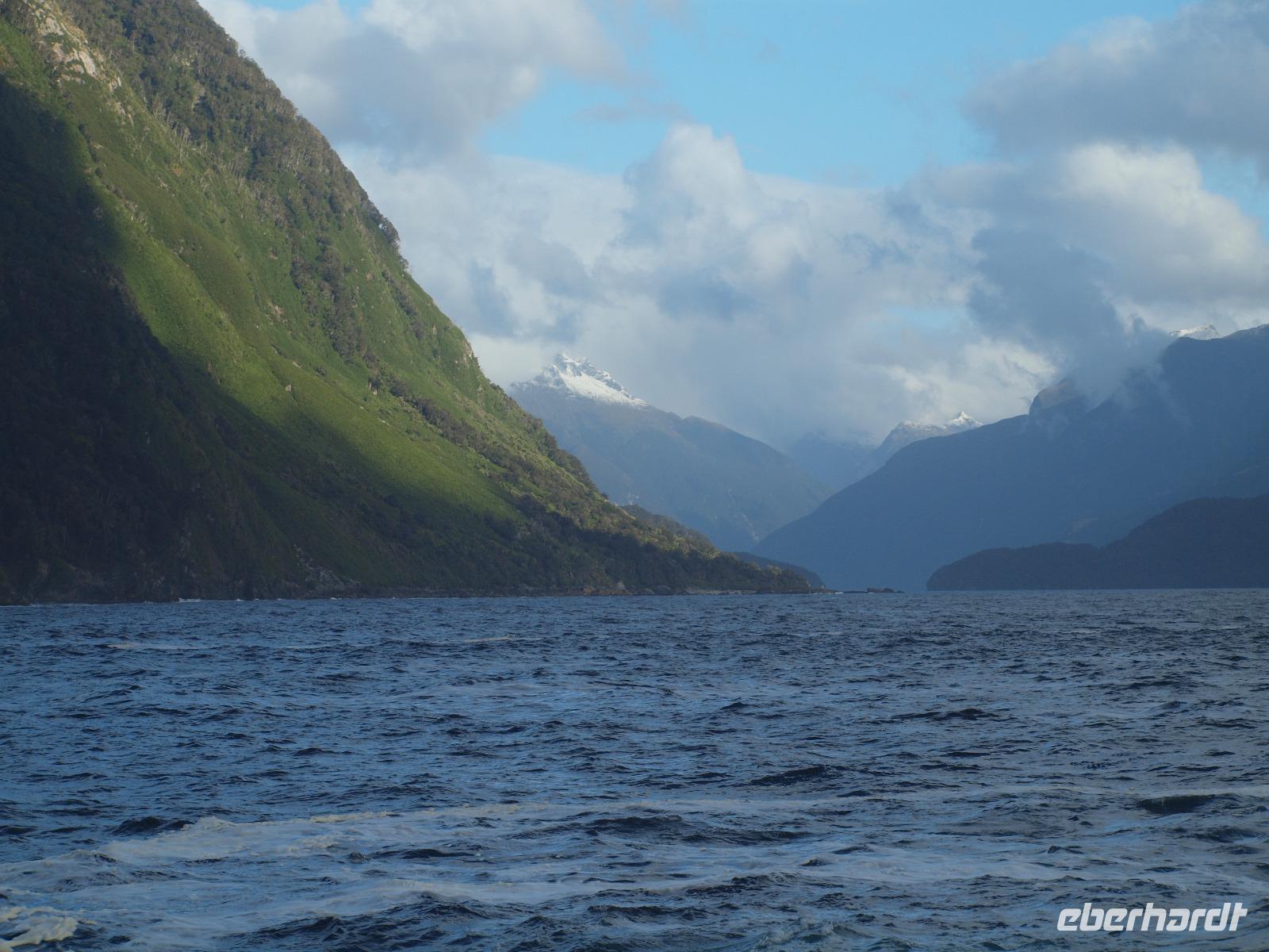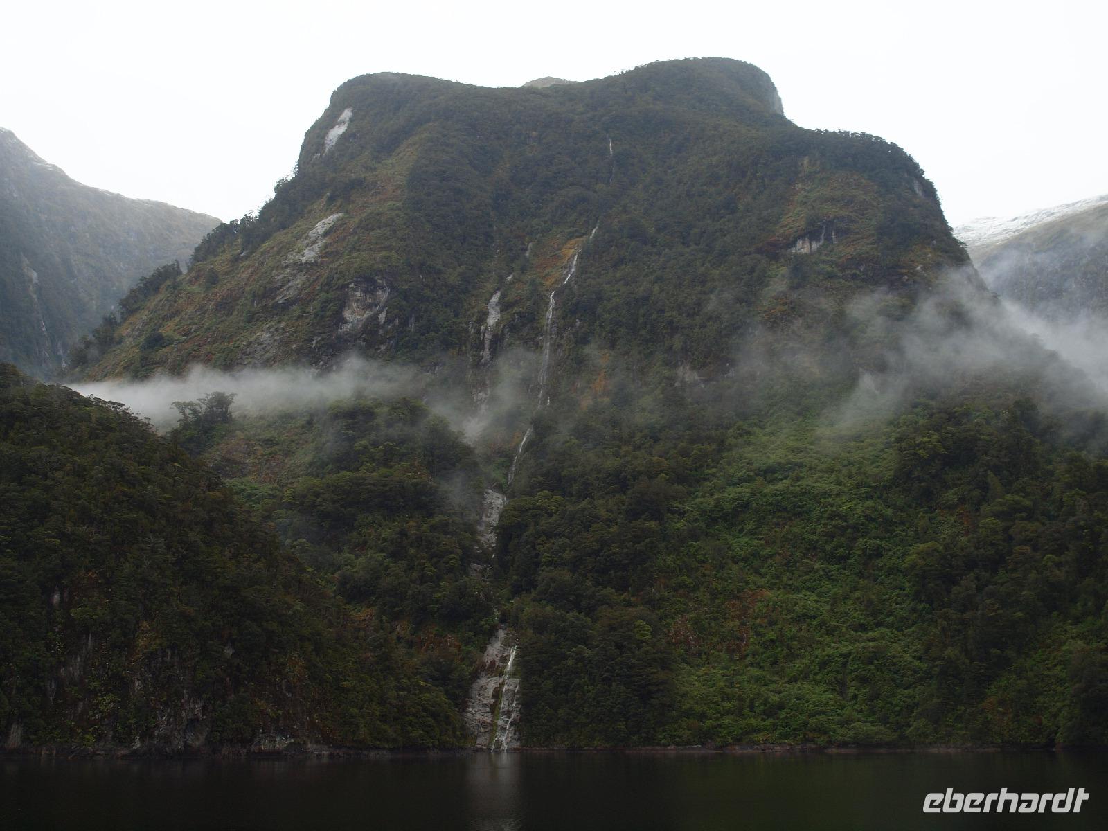 Wir verlassen heute die quirlige Stadt und fahren wieder in Richtung Westen. Der Fjordland-Nationalpark ist unser Ziel. In der Ortschaft Manapouri verabschieden wir uns für einen Tag von Hans und Maxine und begeben uns mit leckeren Lunchpaketen aufs Boot. Dieses bringt uns vom Anlegeplatz „Pearl Habour" über den See in den West Arm des Manapouri Sees. Hier gehen wir von Bord und steigen in einen Bus um. Dieser bringt uns, mit einigen Fotostopps, über den Wilmot Pass nach Deep Cove. Die Crew der Fjordland Navigator erwartet uns bereits und heißt uns herzlich Willkommen. Zuerst werden die allgemeinen Sicherheitsbestimmungen besprochen, was der Ablauf des heutigen Tages für uns bereit hält und wie und wo wir was an Board finden. Nach der Einweisung beziehen wir unsere Kabinen und treffen uns wenig später wieder auf dem Hauptdeck. Die Crew hat in der Zwischenzeit alles vorbereitet um mit uns entweder mit den Tenderbooten oder mit den Kajaks einen Ausflug zu unternehmen. Da es immer wieder sehr regnet entscheiden sich die Meisten von uns für die Tenderboote. Gemeinsam mit anderen Schiffsgästen und einem der Crewmitglieder fahren wir in die Nähe der Felswände. Spätestens jetzt wird uns bewusst, wie schön Regen sein kann. Überall bahnen sich an den Felswänden Wasserfällen ihren Weg in den Fjord. Sarah, die unser Boot steuert, erklärt uns, dass es diese Wasserfälle nur bei Regen gibt, da die Felswände so steil sind und das Wasser keine Möglichkeit findet sich irgendwo zu sammeln. Außerdem erklärt sie uns, warum das Wasser im Fjord nahezu schwarz erscheint. Bei starkem Regen, der in dieser Region sehr häufig vorkommt, stürzen die Süßwassermassen die steilen Hänge hinunter. Dieses kalte Süßwasser bildet eine zwei bis zehn Meter dicke Schicht über dem schwereren, aber auch wärmeren Salzwasser. Die mit dem Regen in den Fjord gewaschenen Gerbstoffe lassen weniger Licht durch das Süßwasser. Somit können schon in geringer Tiefe Tiere und Pflanzen im Salzwasser existieren, die man sonst nur in der dunklen Tiefsee antrifft, wie zum Beispiel Seesterne, Anemonen und Schwarze Korallen. Der Doubtful Sound ist der längste Fjord im Nationalpark und beherbergt an der Mündung zur Tasmanischen See ein paar Seelöwen Kolonien, sowie ein paar Gelbaugenpinguine. Und wir haben das Glück eben diese Tiere etwas später zu sehen. Zurück an Bord nimmt unser Skipper Kurs auf den Ausgang des Fjords. Der Seegang nimmt spürbar zu. Wir steuern auf kleine Felsengruppen zu und die Kamerageräusche sind aus alles Ecken der Aussichtsdecks zu hören. Wir sehen zuerst einen kleinen Pinguin, danach gleich noch einen, wir fahren weiter zu einer anderen Felsengruppe und dort sehen wir Seelöwen. Nach einer Weile bei den Tieren und vielen vielen Bildern wird es Zeit sich einen ruhigen Ankerplatz für die Nacht zu suchen. In der Zwischenzeit wärmen wir uns drinnen wieder auf. Die Crew beginnt bereits das Abendessen vorzubereiten und wir finden uns nach und nach auf unseren Plätzen ein. In geselliger Runde genießen wir das hervorragende Abendessen. Nach dem Abendessen können wir noch einem Vortrag eines der Crewmitglieder lauschen. Auch wenn wir nicht jedes Wort verstehen, eine Art Gute-Nacht-Geschichte ist es allemal. Mit diesen wundervollen Eindrücken des Tages ziehen wir uns auf die Kabinen zurück.