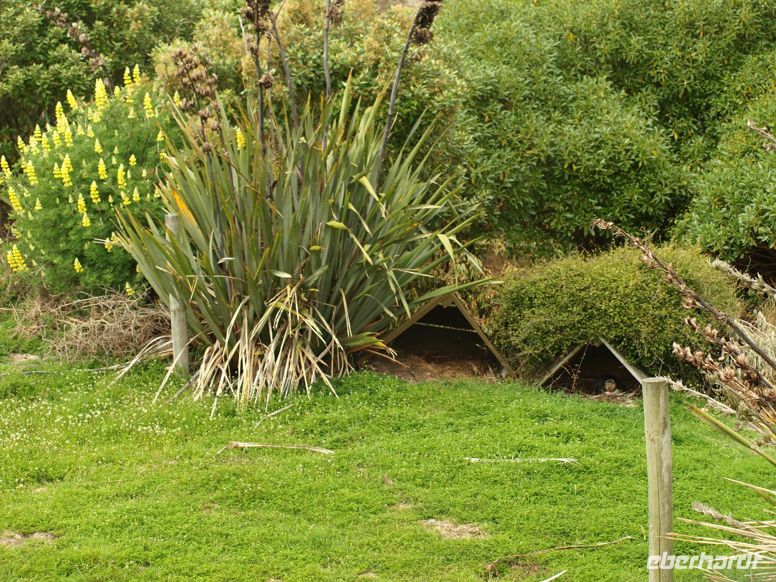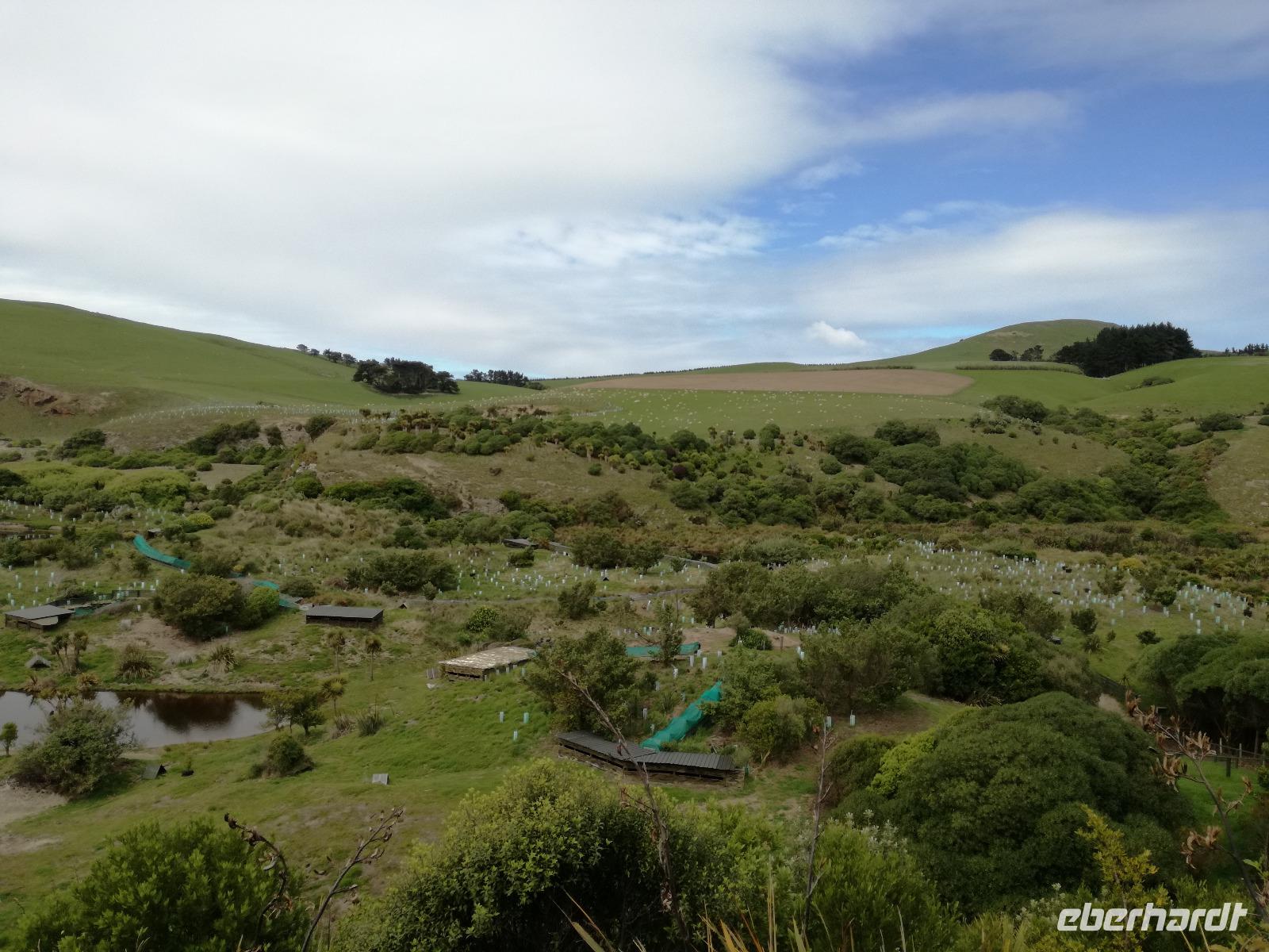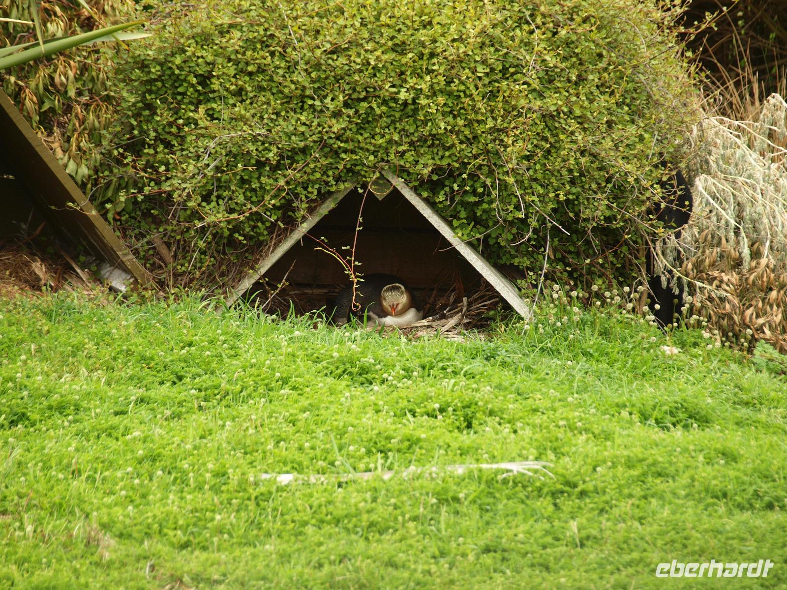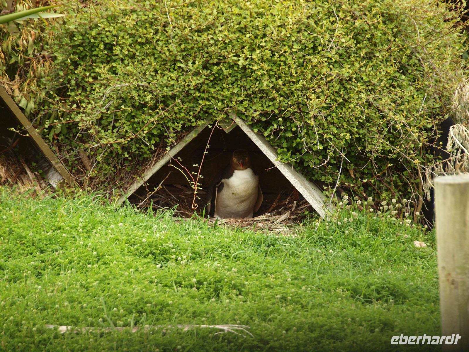 Auch heute steht uns wieder ein Tag voller Attraktionen bevor. Nach dem Frühstück fahren wir entlang der Bucht von Dunedin zum Pinguin Place. Ein Farmer, der hier ursprünglich die Weideflächen für seine Schafherden nutze und viele kleine eigene Buchten besitzt, stellte eines Tages fest, dass sich auch die seltenen Gelbaugenpinguine hier sehr wohl und sicher fühlen. Kurzer Hand entschied er die Flächen am Strand zu einem Schutzreservat umzubauen. Und genau dort wollen wir heute eben diese seltenen Tiere auch sehen. Während einer geführten Tour über die Anlage sehen wir vor allem aber junge Seelöwen Kolonien. Über die Pfade geht es weiter ins Pinguingebiet und wir können vom Weg aus in einige der kleinen Boxen schauen. Wir sehen, wenn auch nur sehr schwer, ein paar Blaupinguine darin nisten. Kurz darauf führt uns der Weg durch kleine, mit Tarnmaterial überdachte Tunnel zum Nistplatz von Maggie und Jim. Wir haben Glück, denn Maggie bewacht zurzeit das Gelege und brütet fleißig ihre Eier aus. Gelbaugenpinguine teilen sich die Arbeit und wechseln sich in regelmäßigen Abständen mit dem Brüten ab. Jim muss also im Moment auf Futtersuche im Meer unterwegs sein.
