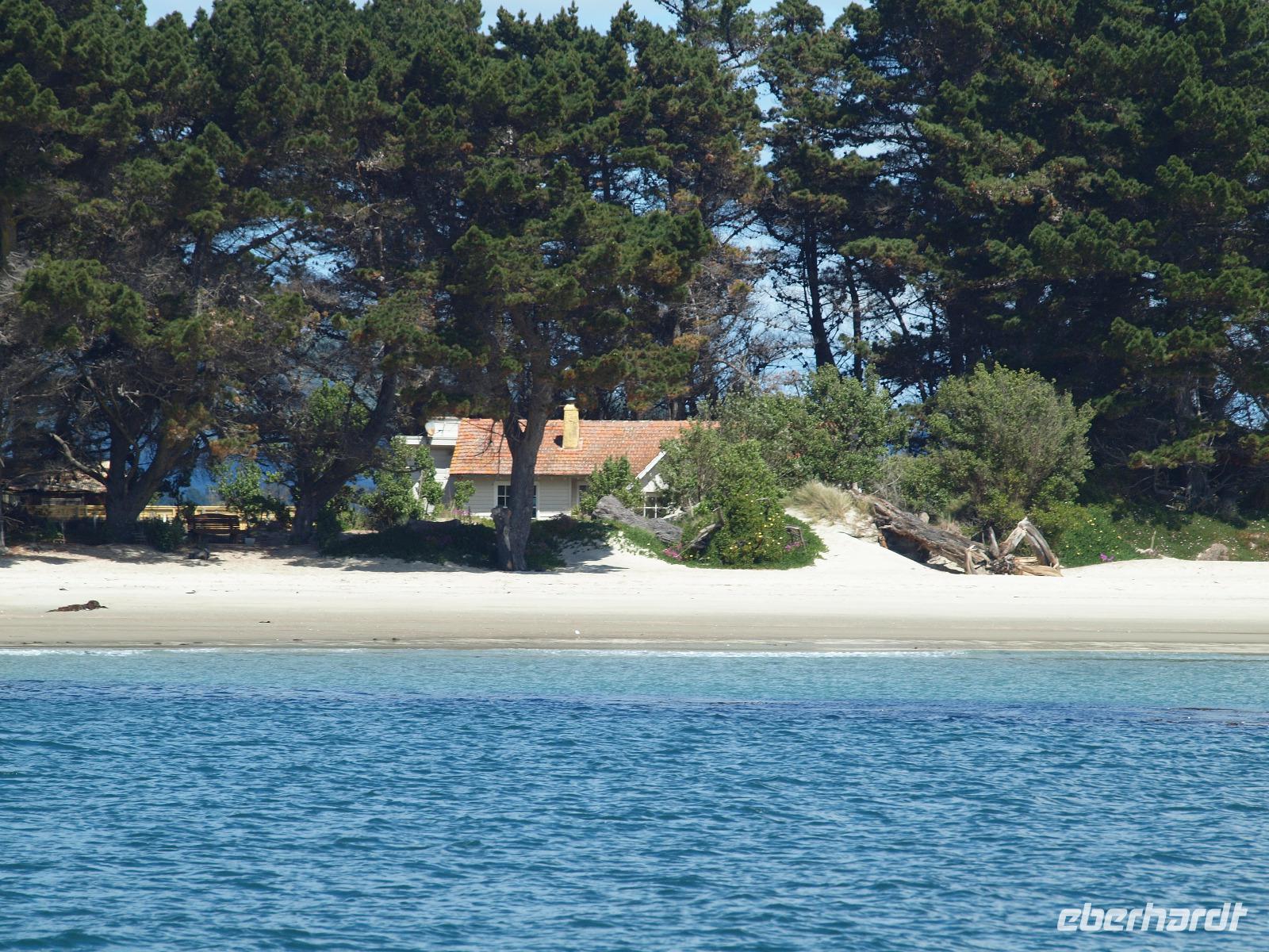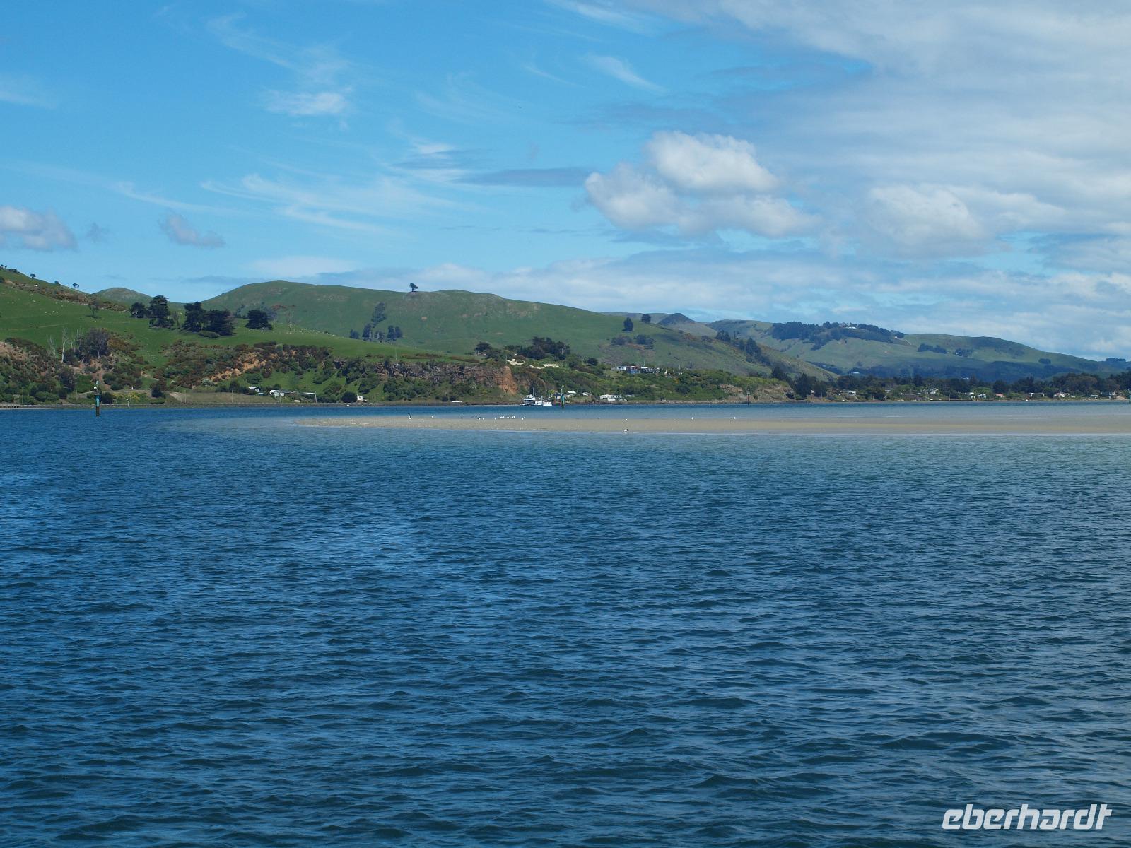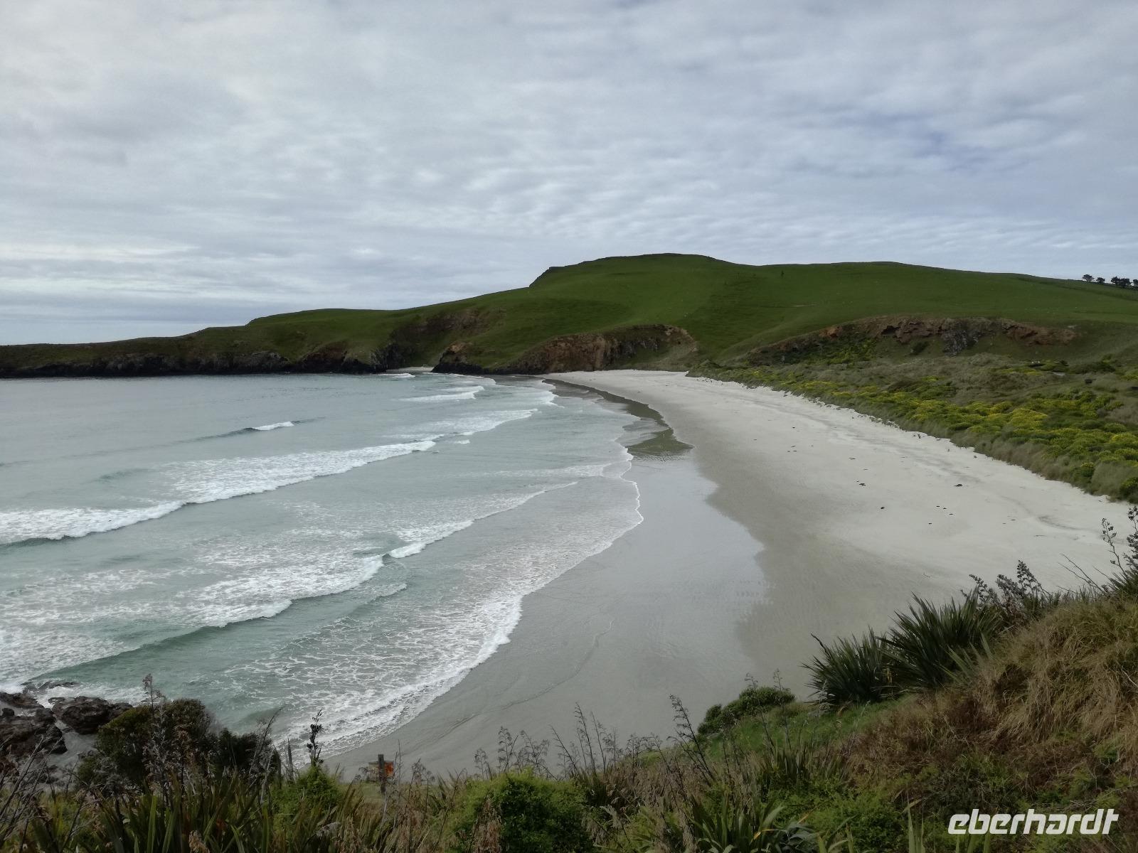 Auch heute steht uns wieder ein Tag voller Attraktionen bevor. Nach dem Frühstück fahren wir entlang der Bucht von Dunedin zum Pinguin Place. Ein Farmer, der hier ursprünglich die Weideflächen für seine Schafherden nutze und viele kleine eigene Buchten besitzt, stellte eines Tages fest, dass sich auch die seltenen Gelbaugenpinguine hier sehr wohl und sicher fühlen. Kurzer Hand entschied er die Flächen am Strand zu einem Schutzreservat umzubauen. Und genau dort wollen wir heute eben diese seltenen Tiere auch sehen. Während einer geführten Tour über die Anlage sehen wir vor allem aber junge Seelöwen Kolonien. Über die Pfade geht es weiter ins Pinguingebiet und wir können vom Weg aus in einige der kleinen Boxen schauen. Wir sehen, wenn auch nur sehr schwer, ein paar Blaupinguine darin nisten. Kurz darauf führt uns der Weg durch kleine, mit Tarnmaterial überdachte Tunnel zum Nistplatz von Maggie und Jim. Wir haben Glück, denn Maggie bewacht zurzeit das Gelege und brütet fleißig ihre Eier aus. Gelbaugenpinguine teilen sich die Arbeit und wechseln sich in regelmäßigen Abständen mit dem Brüten ab. Jim muss also im Moment auf Futtersuche im Meer unterwegs sein.