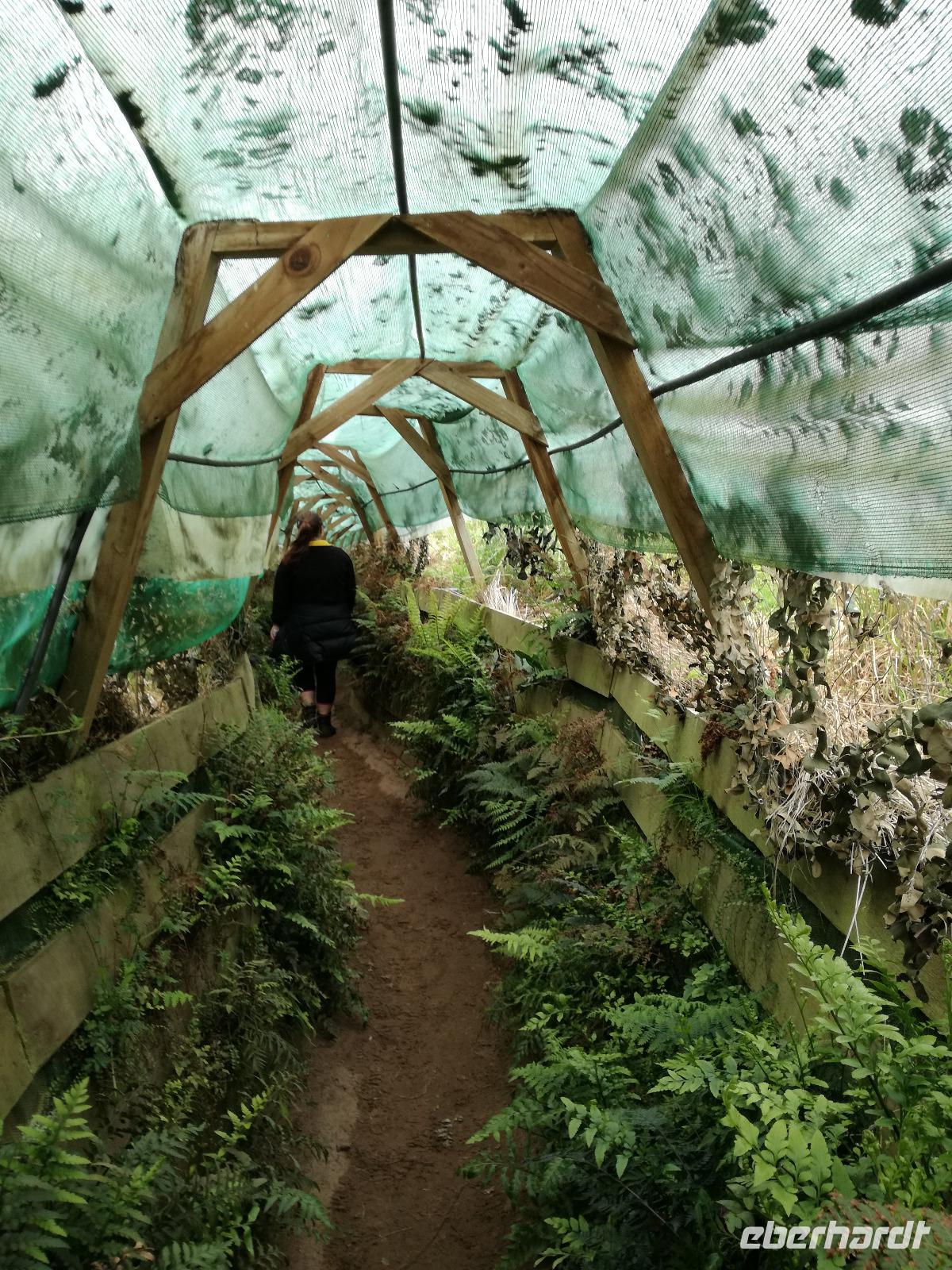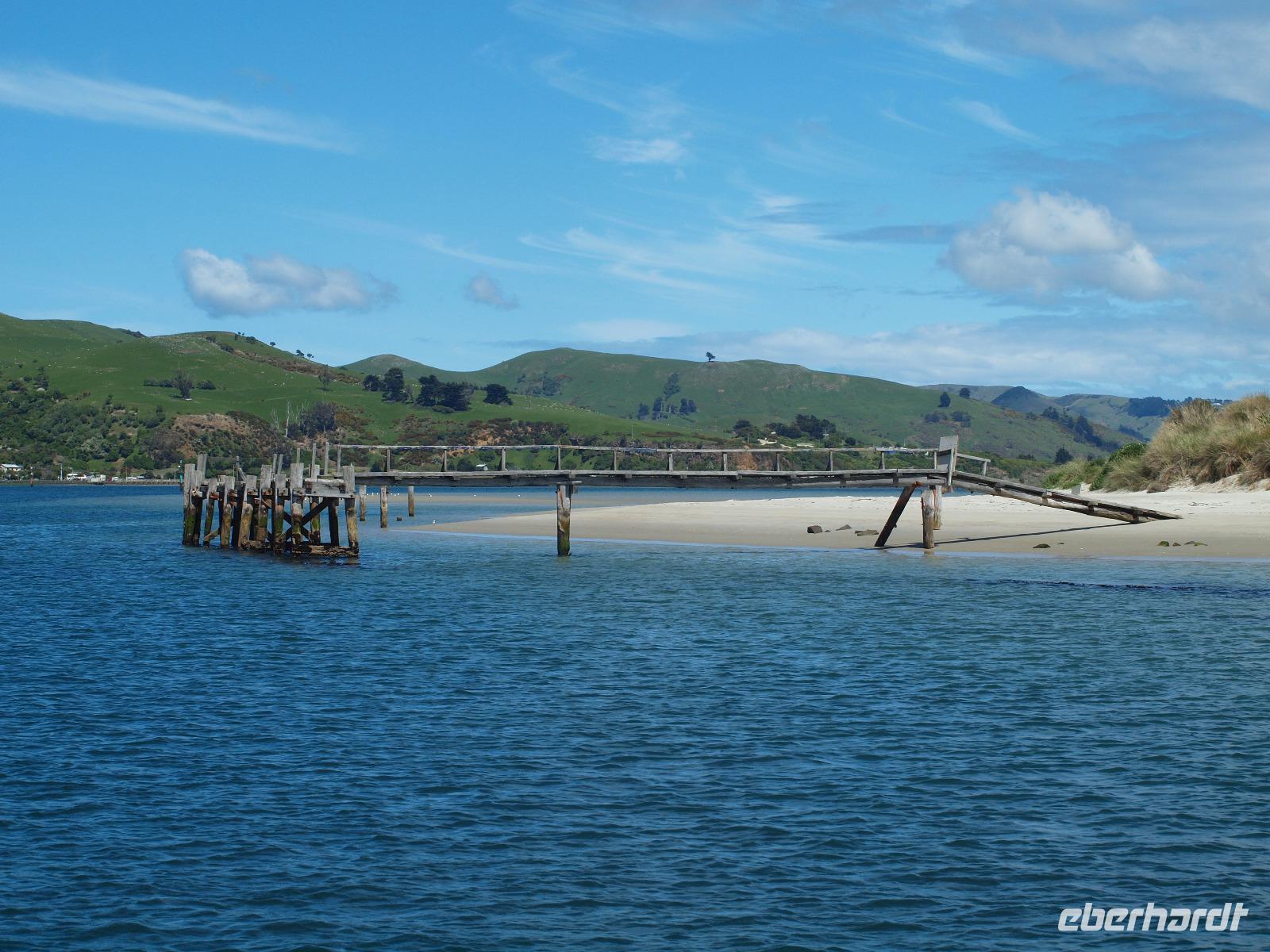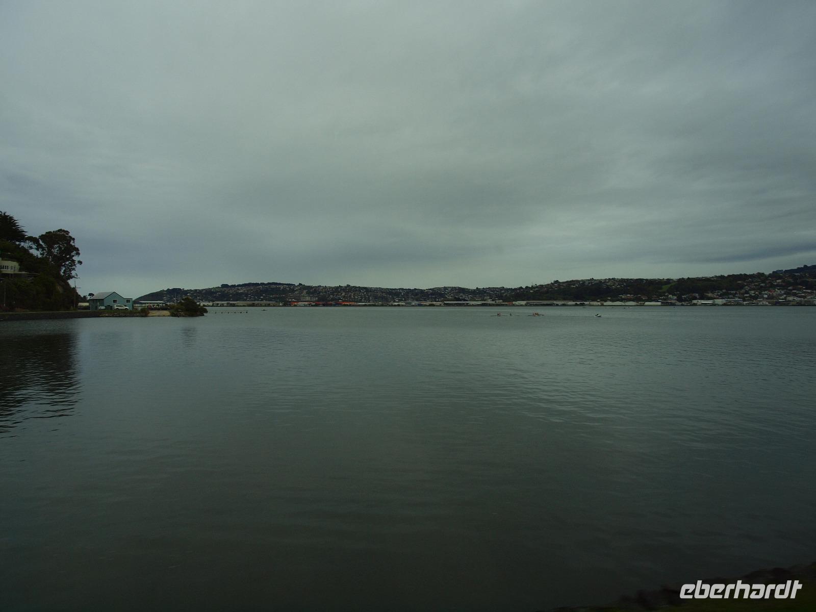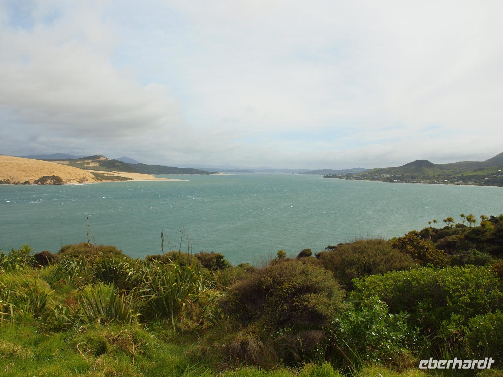 Auch heute steht uns wieder ein Tag voller Attraktionen bevor. Nach dem Frühstück fahren wir entlang der Bucht von Dunedin zum Pinguin Place. Ein Farmer, der hier ursprünglich die Weideflächen für seine Schafherden nutze und viele kleine eigene Buchten besitzt, stellte eines Tages fest, dass sich auch die seltenen Gelbaugenpinguine hier sehr wohl und sicher fühlen. Kurzer Hand entschied er die Flächen am Strand zu einem Schutzreservat umzubauen. Und genau dort wollen wir heute eben diese seltenen Tiere auch sehen. Während einer geführten Tour über die Anlage sehen wir vor allem aber junge Seelöwen Kolonien. Über die Pfade geht es weiter ins Pinguingebiet und wir können vom Weg aus in einige der kleinen Boxen schauen. Wir sehen, wenn auch nur sehr schwer, ein paar Blaupinguine darin nisten. Kurz darauf führt uns der Weg durch kleine, mit Tarnmaterial überdachte Tunnel zum Nistplatz von Maggie und Jim. Wir haben Glück, denn Maggie bewacht zurzeit das Gelege und brütet fleißig ihre Eier aus. Gelbaugenpinguine teilen sich die Arbeit und wechseln sich in regelmäßigen Abständen mit dem Brüten ab. Jim muss also im Moment auf Futtersuche im Meer unterwegs sein.
