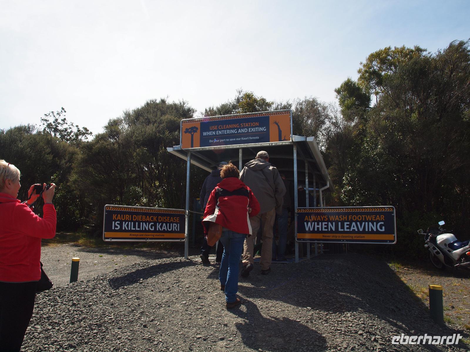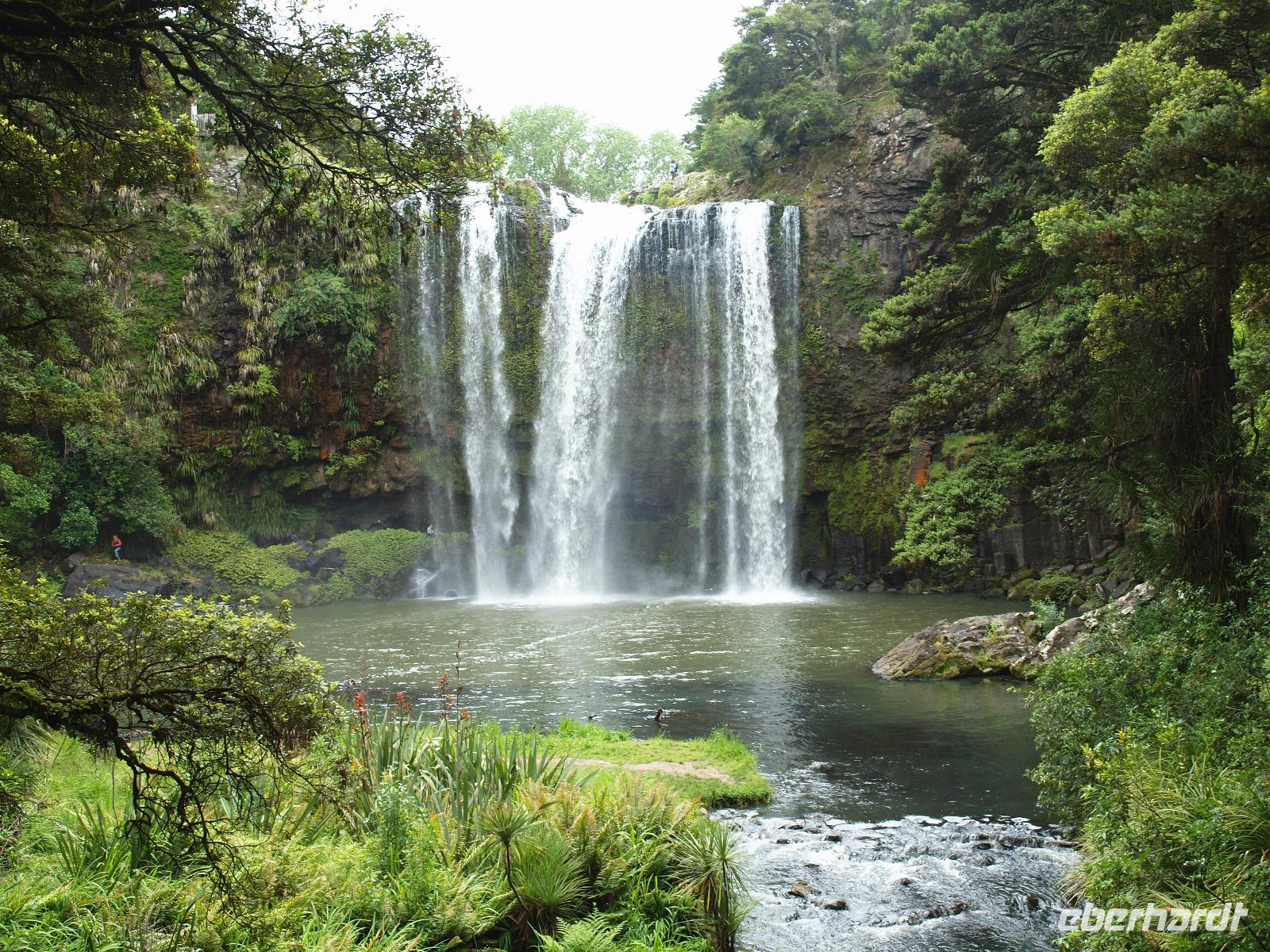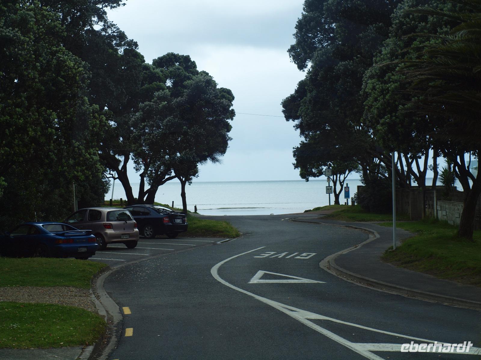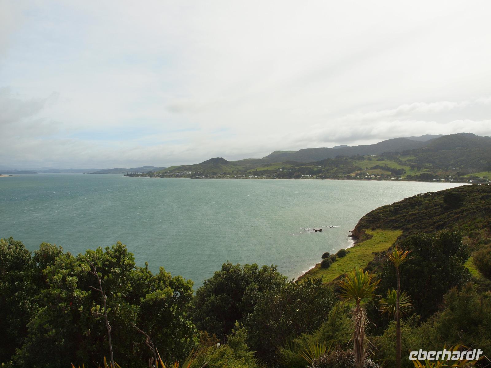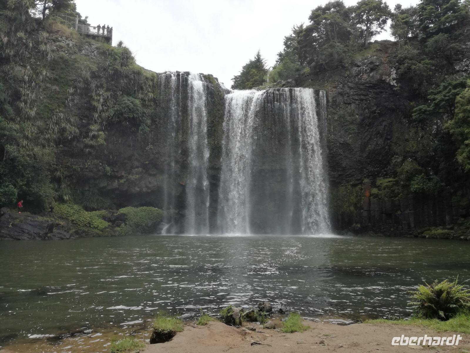 Der heutige Tag bringt leider wieder etwas Regen mit sich. Nach dem Frühstück im nahegelegenen Café Melbourne fahren wir nach Norden, nördlicher geht es fast gar nicht. Wir folgen dem Highway 1. Phil bringt uns in kurzer Zeit nach Auckland, doch die Stadt soll heute noch nicht unser Ziel sein, wir wollen weiter hinauf in den Norden. Bei Orewa machen wir am Strand und bei Nieselregen ein kleines Päuschen. In Puhoi, etwas weiter nördlich besuchen wir eine Käserei in einem böhmischen Dorf. Die Mitarbeiter dort, waren sogar so nett und haben vorsichtshalber einen Tisch für Hains und seine Gruppe reserviert :) Wir sind nun gut gestärkt oder zumindest startklar für die nächste Etappe. Die nächste größere Stadt ist Whangarei. Und die Hauptattraktion dieser Stadt sind die gleichnamigen Whangarei Wasserfälle. Mittlerweile kommen wir ganz gut ohne Regen aus und können trocken den Weg durch den Busch hinunter zum Becken der Wasserfälle wagen. Ein toller Abstecher in die Natur Neuseelands. Bevor wir Paihia erreichen, halten wir noch bei der wohl am häufigsten fotografierten Toilette Neuseelands. Die Toilette wurde von Friedensreich Hundertwasser, in Kawakawa gestaltet. In dem für ihn typischen Stil mit geschwungenen Linien, unregelmäßigen Keramikfliesen und farbigen Gläsern gibt er diesem stillen Örtchen einen ganz besonderen und sehenswerten Touch. Am frühen Nachmittag erreichen wir die Kleinstadt Paihia. Einige wollen an ihrem freien Tag gerne ans Cape Reinga fahren und so schlendern wir kurz nach der Ankunft zusammen zum Informationscenter um die reservierten Plätze auch zu bezahlen. Danach verschwinden wir in den kleinen Nebenstraßen oder ans Ufer und genießen die Abendstunden bis zum Essen.