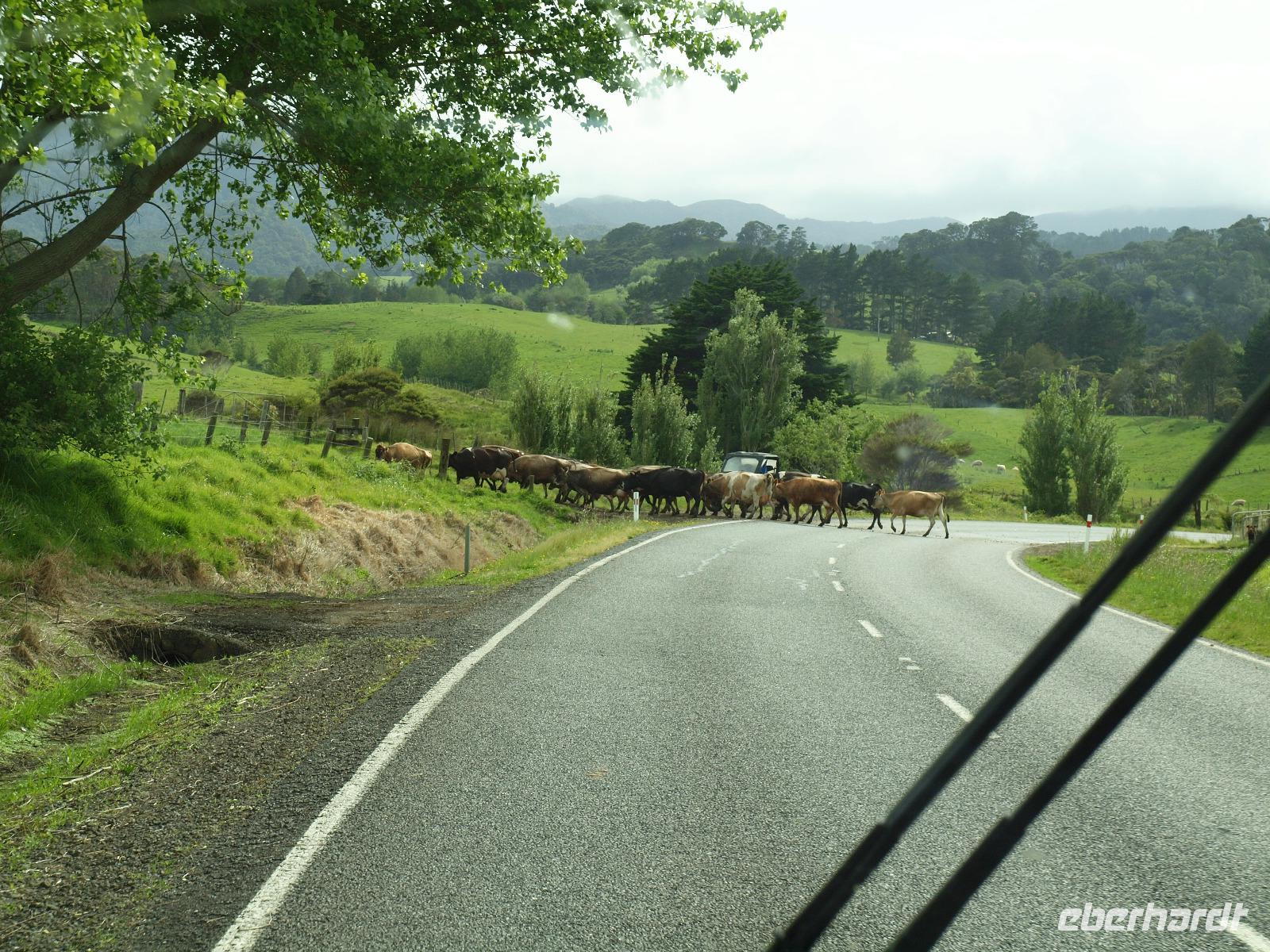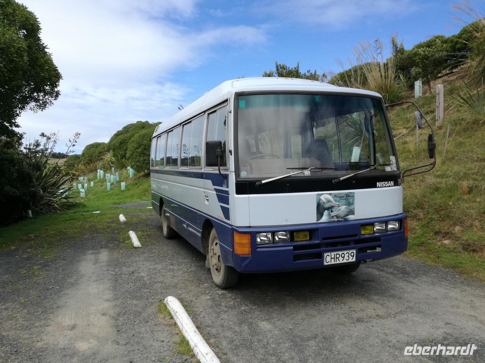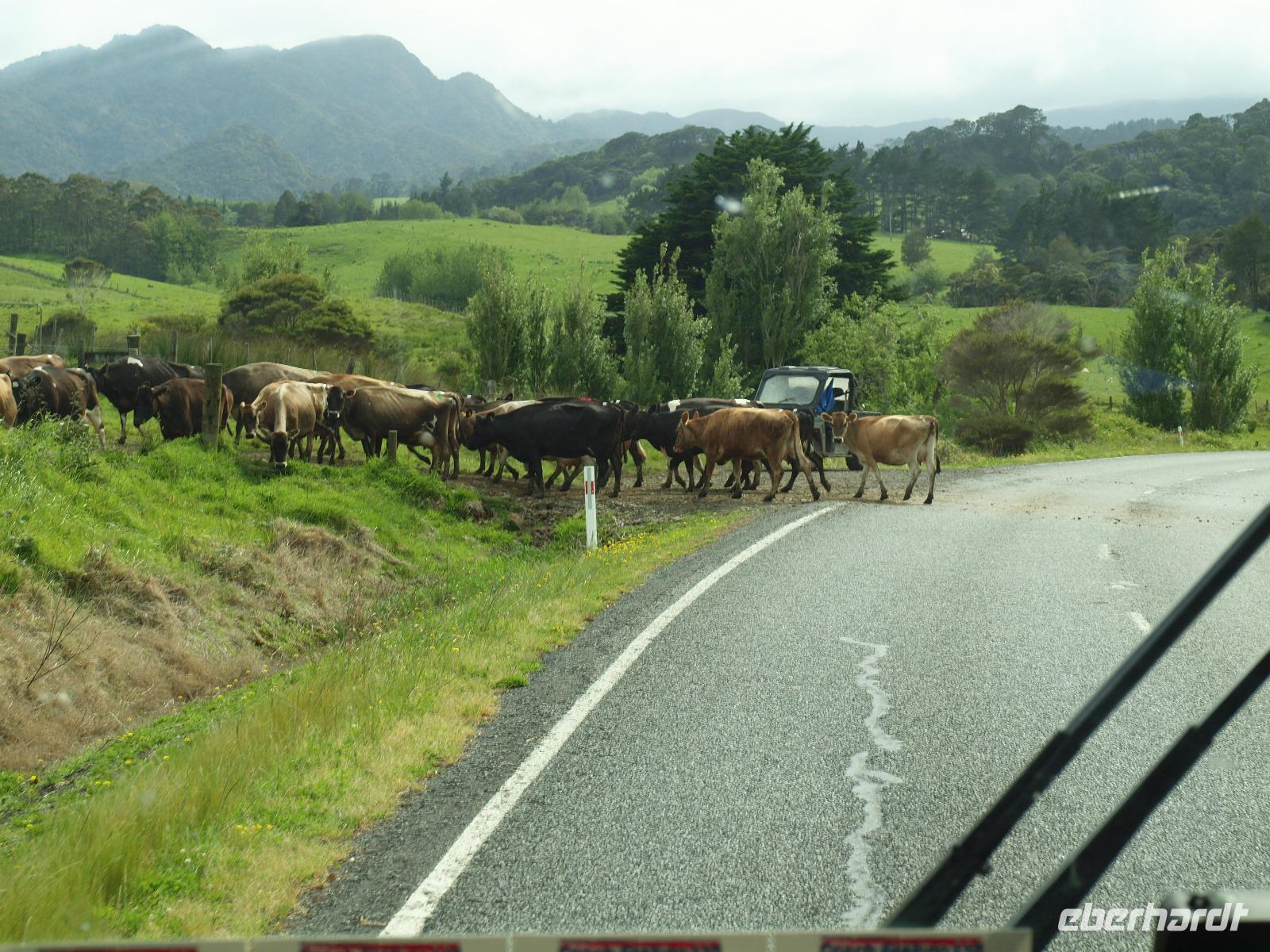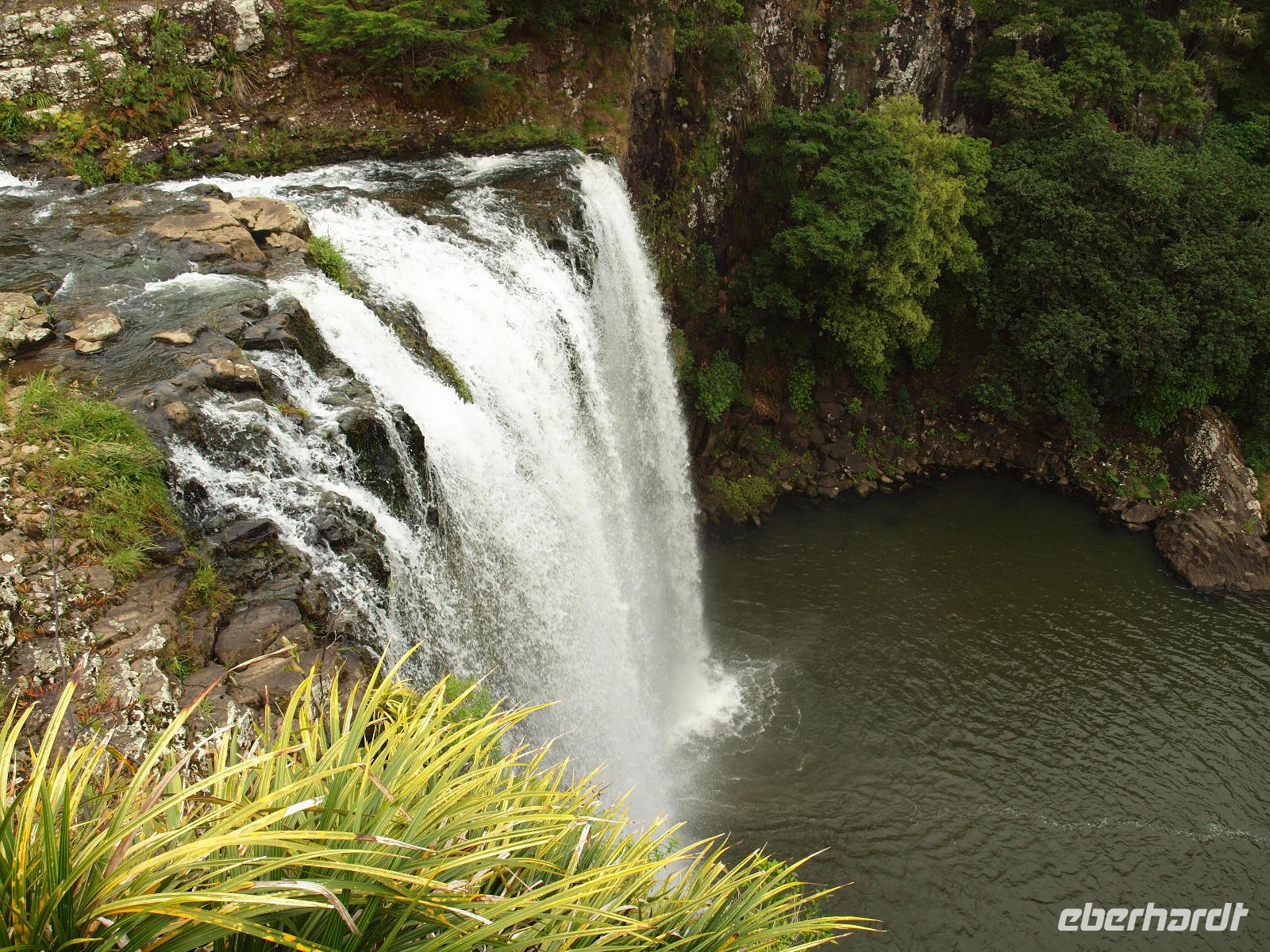 Der heutige Tag bringt leider wieder etwas Regen mit sich. Nach dem Frühstück im nahegelegenen Café Melbourne fahren wir nach Norden, nördlicher geht es fast gar nicht. Wir folgen dem Highway 1. Phil bringt uns in kurzer Zeit nach Auckland, doch die Stadt soll heute noch nicht unser Ziel sein, wir wollen weiter hinauf in den Norden. Bei Orewa machen wir am Strand und bei Nieselregen ein kleines Päuschen. In Puhoi, etwas weiter nördlich besuchen wir eine Käserei in einem böhmischen Dorf. Die Mitarbeiter dort, waren sogar so nett und haben vorsichtshalber einen Tisch für Hains und seine Gruppe reserviert :) Wir sind nun gut gestärkt oder zumindest startklar für die nächste Etappe. Die nächste größere Stadt ist Whangarei. Und die Hauptattraktion dieser Stadt sind die gleichnamigen Whangarei Wasserfälle. Mittlerweile kommen wir ganz gut ohne Regen aus und können trocken den Weg durch den Busch hinunter zum Becken der Wasserfälle wagen. Ein toller Abstecher in die Natur Neuseelands. Bevor wir Paihia erreichen, halten wir noch bei der wohl am häufigsten fotografierten Toilette Neuseelands. Die Toilette wurde von Friedensreich Hundertwasser, in Kawakawa gestaltet. In dem für ihn typischen Stil mit geschwungenen Linien, unregelmäßigen Keramikfliesen und farbigen Gläsern gibt er diesem stillen Örtchen einen ganz besonderen und sehenswerten Touch. Am frühen Nachmittag erreichen wir die Kleinstadt Paihia. Einige wollen an ihrem freien Tag gerne ans Cape Reinga fahren und so schlendern wir kurz nach der Ankunft zusammen zum Informationscenter um die reservierten Plätze auch zu bezahlen. Danach verschwinden wir in den kleinen Nebenstraßen oder ans Ufer und genießen die Abendstunden bis zum Essen.