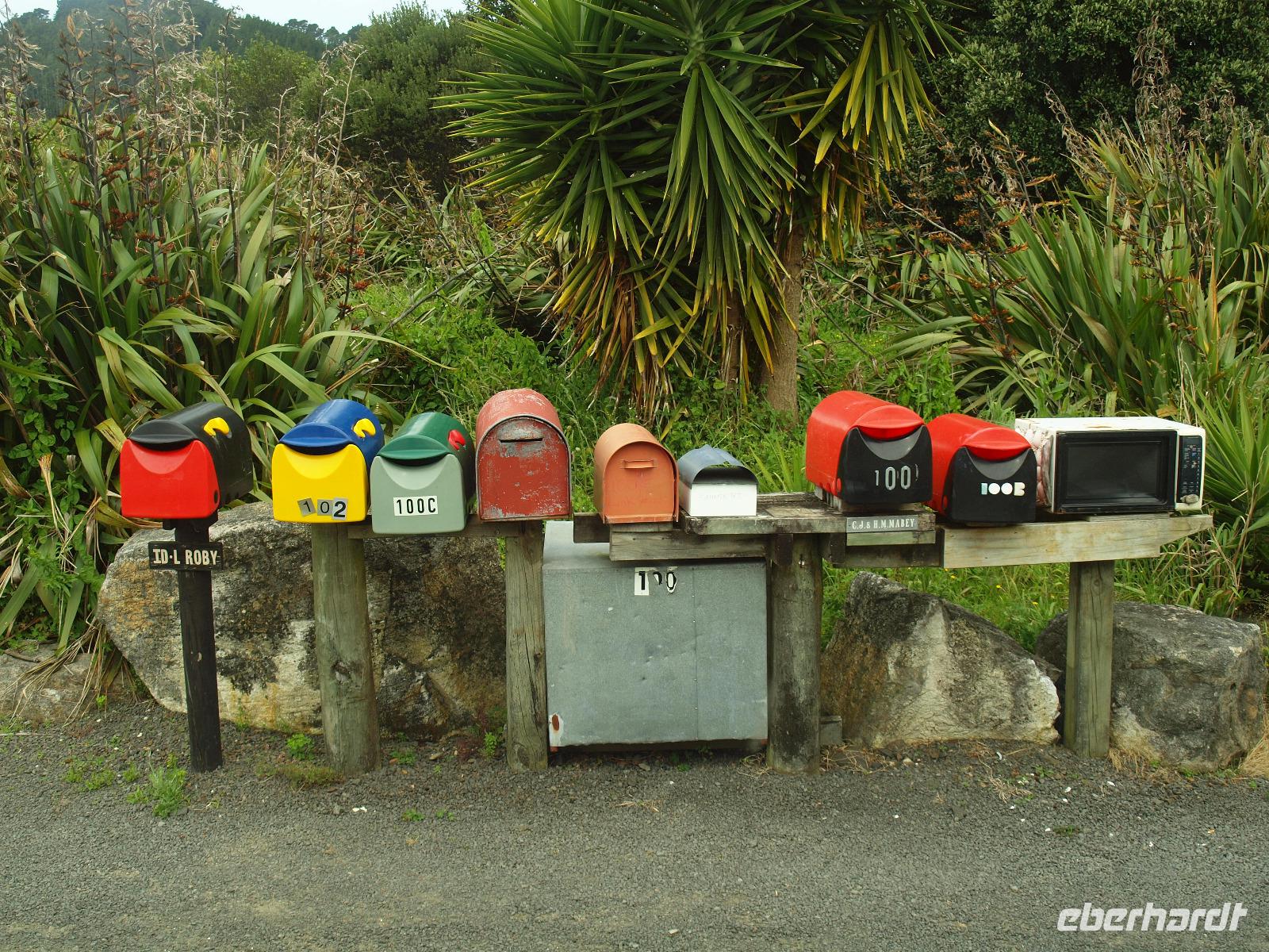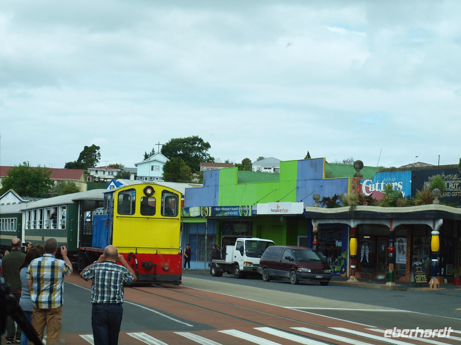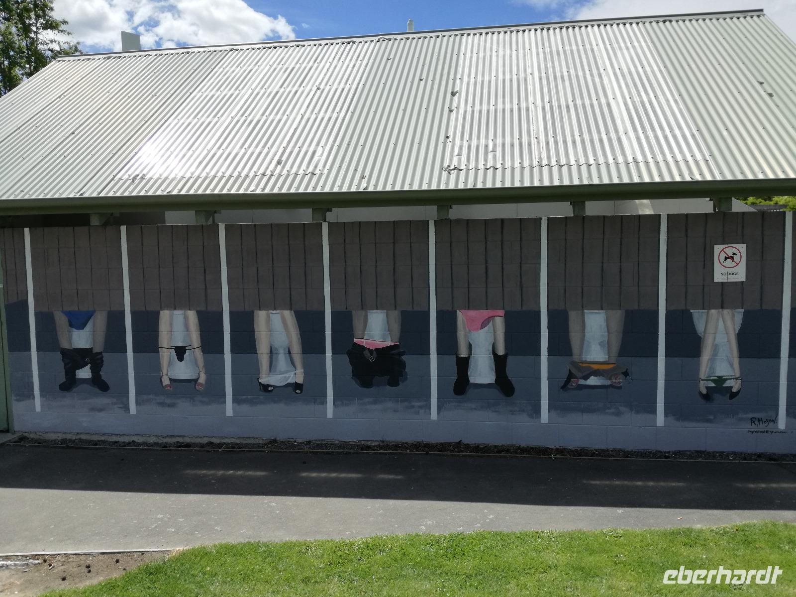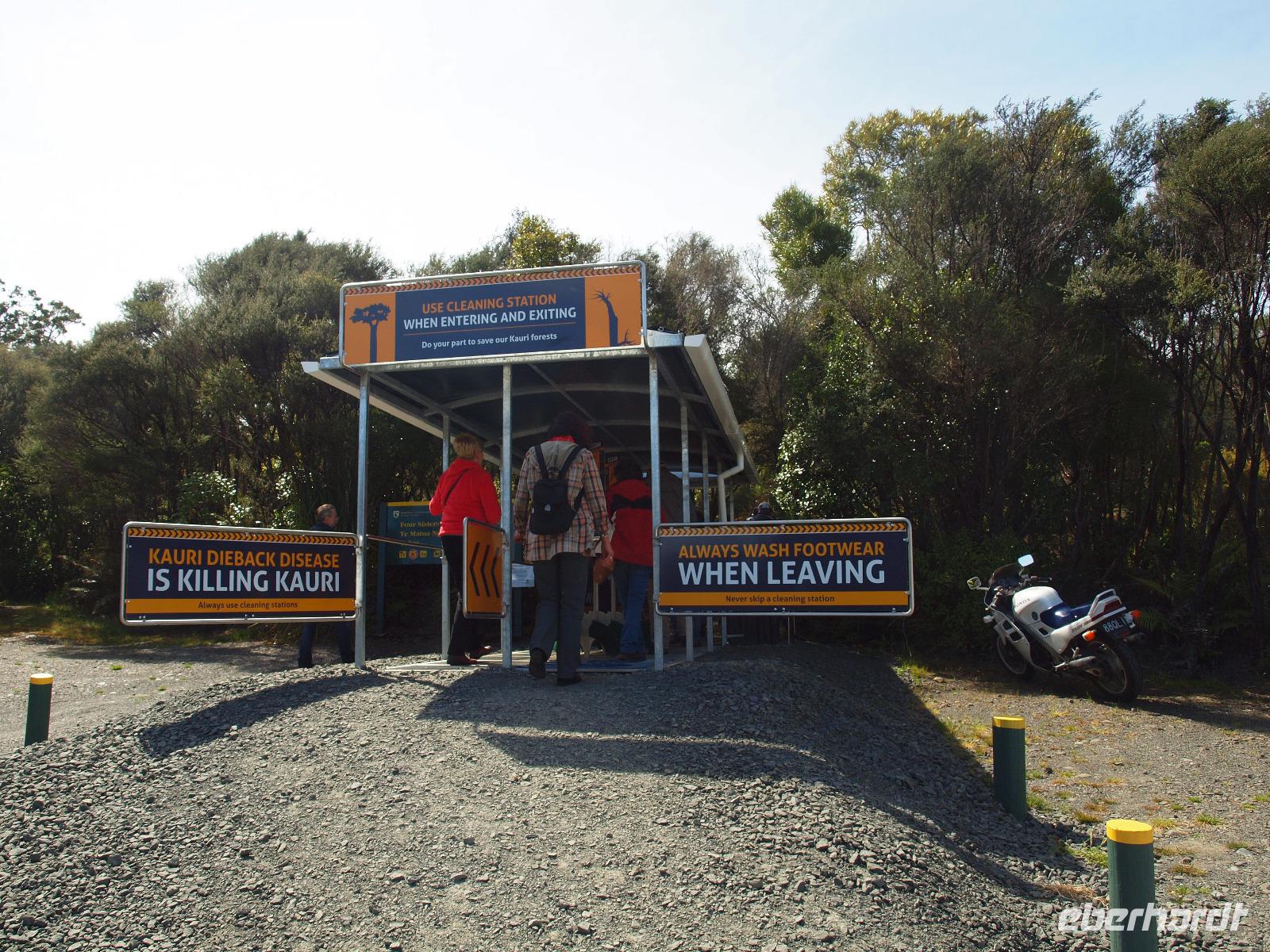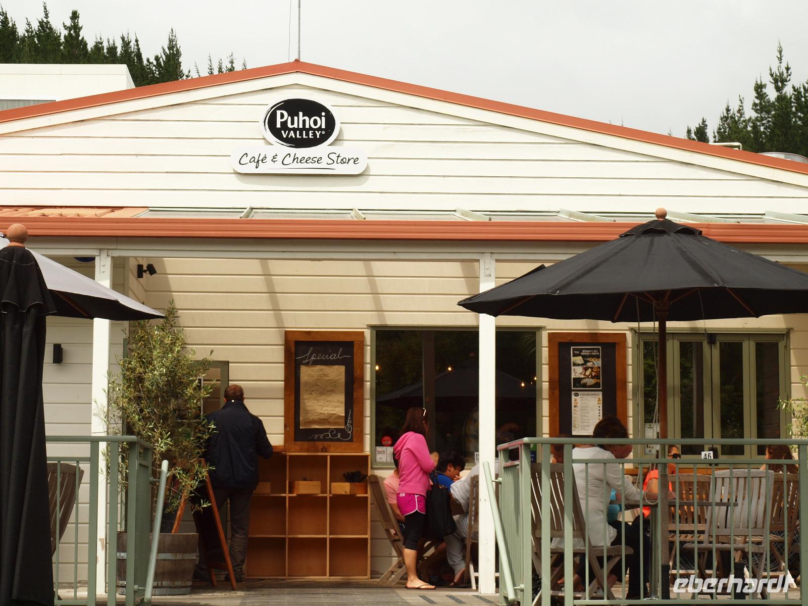 Der heutige Tag bringt leider wieder etwas Regen mit sich. Nach dem Frühstück im nahegelegenen Café Melbourne fahren wir nach Norden, nördlicher geht es fast gar nicht. Wir folgen dem Highway 1. Phil bringt uns in kurzer Zeit nach Auckland, doch die Stadt soll heute noch nicht unser Ziel sein, wir wollen weiter hinauf in den Norden. Bei Orewa machen wir am Strand und bei Nieselregen ein kleines Päuschen. In Puhoi, etwas weiter nördlich besuchen wir eine Käserei in einem böhmischen Dorf. Die Mitarbeiter dort, waren sogar so nett und haben vorsichtshalber einen Tisch für Hains und seine Gruppe reserviert :) Wir sind nun gut gestärkt oder zumindest startklar für die nächste Etappe. Die nächste größere Stadt ist Whangarei. Und die Hauptattraktion dieser Stadt sind die gleichnamigen Whangarei Wasserfälle. Mittlerweile kommen wir ganz gut ohne Regen aus und können trocken den Weg durch den Busch hinunter zum Becken der Wasserfälle wagen. Ein toller Abstecher in die Natur Neuseelands. Bevor wir Paihia erreichen, halten wir noch bei der wohl am häufigsten fotografierten Toilette Neuseelands. Die Toilette wurde von Friedensreich Hundertwasser, in Kawakawa gestaltet. In dem für ihn typischen Stil mit geschwungenen Linien, unregelmäßigen Keramikfliesen und farbigen Gläsern gibt er diesem stillen Örtchen einen ganz besonderen und sehenswerten Touch. Am frühen Nachmittag erreichen wir die Kleinstadt Paihia. Einige wollen an ihrem freien Tag gerne ans Cape Reinga fahren und so schlendern wir kurz nach der Ankunft zusammen zum Informationscenter um die reservierten Plätze auch zu bezahlen. Danach verschwinden wir in den kleinen Nebenstraßen oder ans Ufer und genießen die Abendstunden bis zum Essen.