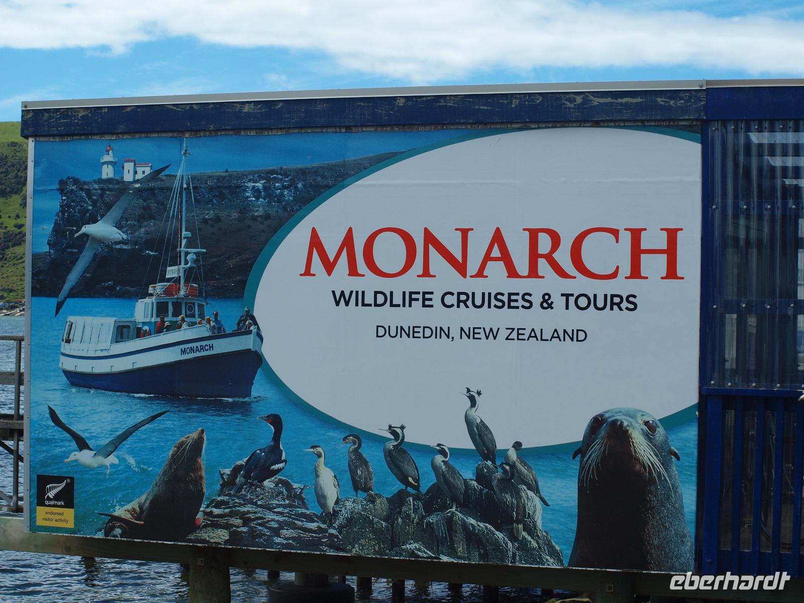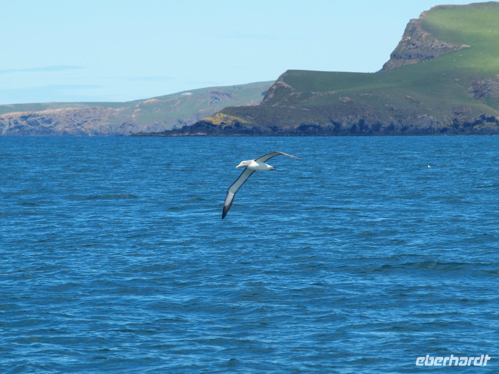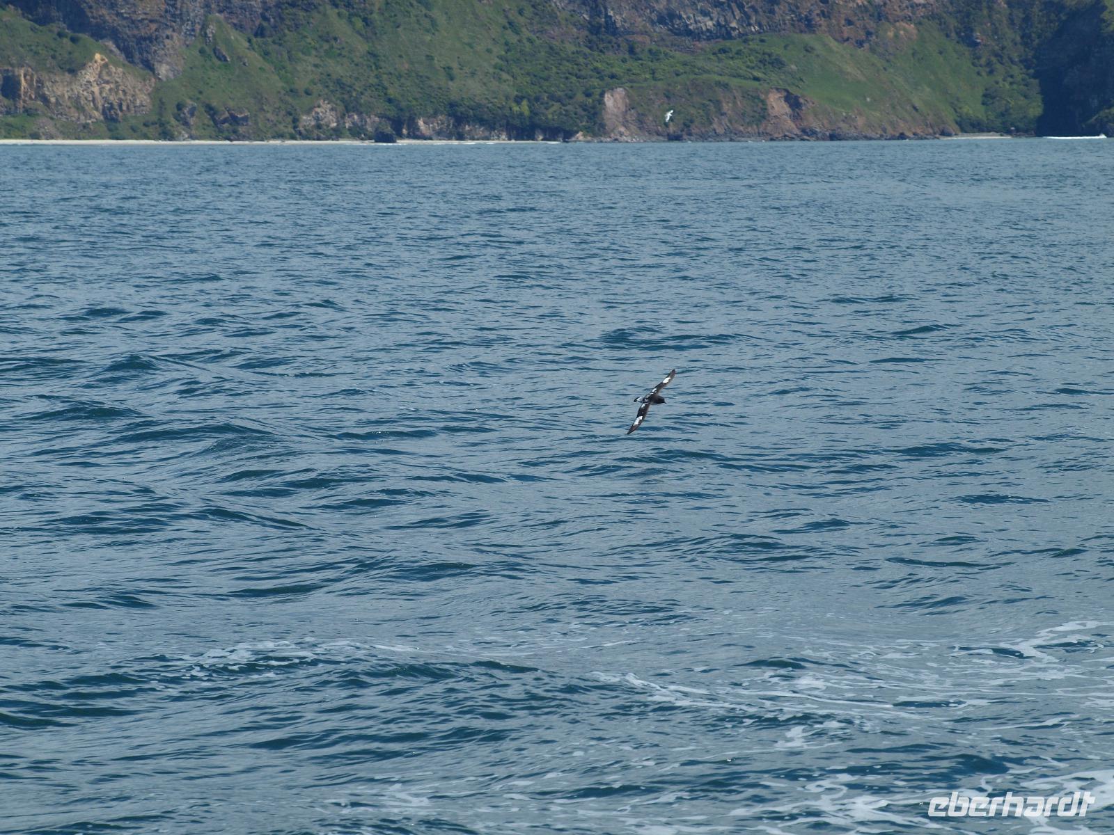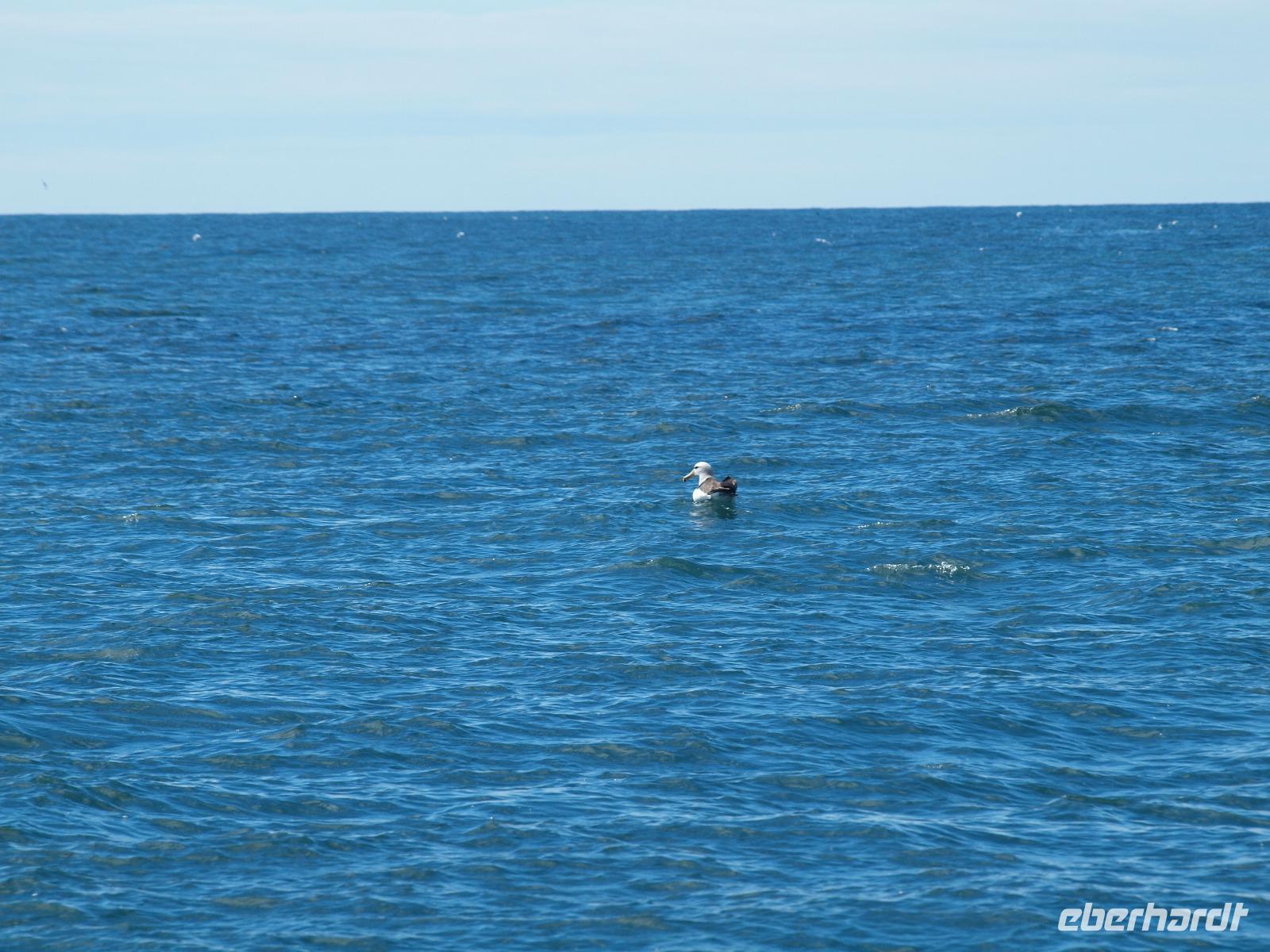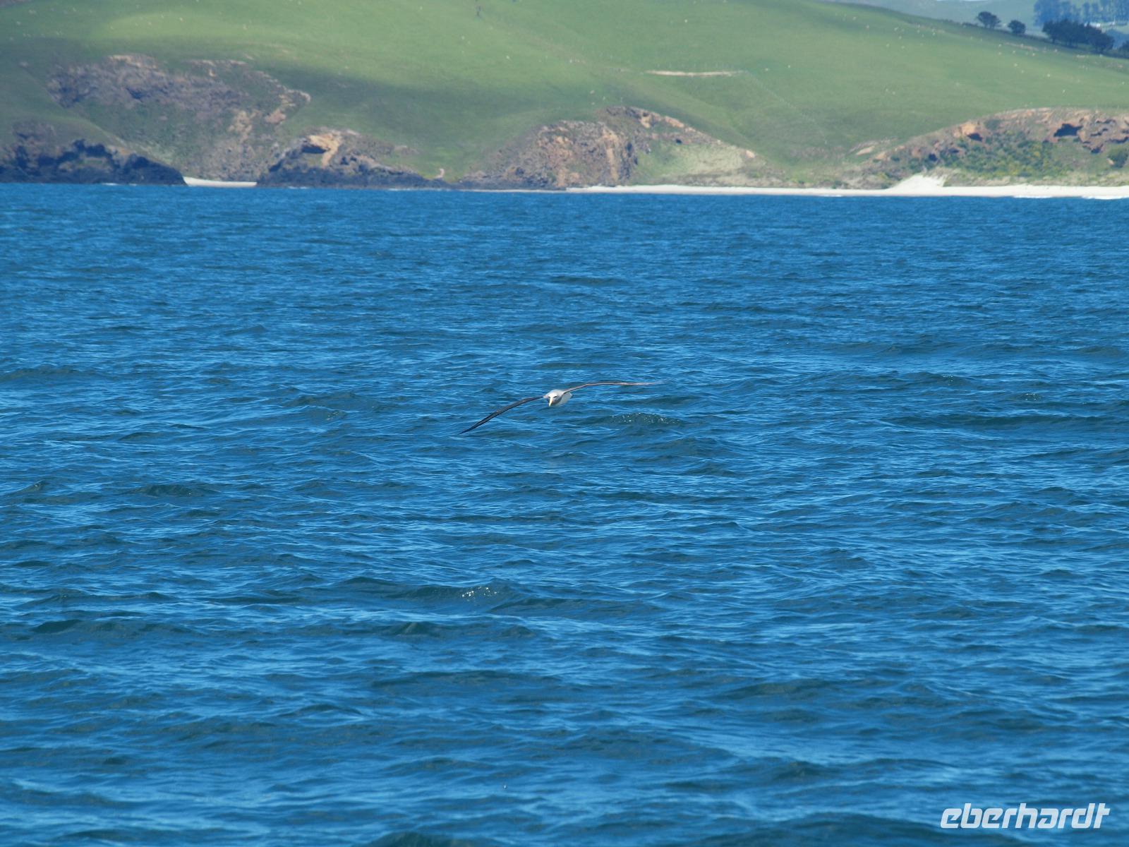 Nach dem Besuch der Pinguine fahren wir nur wenige Meter wieder die Strecke die wir gekommen sind zurück und gehen an Bord der Monarch. Das kleine Boot bringt uns hinaus auf die weite See. Ziel dieser Unternehmung ist es, den großen Königsalbatrossen etwas näher zu kommen. Natürlich sehen wir auch wieder ein paar Seelöwen, die sich genüsslich in der Sonne ausruhen. Unser Skipper Buddy nimmt dann Kurs auf einen im Wasser schwimmenden Albatros und versucht mit uns so nah wie möglich an ihn heranzukommen, doch dieser entscheidet sich lieber für die Flucht und fliegt davon. Während Buddy weiter nach den großen Vögeln Ausschau hält entdeckt sein Kollege Jürgen ein paar kleine Blaupinguine im Wasser. Die kleinen Kerlchen sind anscheinend dabei sich ihre Fische fürs Mittagsessen zu fangen. Und wieder nimmt Buddy Kurs auf einen Albatros. Zwischendurch kreuzen auch ein paar andere Seevögel unseren Weg, wie zum Beispiel die allgemein gut bekannte Seemöwe. Und gerade als wir uns auf den Rückweg machen wollen fliegt doch tatsächlich noch ein Königsalbatros an uns vorbei, Glück gehabt! Auf dem Weg zur Anlegestelle fahren wir auch wieder an den steilen Felswänden vorbei. Hier haben sich inzwischen auch drei Albatrosse niedergelassen, ein weiteres Mal Glück gehabt!