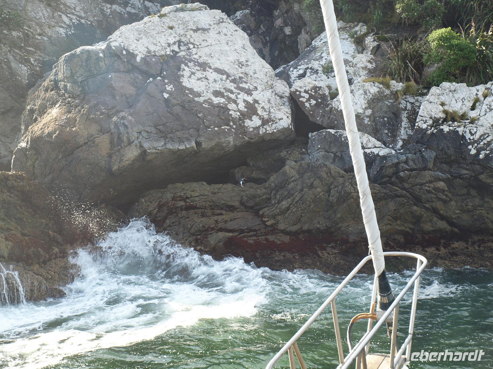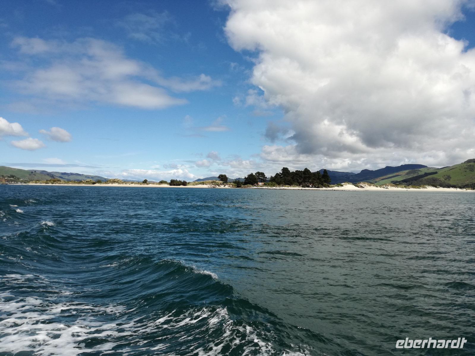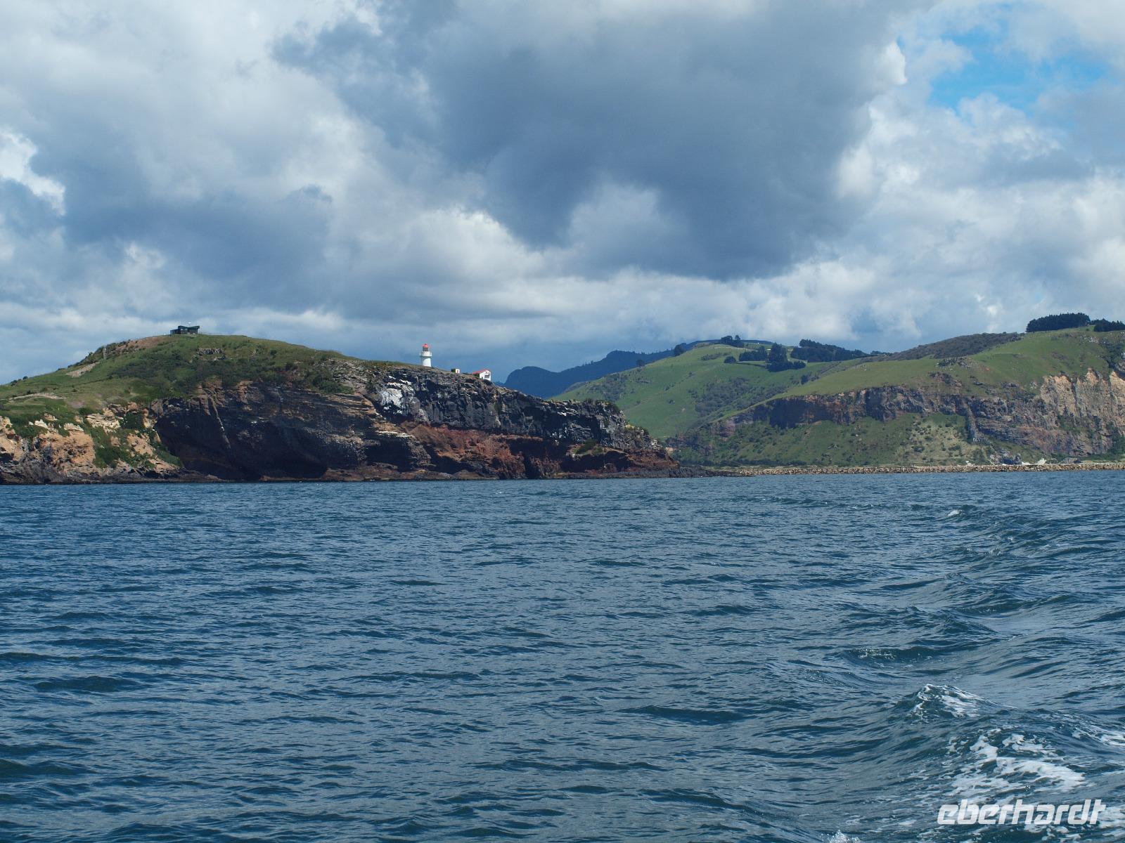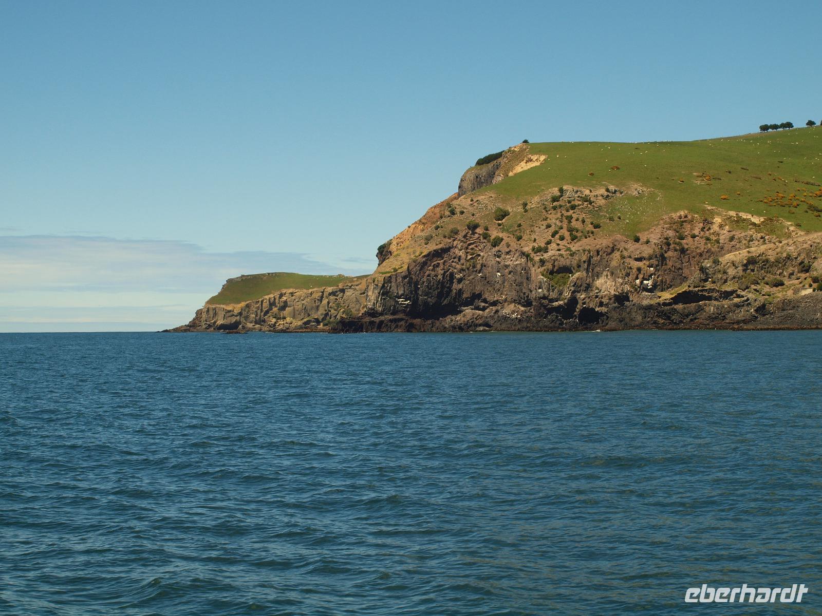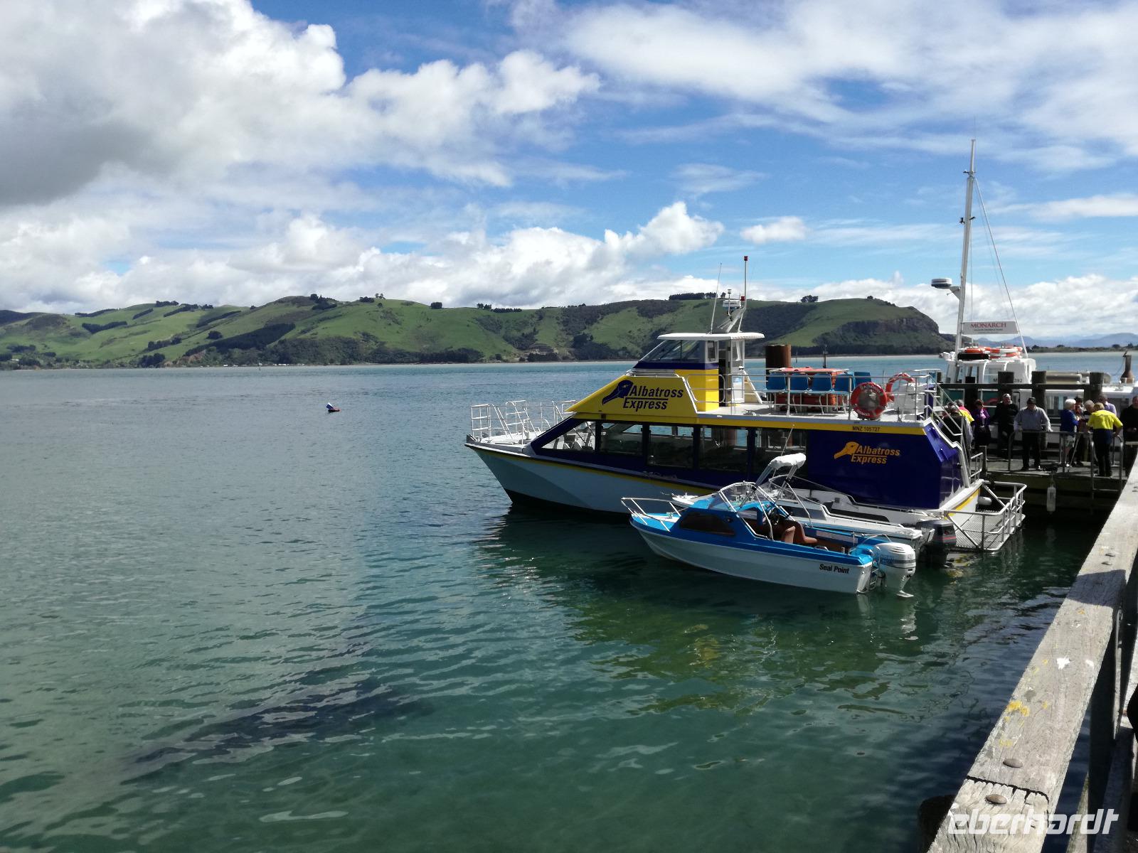 Nach dem Besuch der Pinguine fahren wir nur wenige Meter wieder die Strecke die wir gekommen sind zurück und gehen an Bord der Monarch. Das kleine Boot bringt uns hinaus auf die weite See. Ziel dieser Unternehmung ist es, den großen Königsalbatrossen etwas näher zu kommen. Natürlich sehen wir auch wieder ein paar Seelöwen, die sich genüsslich in der Sonne ausruhen. Unser Skipper Buddy nimmt dann Kurs auf einen im Wasser schwimmenden Albatros und versucht mit uns so nah wie möglich an ihn heranzukommen, doch dieser entscheidet sich lieber für die Flucht und fliegt davon. Während Buddy weiter nach den großen Vögeln Ausschau hält entdeckt sein Kollege Jürgen ein paar kleine Blaupinguine im Wasser. Die kleinen Kerlchen sind anscheinend dabei sich ihre Fische fürs Mittagsessen zu fangen. Und wieder nimmt Buddy Kurs auf einen Albatros. Zwischendurch kreuzen auch ein paar andere Seevögel unseren Weg, wie zum Beispiel die allgemein gut bekannte Seemöwe. Und gerade als wir uns auf den Rückweg machen wollen fliegt doch tatsächlich noch ein Königsalbatros an uns vorbei, Glück gehabt! Auf dem Weg zur Anlegestelle fahren wir auch wieder an den steilen Felswänden vorbei. Hier haben sich inzwischen auch drei Albatrosse niedergelassen, ein weiteres Mal Glück gehabt!