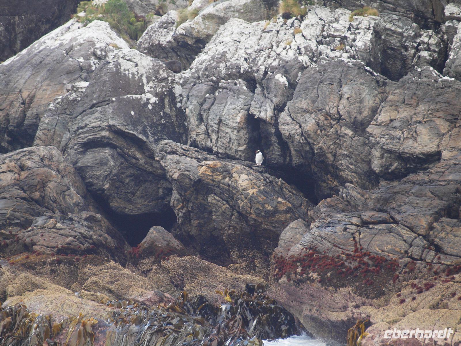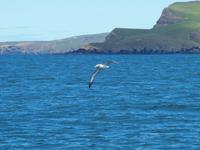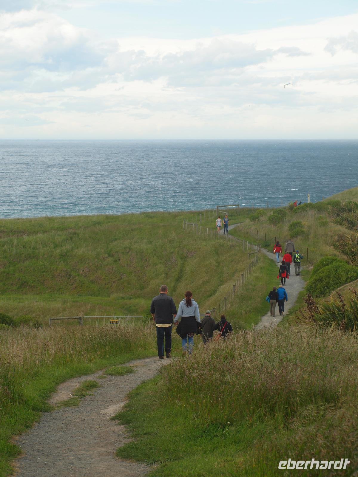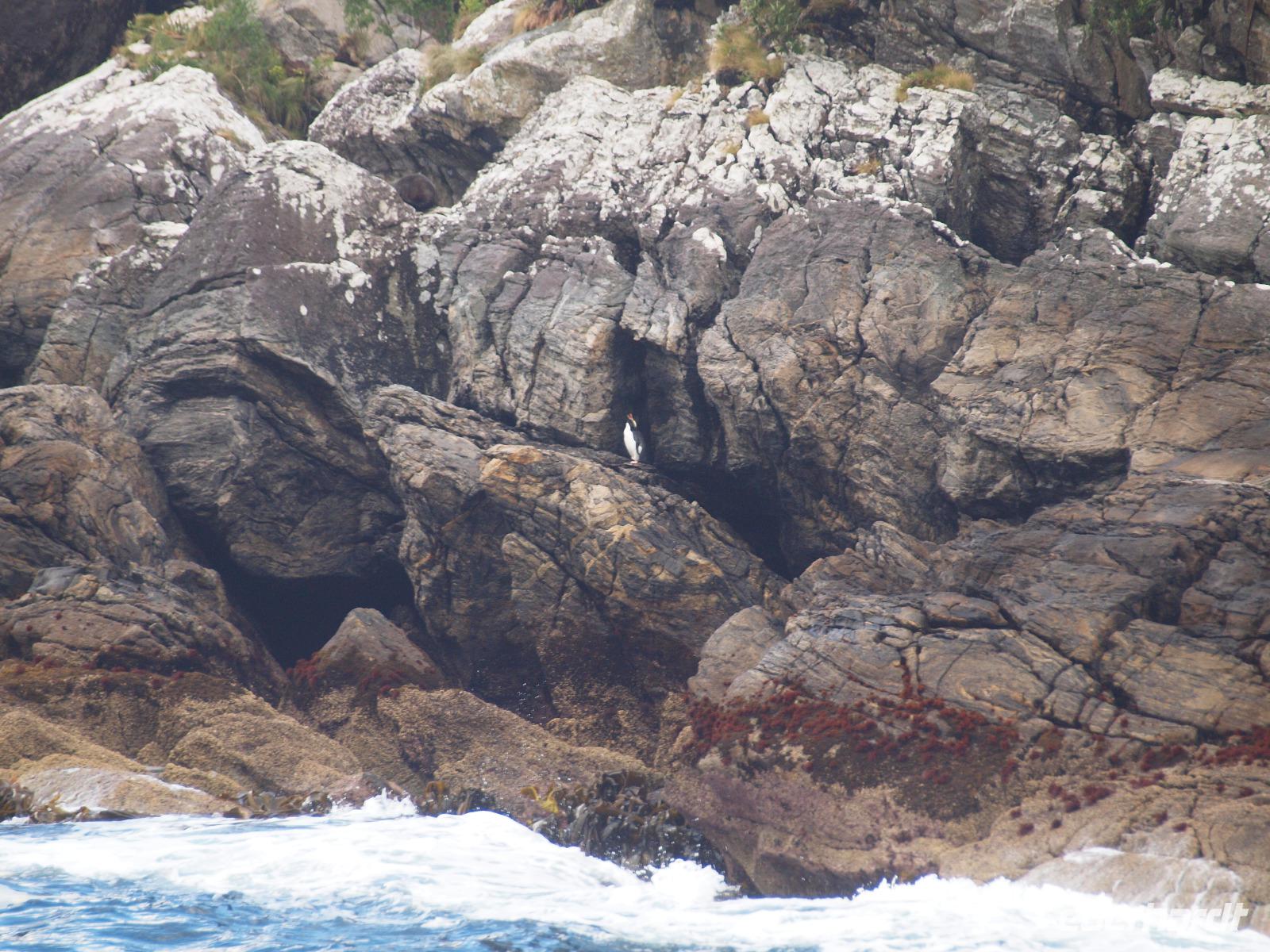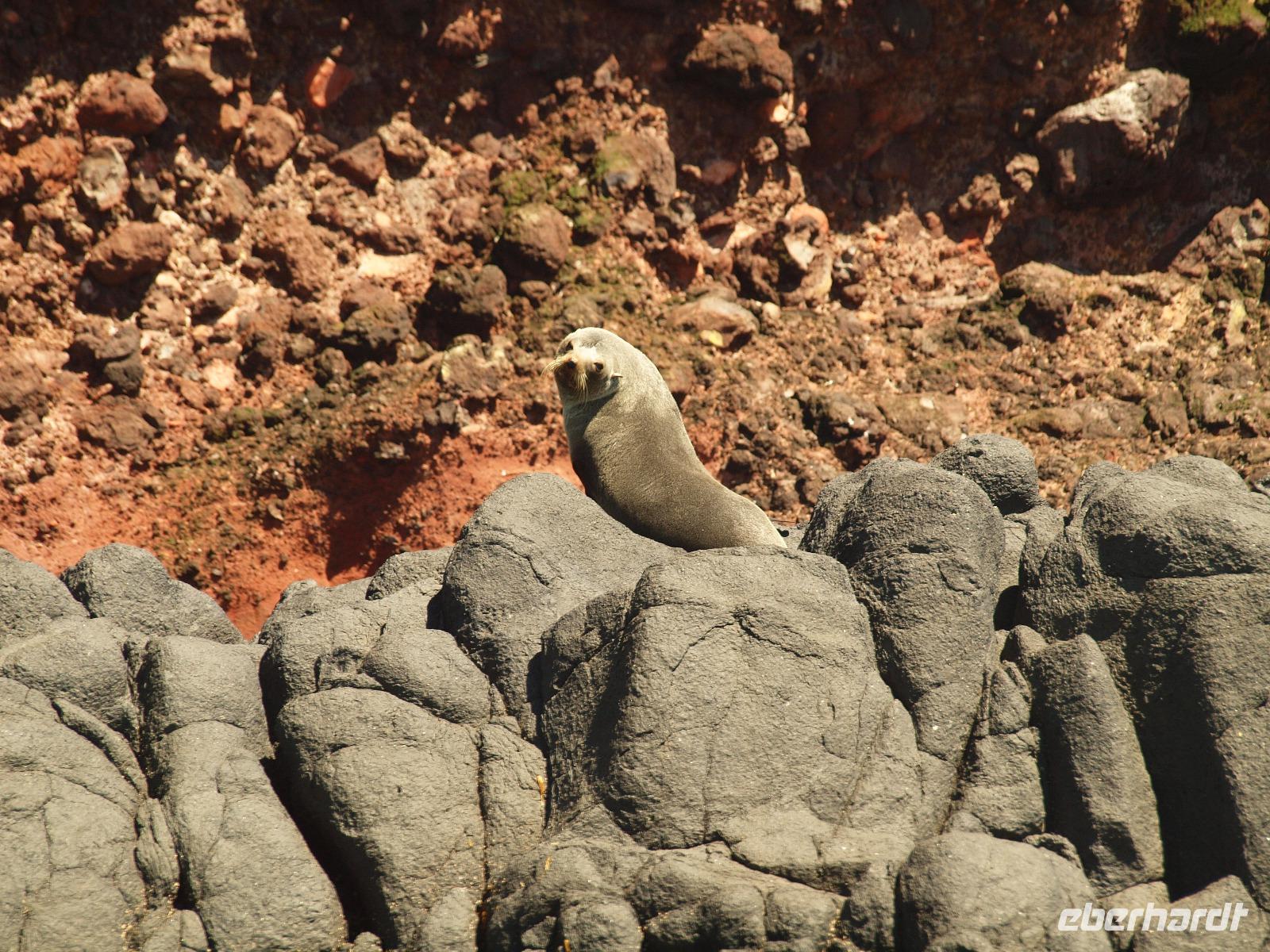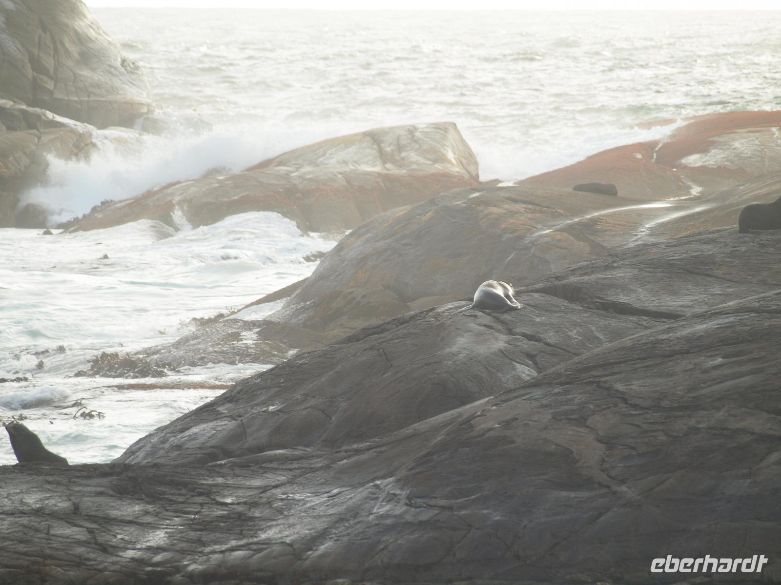 Nach dem Besuch der Pinguine fahren wir nur wenige Meter wieder die Strecke die wir gekommen sind zurück und gehen an Bord der Monarch. Das kleine Boot bringt uns hinaus auf die weite See. Ziel dieser Unternehmung ist es, den großen Königsalbatrossen etwas näher zu kommen. Natürlich sehen wir auch wieder ein paar Seelöwen, die sich genüsslich in der Sonne ausruhen. Unser Skipper Buddy nimmt dann Kurs auf einen im Wasser schwimmenden Albatros und versucht mit uns so nah wie möglich an ihn heranzukommen, doch dieser entscheidet sich lieber für die Flucht und fliegt davon. Während Buddy weiter nach den großen Vögeln Ausschau hält entdeckt sein Kollege Jürgen ein paar kleine Blaupinguine im Wasser. Die kleinen Kerlchen sind anscheinend dabei sich ihre Fische fürs Mittagsessen zu fangen. Und wieder nimmt Buddy Kurs auf einen Albatros. Zwischendurch kreuzen auch ein paar andere Seevögel unseren Weg, wie zum Beispiel die allgemein gut bekannte Seemöwe. Und gerade als wir uns auf den Rückweg machen wollen fliegt doch tatsächlich noch ein Königsalbatros an uns vorbei, Glück gehabt! Auf dem Weg zur Anlegestelle fahren wir auch wieder an den steilen Felswänden vorbei. Hier haben sich inzwischen auch drei Albatrosse niedergelassen, ein weiteres Mal Glück gehabt!
