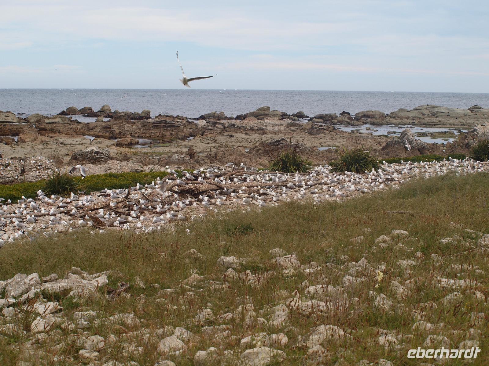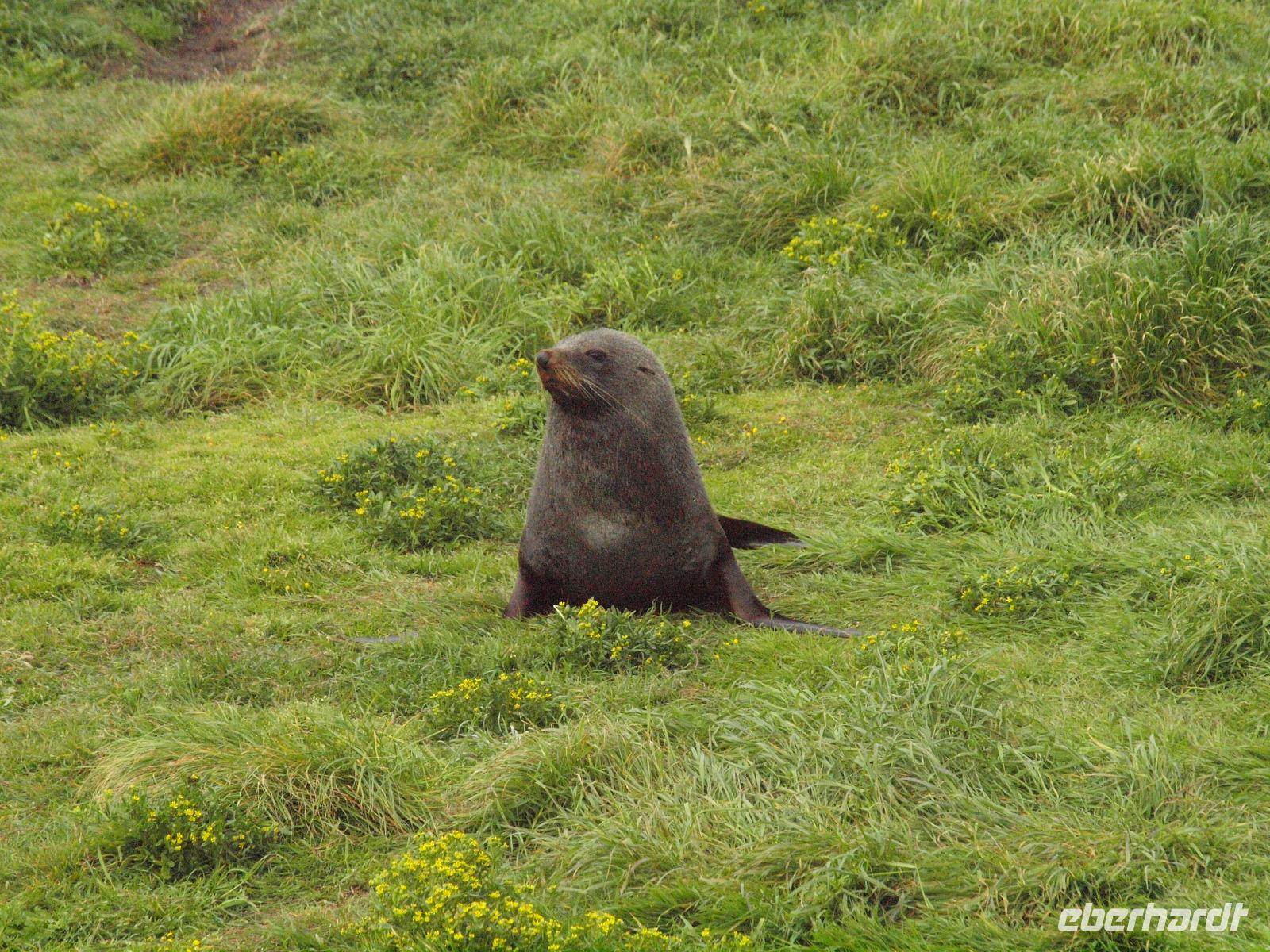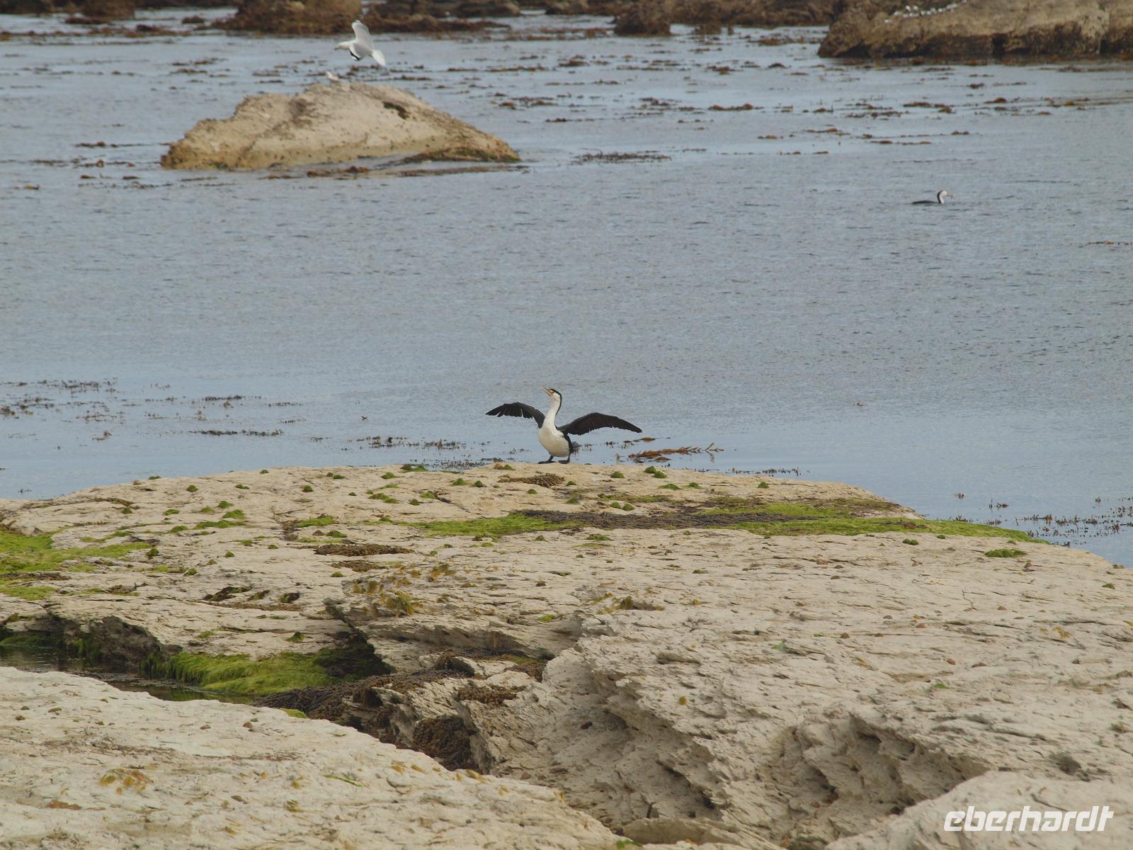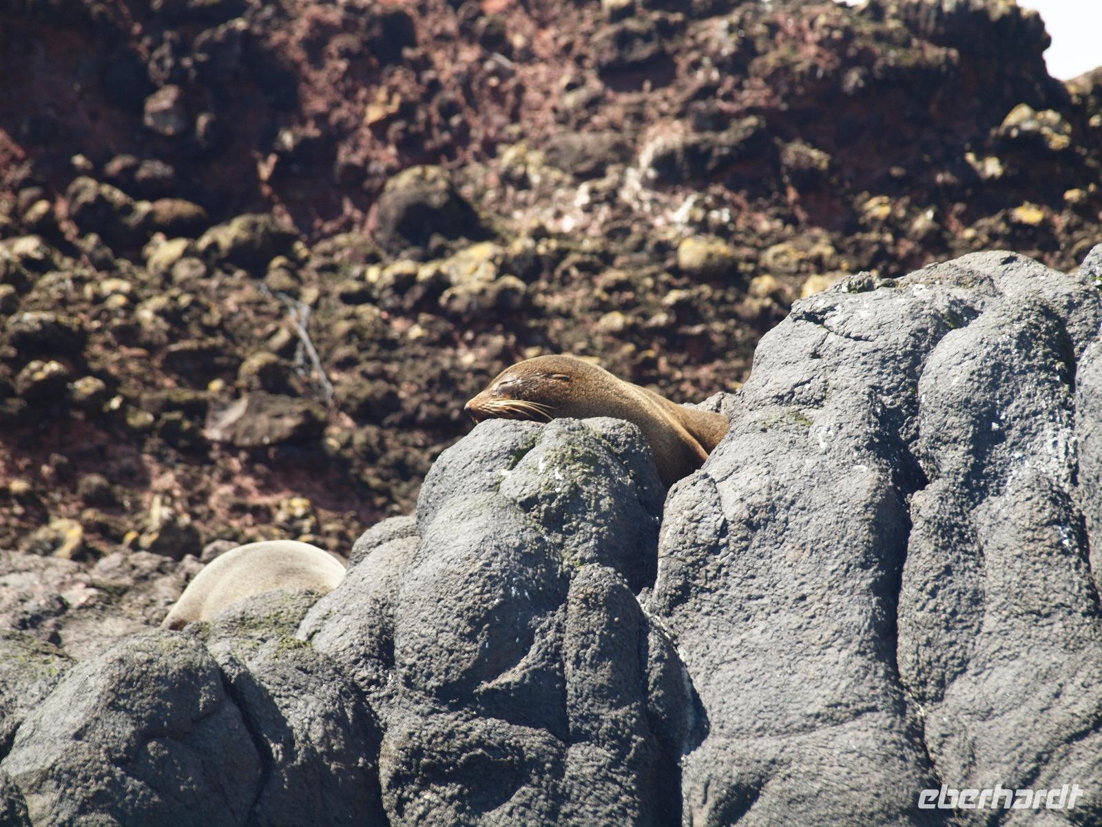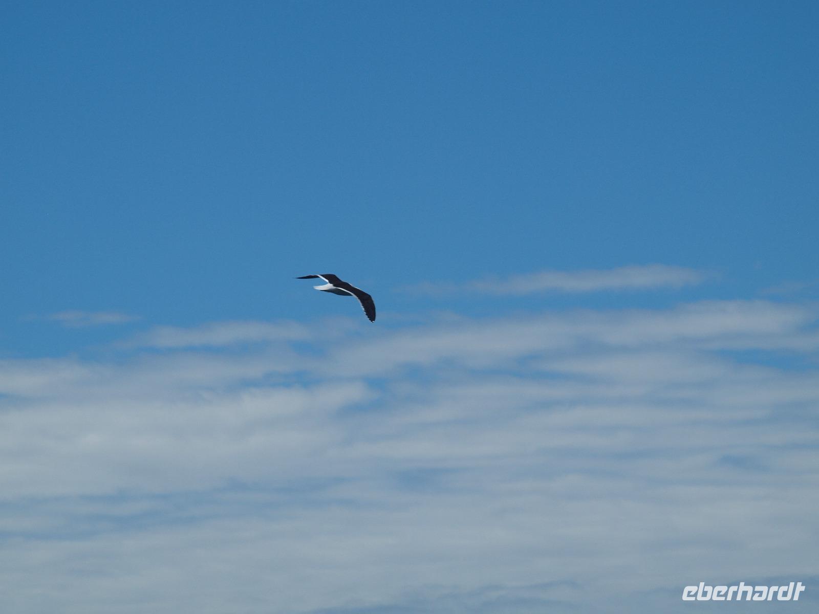 Nach dem Besuch der Pinguine fahren wir nur wenige Meter wieder die Strecke die wir gekommen sind zurück und gehen an Bord der Monarch. Das kleine Boot bringt uns hinaus auf die weite See. Ziel dieser Unternehmung ist es, den großen Königsalbatrossen etwas näher zu kommen. Natürlich sehen wir auch wieder ein paar Seelöwen, die sich genüsslich in der Sonne ausruhen. Unser Skipper Buddy nimmt dann Kurs auf einen im Wasser schwimmenden Albatros und versucht mit uns so nah wie möglich an ihn heranzukommen, doch dieser entscheidet sich lieber für die Flucht und fliegt davon. Während Buddy weiter nach den großen Vögeln Ausschau hält entdeckt sein Kollege Jürgen ein paar kleine Blaupinguine im Wasser. Die kleinen Kerlchen sind anscheinend dabei sich ihre Fische fürs Mittagsessen zu fangen. Und wieder nimmt Buddy Kurs auf einen Albatros. Zwischendurch kreuzen auch ein paar andere Seevögel unseren Weg, wie zum Beispiel die allgemein gut bekannte Seemöwe. Und gerade als wir uns auf den Rückweg machen wollen fliegt doch tatsächlich noch ein Königsalbatros an uns vorbei, Glück gehabt! Auf dem Weg zur Anlegestelle fahren wir auch wieder an den steilen Felswänden vorbei. Hier haben sich inzwischen auch drei Albatrosse niedergelassen, ein weiteres Mal Glück gehabt!