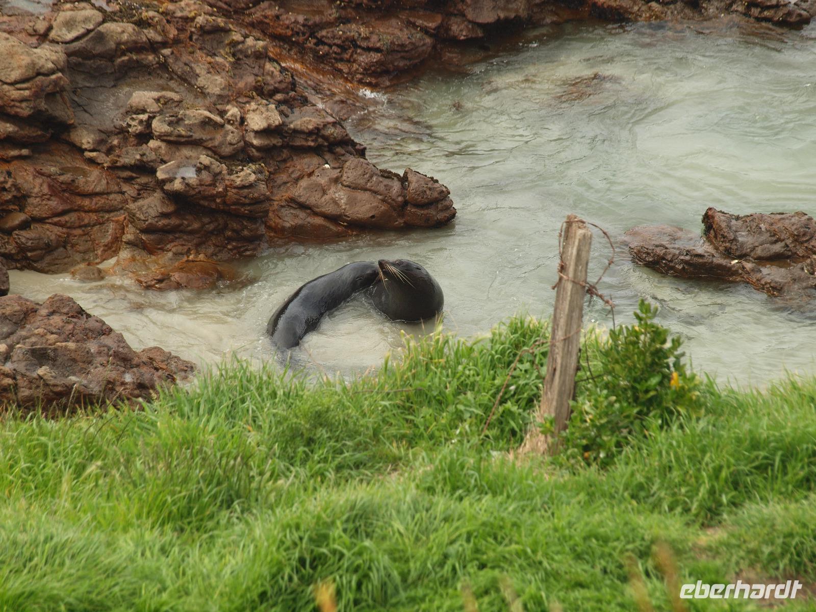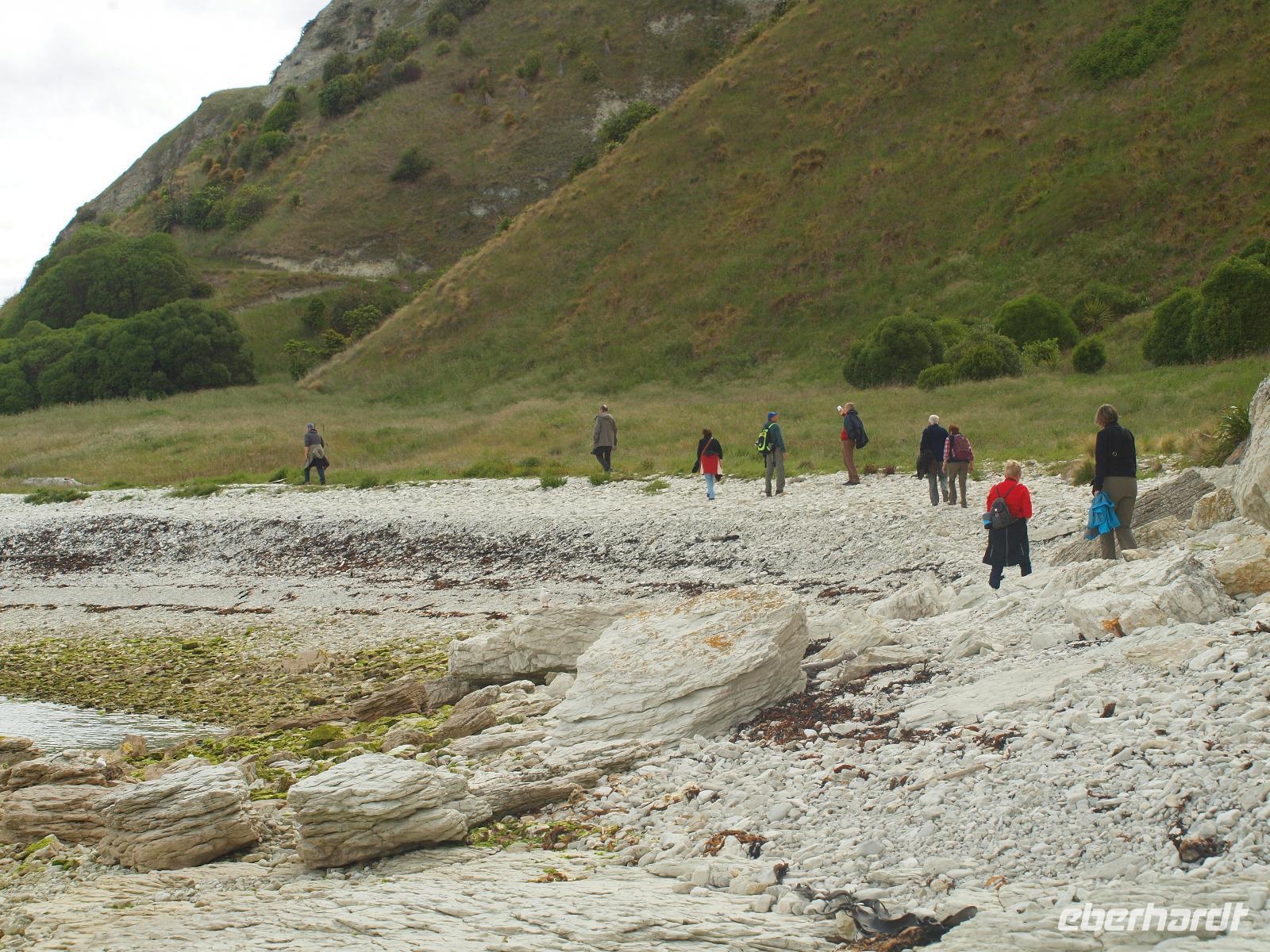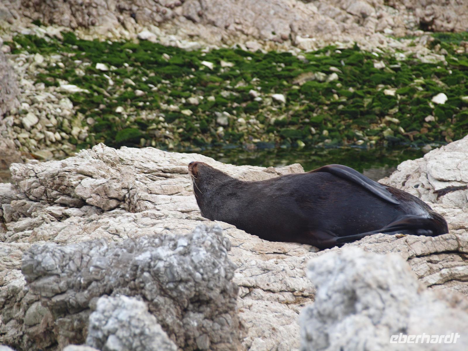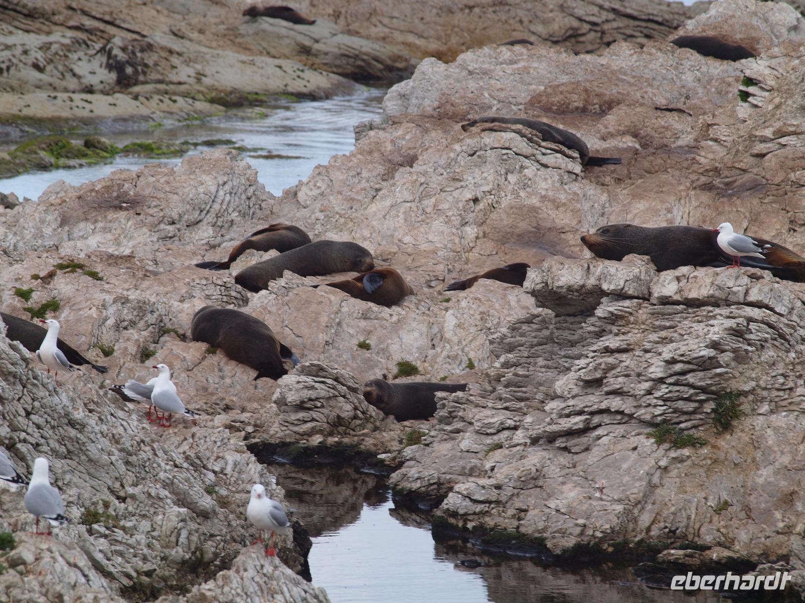 Nach dem Frühstück fahren wir am Tekapo entlang und halten an der Kirche zum guten Hirten. Sie ist die erste Kirche der Region (Mackenzie Ebene) und wurde 1935 errichtet. Wir können von außen sehen, dass in ihr kein großer Altar ist, dafür aber eben ein großes Fenster, wodurch wir hineinsehen können. Dieses Fenster lässt regelmäßig die Blicke der Kirchgänger über den Tekapo und die Alpen schweifen. Die Mackenzie Region wurde nach einem schottischen Schafsdieb benannt, der einst in den Bergen sein Unwesen trieb. Wie Hans aber sagte, war dieser arme Kerl nur zum falschen Zeitpunkt am falschen Ort und wurde von zwei anderen Gaunern reingelegt. Über den Burkes Pass fahren wir in Richtung Osten, zurück in die Nähe der Ostküste, aber wir bleiben weit im Landesinneren. Die Reise führt uns durch die kleinen Städte Fairlie, Geraldine, Mount Somers und Mount Hutt, bis nach Windwhistle und Oxford. Hier halten wir auch kurz für eine Pause. Doch unser Tagesziel liegt noch ein paar Kilometer weiter nödlich und so fahren wir schnell weiter. Kurz nach der Stadt Rangiora sehen wir die Küste wieder etwas näher kommen, wir sind nun wieder oberhalb von Christchurch an der Pegasus Bay. Von hier geht es nun immer an der Küste entlang in Richtung Kaikoura. Die Straße schlängelt sich regelrecht die Küste entlang. Wir haben noch den ganzen Nachmittag Zeit als wir in Kaikoura ankommen und damit wir nicht nur den Tag im Bus verbracht haben schlägt Hans eine Wanderung entlang der Halbinsel von Kaikoura vor. Am Point Kean Aussichtspunkt herrscht Ebbe und wir können über die Felsen am Meer entlang wandern, manchmal müssen wir auch etwas klettern. Unterwegs sehen wir eine riesige Seemöwen Kolonie und natürlich auch viele junge Seelöwen. Wir sind hier in einem Naturschutzgebiet und dürfen den Tieren nicht zu nahe kommen, was gar nicht so leicht ist, wenn diese direkt neben dem Weg liegen ;)