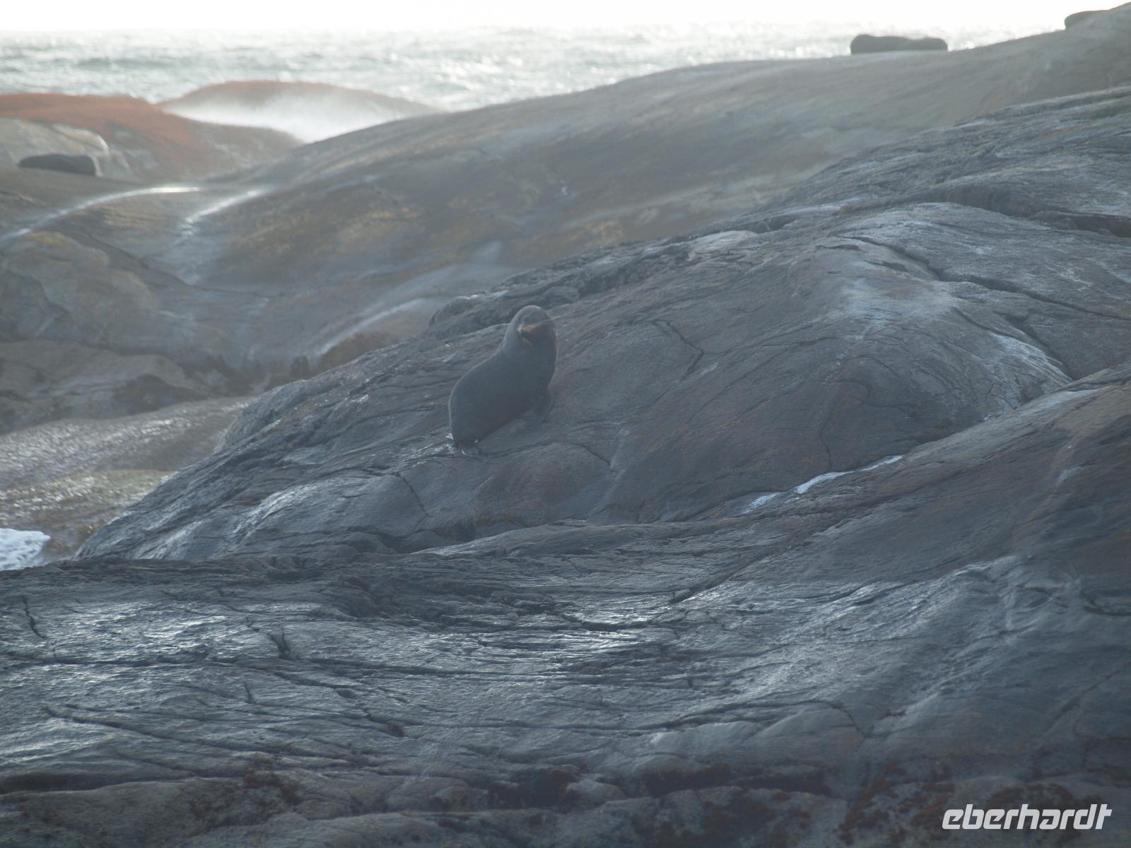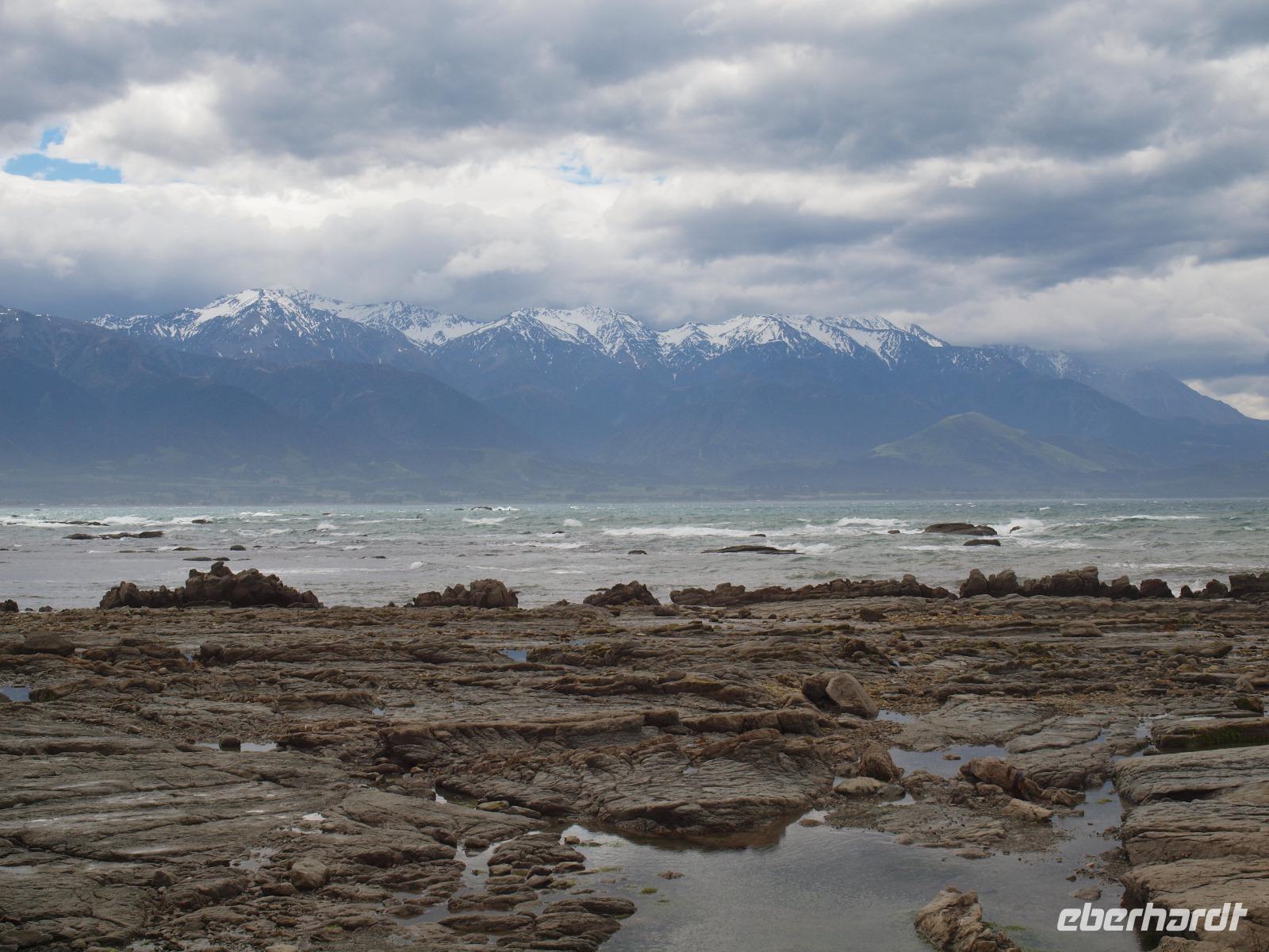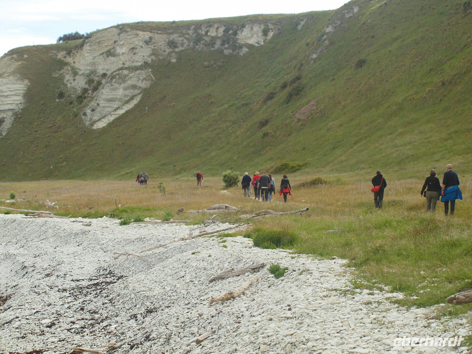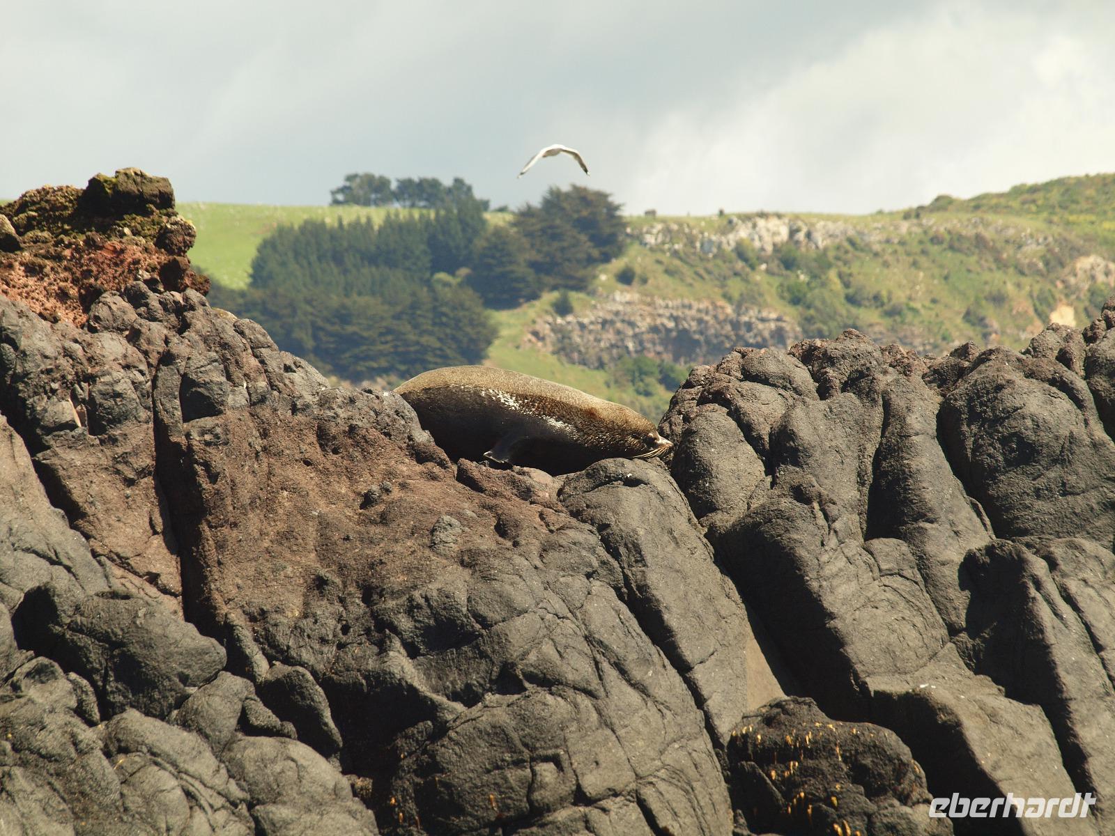 Nach dem Frühstück fahren wir am Tekapo entlang und halten an der Kirche zum guten Hirten. Sie ist die erste Kirche der Region (Mackenzie Ebene) und wurde 1935 errichtet. Wir können von außen sehen, dass in ihr kein großer Altar ist, dafür aber eben ein großes Fenster, wodurch wir hineinsehen können. Dieses Fenster lässt regelmäßig die Blicke der Kirchgänger über den Tekapo und die Alpen schweifen. Die Mackenzie Region wurde nach einem schottischen Schafsdieb benannt, der einst in den Bergen sein Unwesen trieb. Wie Hans aber sagte, war dieser arme Kerl nur zum falschen Zeitpunkt am falschen Ort und wurde von zwei anderen Gaunern reingelegt. Über den Burkes Pass fahren wir in Richtung Osten, zurück in die Nähe der Ostküste, aber wir bleiben weit im Landesinneren. Die Reise führt uns durch die kleinen Städte Fairlie, Geraldine, Mount Somers und Mount Hutt, bis nach Windwhistle und Oxford. Hier halten wir auch kurz für eine Pause. Doch unser Tagesziel liegt noch ein paar Kilometer weiter nödlich und so fahren wir schnell weiter. Kurz nach der Stadt Rangiora sehen wir die Küste wieder etwas näher kommen, wir sind nun wieder oberhalb von Christchurch an der Pegasus Bay. Von hier geht es nun immer an der Küste entlang in Richtung Kaikoura. Die Straße schlängelt sich regelrecht die Küste entlang. Wir haben noch den ganzen Nachmittag Zeit als wir in Kaikoura ankommen und damit wir nicht nur den Tag im Bus verbracht haben schlägt Hans eine Wanderung entlang der Halbinsel von Kaikoura vor. Am Point Kean Aussichtspunkt herrscht Ebbe und wir können über die Felsen am Meer entlang wandern, manchmal müssen wir auch etwas klettern. Unterwegs sehen wir eine riesige Seemöwen Kolonie und natürlich auch viele junge Seelöwen. Wir sind hier in einem Naturschutzgebiet und dürfen den Tieren nicht zu nahe kommen, was gar nicht so leicht ist, wenn diese direkt neben dem Weg liegen ;)