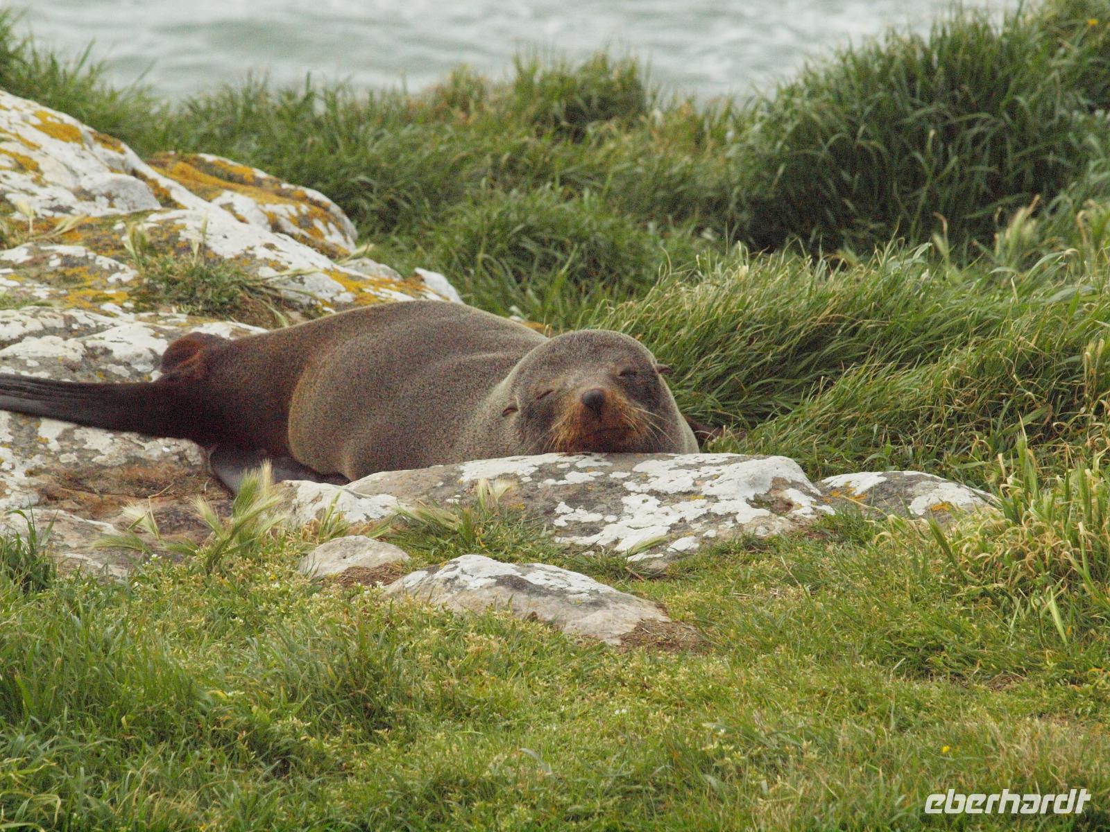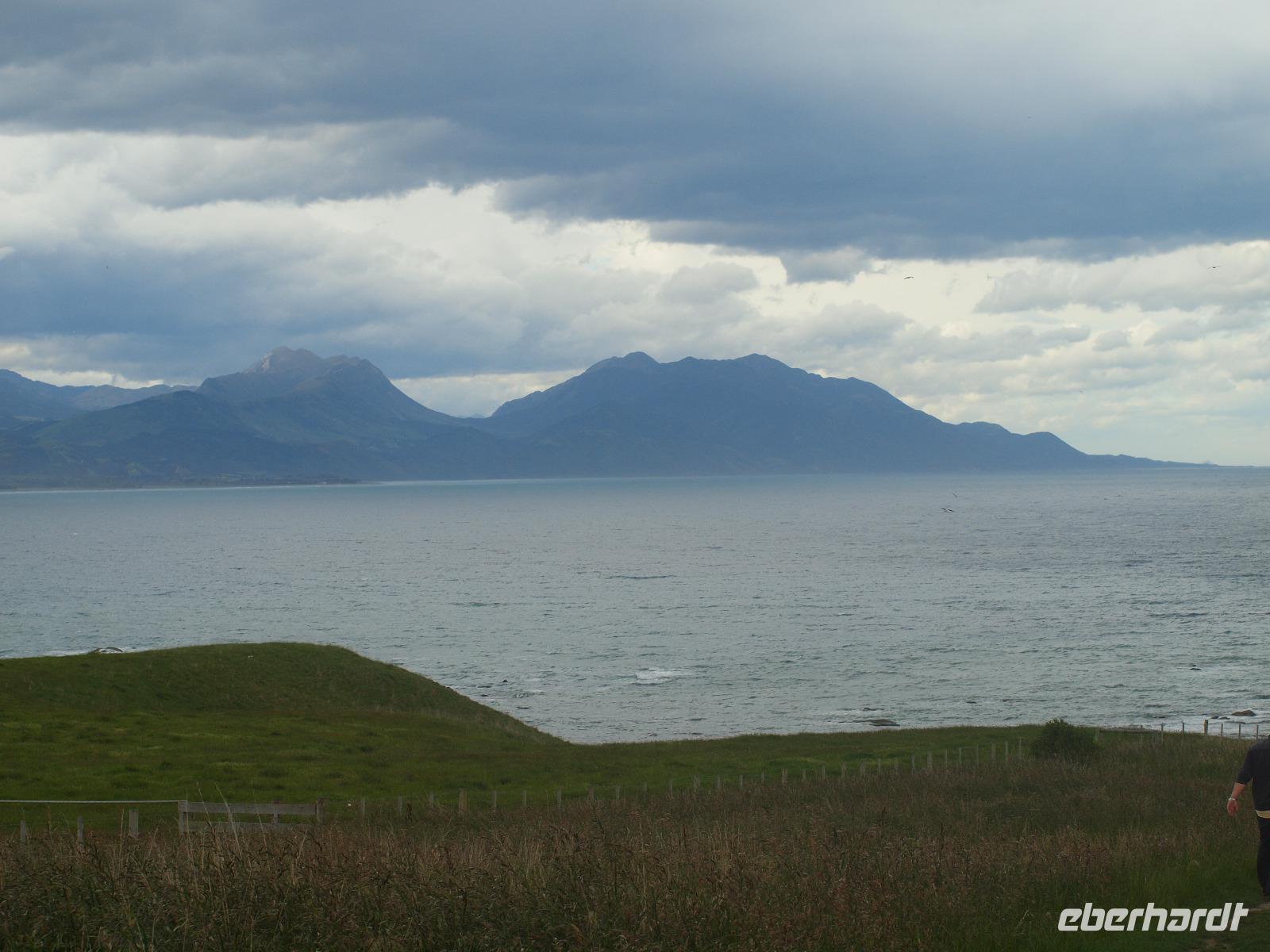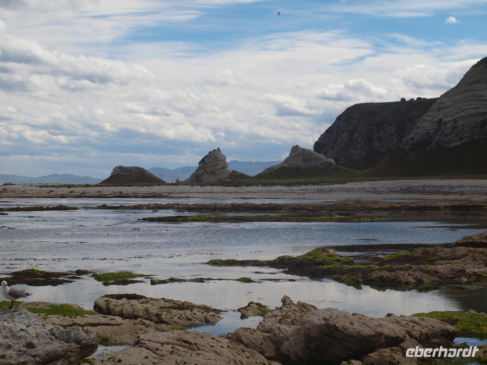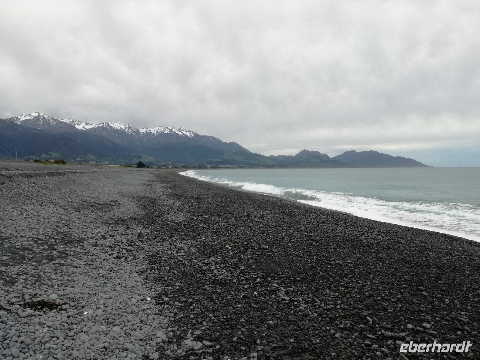 Nach dem Frühstück fahren wir am Tekapo entlang und halten an der Kirche zum guten Hirten. Sie ist die erste Kirche der Region (Mackenzie Ebene) und wurde 1935 errichtet. Wir können von außen sehen, dass in ihr kein großer Altar ist, dafür aber eben ein großes Fenster, wodurch wir hineinsehen können. Dieses Fenster lässt regelmäßig die Blicke der Kirchgänger über den Tekapo und die Alpen schweifen. Die Mackenzie Region wurde nach einem schottischen Schafsdieb benannt, der einst in den Bergen sein Unwesen trieb. Wie Hans aber sagte, war dieser arme Kerl nur zum falschen Zeitpunkt am falschen Ort und wurde von zwei anderen Gaunern reingelegt. Über den Burkes Pass fahren wir in Richtung Osten, zurück in die Nähe der Ostküste, aber wir bleiben weit im Landesinneren. Die Reise führt uns durch die kleinen Städte Fairlie, Geraldine, Mount Somers und Mount Hutt, bis nach Windwhistle und Oxford. Hier halten wir auch kurz für eine Pause. Doch unser Tagesziel liegt noch ein paar Kilometer weiter nödlich und so fahren wir schnell weiter. Kurz nach der Stadt Rangiora sehen wir die Küste wieder etwas näher kommen, wir sind nun wieder oberhalb von Christchurch an der Pegasus Bay. Von hier geht es nun immer an der Küste entlang in Richtung Kaikoura. Die Straße schlängelt sich regelrecht die Küste entlang. Wir haben noch den ganzen Nachmittag Zeit als wir in Kaikoura ankommen und damit wir nicht nur den Tag im Bus verbracht haben schlägt Hans eine Wanderung entlang der Halbinsel von Kaikoura vor. Am Point Kean Aussichtspunkt herrscht Ebbe und wir können über die Felsen am Meer entlang wandern, manchmal müssen wir auch etwas klettern. Unterwegs sehen wir eine riesige Seemöwen Kolonie und natürlich auch viele junge Seelöwen. Wir sind hier in einem Naturschutzgebiet und dürfen den Tieren nicht zu nahe kommen, was gar nicht so leicht ist, wenn diese direkt neben dem Weg liegen ;)