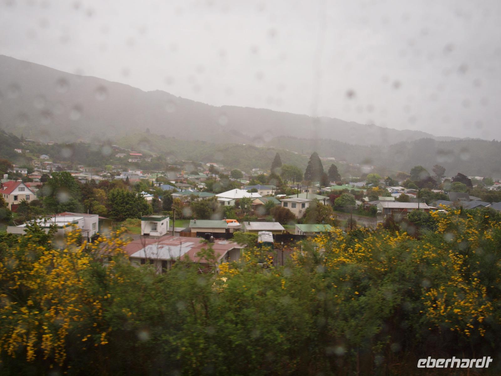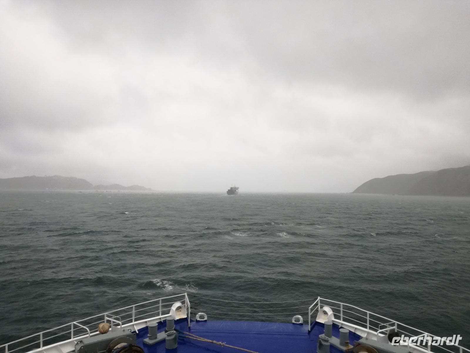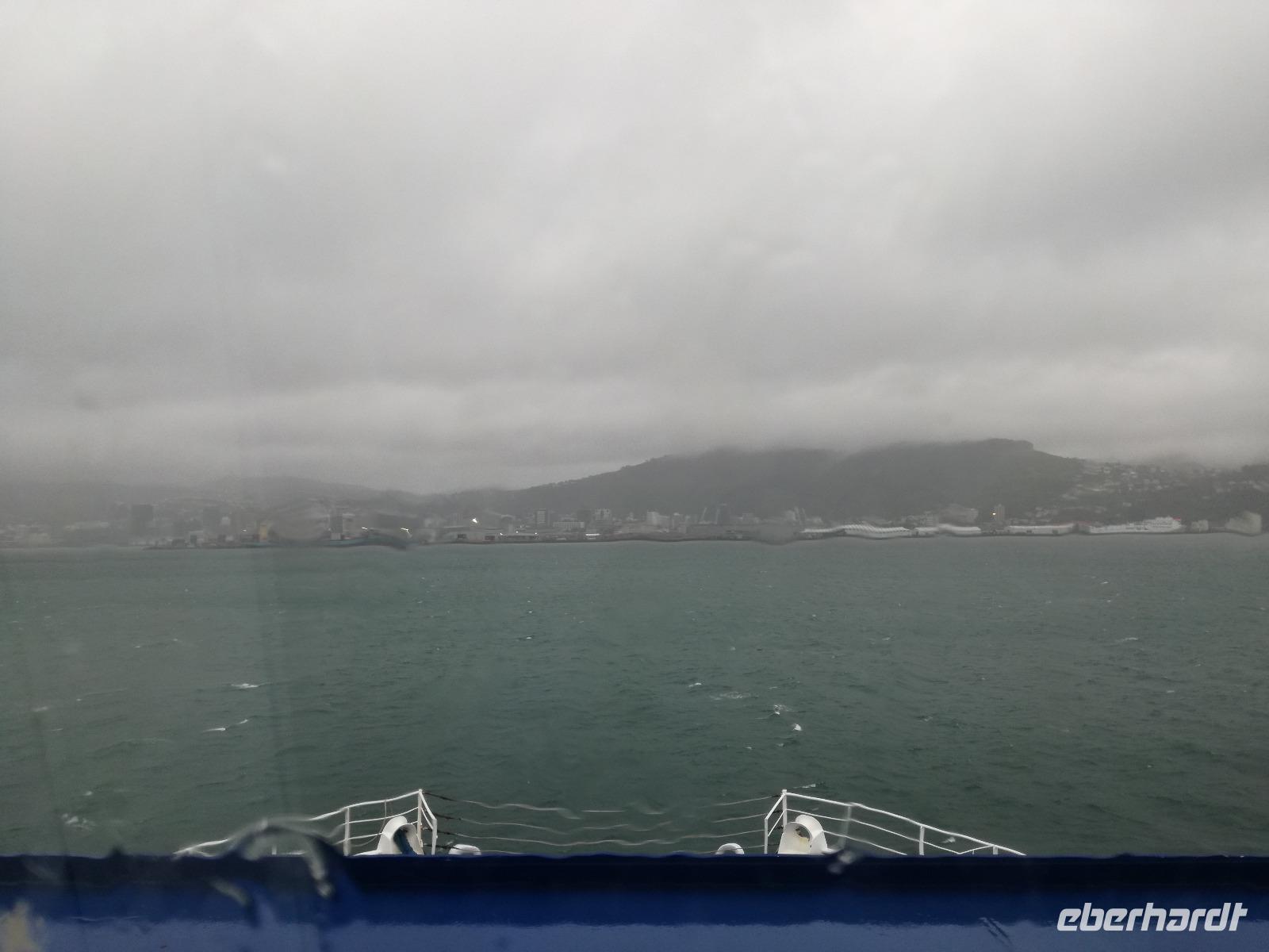 Heute müssen wir uns schon von Maxine und der Südinsel verabschieden. Am Bahnhof von Kaikoura fließen Abschiedstränen, so groß wie der Pazifische Ozean, naja zumindest fast! Und ganz getreu dem Klischee über die Deutschen Touristen sind wir natürlich früher am Bahnhof. So können wir aber auch die Minuten, die bis zur Abfahrt bleiben noch am Strand oder in dem kleinen Souveniraden am Bahnhof verbringen. Auch fast pünktlich fährt dann der Zug auch im Bahnhof ein. Unsere Koffer werden mit einem lilafarbenen Schild versehen, dieses soll den Kofferträgern am Bahnhof in Picton signalisieren, dass die Koffer weiter nach Wellington auf die Fähre müssen. Unsere Sitzplätze im Zug sind bereits reserviert worden und so steht einer gemütlichen Reise nichts mehr Wege, nicht einmal die Schulklassen bringen uns heute aus der Ruhe. Versorgt werden wir im Zug auch, wenn wir das wollen, das Bordrestaurant bietet für jeden Geschmack etwas. So verfliegt die Zeit sehr schnell und auch wenn der Regen uns die Gelegenheit auf schöne Bilder während der Fahrt verwehrt, so können wir die Panoramafahrt entlang der Küste und durch Weinanbaugebiete doch genießen. Nach gut zweieinhalb Stunden erreichen wir Picton. Leider regnet es immer noch sehr stark und wir bleiben bis zur Abfahrt der Fähre im Terminal. Die Schulklassen sind auch wie wir auf dem Weg nach Wellington und einige von ihnen versüßen uns die Wartezeit. Zweimal singen die Kinder eines Schulchores Lieder auf Maori. Ein wirklich toller Moment! Kurz darauf werden wir zum Boarding gebeten. Auf der Fähre verteilt sich Menge recht schnell und so verbringen wir die Zeit auf der Fähre entweder mit Lesen, Essen, Schlafen oder dem Versuch doch noch ein paar Fotos zu machen. Die Überfahrt ist recht ruhig, die See meint es gut mit uns, doch leider ist eben alles trüb und grau in grau. Am Abend, nach ca. vier Stunden Fährüberfahrt erreichen wir dann Wellington. Auch unsere Koffer haben es bis hier her unbeschadet geschafft und werden freudig von uns am Gepäckband wieder aufgenommen. Am Fährenterminal wartet auch schon unser neuer Bus mit neuem Fahrer, Phil verlädt unsere Koffer und fährt uns dann ins Hotel, hier verbringen wir dann auch den Rest des Abends.
