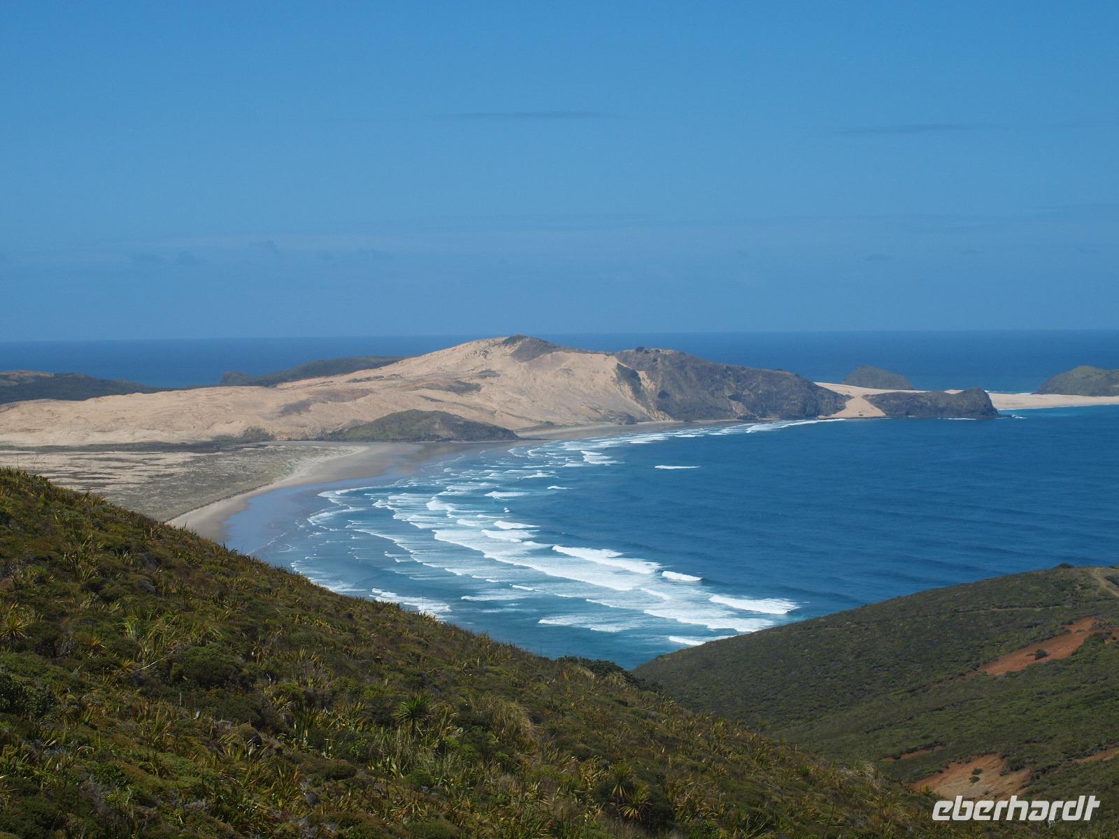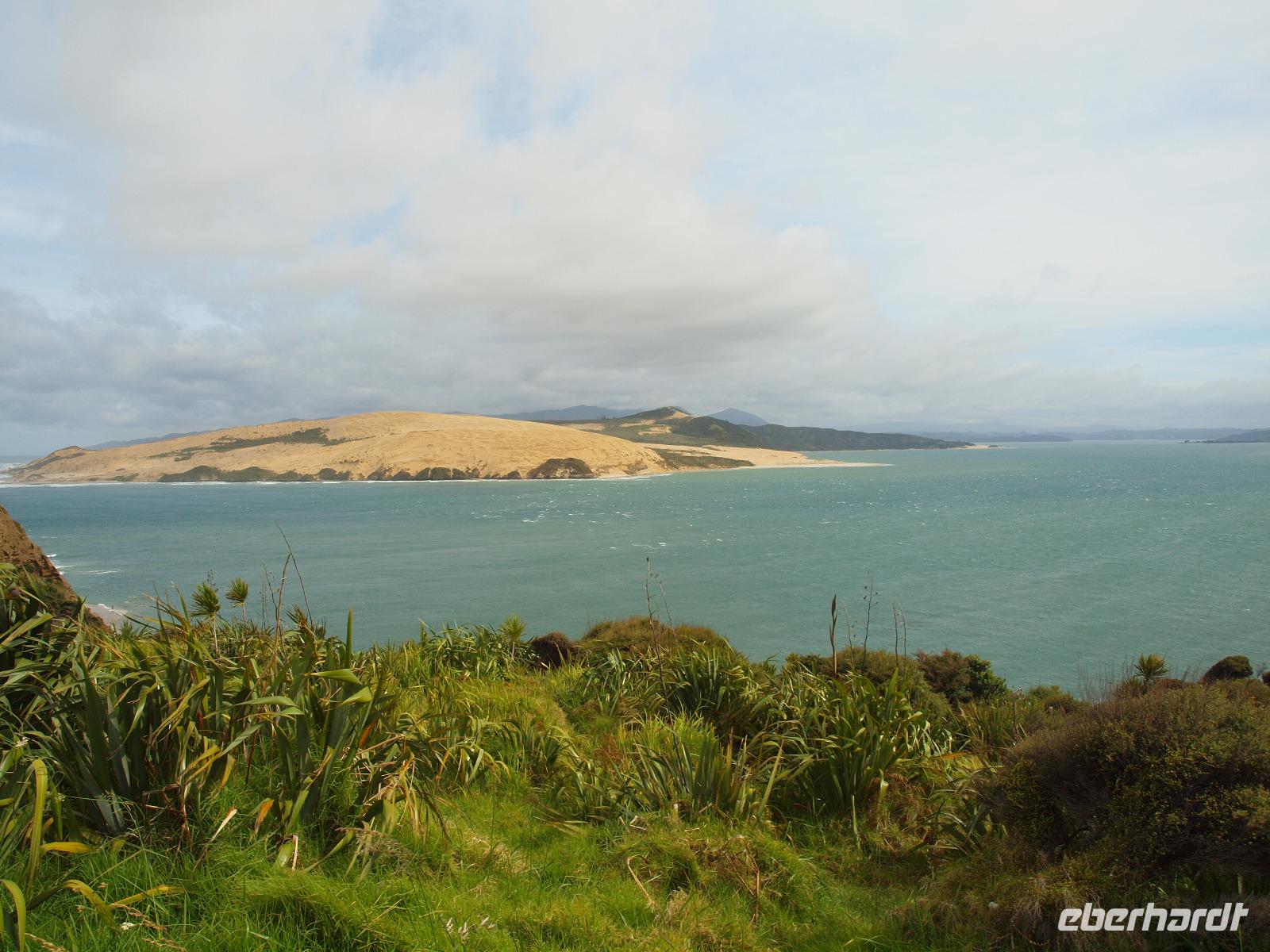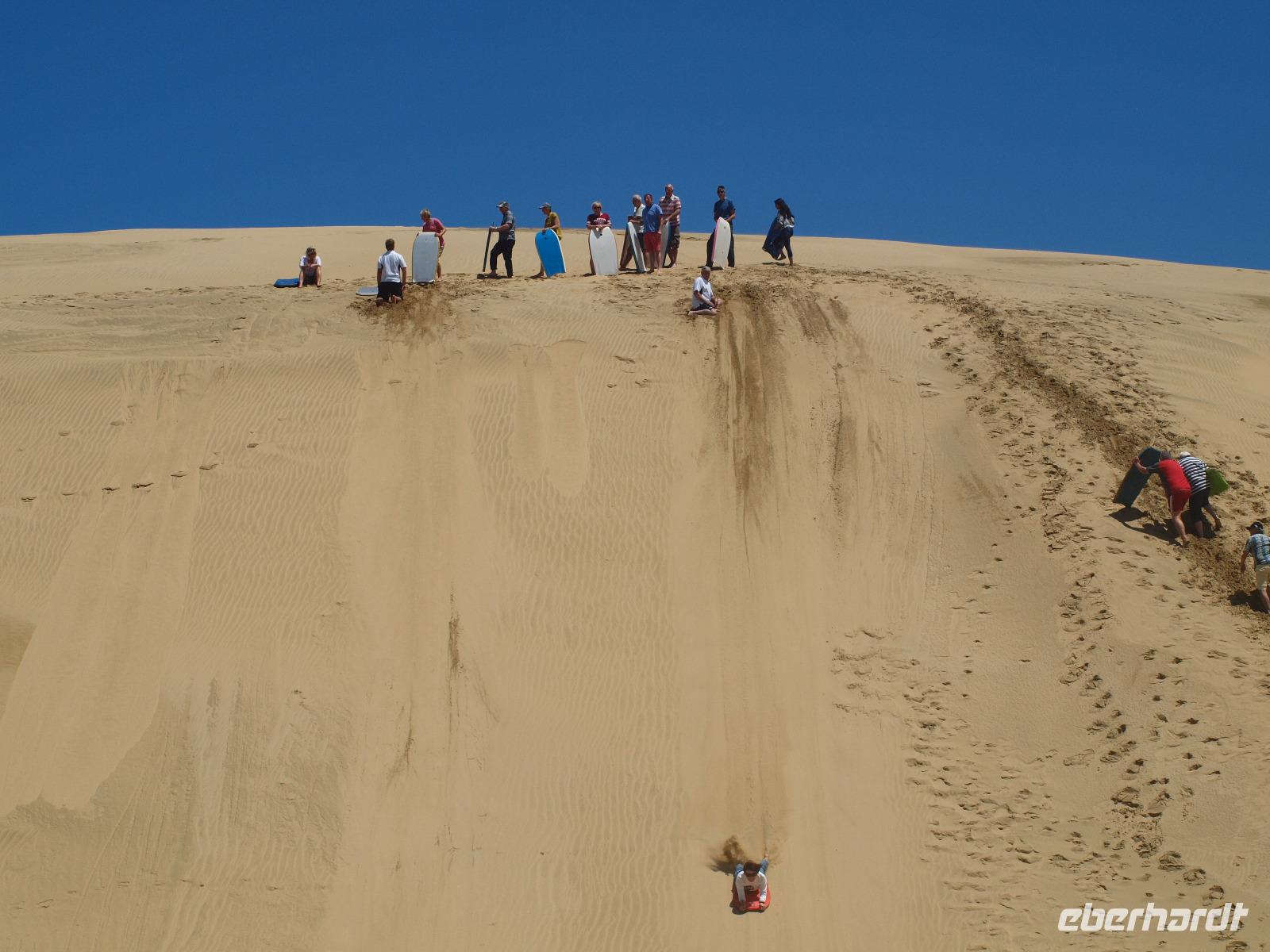 Für die Ausflügler beginnt der Tag schon sehr früh. Wir werden von Roger abgeholt, er ist für heute unser Driverguide und wird uns den ganzen Tag über begleiten. Nach einer ausgiebigen Einsammelrunde anderer Fahrgäste und Ausflugsteilnehmer starten wir in Richtung Norden. InTaipa legen wir eine kleine Pause ein, verlieren aber keine Zeit und zügig geht es weiter. Da der Tag sehr viel zu bieten hat, die Strecke aber sehr weit ist, haben wir nicht immer so viel Zeit, wie wir es gern hätten, aber mit der Zeit gewöhnen wir uns daran. Nach knapp zwei Stunden Fahrt erreichen wir dann endlich das Cape Reinga. Am Kap treffen der Pazifische Ozean im Osten und die Tasmansee im Westen zusammen. Entgegen vieler Aussagen erklärt uns Roder, dass das Cape Reinga der nordwestlichste Punkt Neuseelands ist. Das North Cape, etwa 30 Kilometer weiter östlich ist der nördlichste Punkt des Landes. Etwa 10 Kilometer westlich befindet sich das Cape Maria van Diemen, gut erkennbar durch einen kleinen Leuchtturm. Vor allem aber für die Maori hat das Kap eine besondere Bedeutung... Von hier aus, so sagt man, starten die Seelen der Toten den langen Weg zurück nach Hawaiki, in die Heimat ihrer Vorfahren. An der Spitze befindet sich ein Leuchtturm, der wohl am meisten fotografierte Neuseelands. Wir gehen den Weg nicht bis ganz hinunter, nur so weit um ungestört auf einer Anhöhe schöne Fotos zu bekommen. Nach dem Spaziergang treffen wir uns wieder am Bus und fahren die Strecke, die wir gekommen sind, zurück. Irgendwann fahren wir dann über eine Schotterpiste zu den naheliegenden Wanderdünen. Sie sind bis zu 50 Meter hoch und die somit die größten des Landes. Roger zeigt uns hier die beste Art und Weise diese Dünen zu nutzen. Wir schnappen und aus dem Kofferraum ein kleines Surfbrett und klettern damit die Düne hinauf. Und ehe ich mich versehe bin ich die Erste dort oben... Und dann geht es auch schon los, mit Vollgas rodelt/surft man die Düne hinunter... Wer zu schnell ist, wird nass, wer zu langsam ist hat keinen Spaß... spätestens nach dem dritten Mal hat man den Dreh raus ;)