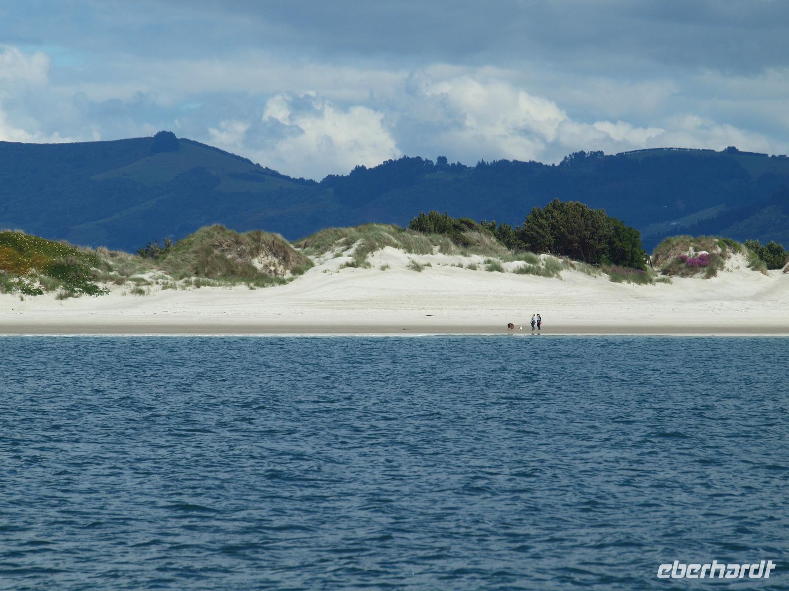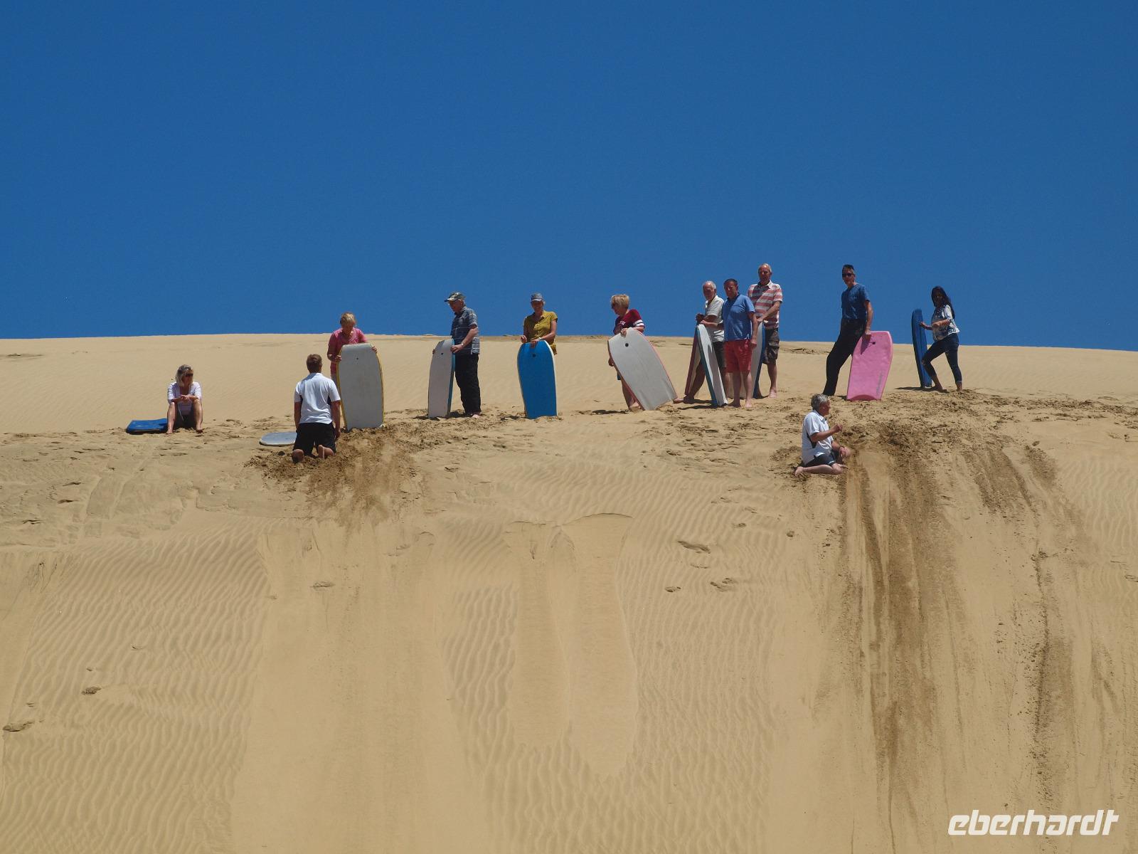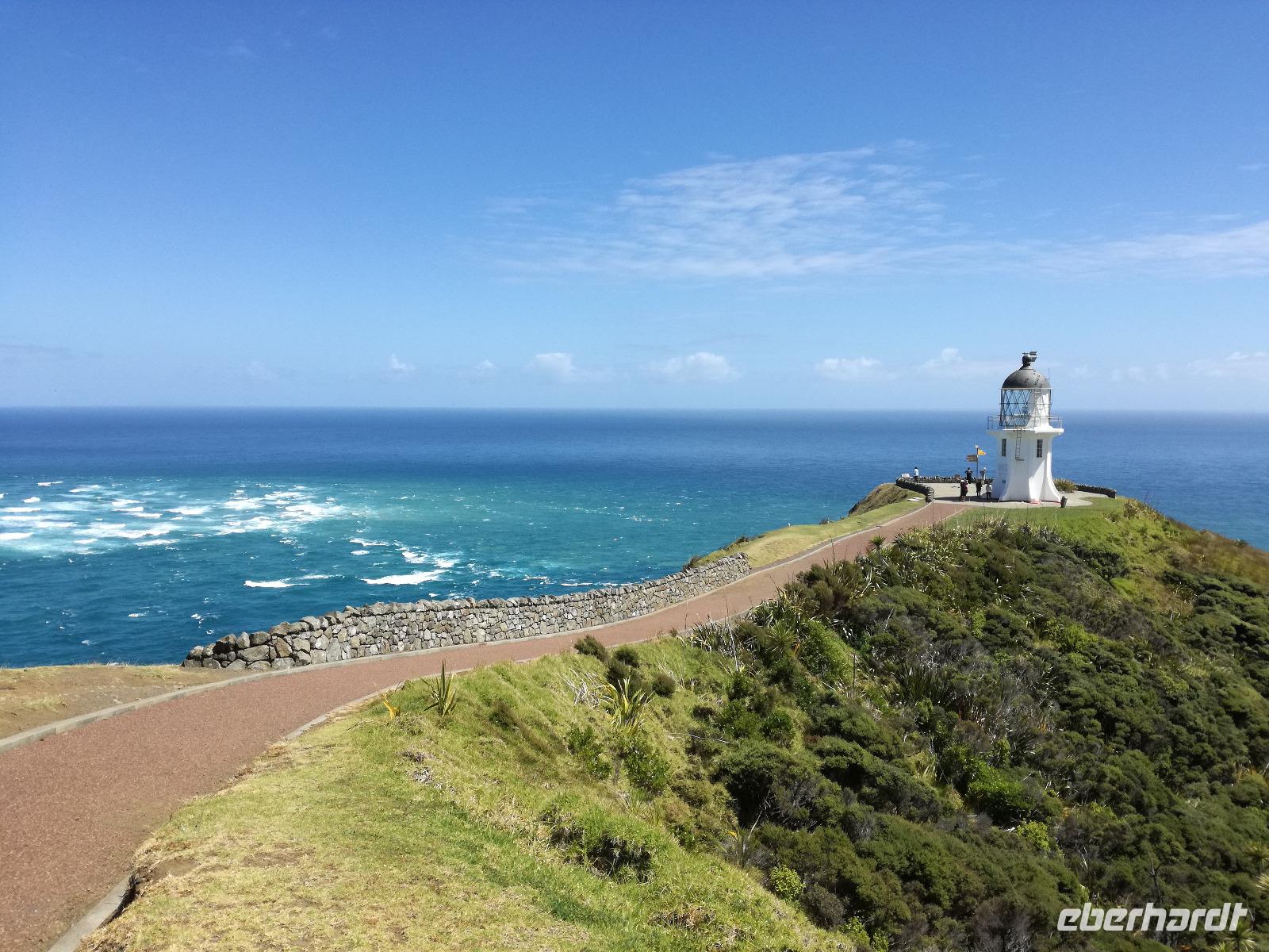 Für die Ausflügler beginnt der Tag schon sehr früh. Wir werden von Roger abgeholt, er ist für heute unser Driverguide und wird uns den ganzen Tag über begleiten. Nach einer ausgiebigen Einsammelrunde anderer Fahrgäste und Ausflugsteilnehmer starten wir in Richtung Norden. InTaipa legen wir eine kleine Pause ein, verlieren aber keine Zeit und zügig geht es weiter. Da der Tag sehr viel zu bieten hat, die Strecke aber sehr weit ist, haben wir nicht immer so viel Zeit, wie wir es gern hätten, aber mit der Zeit gewöhnen wir uns daran. Nach knapp zwei Stunden Fahrt erreichen wir dann endlich das Cape Reinga. Am Kap treffen der Pazifische Ozean im Osten und die Tasmansee im Westen zusammen. Entgegen vieler Aussagen erklärt uns Roder, dass das Cape Reinga der nordwestlichste Punkt Neuseelands ist. Das North Cape, etwa 30 Kilometer weiter östlich ist der nördlichste Punkt des Landes. Etwa 10 Kilometer westlich befindet sich das Cape Maria van Diemen, gut erkennbar durch einen kleinen Leuchtturm. Vor allem aber für die Maori hat das Kap eine besondere Bedeutung... Von hier aus, so sagt man, starten die Seelen der Toten den langen Weg zurück nach Hawaiki, in die Heimat ihrer Vorfahren. An der Spitze befindet sich ein Leuchtturm, der wohl am meisten fotografierte Neuseelands. Wir gehen den Weg nicht bis ganz hinunter, nur so weit um ungestört auf einer Anhöhe schöne Fotos zu bekommen. Nach dem Spaziergang treffen wir uns wieder am Bus und fahren die Strecke, die wir gekommen sind, zurück. Irgendwann fahren wir dann über eine Schotterpiste zu den naheliegenden Wanderdünen. Sie sind bis zu 50 Meter hoch und die somit die größten des Landes. Roger zeigt uns hier die beste Art und Weise diese Dünen zu nutzen. Wir schnappen und aus dem Kofferraum ein kleines Surfbrett und klettern damit die Düne hinauf. Und ehe ich mich versehe bin ich die Erste dort oben... Und dann geht es auch schon los, mit Vollgas rodelt/surft man die Düne hinunter... Wer zu schnell ist, wird nass, wer zu langsam ist hat keinen Spaß... spätestens nach dem dritten Mal hat man den Dreh raus ;)
