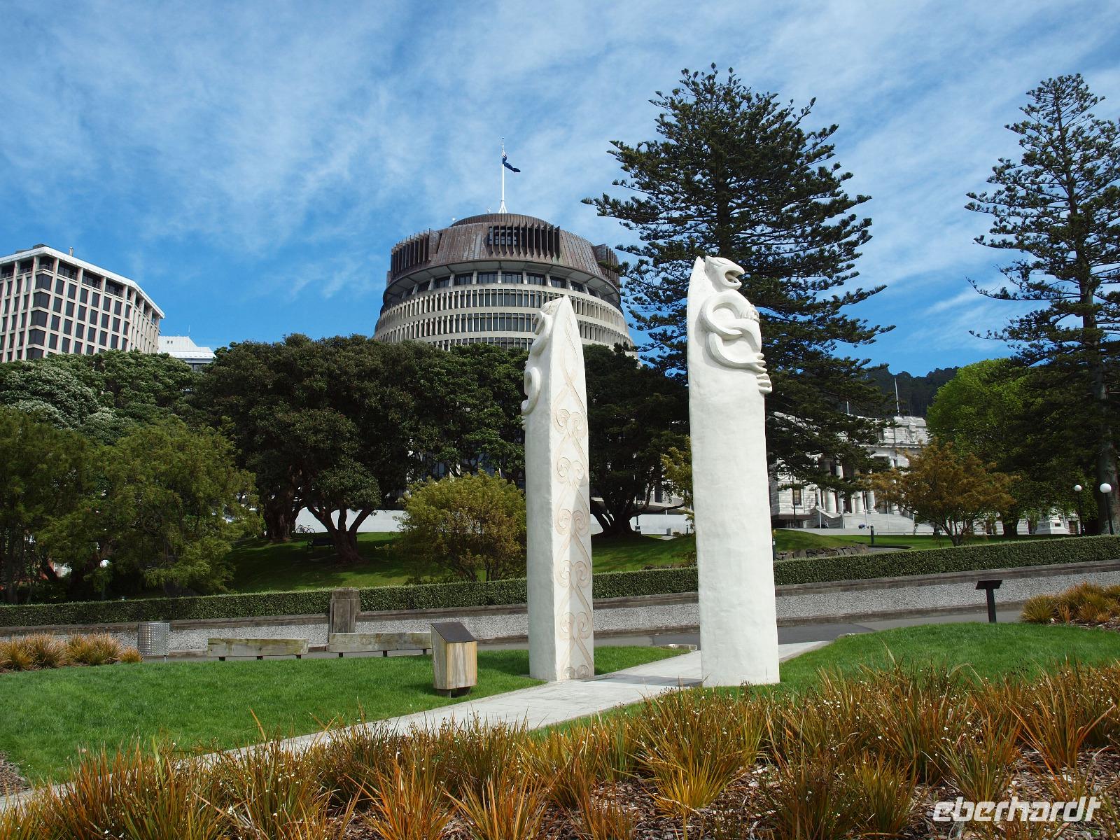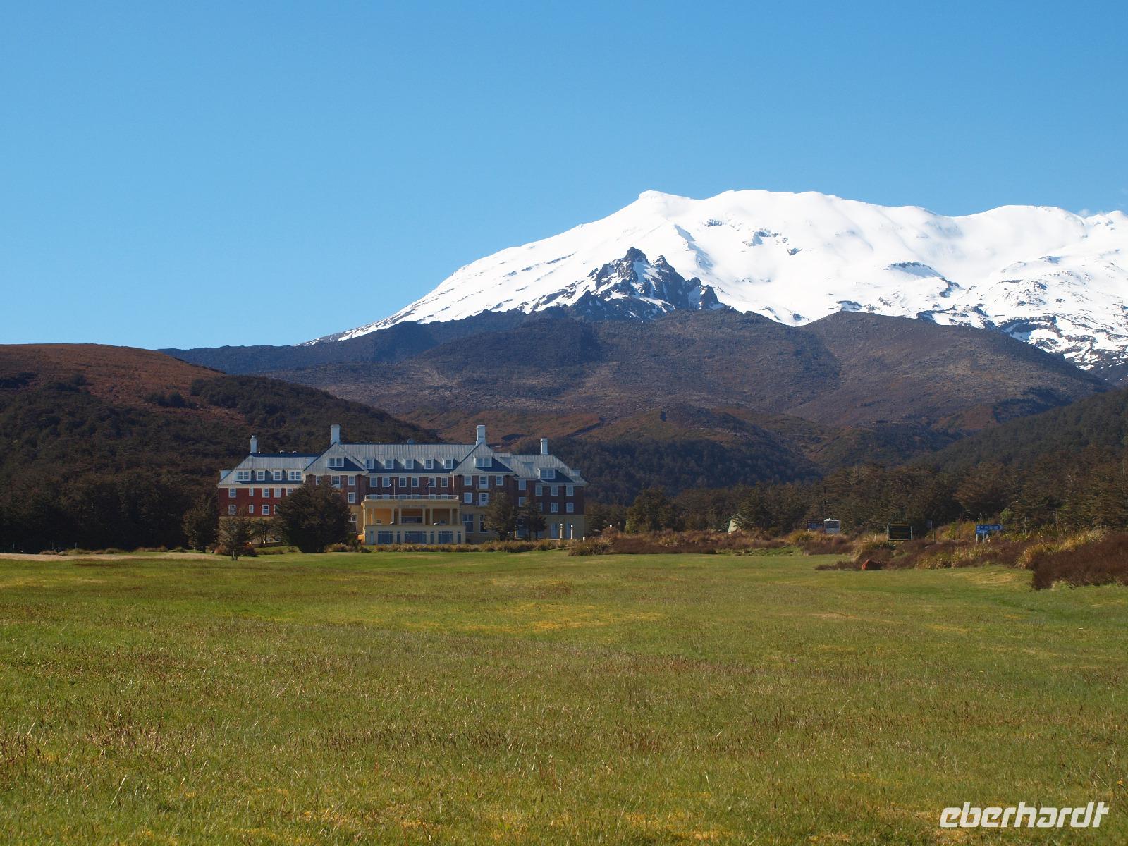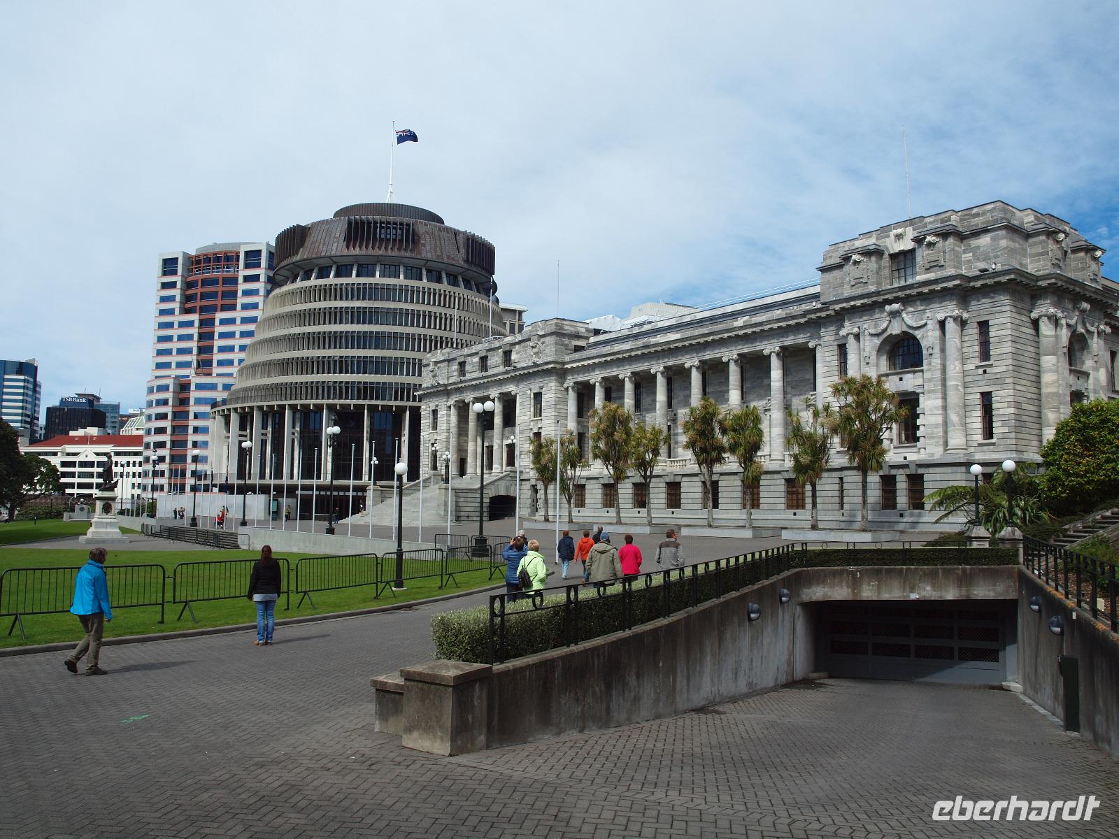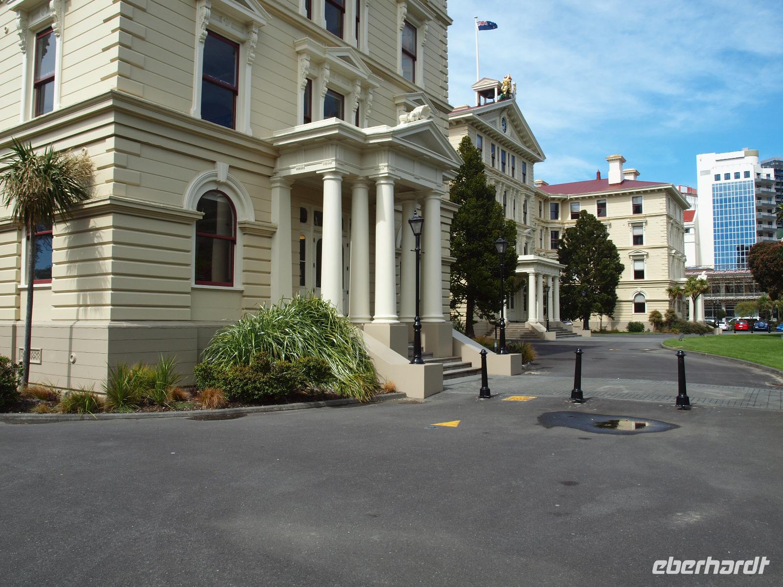 Den heutigen Vormittag verbringen wir in der Hauptstadt von Neuseeland. Um uns einen besseren Überblick über die Stadt zu verschaffen fahren wir zuerst, heute zum Glück auch bei strahlendem Sonnenschein, auf den Mount Victoria. Von hier oben sehen wir die ganze Stadt mit Hafen, die umliegenden Buchten und den Flughafen, eingebettet von grünen Hügeln. Wellington (Maori: Te Whanga-nui-a-Tara) ist zusammen mit angrenzenden Städten nach Auckland der zweitgrößte Ballungsraum des Landes. Die Maori-Bezeichnung Te Whanganui-a-Tara bezieht sich auf den angrenzenden Hafen von und bedeutet übersetzt „Der große Hafen des Tara". Trotz Sonnenschein spüren wir aber auch den Wind, der Wellington seinen Spitznamen „Windy Welly" verleiht. Wie fahren nun wieder zurück ins Zentrum, durch die Hauptstraßen der Stadt, vorbei an Wolkenkratzern und Einkaufspassagen. Unser nächster Halt ist das Regierungsviertel, gut erkennbar durch das Regierungsgebäude, den Bienenstock. Gleich nebenan das ältere Parlamentsgebäude. Durch einen kleinen Park führt uns der Weg zum „Old Gouvernement Building", es ist das größte Holzgebäude der Südhalbkugel und dient heute der Universität als juristische Fakultät. Das Gebäude steht Besuchern offen und so können wir einen Blick in dieses altehrwürdige Gebäude werfen. Einige Räume sind für die Besucher extra hergerichtet und so bekommen wir einen guten Einblick, wie es wohl früher ausgesehen hat, als hier noch Politik gemacht wurde. Nach der Besichtigung fahren wir zum Nationalmuseum Te Papa (Der Ort der Schätze dieses Landes). Im Museum wird auf sechs Ebenen Neuseeland von vielseitigen Aspekten beleuchtet. Insbesondere wird die Entwicklung von den ersten Besiedlungen an bis zum heutigen modernen Staat dargestellt. Wir haben genug Freizeit um einige der Ausstellungsräume anzuschauen. Oder man nutzt die Zeit um in der Innenstadt noch etwas durch die Straßen zu bummeln und vielleicht an der Waterfront ein Restaurant fürs Mittagessen zu finden. Nach der Pause treffen wir uns vor dem Te Papa wieder um unsere Reise in nach Norden fortzusetzen. Es dauert eine Weile bis wir die Stadtgrenzen hinter uns lassen und uns wieder in der Natur befinden. Wir fahren entlang der Westküste, vorbei an Kapiti Island, einem Vogelschutzgebiet und Heimat für eine Vielzahl einheimischer Vögel, unter anderen auch einige Arten der seltenen Kiwivögel. Kurz darauf erreichen wir Levin für eine kleine Pause. Weiter geht es und unser nächster Stopp ist in der kleinen Stadt Bulls. Hier macht man immer wieder kleine Wortwitze mit dem Namen der Stadt. Auch die Briefkästen, die in Neuseeland ja generell ulkig sind, sind Milchkannen. Von Bulls aus biegen wir dann an der Gabelung links ab, Richtung Hunterville, Taihape und Waiouru. Das Landschaftsbild verändert sich schlagartig als wir in der Weite den schneebedeckten Vulkan Ruapehu sehen. Er ist über die grünen Hügel und Wiesen gut zu erkennen und gibt ein nahezu perfektes Foto ab. Als wir immer näher kommen machen wir auch einen Fotostopp an der Straße. Alle Blicke sind auf den Ruapehu gerichtet, doch einer von uns hat auch den Blick für die Umgebung und erspäht doch tatsächlich, wenn auch nur ganz leicht, die Silhouetten des Vulkan Taranaki. Ganz allein steht er im Dunst, nur ca. 100 Kilometer entfernt. Warum er nicht mit den anderen Vulkanen im Zentrum der Nordinsel steht, werden wir morgen erfahren. Am frühen Abend erreichen wir die kleine Stadt Ohakune und übernachten etwas außerhalb des Zentrums, am Fuße des Vulkans. Bis zum Abendessen bleiben uns noch ein paar Momente für einen Abendspaziergang oder die Chance auf ein entspannendes Bad im beheizten Whirlpool.