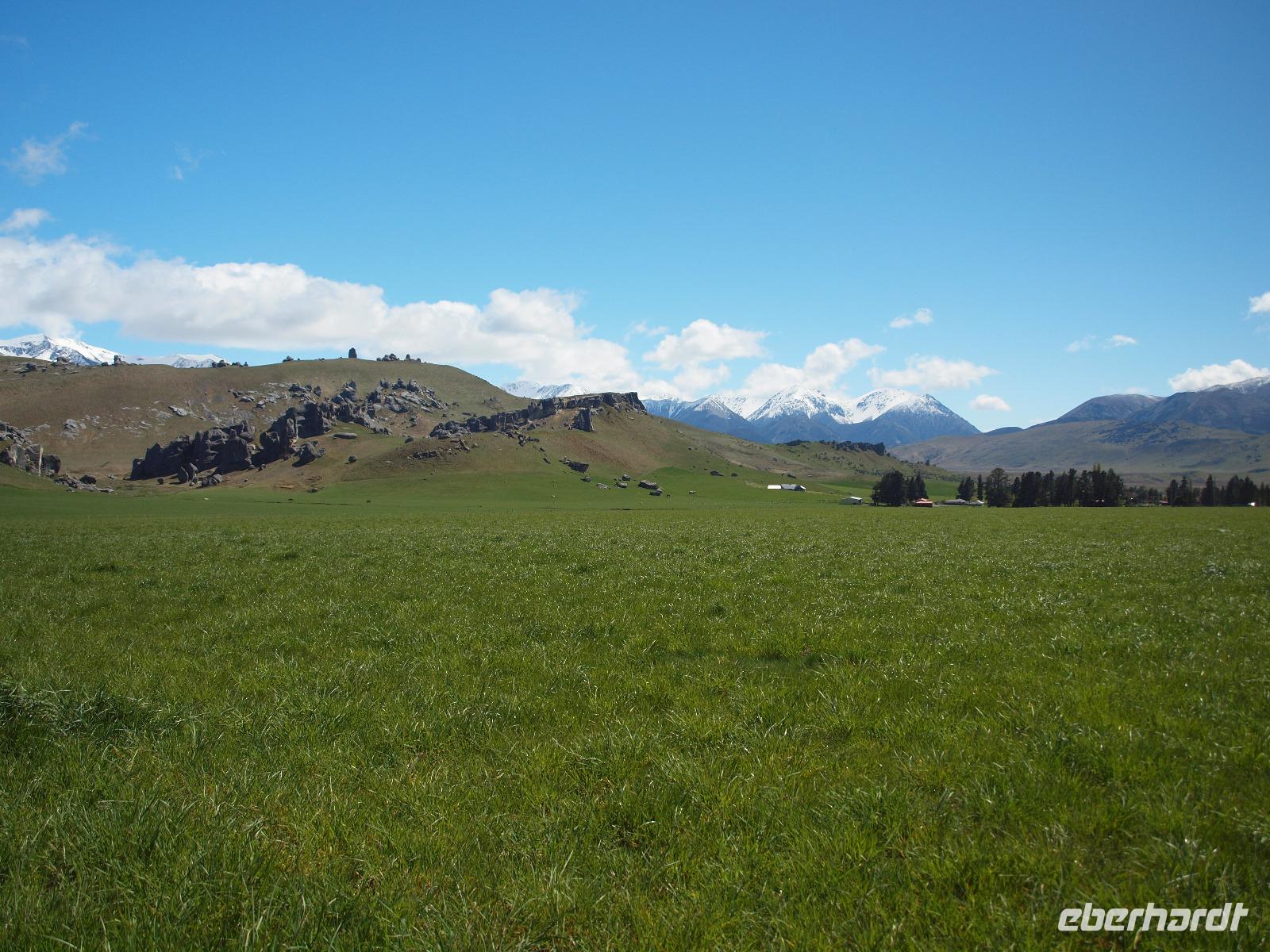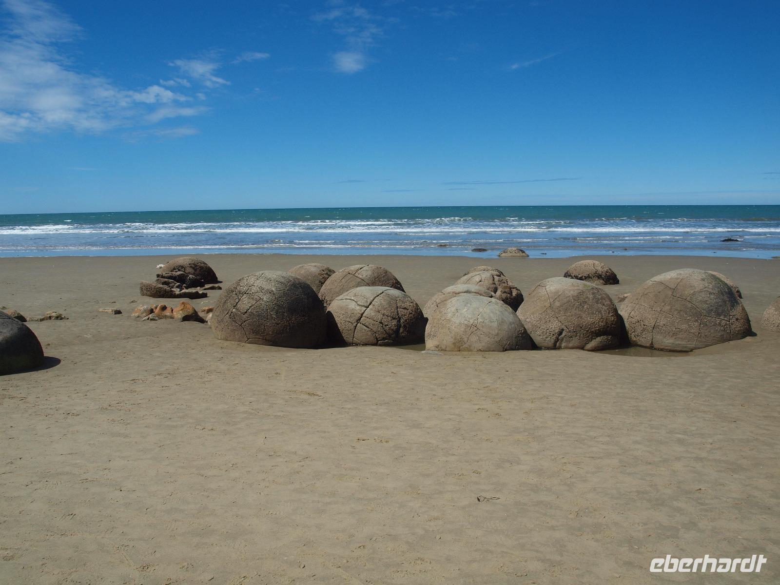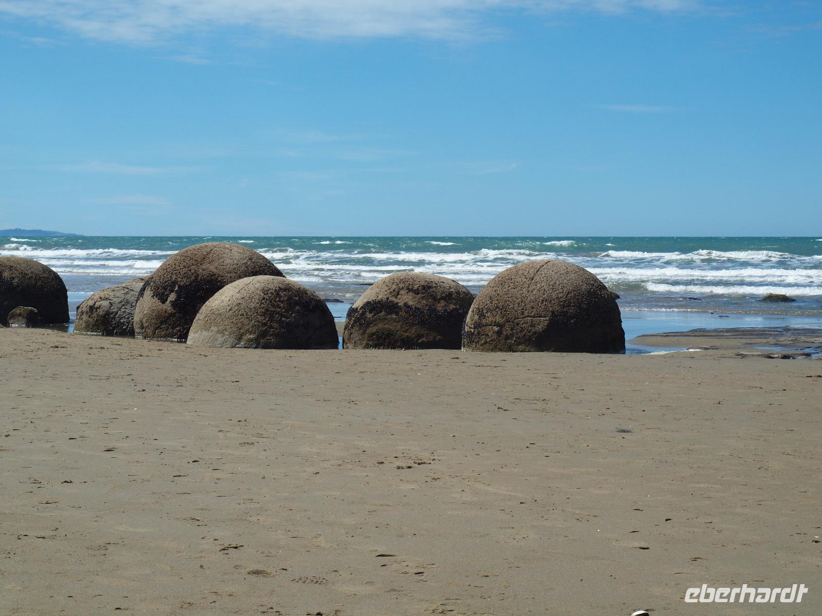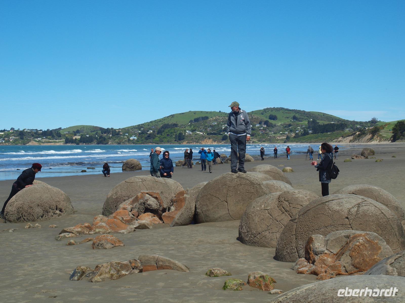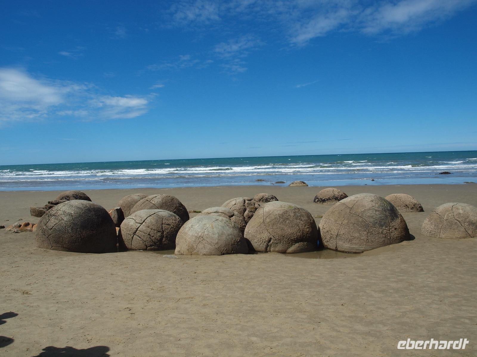 Zurück an Land müssen wir uns dann aber von Dunedin verabschieden und fahren in Richtung Norden weiter. Unsere Route führt uns etwas abseits der Küste entlang und unser nächster Stopp sind die Moeraki Boulders. Die Geschichten um diese runden Felskugeln sind so zahlreich wie die Fotos die von ihnen gemacht werden. Von Dinosauriereiern, über Reste von Kürbissen und Kumaras der Vorfahren der Maori die ihnen aus ihrem Kanu herausgefallen sind, bis hin zur tatsächlich erwiesenen wissenschaftlichen Entstehung durch Erosion. Eins steht jedenfalls fest, ein tolles Fotomotiv sind sie!