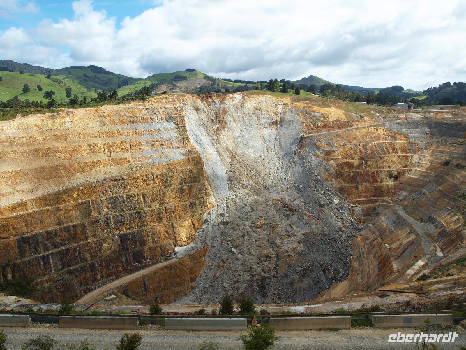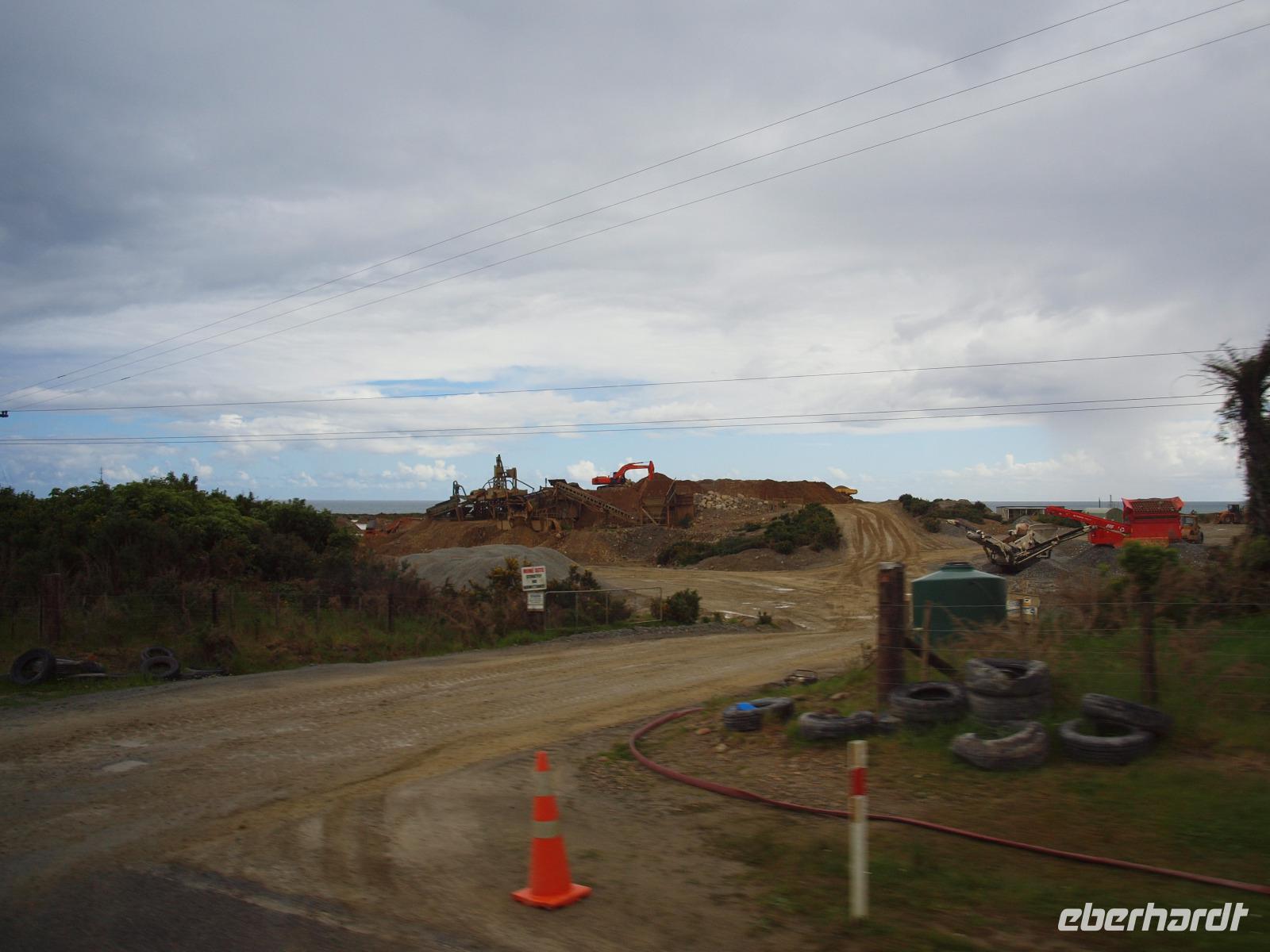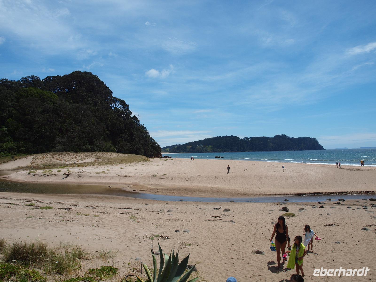 Nach unserer Nacht auf dem Land und einen guten Frühstück mit unserer Gastfamilie müssen wir uns auch schon wieder auf den Weg zum Bus nach Cambridge machen. Wir verabschieden uns von unseren Gastgebern und werden von Ivan nach Cambridge gebracht. Alle anderen der Gruppe sind bereits am Bus und unterhalten sich noch ein bisschen mit ihren Gastgebern. Die anfängliche Skepsis wich einem strahlenden Lächeln, es scheint also allen gut ergangen zu sein. Unsere Reise führt uns heute wieder einmal quer über die Insel. Die Coromandel Halbinsel liegt an der Ostküste der Nordinsel. Das Gebiet lebt mittlerweile hauptsächlich vom Tourismus. Der Regenwald überzieht weite Teile des Inneren der Halbinsel, an der Küste befinden sich schöne Strände und beeindruckende Aussichtspunkte. Eben diese Strände sollen heute unser Ziel sein. Unterwegs jedoch halten wir noch an einer Goldgräberstadt, Waihi. Wir gehen hinauf zur Grube und müssen feststellen, dass hier eine Seite komplett verschüttet ist. Einige Arbeiter laufen die Hänge ab, ich nutze die Chance und stelle ein paar Frage zum Erdrutsch. Es war wohl ein Unfall, der Erdrutsch hat ca. ein Drittel der Grube verschüttet, aber verletzt wurde zum Glück niemand. Der Arbeiter erzählt uns auch, dass das Goldvorkommen sehr hoch ist und nur einige Kilometer außerhalb der Stadt eine zweite Grube gegraben wird. Irgendwann sollen dann beide durch Gänge miteinander verbunden werden. Ich bedanke mich für seine Auskünfte und gebe meine Informationen natürlich weiter. Von Waihi aus ist es nicht mehr weit bis zum Hot Water Beach. Hier beweisen Thermanlquellen direkt am Strand den vulkanischen Ursprung des Gebietes. Wasser mit 64 °C tritt aus zwei Quellen aus, die bei Ebbe etwa 2 Stunden lang zugänglich sind. Wir sehen noch ein paar Besucher wie sie eifrig Löcher in den Sand graben, aber die Flut kommt bereits zurück und gestaltet das entspannte Faullenzen in der natürlichen Badewanne etwas schwieriger. Wir genießen die Augenblicke am Strand und dehnen unseren Spaziergang so lange wie möglich aus. In einem kleinen Restaurant, unweit vom Strand, legen wir dann auch noch unser Mittagessen ein. Sonne, blauer Himmel, Strand - was will man mehr?