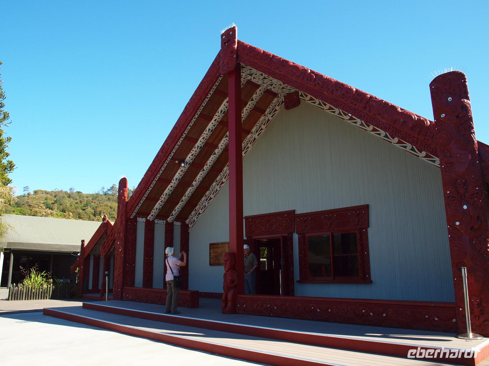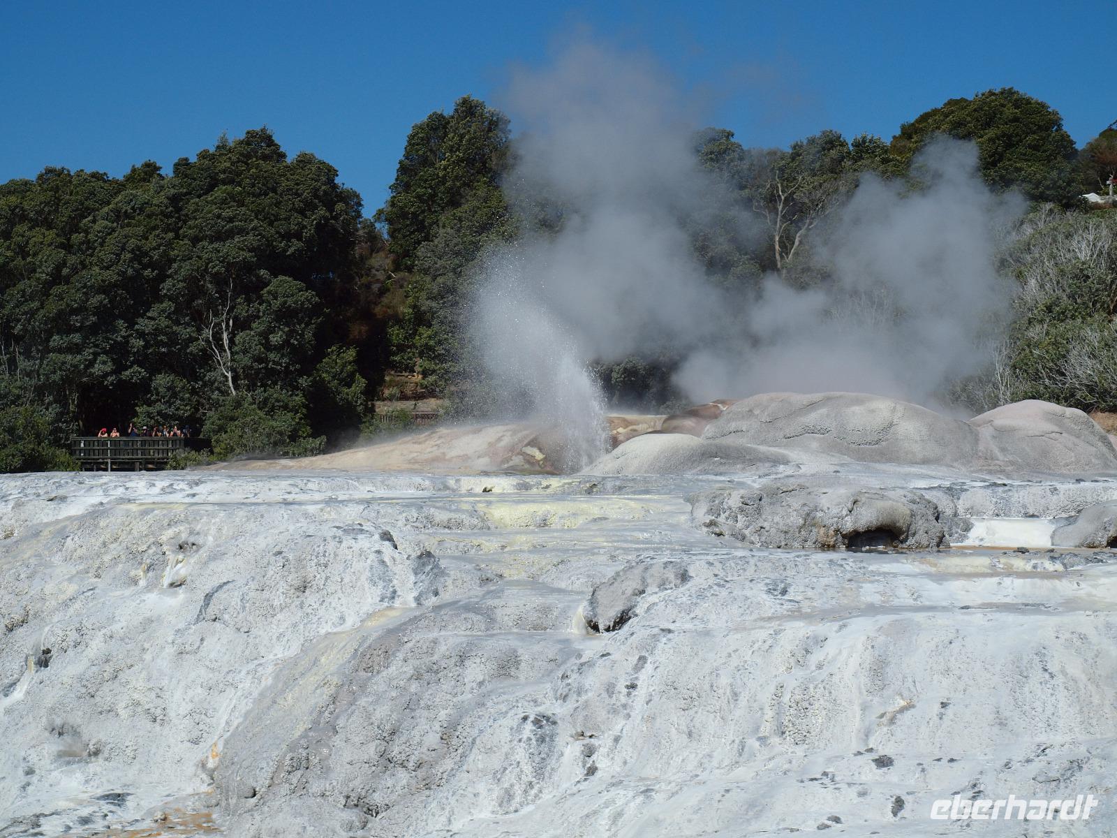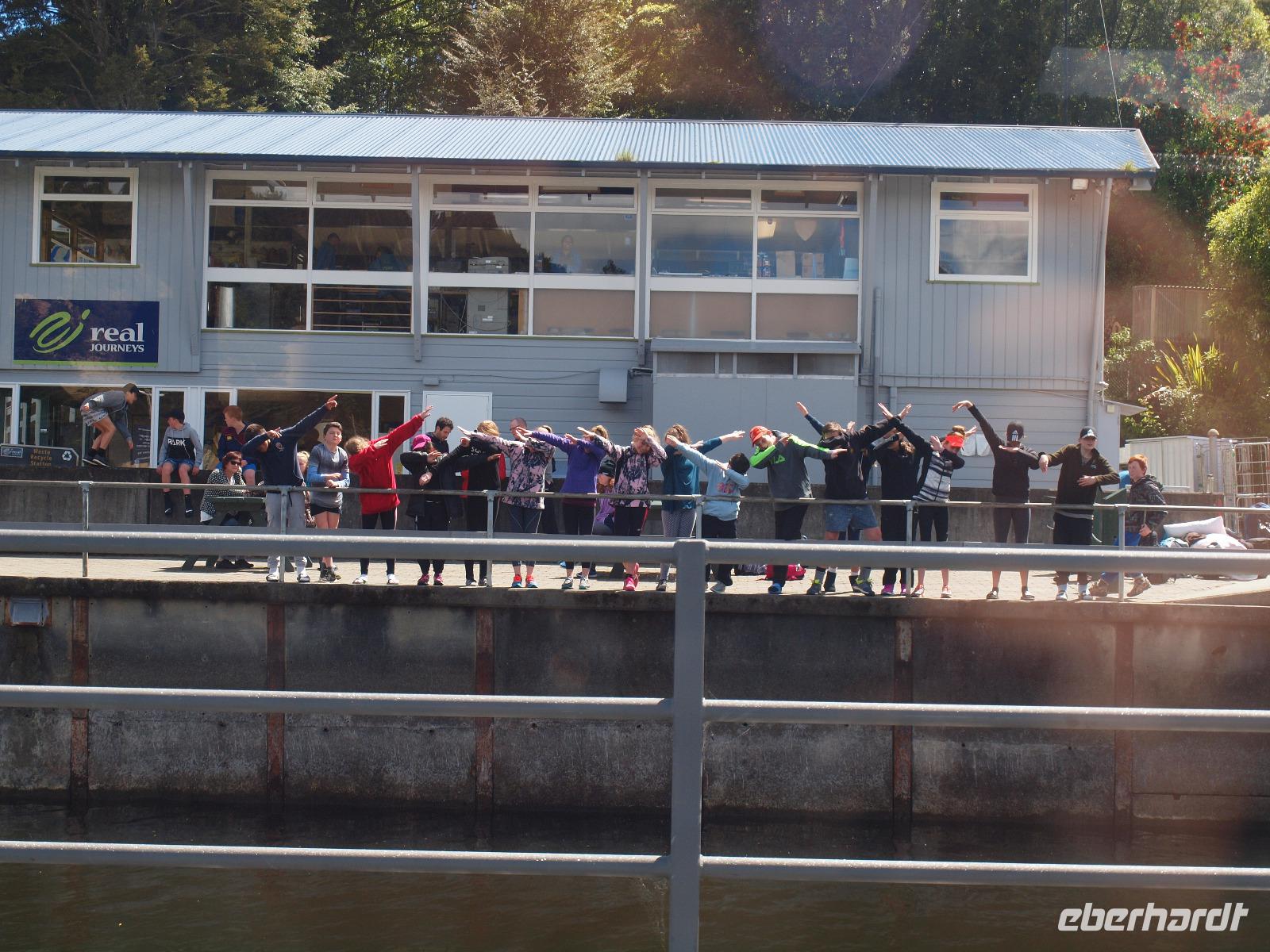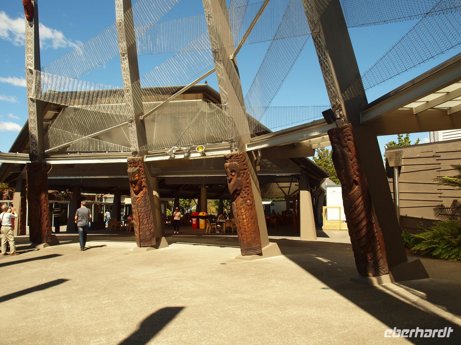 Während Ngahuia diese Geschichten erzählt flechtet sie mit uns Flachsarmbänder, eine sehr feinmotorische Angelegenheit, die wir alle mit Bravour meistern! Die Kulisse ist perfekt, vor uns der See, die kleine Insel Motuopuhi vor uns und im Hintergrund der rauchende Tongariro. Der Himmel ist unglaublich blau und die Sonne lacht uns ins Gesicht! Die letzte Geschichte von Ngahuia ist die Entstehung des Haka. Gemeinsam mit unseren Männern gibt sie uns eine kleine Darbietung. Gern würden wir ihr wohl bei noch mehr Geschichten zu hören, doch auf uns warten noch weitere Highlights. Wir verabschieden uns von Ngahuia mit einem traditionellen Nasenkuss, dem Hongi und wünschen uns „Kia Ora". Nach einem kurzen Fotostopp oberhalb des gleichnamigen Sees, führt uns der Weg am Ufer des Kratersees, der gleichzeitig auch der größte See Neuseelands ist, entlang. Wir fahren zu den Huka Wasserfällen. Hans erklärt, dass der Waikato Fluss an dieser Stelle ca. 200.000 Liter Wasser pro Sekunde durch die enge Schlucht aus hartem Vulkangestein presst. Einfach unglaublich. Die Hukafälle sind die letzte Station des Flusses, bevor er in den Taupo See mündet. Von hier trennt uns noch ca. eine Stunde von Rotorua. Noch bevor wir ins Hotel fahren, halten wir beim Geothermalgebiet Whakarewarewa. Es gehört zu einer Maorigemeinde und im Park, der Te Puia genannt wird, besichtigen wir zuerst das Nachthaus. Hier lebt ein Kiwi, den man durch die ständige Dunkelheit indiesem Haus auch tagsüber sehen kann, wenn er Lust hat. Wir sehen ein paar Blätter wackeln und etwas durch die Dunkelheit huschen, doch ganz zeigt er sich nicht. Auf dem Gelände gibt es viele Schlammpools, mehrere Geysire die in regelmäßigen Abständen ausbrechen und eine Schnitz- und Webschule für Maori. Auf dem Gelände befindet außerdem das Rotowhio-Marae mit dem Versammlungshaus Te Aranui a Rua. Sie werden neben ihrer Rolle als Versammlungsort des Stammes vor allem touristisch genutzt. Da wir heute Abend noch zu einem Maori Konzert wollen, kürzen wir die Tour durch den Park etwas ab und fahren zum Hotel um uns nochmal frisch machen zu können. Vom Hotel aus werden wir von einem Bus der Mitai abgeholt und ins Maori Dorf am anderen Ende der Stadtgrenze gebracht. Wir gehen in ein großes Zelt und finden auch gleich unsere reservierten Plätze. Nach der Begrüßung und der Ernennung unseres Stammeshäuptlings, werden wir in zwei Gruppen aufgeteilt. Meine Gruppe geht zuerst zum Erdofen, hier wird unser Essen, das Hangi, zubereitet. Danach treffen wir die Prinzessin des Stammes an einem Kanu. Sie führt uns wenig später zu einem Flusslauf. Hier erwarten wir das Ankommen der Krieger, natürlich in einem traditionell handgefertigten Kanu. Wir werden wieder nach oben geführt und nehmen in einem überdachten Theatersaal Platz. Hier werden uns nun die Willkommenszeremonien, Lieder und Tänze, Musikinstrumente und Waffen der Maori vorgeführt. Unser Häuptling verhält sich zum Glück auch richtig und verletzt die Gastfreundschaft nicht. So werden wir nach der Vorführung auch glücklicherweise wieder zurück ins Zelt zum Essen gelassen. Nach dem Essen werden wir dann noch zu einer kleinen Nachtwanderung und Glühwürmchen-Entdeckungstour eingeladen. Wir gehen durch den Busch und hinunter zur heiligen Quelle des Stammes. Die Busse stehen bereits in den Startlöchern und bringen uns nach diesem Abend wieder zurück ins Hotel. Eine kurze Nacht steht uns bevor, aber der Abend war es wert!