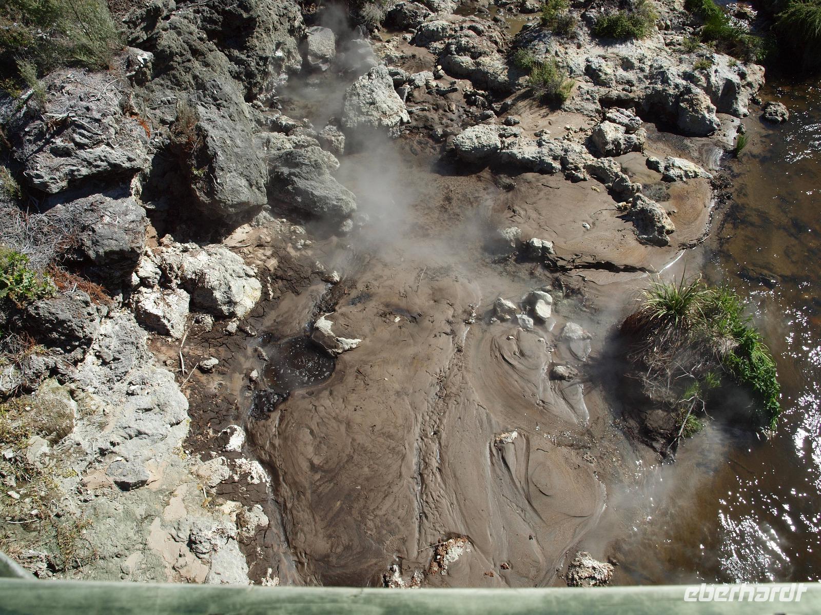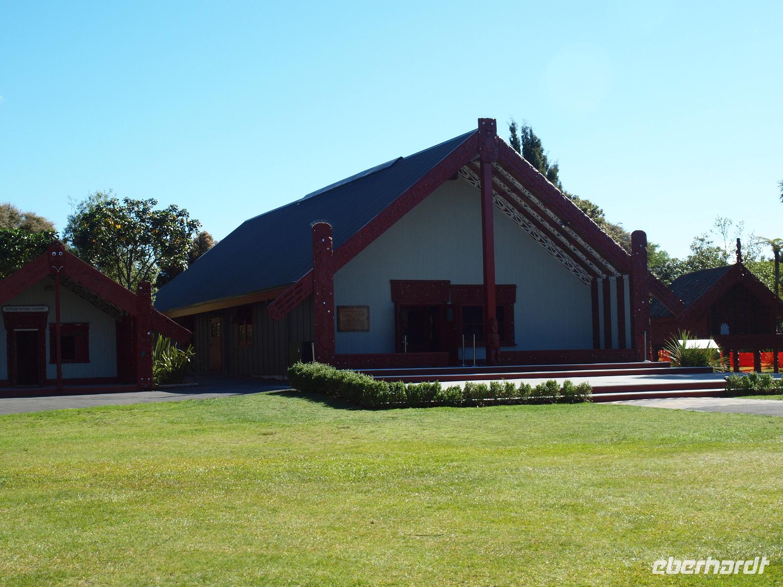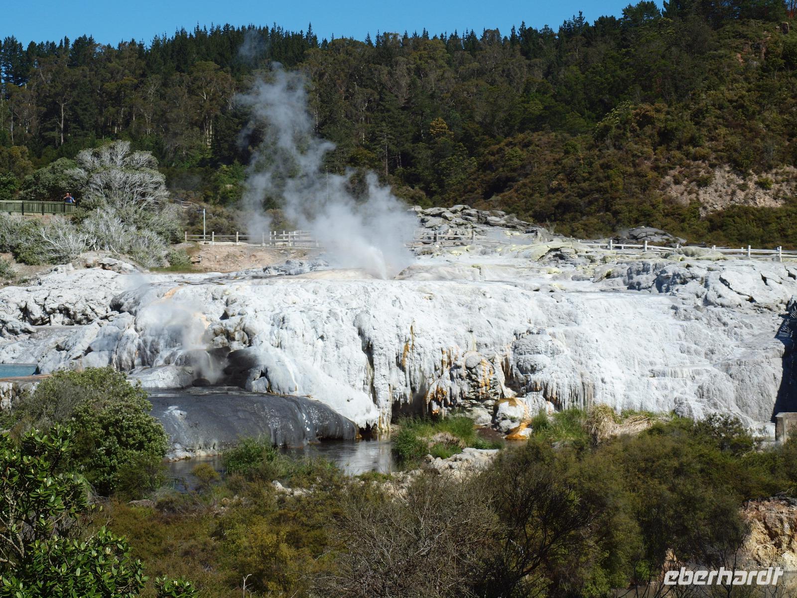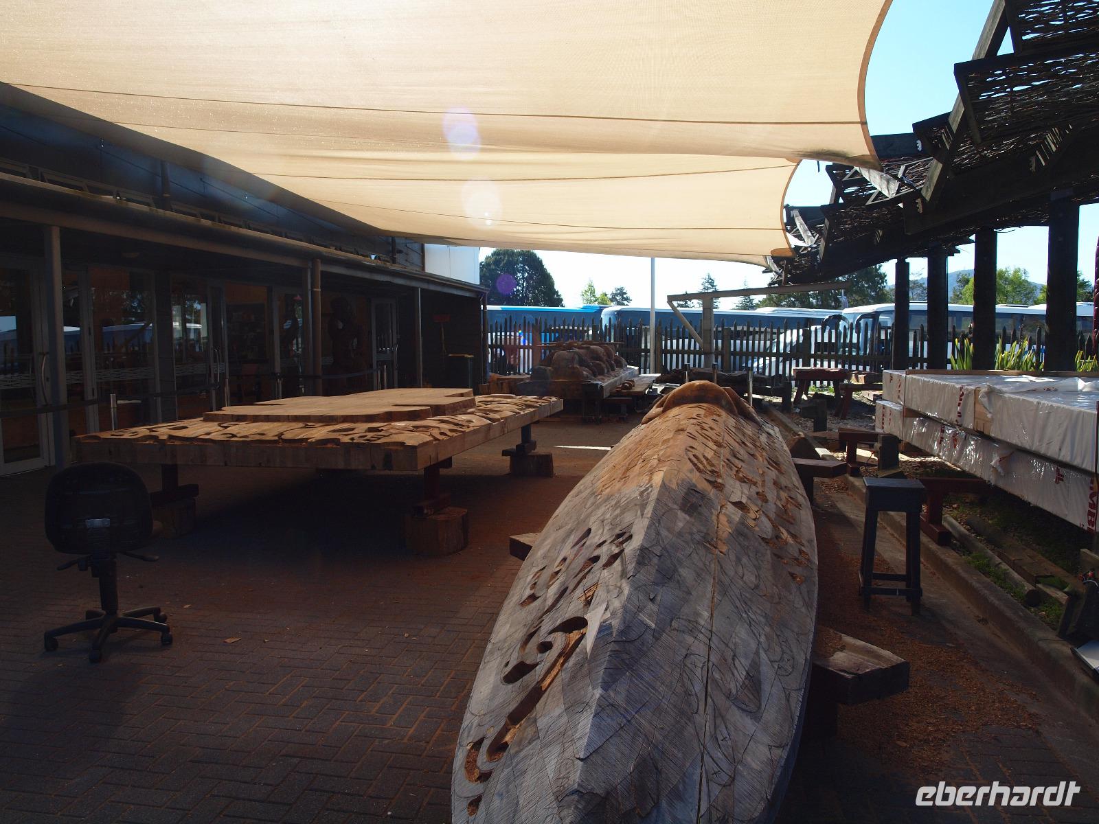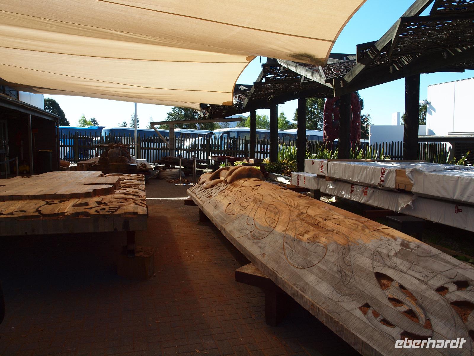 Während Ngahuia diese Geschichten erzählt flechtet sie mit uns Flachsarmbänder, eine sehr feinmotorische Angelegenheit, die wir alle mit Bravour meistern! Die Kulisse ist perfekt, vor uns der See, die kleine Insel Motuopuhi vor uns und im Hintergrund der rauchende Tongariro. Der Himmel ist unglaublich blau und die Sonne lacht uns ins Gesicht! Die letzte Geschichte von Ngahuia ist die Entstehung des Haka. Gemeinsam mit unseren Männern gibt sie uns eine kleine Darbietung. Gern würden wir ihr wohl bei noch mehr Geschichten zu hören, doch auf uns warten noch weitere Highlights. Wir verabschieden uns von Ngahuia mit einem traditionellen Nasenkuss, dem Hongi und wünschen uns „Kia Ora". Nach einem kurzen Fotostopp oberhalb des gleichnamigen Sees, führt uns der Weg am Ufer des Kratersees, der gleichzeitig auch der größte See Neuseelands ist, entlang. Wir fahren zu den Huka Wasserfällen. Hans erklärt, dass der Waikato Fluss an dieser Stelle ca. 200.000 Liter Wasser pro Sekunde durch die enge Schlucht aus hartem Vulkangestein presst. Einfach unglaublich. Die Hukafälle sind die letzte Station des Flusses, bevor er in den Taupo See mündet. Von hier trennt uns noch ca. eine Stunde von Rotorua. Noch bevor wir ins Hotel fahren, halten wir beim Geothermalgebiet Whakarewarewa. Es gehört zu einer Maorigemeinde und im Park, der Te Puia genannt wird, besichtigen wir zuerst das Nachthaus. Hier lebt ein Kiwi, den man durch die ständige Dunkelheit indiesem Haus auch tagsüber sehen kann, wenn er Lust hat. Wir sehen ein paar Blätter wackeln und etwas durch die Dunkelheit huschen, doch ganz zeigt er sich nicht. Auf dem Gelände gibt es viele Schlammpools, mehrere Geysire die in regelmäßigen Abständen ausbrechen und eine Schnitz- und Webschule für Maori. Auf dem Gelände befindet außerdem das Rotowhio-Marae mit dem Versammlungshaus Te Aranui a Rua. Sie werden neben ihrer Rolle als Versammlungsort des Stammes vor allem touristisch genutzt. Da wir heute Abend noch zu einem Maori Konzert wollen, kürzen wir die Tour durch den Park etwas ab und fahren zum Hotel um uns nochmal frisch machen zu können. Vom Hotel aus werden wir von einem Bus der Mitai abgeholt und ins Maori Dorf am anderen Ende der Stadtgrenze gebracht. Wir gehen in ein großes Zelt und finden auch gleich unsere reservierten Plätze. Nach der Begrüßung und der Ernennung unseres Stammeshäuptlings, werden wir in zwei Gruppen aufgeteilt. Meine Gruppe geht zuerst zum Erdofen, hier wird unser Essen, das Hangi, zubereitet. Danach treffen wir die Prinzessin des Stammes an einem Kanu. Sie führt uns wenig später zu einem Flusslauf. Hier erwarten wir das Ankommen der Krieger, natürlich in einem traditionell handgefertigten Kanu. Wir werden wieder nach oben geführt und nehmen in einem überdachten Theatersaal Platz. Hier werden uns nun die Willkommenszeremonien, Lieder und Tänze, Musikinstrumente und Waffen der Maori vorgeführt. Unser Häuptling verhält sich zum Glück auch richtig und verletzt die Gastfreundschaft nicht. So werden wir nach der Vorführung auch glücklicherweise wieder zurück ins Zelt zum Essen gelassen. Nach dem Essen werden wir dann noch zu einer kleinen Nachtwanderung und Glühwürmchen-Entdeckungstour eingeladen. Wir gehen durch den Busch und hinunter zur heiligen Quelle des Stammes. Die Busse stehen bereits in den Startlöchern und bringen uns nach diesem Abend wieder zurück ins Hotel. Eine kurze Nacht steht uns bevor, aber der Abend war es wert!