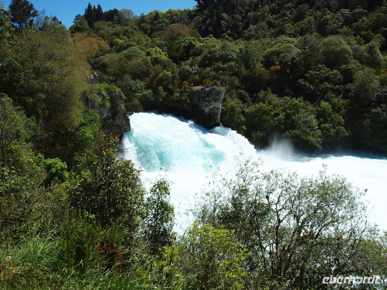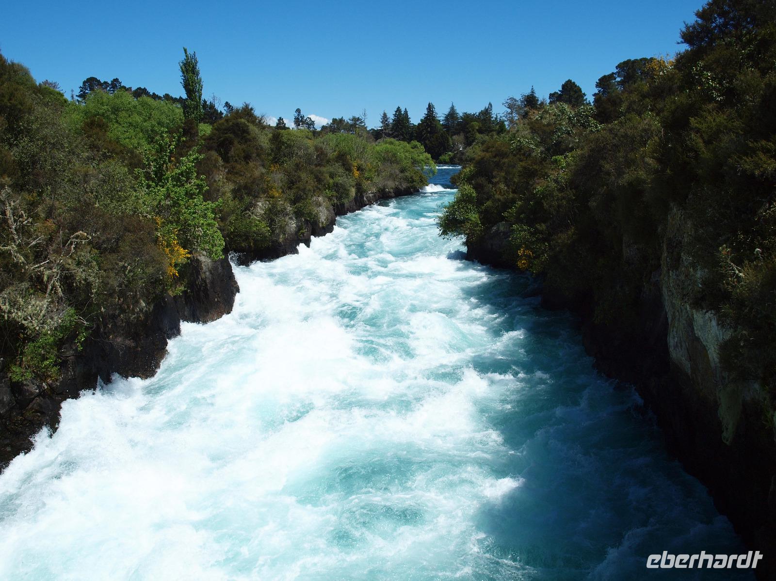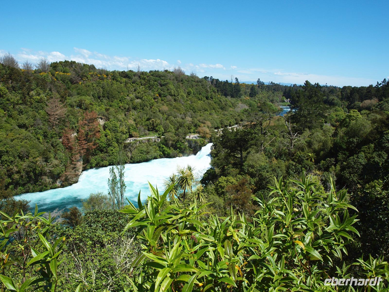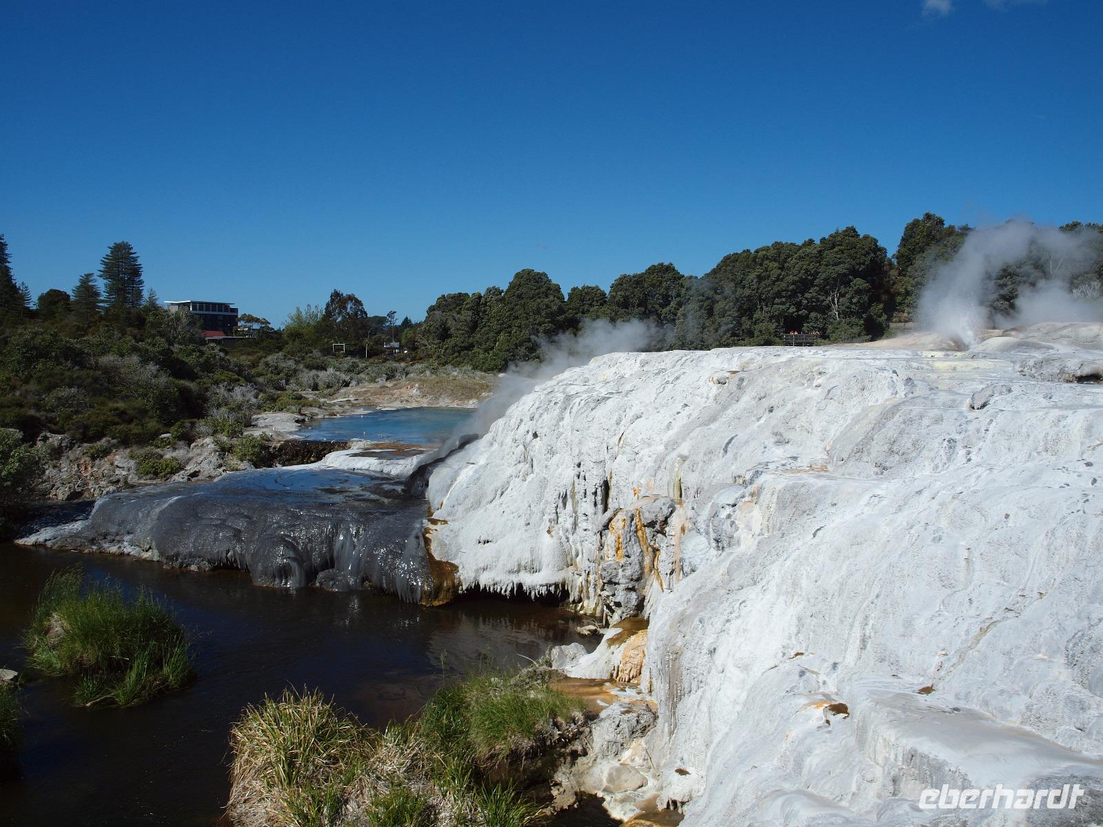 Während Ngahuia diese Geschichten erzählt flechtet sie mit uns Flachsarmbänder, eine sehr feinmotorische Angelegenheit, die wir alle mit Bravour meistern! Die Kulisse ist perfekt, vor uns der See, die kleine Insel Motuopuhi vor uns und im Hintergrund der rauchende Tongariro. Der Himmel ist unglaublich blau und die Sonne lacht uns ins Gesicht! Die letzte Geschichte von Ngahuia ist die Entstehung des Haka. Gemeinsam mit unseren Männern gibt sie uns eine kleine Darbietung. Gern würden wir ihr wohl bei noch mehr Geschichten zu hören, doch auf uns warten noch weitere Highlights. Wir verabschieden uns von Ngahuia mit einem traditionellen Nasenkuss, dem Hongi und wünschen uns „Kia Ora". Nach einem kurzen Fotostopp oberhalb des gleichnamigen Sees, führt uns der Weg am Ufer des Kratersees, der gleichzeitig auch der größte See Neuseelands ist, entlang. Wir fahren zu den Huka Wasserfällen. Hans erklärt, dass der Waikato Fluss an dieser Stelle ca. 200.000 Liter Wasser pro Sekunde durch die enge Schlucht aus hartem Vulkangestein presst. Einfach unglaublich. Die Hukafälle sind die letzte Station des Flusses, bevor er in den Taupo See mündet. Von hier trennt uns noch ca. eine Stunde von Rotorua. Noch bevor wir ins Hotel fahren, halten wir beim Geothermalgebiet Whakarewarewa. Es gehört zu einer Maorigemeinde und im Park, der Te Puia genannt wird, besichtigen wir zuerst das Nachthaus. Hier lebt ein Kiwi, den man durch die ständige Dunkelheit indiesem Haus auch tagsüber sehen kann, wenn er Lust hat. Wir sehen ein paar Blätter wackeln und etwas durch die Dunkelheit huschen, doch ganz zeigt er sich nicht. Auf dem Gelände gibt es viele Schlammpools, mehrere Geysire die in regelmäßigen Abständen ausbrechen und eine Schnitz- und Webschule für Maori. Auf dem Gelände befindet außerdem das Rotowhio-Marae mit dem Versammlungshaus Te Aranui a Rua. Sie werden neben ihrer Rolle als Versammlungsort des Stammes vor allem touristisch genutzt. Da wir heute Abend noch zu einem Maori Konzert wollen, kürzen wir die Tour durch den Park etwas ab und fahren zum Hotel um uns nochmal frisch machen zu können. Vom Hotel aus werden wir von einem Bus der Mitai abgeholt und ins Maori Dorf am anderen Ende der Stadtgrenze gebracht. Wir gehen in ein großes Zelt und finden auch gleich unsere reservierten Plätze. Nach der Begrüßung und der Ernennung unseres Stammeshäuptlings, werden wir in zwei Gruppen aufgeteilt. Meine Gruppe geht zuerst zum Erdofen, hier wird unser Essen, das Hangi, zubereitet. Danach treffen wir die Prinzessin des Stammes an einem Kanu. Sie führt uns wenig später zu einem Flusslauf. Hier erwarten wir das Ankommen der Krieger, natürlich in einem traditionell handgefertigten Kanu. Wir werden wieder nach oben geführt und nehmen in einem überdachten Theatersaal Platz. Hier werden uns nun die Willkommenszeremonien, Lieder und Tänze, Musikinstrumente und Waffen der Maori vorgeführt. Unser Häuptling verhält sich zum Glück auch richtig und verletzt die Gastfreundschaft nicht. So werden wir nach der Vorführung auch glücklicherweise wieder zurück ins Zelt zum Essen gelassen. Nach dem Essen werden wir dann noch zu einer kleinen Nachtwanderung und Glühwürmchen-Entdeckungstour eingeladen. Wir gehen durch den Busch und hinunter zur heiligen Quelle des Stammes. Die Busse stehen bereits in den Startlöchern und bringen uns nach diesem Abend wieder zurück ins Hotel. Eine kurze Nacht steht uns bevor, aber der Abend war es wert!