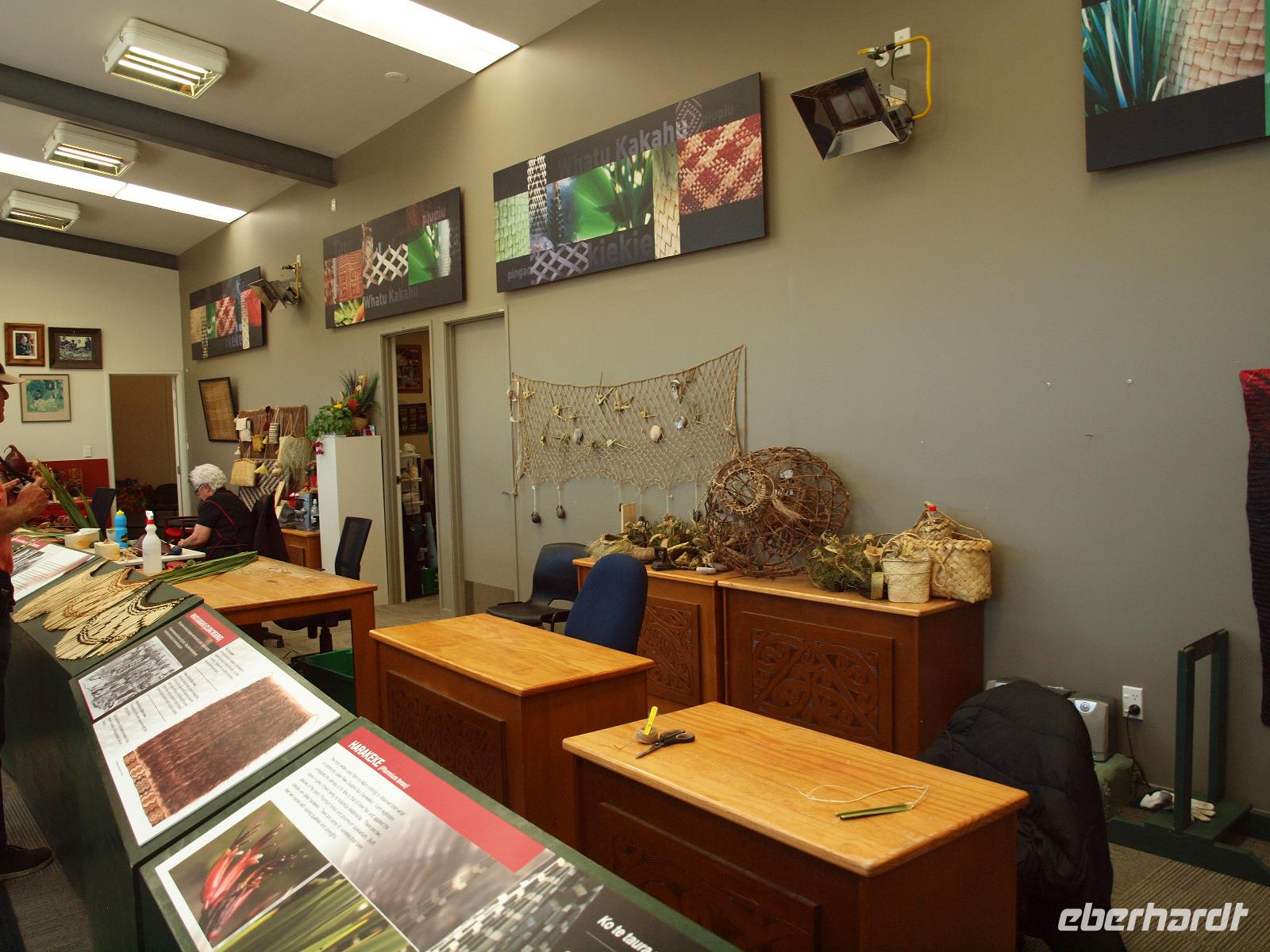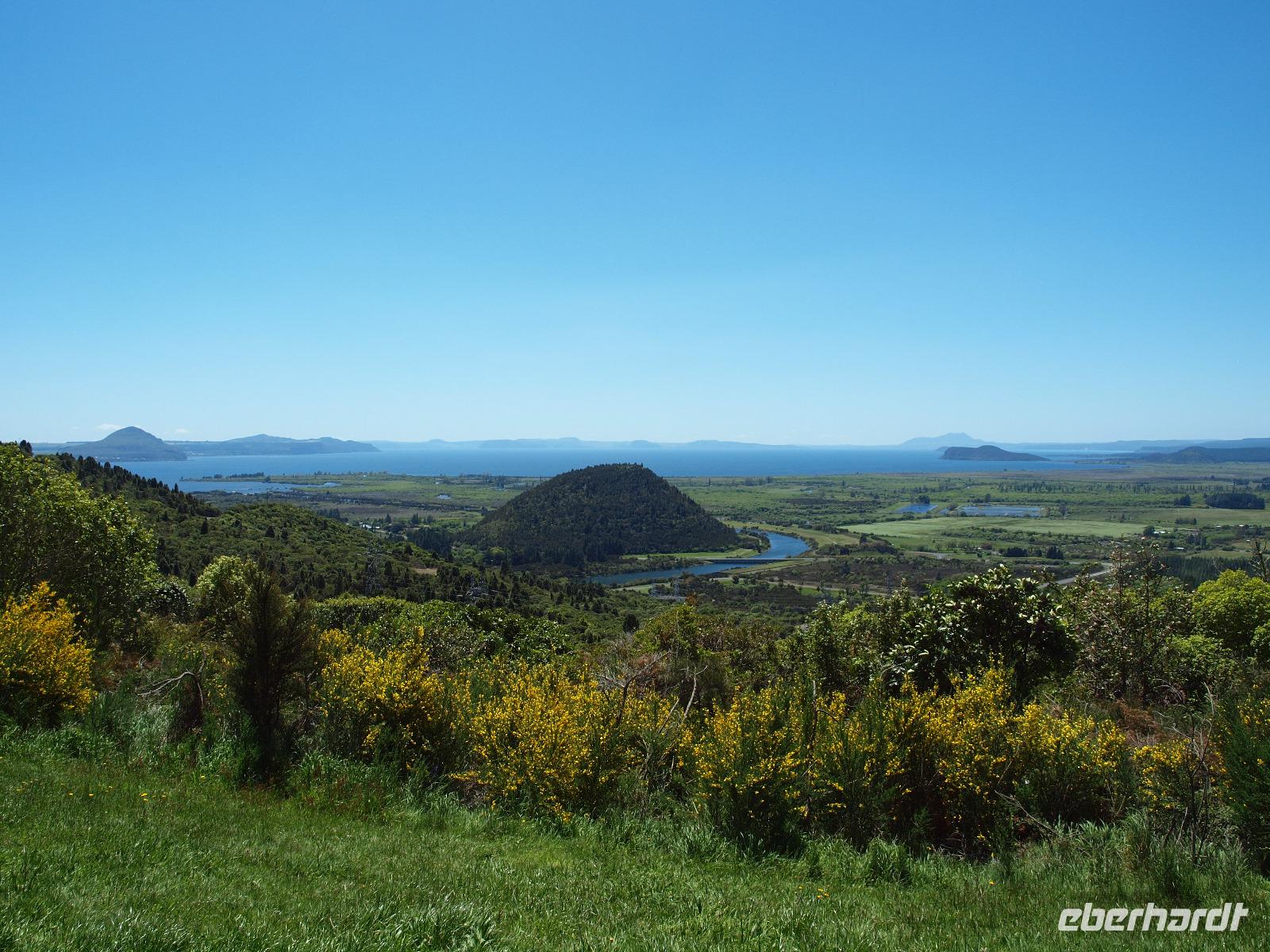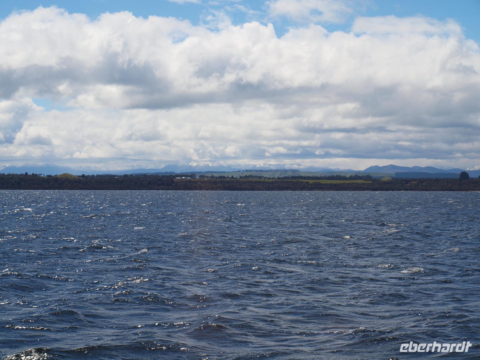 Da uns ein voller Tag mit vielen Stationen unterwegs bevor steht, fahren wir schon recht früh von Ohakune ab. Hans führt uns zunächst von der vorgesehenen Route weg und hinein in den Nationalpark. Wir fahren zum Whakapapa Skigebiet. Hier befinden wir uns in Mitten von Mordor, dem Dreh- und Angelpunkt der bösen Macht aus der Trilogie „Der Herr der Ringe". Die karge Gegend, die grünen Wiesen in der Ferne und die drei Vulkane des Tongariro Nationalparks, wovon wir von hier oben nur zwei direkt sehen, den Ruapehu und den Ngauruhoe, ergeben perfekte Urlaubfotos! Und auch der einsame Vulkan Taranaki ist wieder schemenhaft am Horizont zu sehen. Wir müssen weiter zu unserem nächsten „Termin". Wir fahren entlang der Grenze des Nationalparks und können zu unserer Rechten die Vulkane immer im Blick behalten. Nun kommt auch der dritte Vulkan in unser Sichtfeld, der Tongariro, gut erkennbar durch eine rauchende Stelle. Eine Maori Dame wartet auf einem nahegelegenen Parkplatz am See Rotoaira auf uns. Ihr Name ist Ngahuia und sie ist ein Stammesmitglied der Maori in der Nähe von Taupo. Sie führt uns ans Ufer des Sees, hier befindet sich ein kleines Marae der Maori. Es gibt zwei Unterstände und einen Tisch mit Bänken, hier hat Ngahuia ein paar Snacks für uns vorbereitet. Sie sammelt noch schnell ein paar Flachsblätter zusammen und beginnt dann damit ihre Geschichte zu erzählen. Ngahuia besitzt viele Tattoos auf ihrer Haut. Diese Motive stellen die mütterliche und väterliche Seite ihrer Herkunft dar. Nein, ich meine nicht einfach einen Stammbaum, ich meine die Herkunft ihrer Vorfahren. Die Entstehungsgeschichten werden immer von den Ältesten des Stammes, den Großvätern und Großmüttern, an die Jüngeren weiter gegeben...
