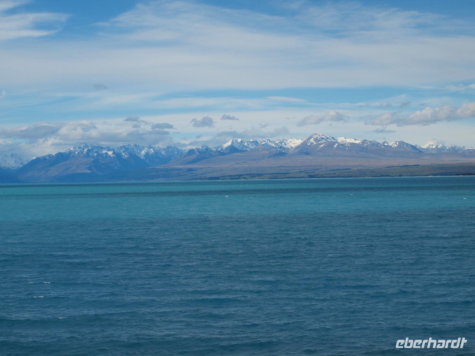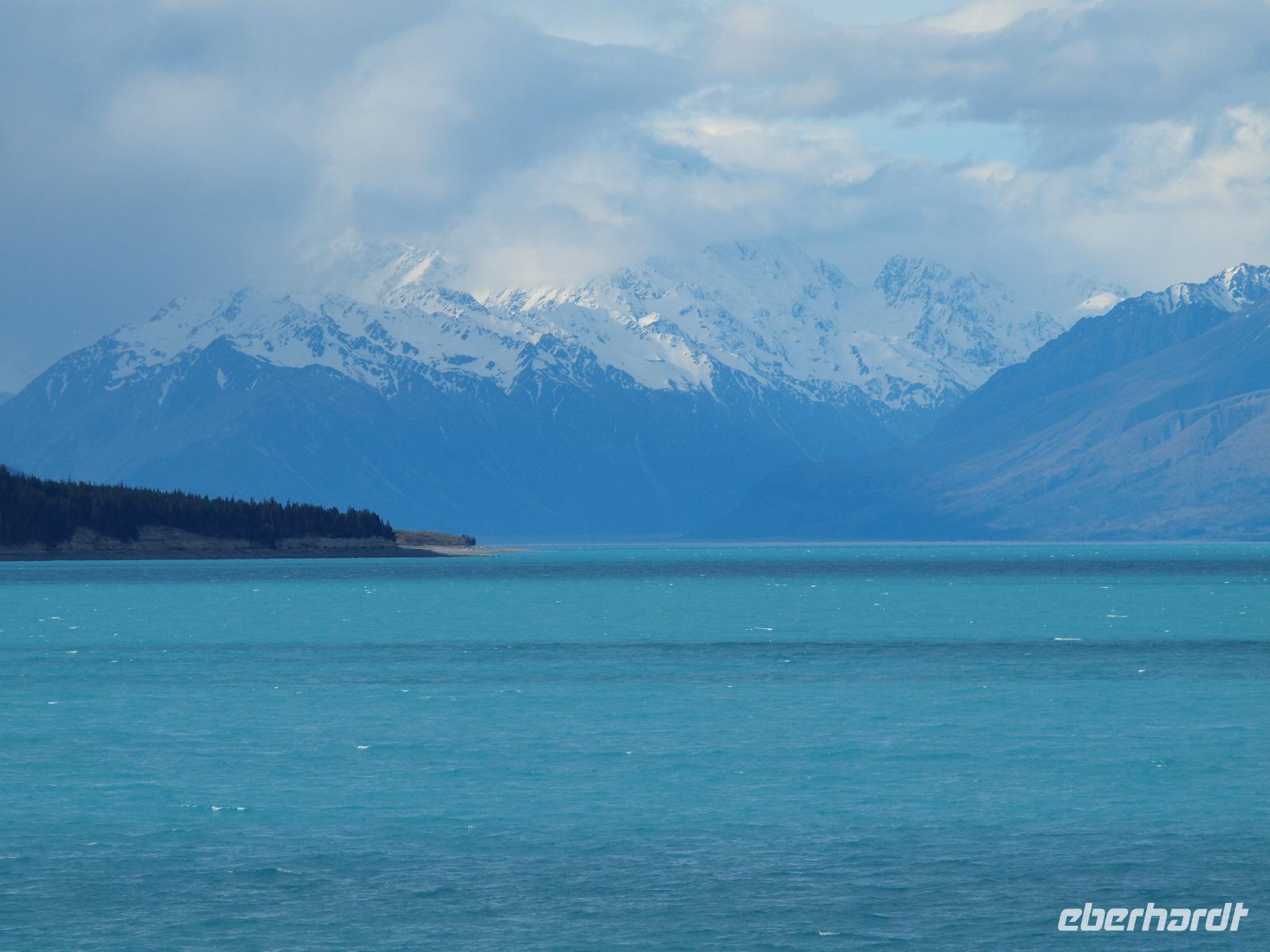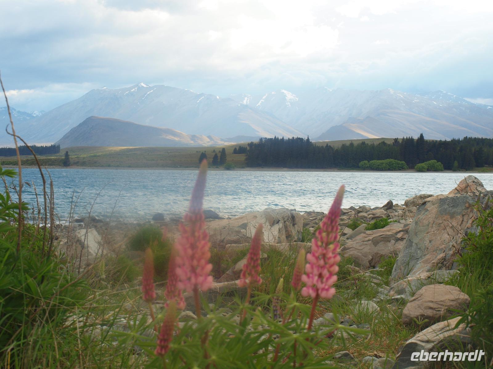 Weiter geht unsere Fahrt nun wieder ins Landesinnere. Vorbei an den Orten Oamaru und Omarama bis nach Pukaki, an den gleichnamigen See Pukaki. Dieser See ist unglaublich blau. Von hier aus lässt sich normalerweise auch der majestätische Mount Cook, Neuseelands höchster Berg, sehen, doch leider ist er wie alle anderen großen Berge eher scheu und versteckt sich hinter einer Wolkendecke.