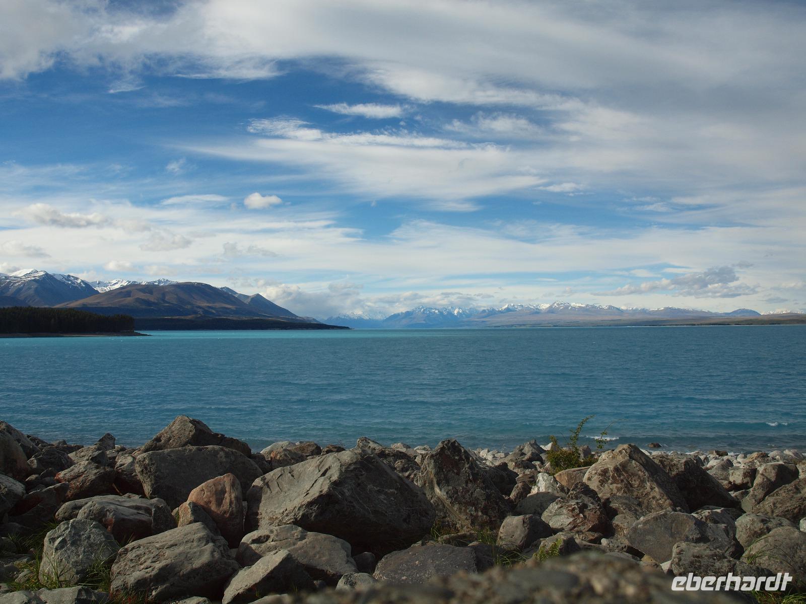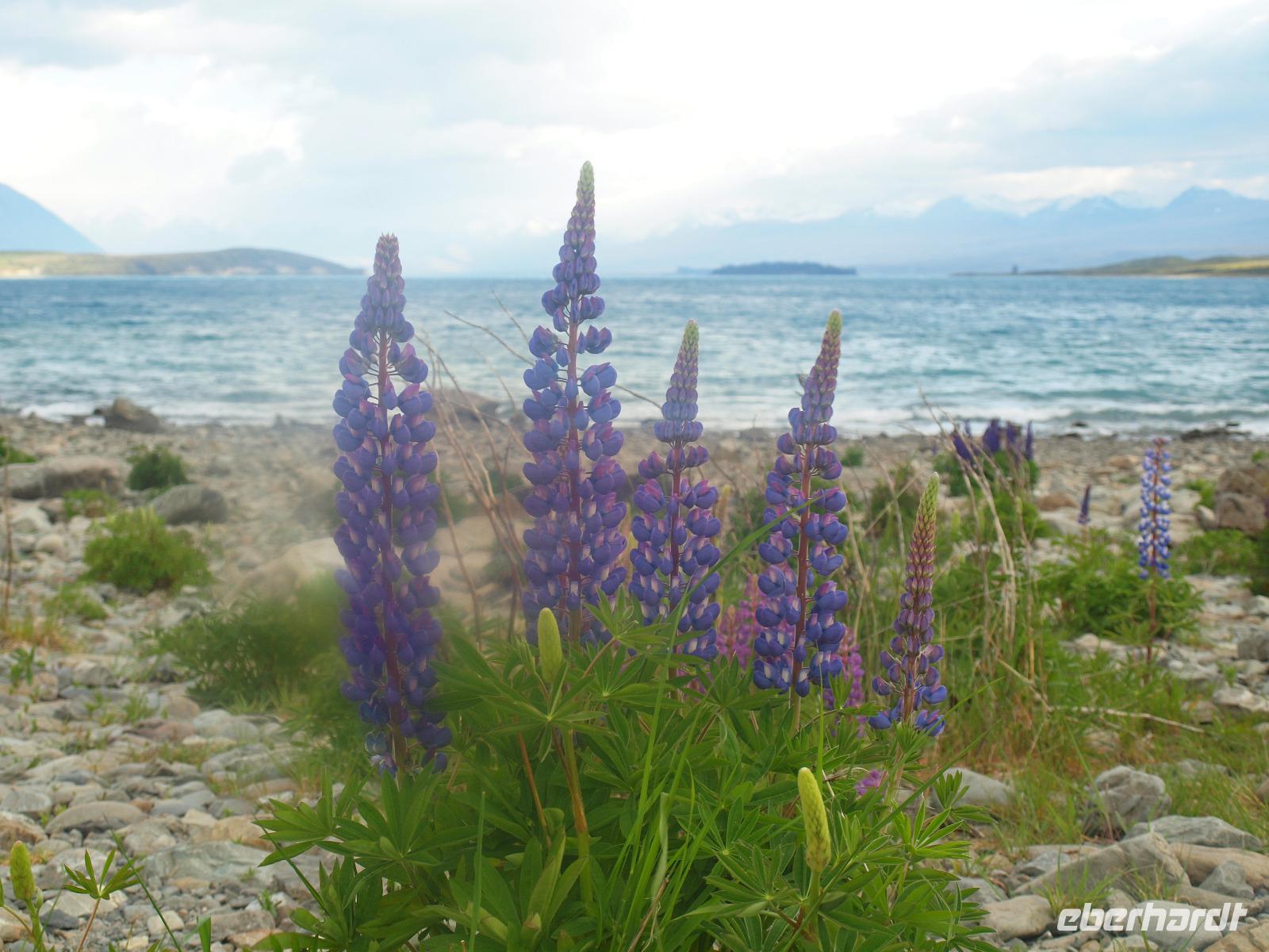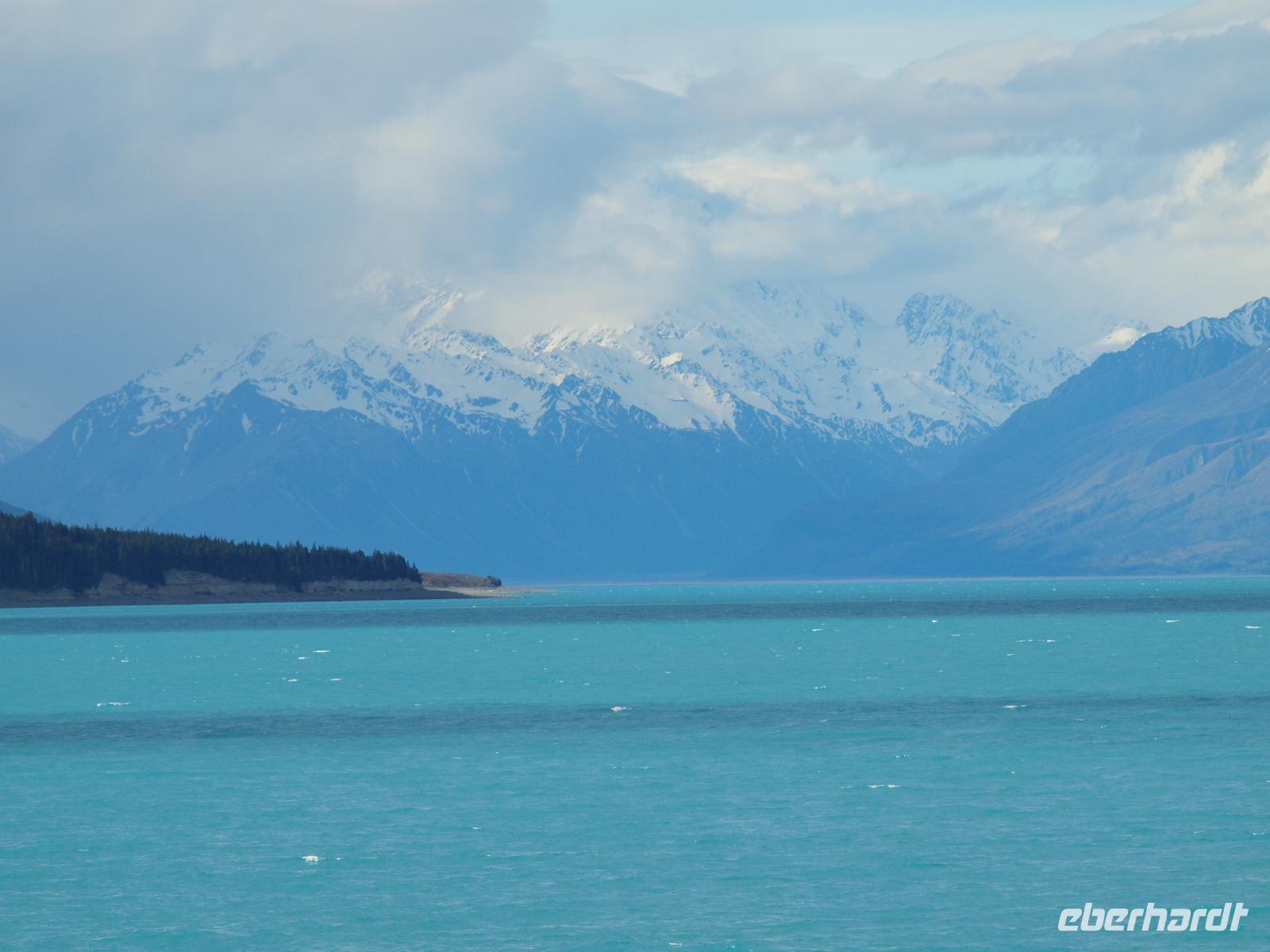 Weiter geht unsere Fahrt nun wieder ins Landesinnere. Vorbei an den Orten Oamaru und Omarama bis nach Pukaki, an den gleichnamigen See Pukaki. Dieser See ist unglaublich blau. Von hier aus lässt sich normalerweise auch der majestätische Mount Cook, Neuseelands höchster Berg, sehen, doch leider ist er wie alle anderen großen Berge eher scheu und versteckt sich hinter einer Wolkendecke.