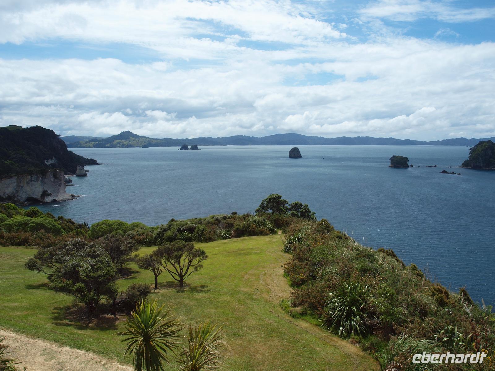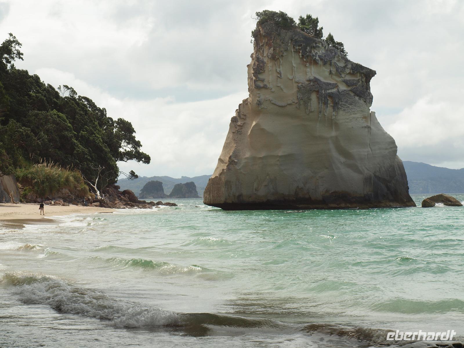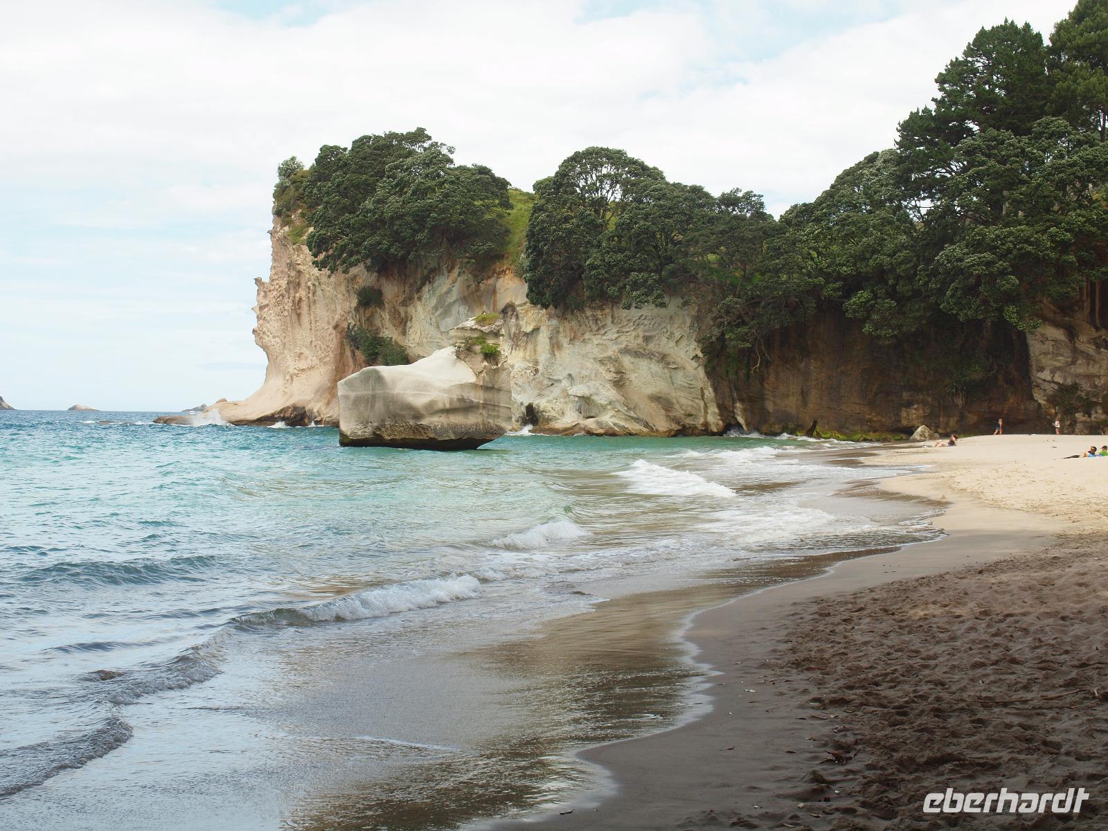Selbst die Städter aus Auckland schätzen diese Gegend sehr. Der Ort Whangamata ist ein beliebter Urlaubsort. Wir fahren weiter nach Norden, zur Cathedral Cove. Von einem Parkplatz aus geht ein Weg entlang der Küste zur Bucht. Den Schildern nach benötigt man ca. 45 Minuten, der Weg führt mittlerweile auch nicht mehr über Stock und über Stein, nein, er ist inzwischen ausgebaut und geteert und somit etwas leichter zu gehen, die Höhen und Tiefen aber sind geblieben! Ein paar Treppen führen uns dann hinunter an den Strand. Die „Kathedrale" ist eine Höhle, die eine spitz zulaufende Decke aufweist und wie der Name schon sagt einer Kathedrale gleicht. Entstanden ist diese Ausprägung der Höhle durch unterschiedlich ausgerichtete Gesteinsschichten und durch die Wirkung der Gezeiten. Wir haben Glück und die Flut ist noch nicht zu hoch. Einige wagen sich sogar auf die andere Seite und riskieren nasse Füße. :)